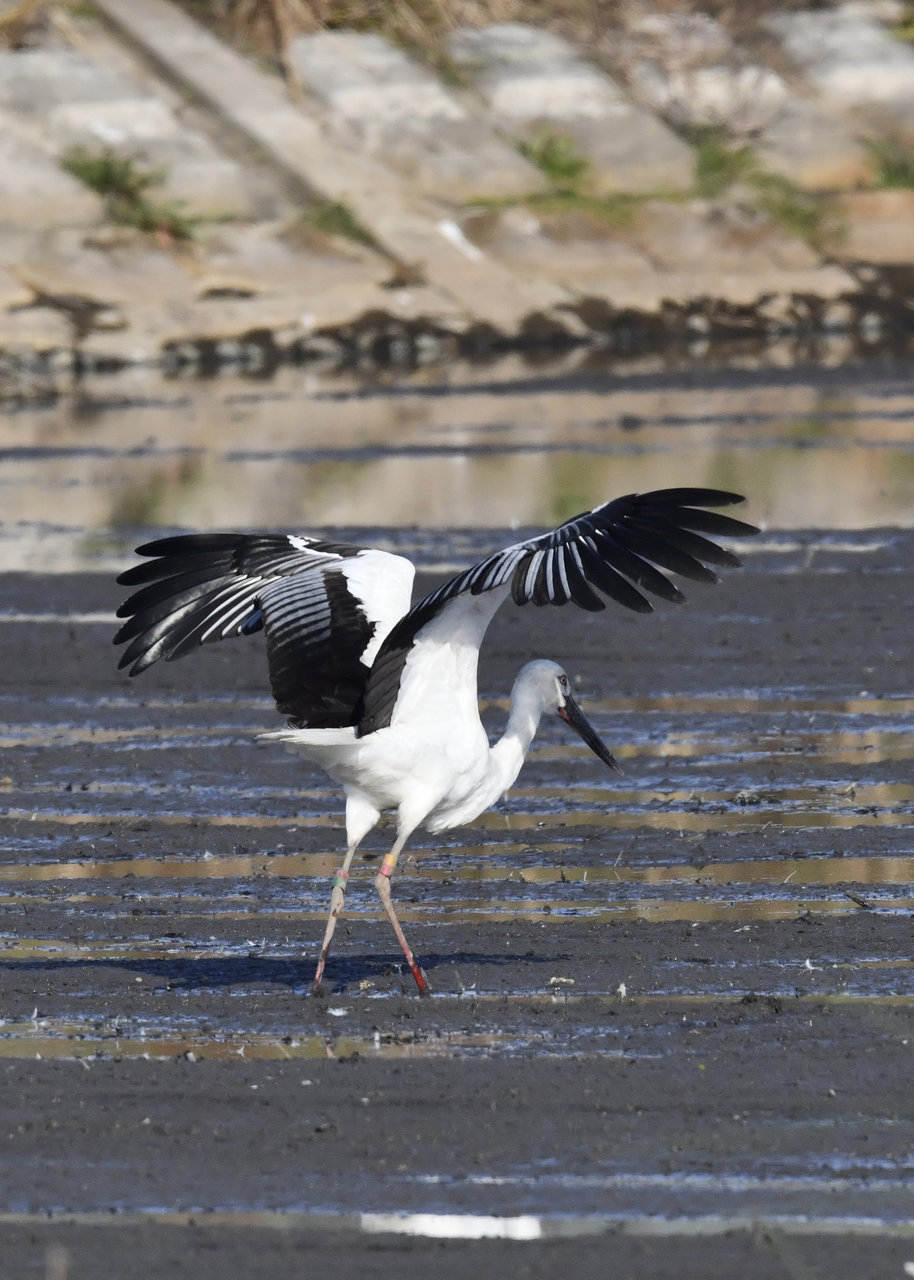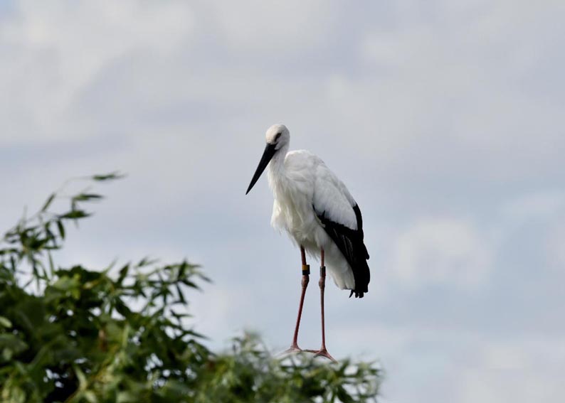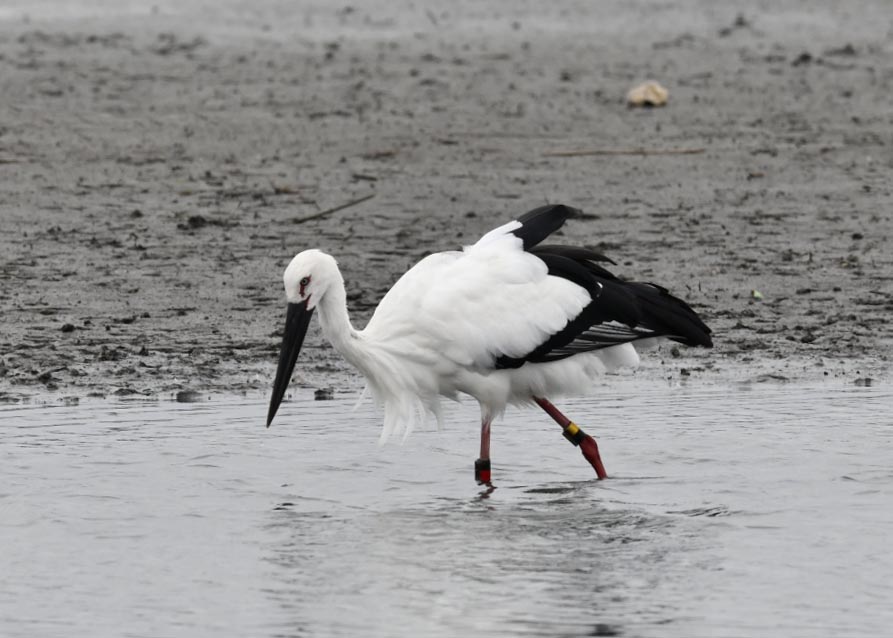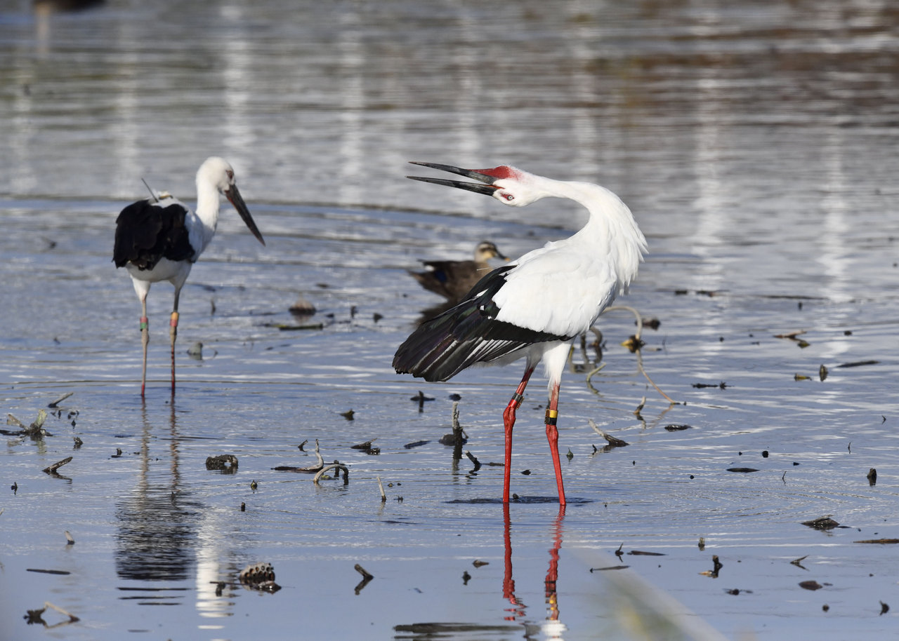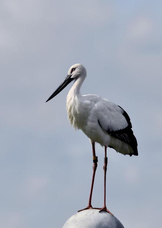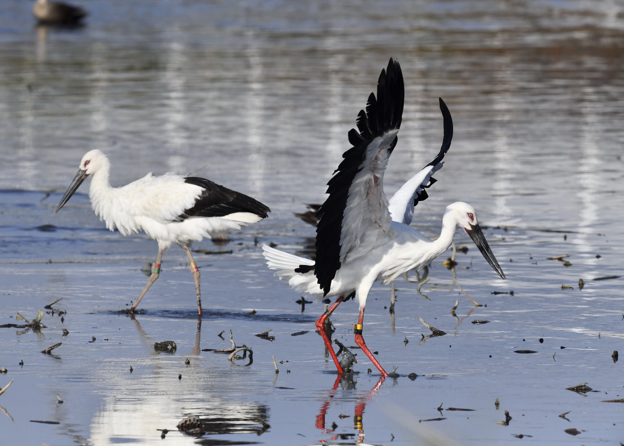 一羽は『J0127・♂・愛称きずな』千葉県野田市・こうのとりの里生まれ足環の色(右:黄・黒、左:黒・赤)
