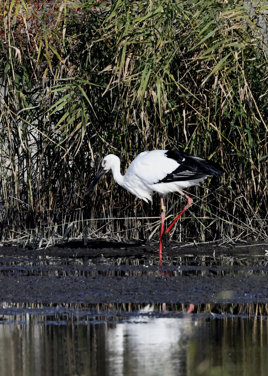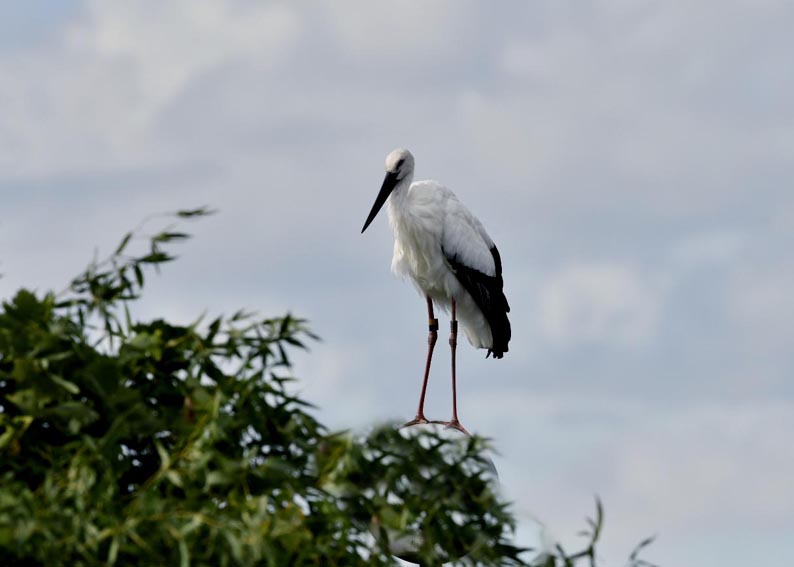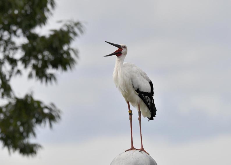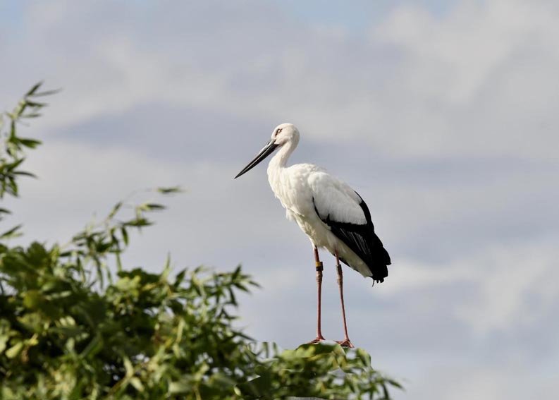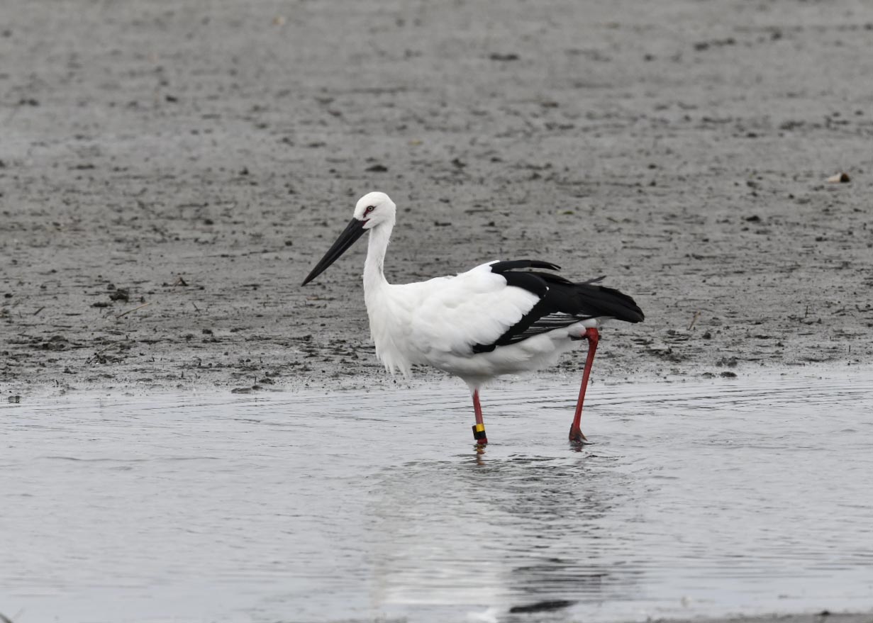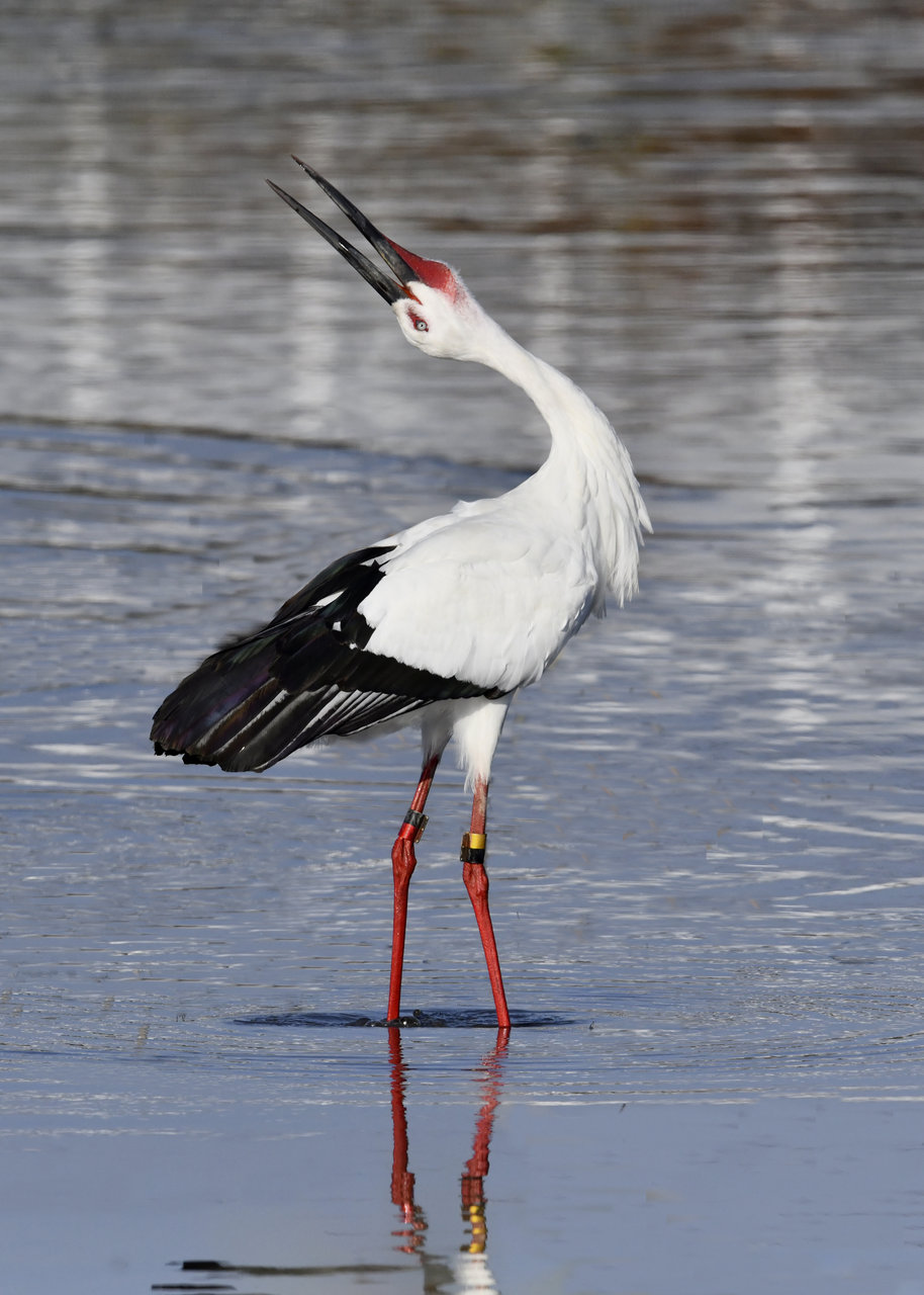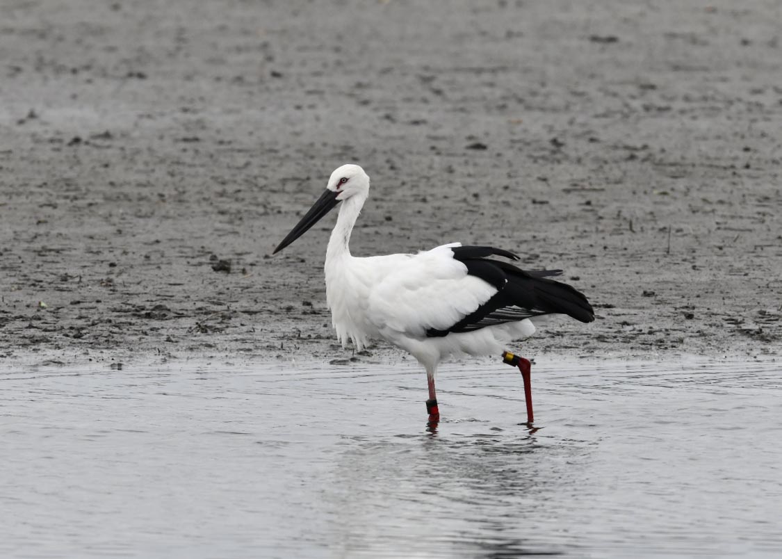 一羽は『J0127・♂・愛称きずな』千葉県野田市・こうのとりの里生まれ足環の色(右:黄・黒、左:黒・赤)
