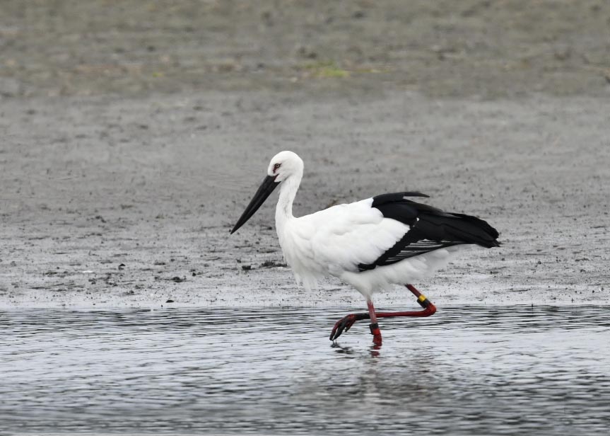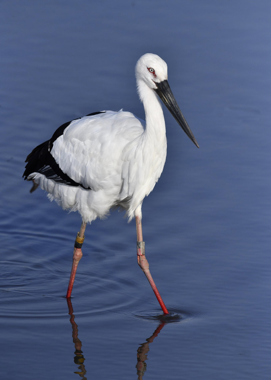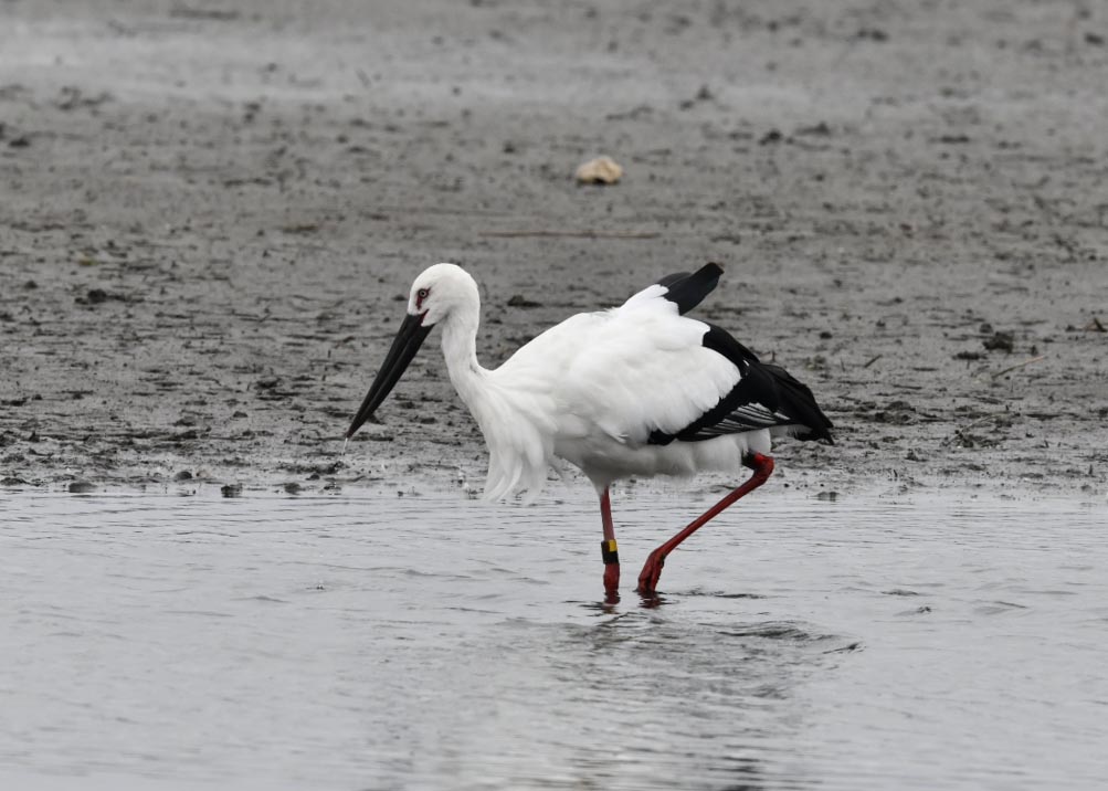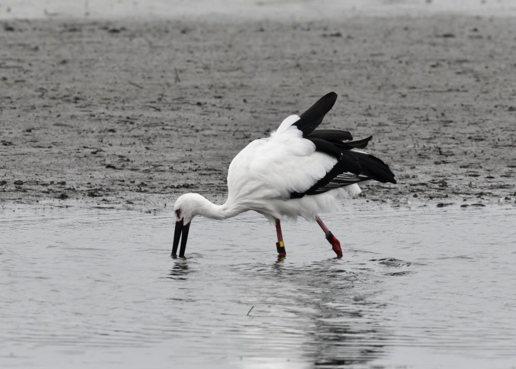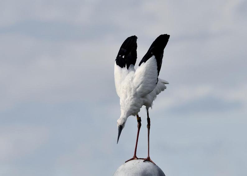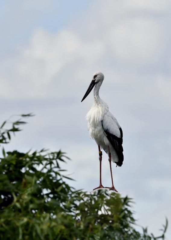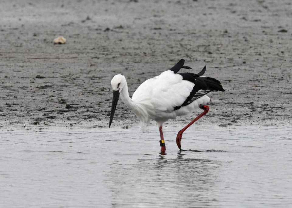 一羽は『J0127・♂・愛称きずな』千葉県野田市・こうのとりの里生まれ足環の色(右:黄・黒、左:黒・赤)