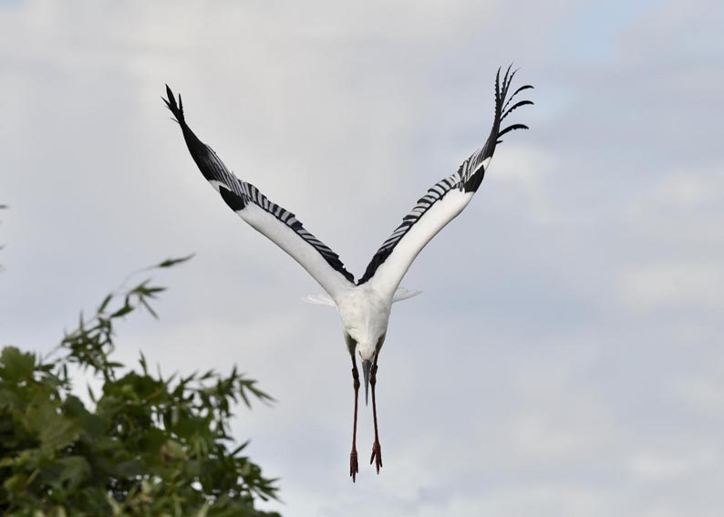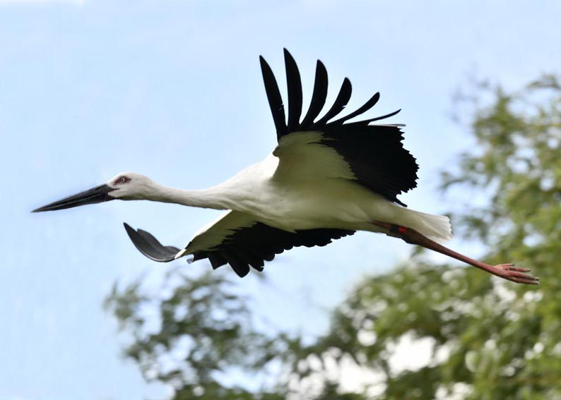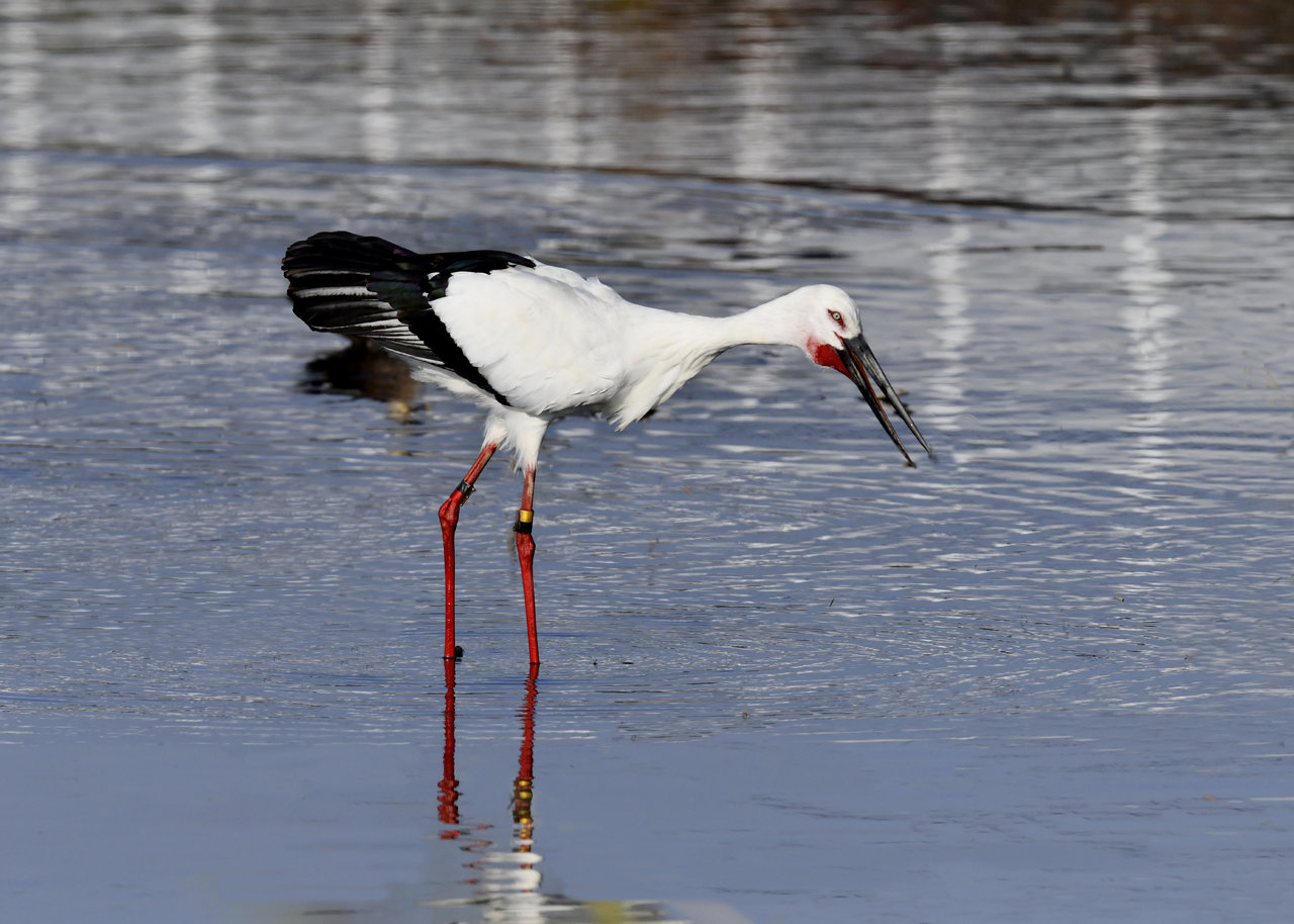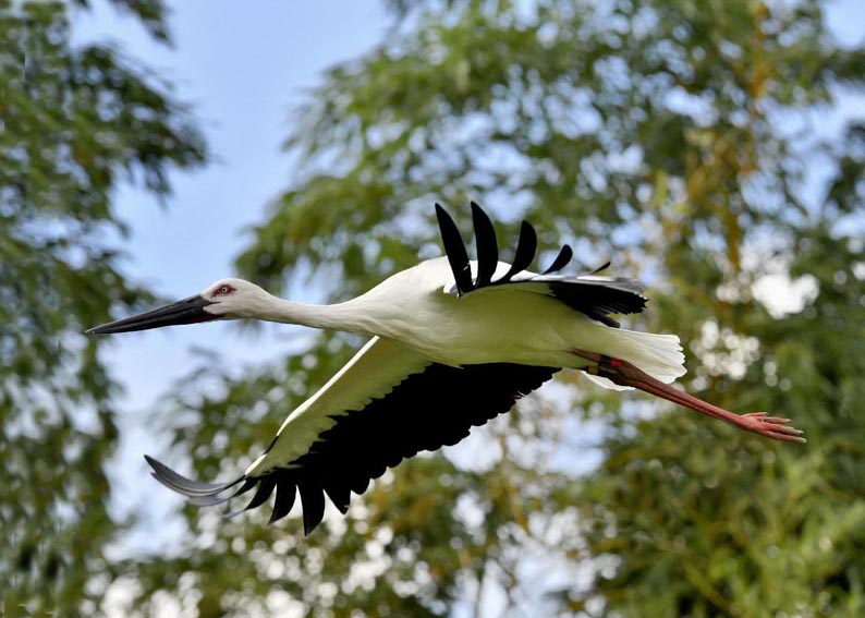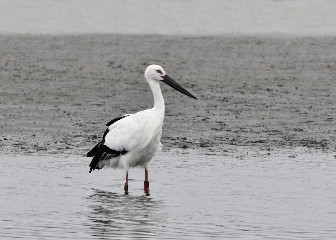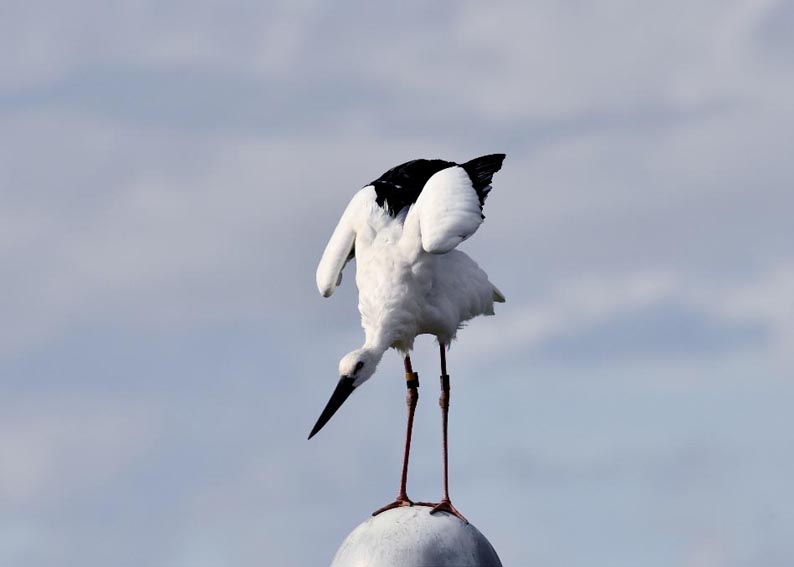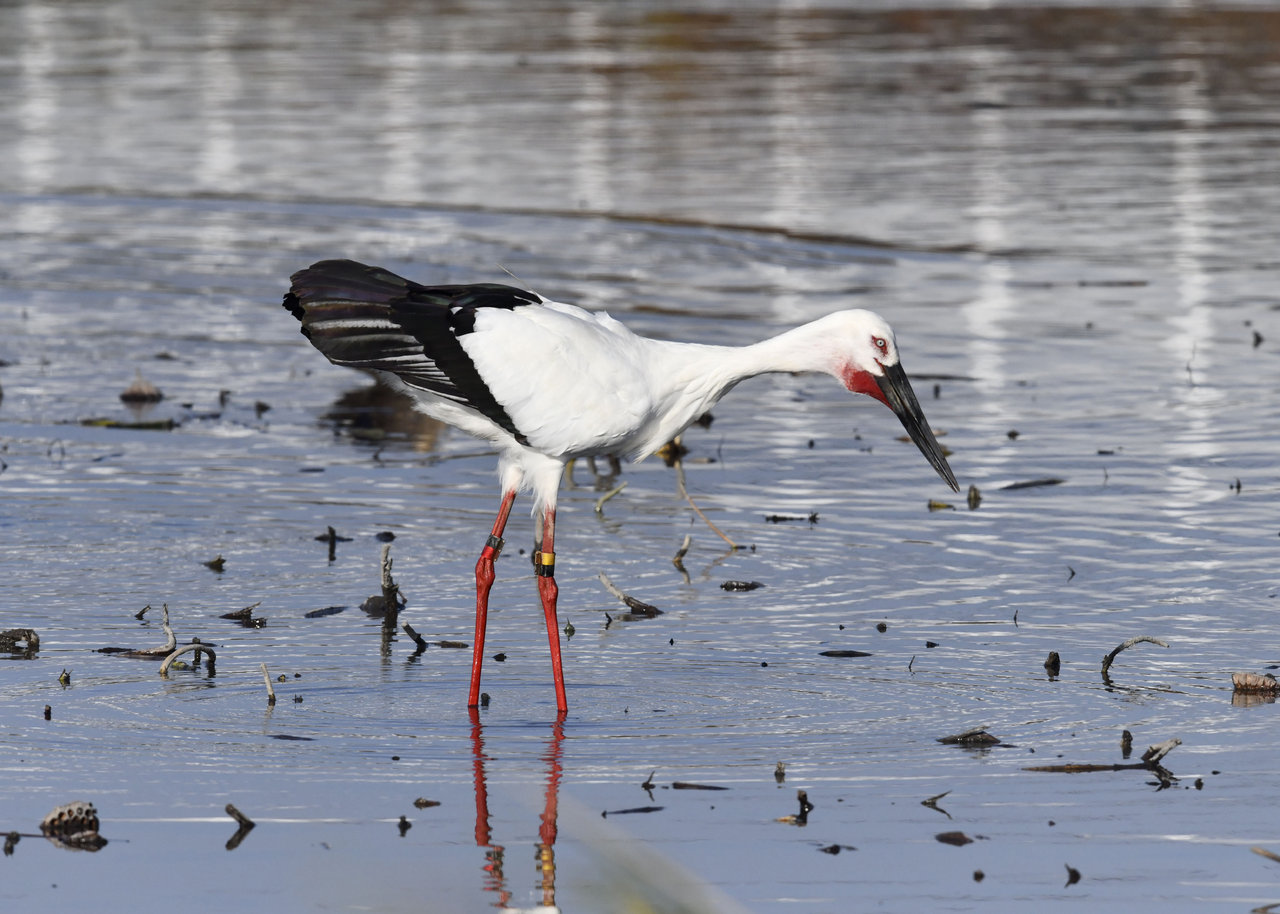 一羽は『J0127・♂・愛称きずな』千葉県野田市・こうのとりの里生まれ足環の色(右:黄・黒、左:黒・赤)