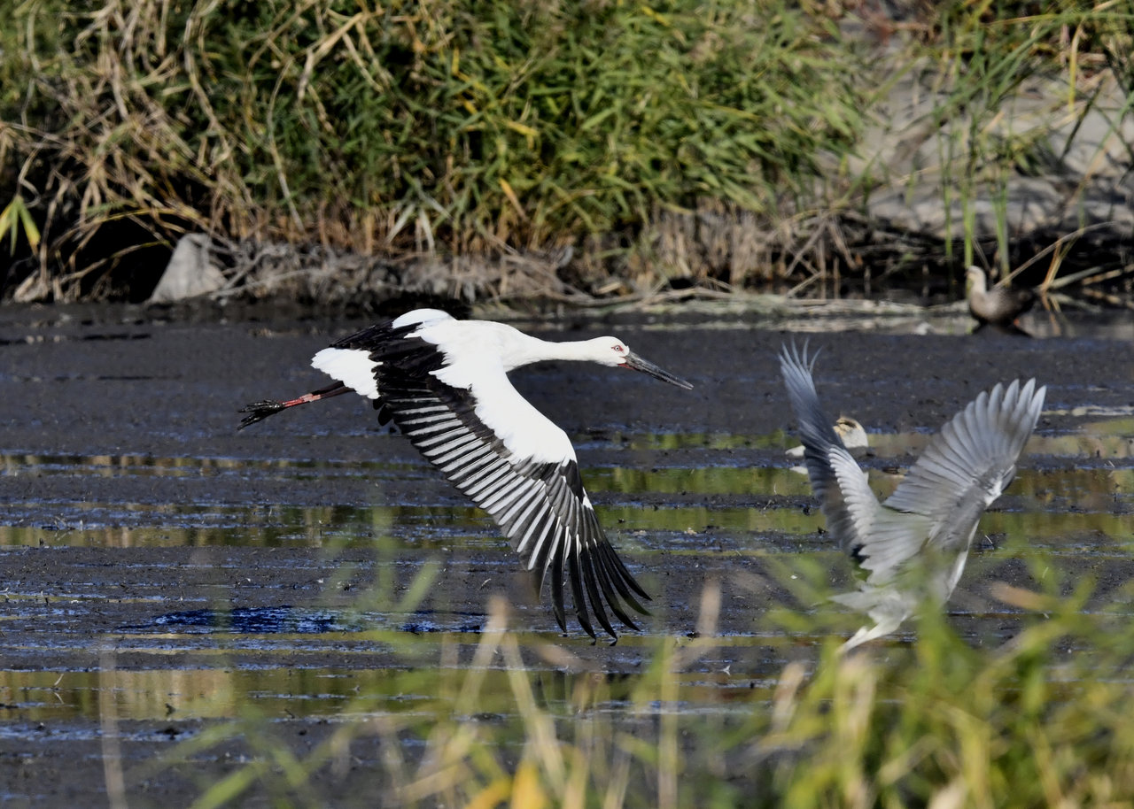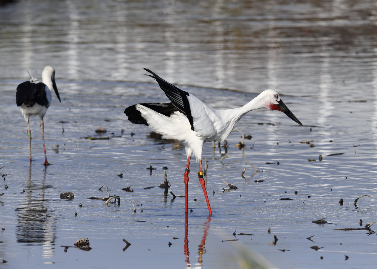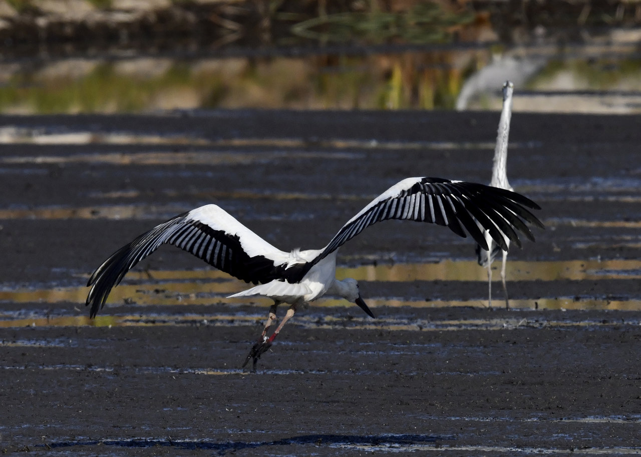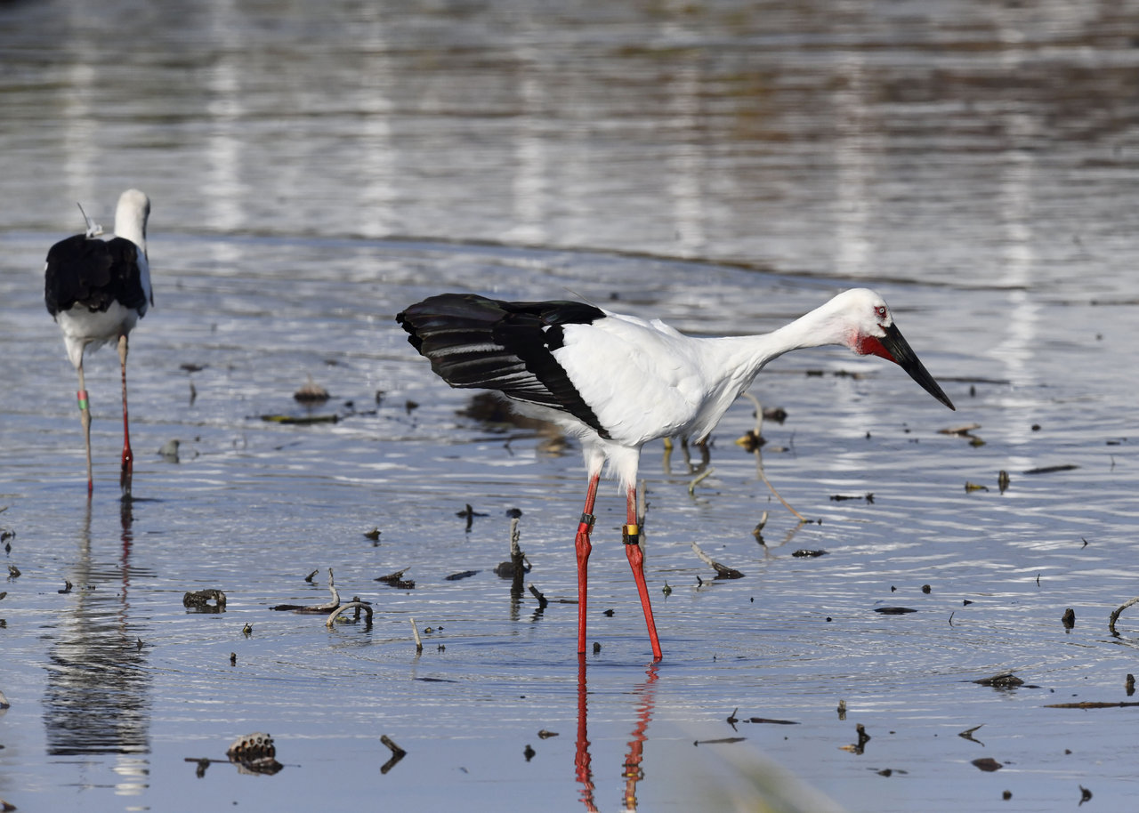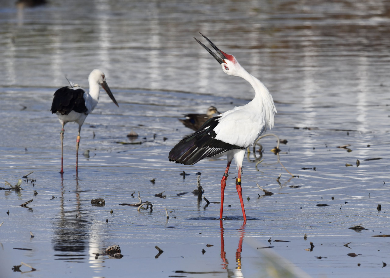 過日、近くの沼に来ていたコウノトリは少し前からこちらの調整池に来ており、もう1羽の
