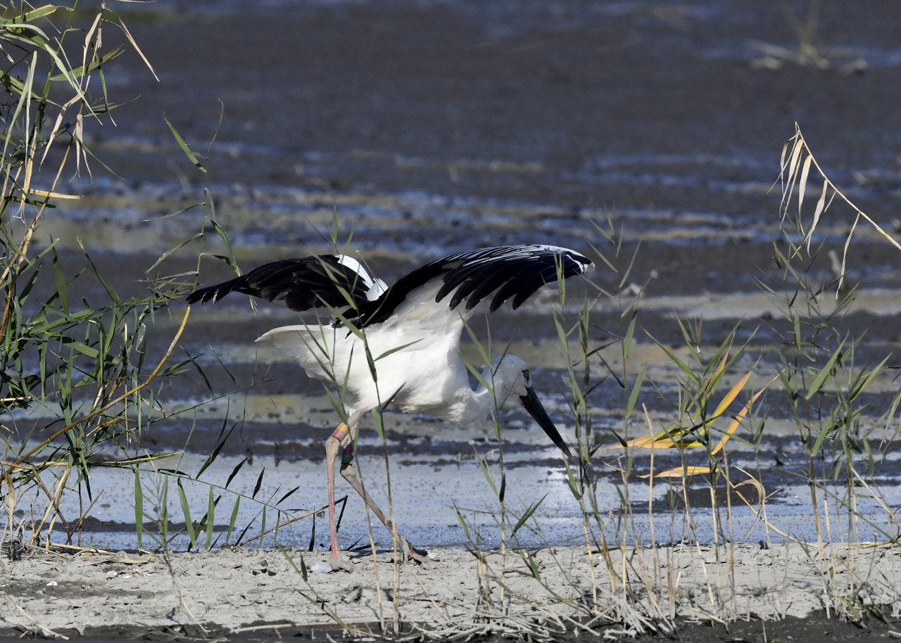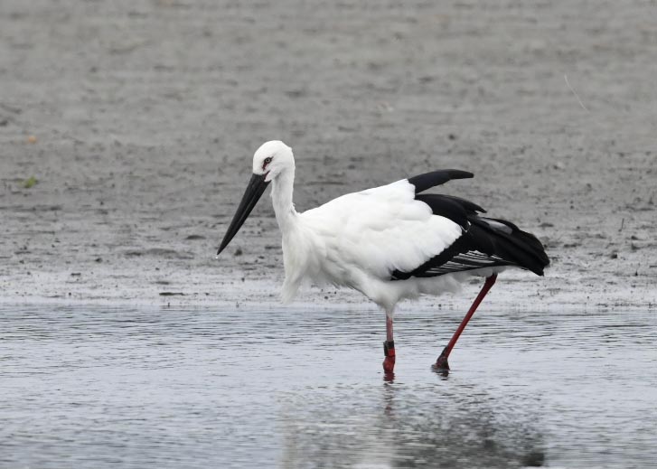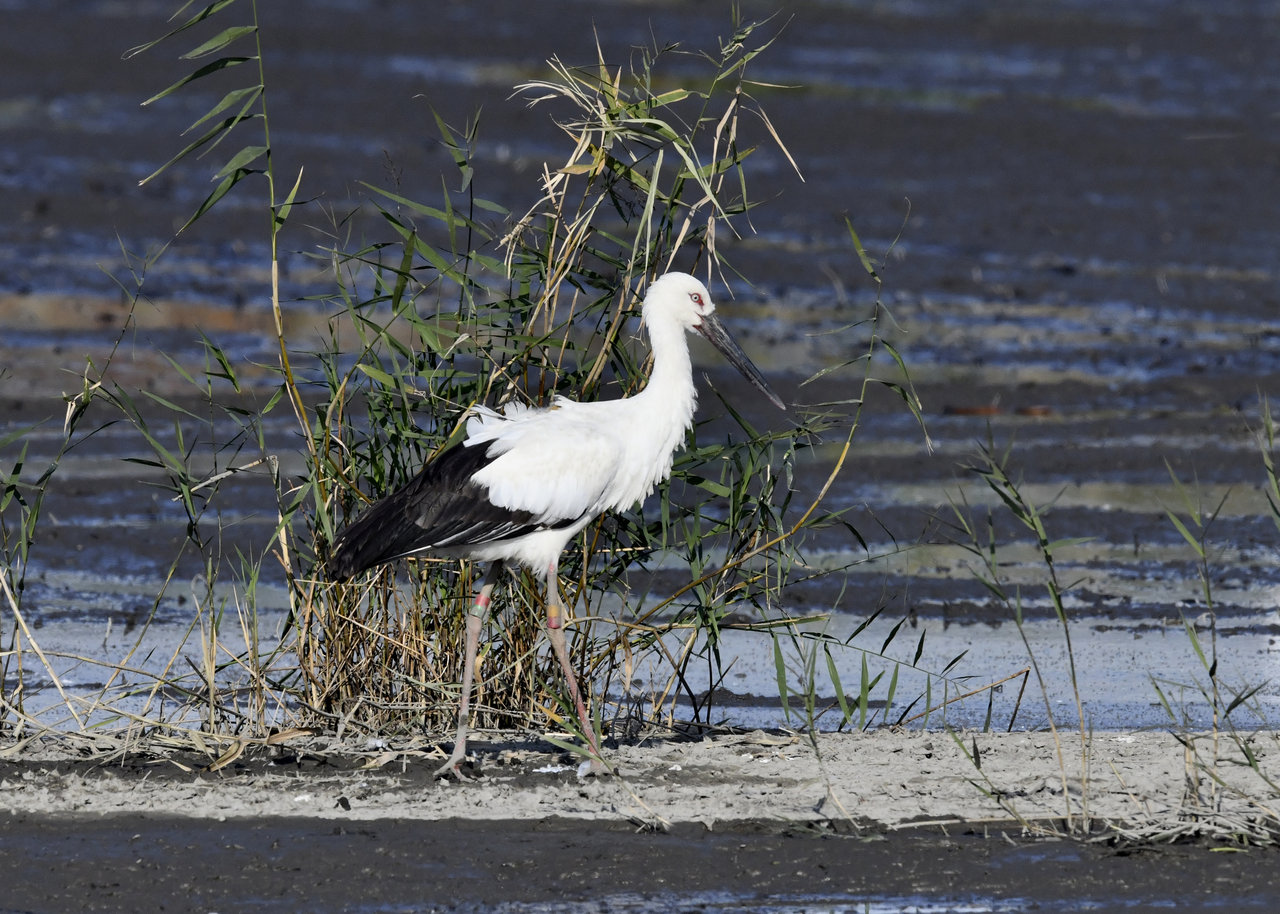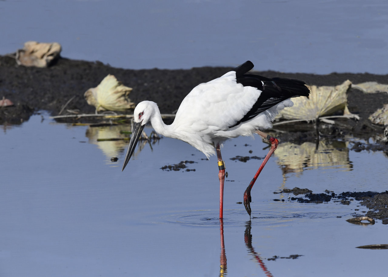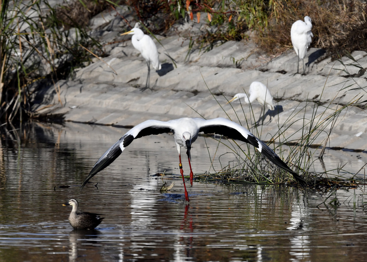 過日、近くの沼に来ていたコウノトリは少し前からこちらの調整池に来ており、もう1羽の