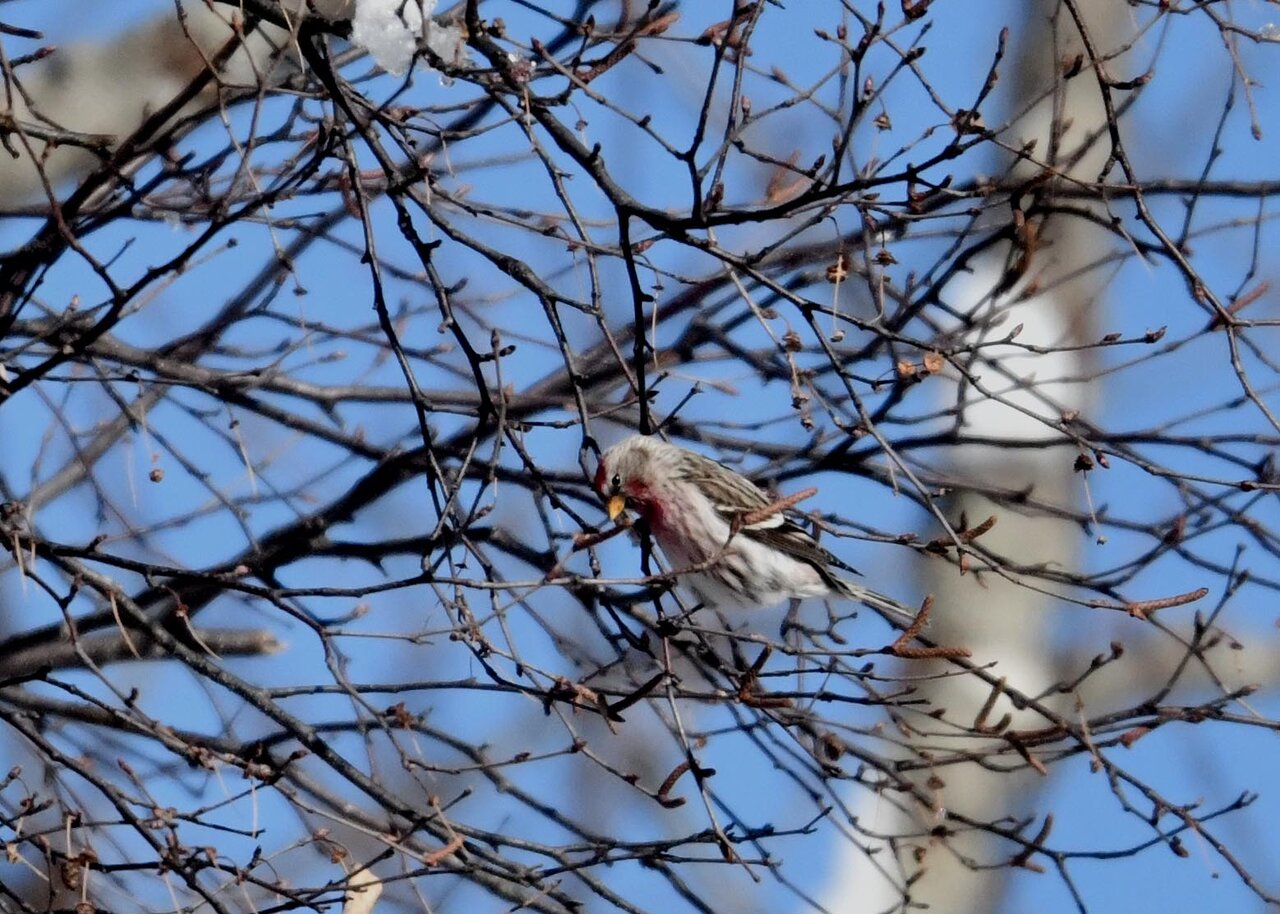 ズミ(?)の実でしょうか、吹雪の中夢中で啄ばんでいました。