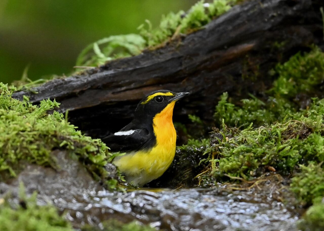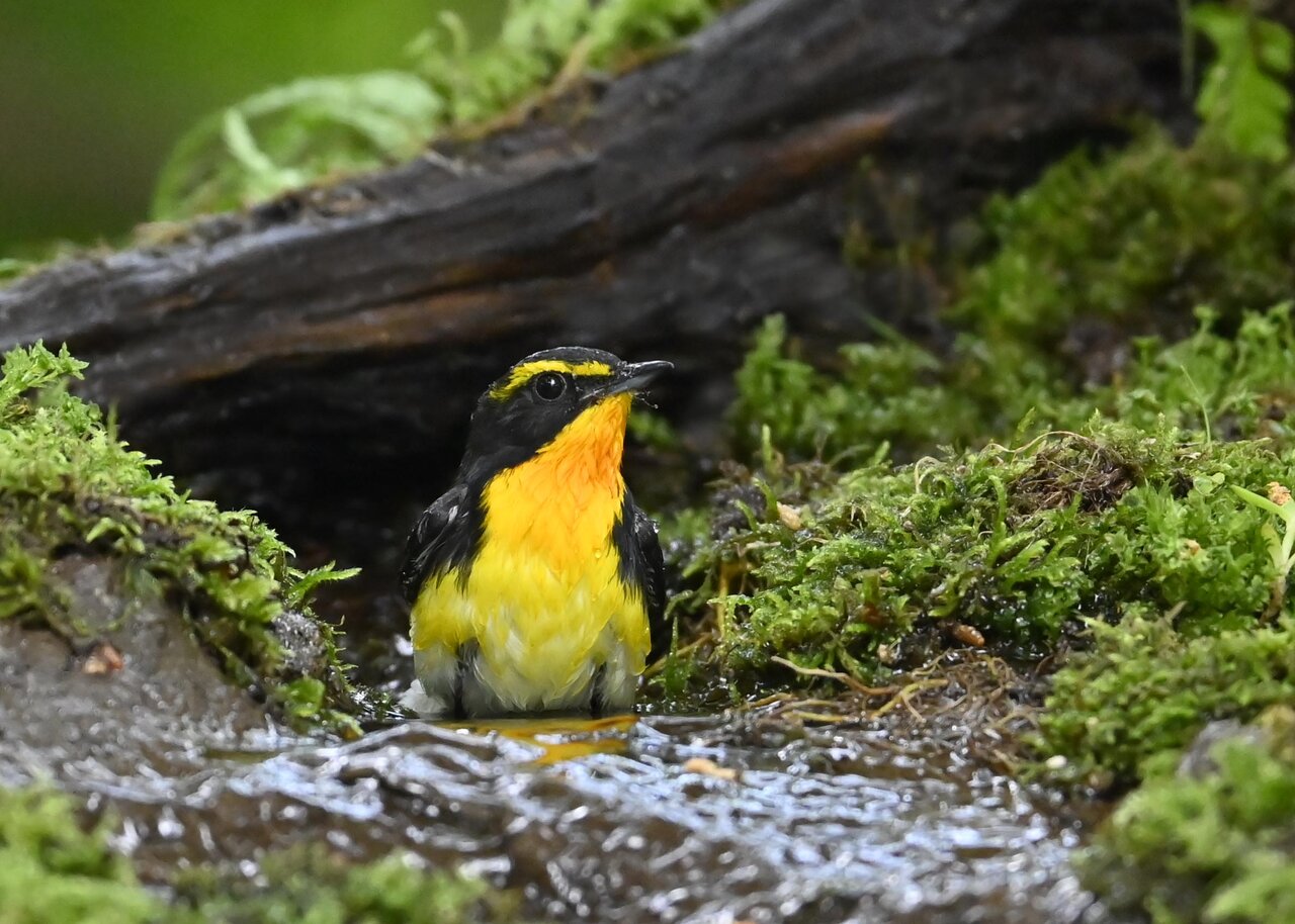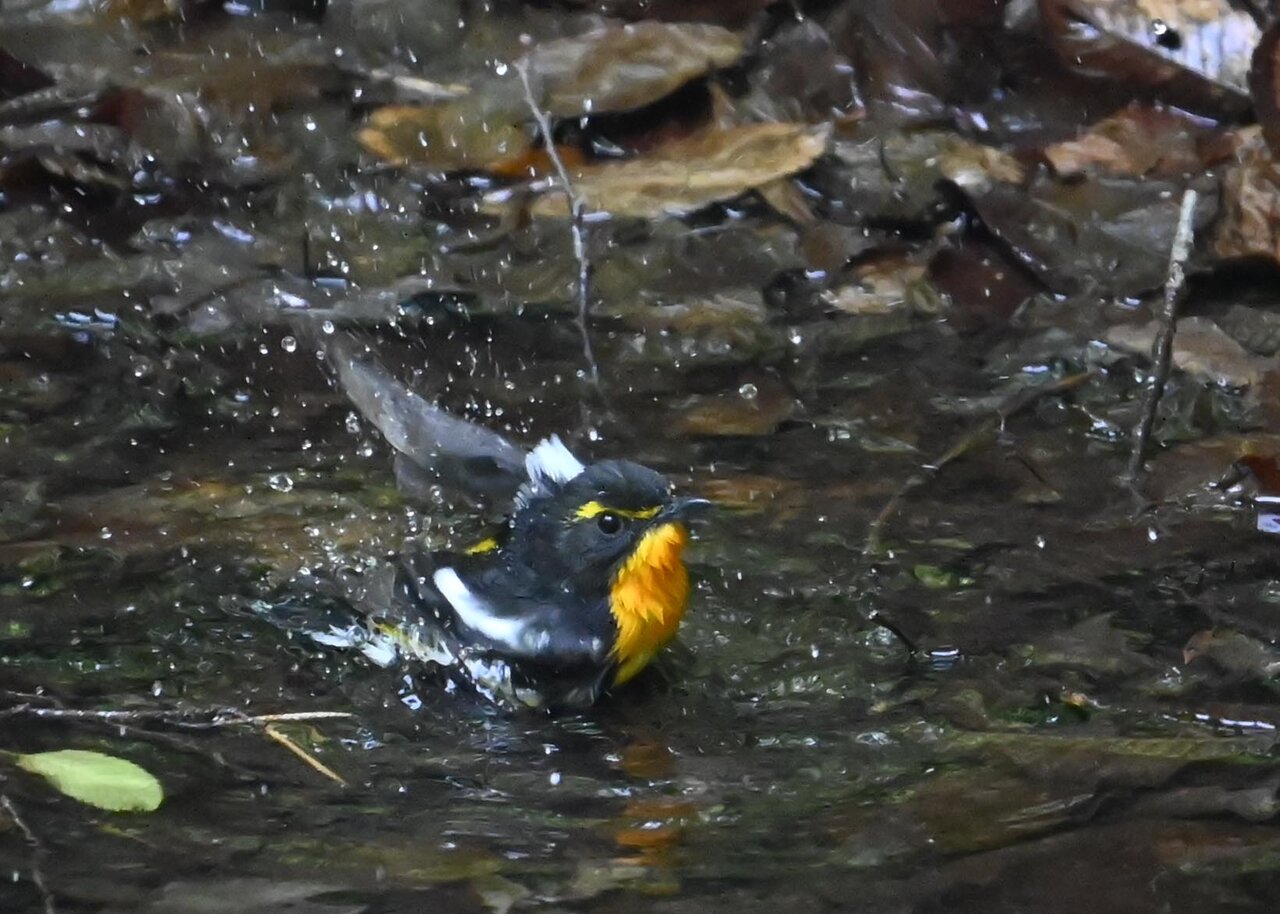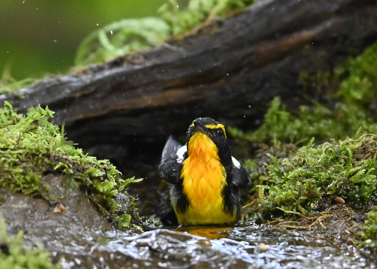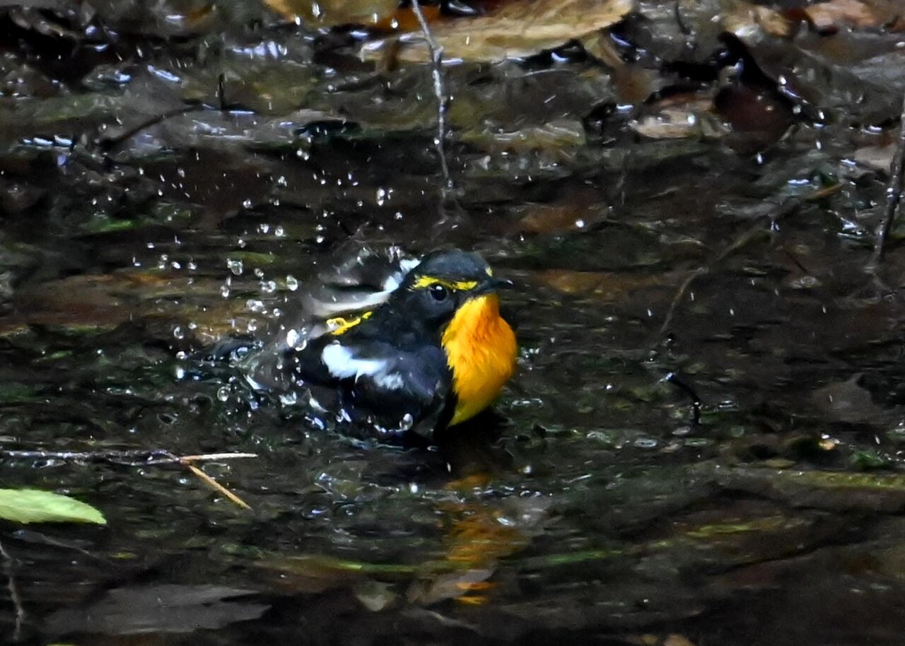 今日は、昨日に続き、キビタキ♂の水浴びシーンです。 この森林では、数組のキビタキが営巣しているようで同じ日に時間を置いて次に掲載のとおり別個体の♂がやって来ました。(♀個体は判別難しいですが、♂個体は黄色い眉斑の形状で別個体である事が明瞭です。)
