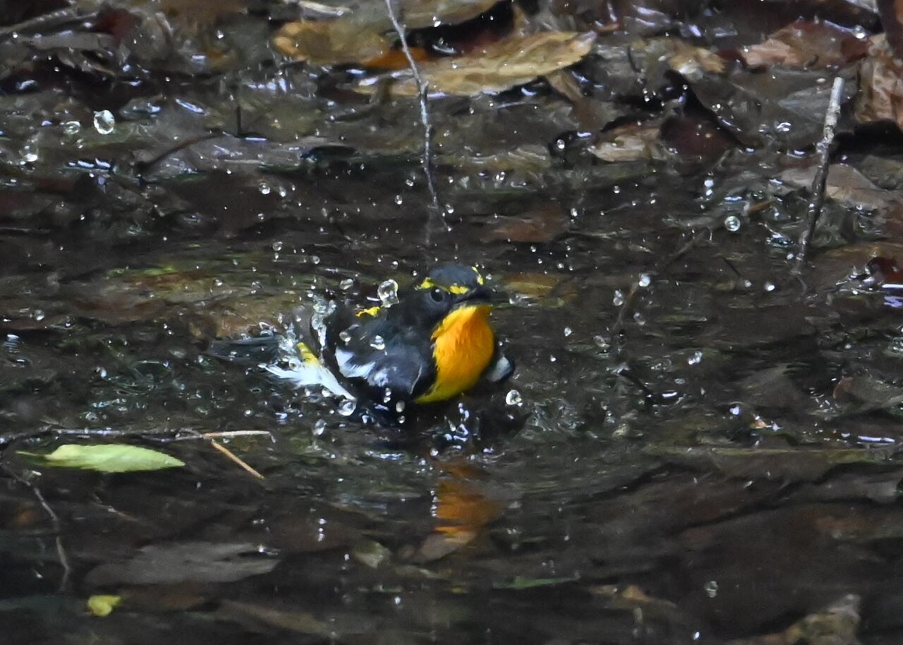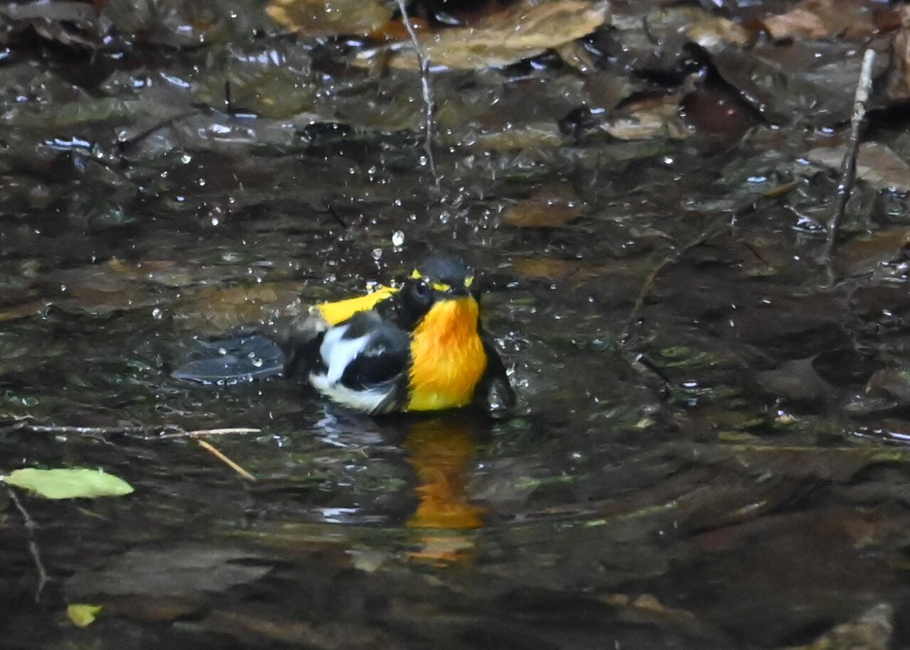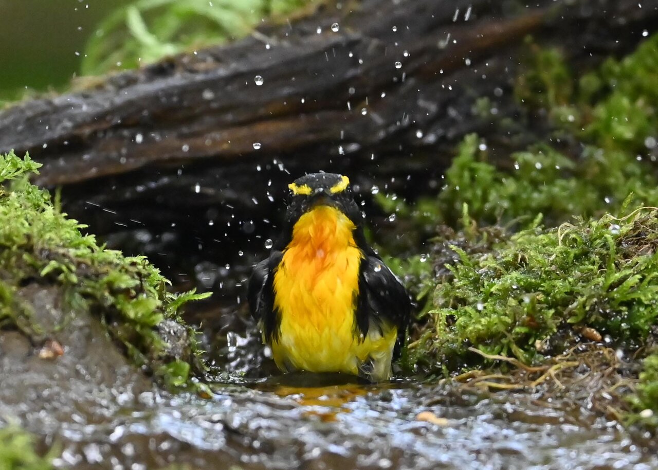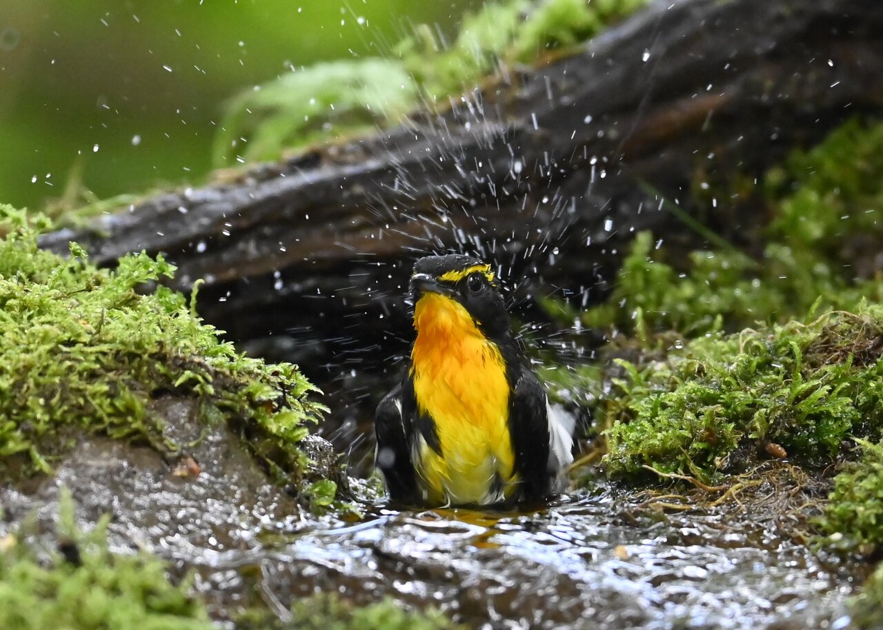 「キビタキ♂の水浴び」 撮影地 : 群馬県