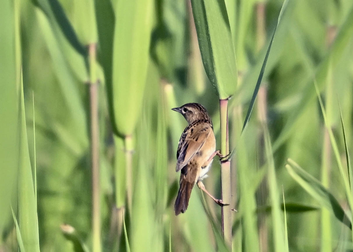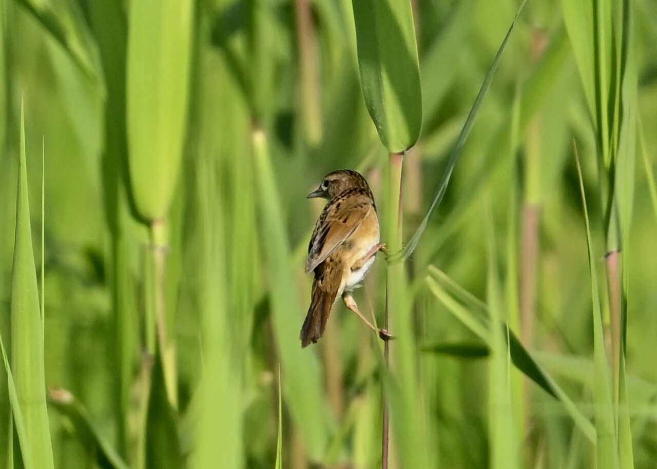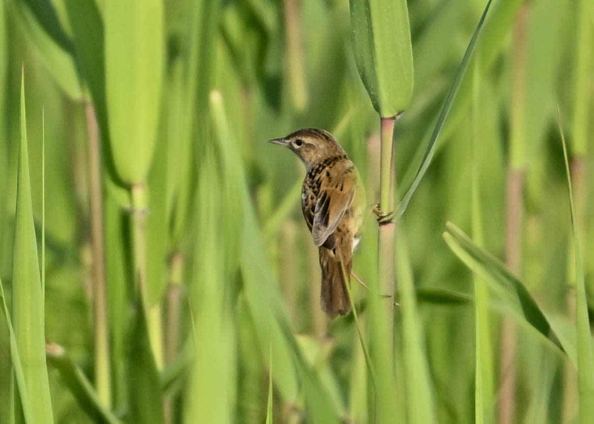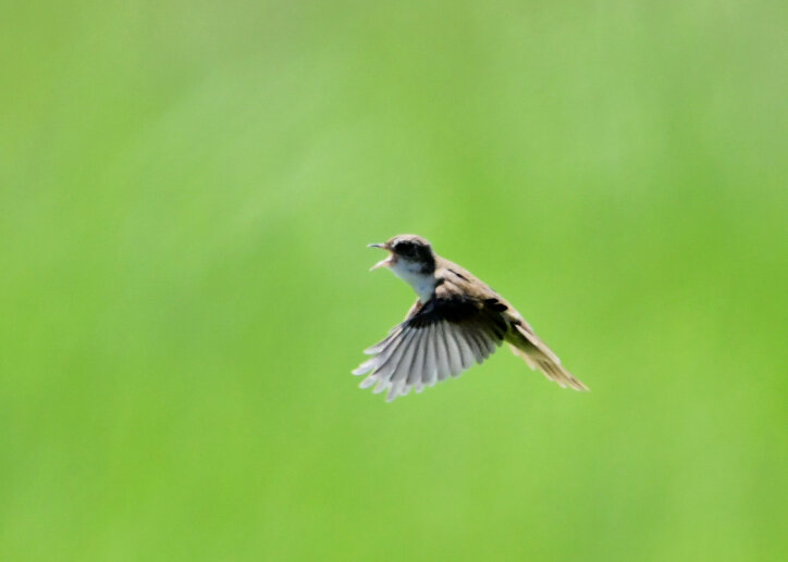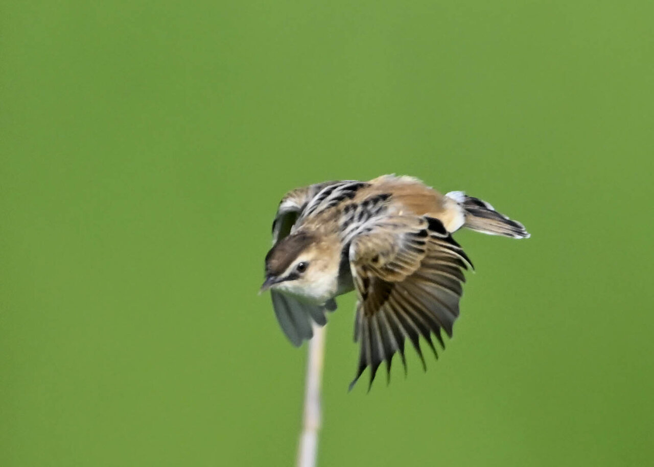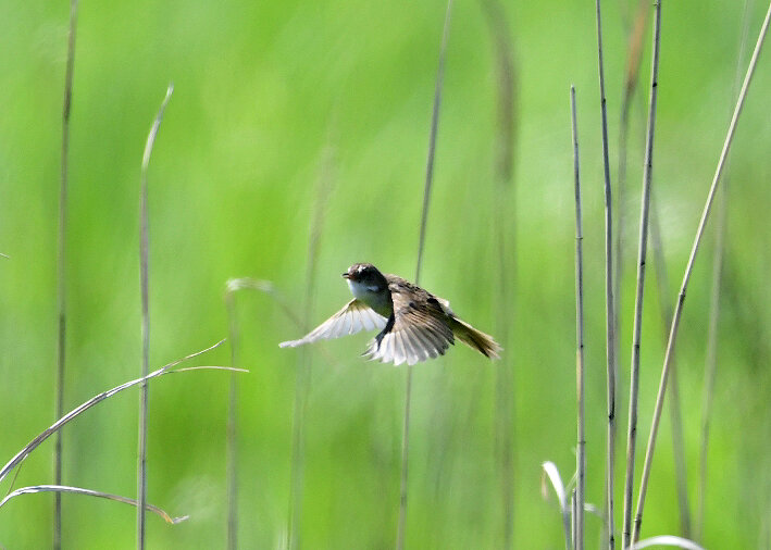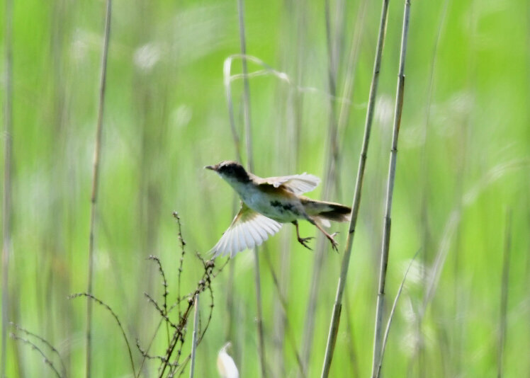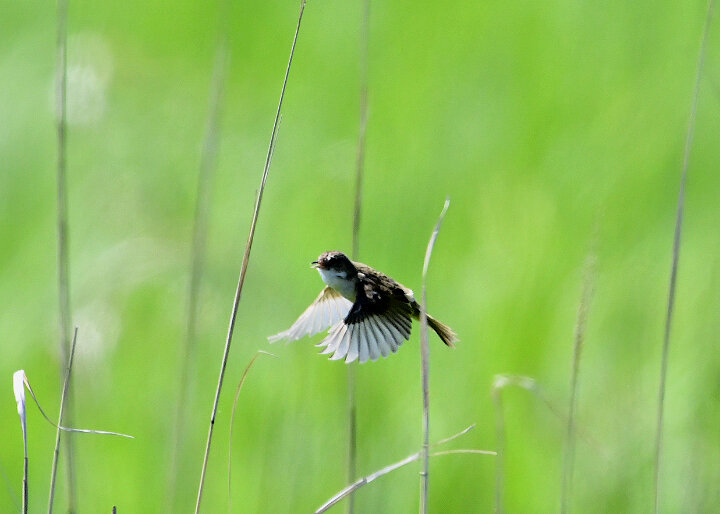 オオセッカの繁殖縄張りは狭く葦原の中にいますが、♂は独特の半円形の「囀り飛翔」するので見つけ易いですが、セッカやオオヨシキリの様に葦の穂先に止まらず、囀り飛翔の後葦の中腹に降り直ぐに草原に潜り込みますので撮影には中々手強いです。