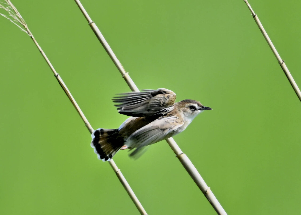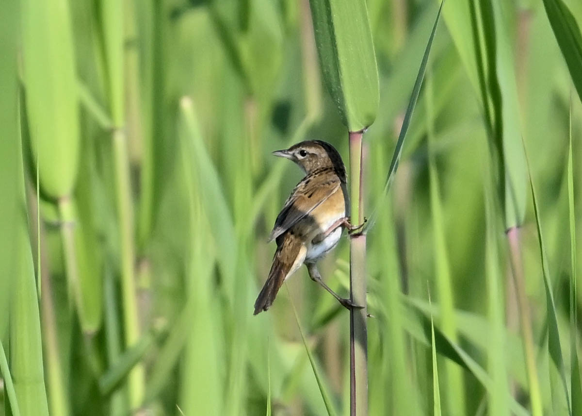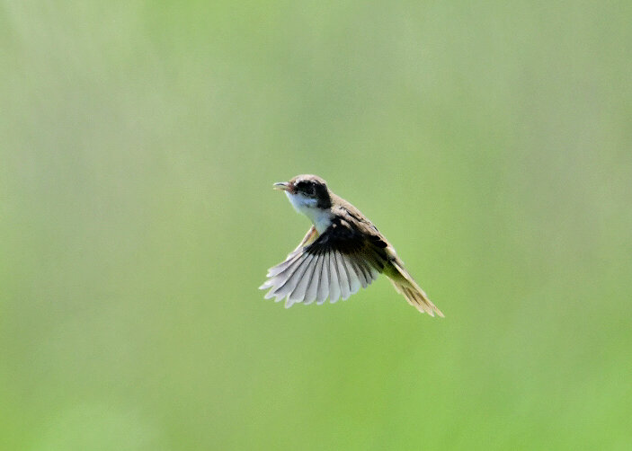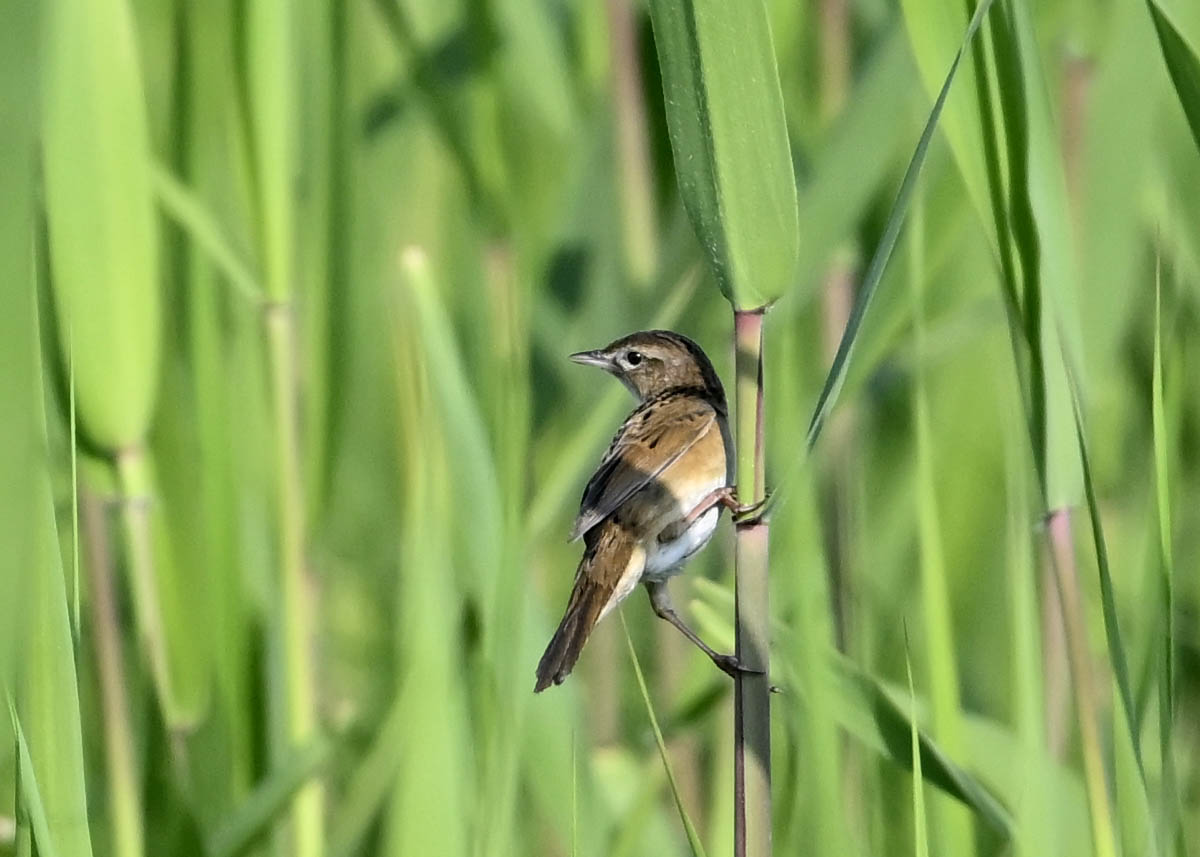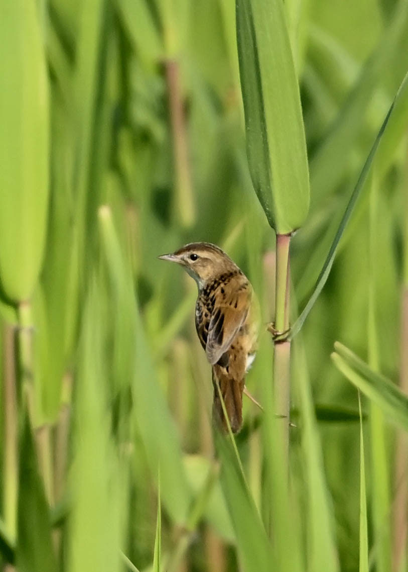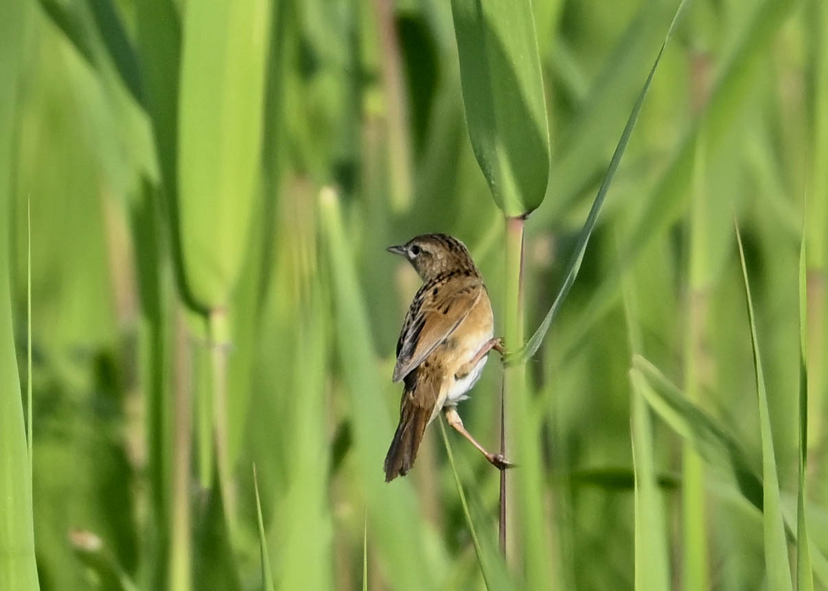 オオセッカの繁殖縄張りは狭く葦原の中にいますが、♂は独特の半円形の「囀り飛翔」するので見つけ易いですが、セッカやオオヨシキリの様に葦の穂先に止まらず、囀り飛翔の後葦の中腹に降り直ぐに草原に潜り込みますので撮影には中々手強いです。
