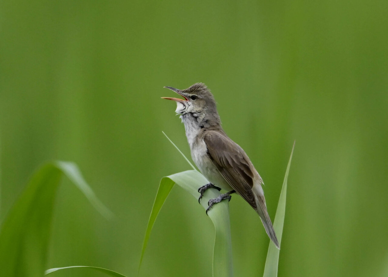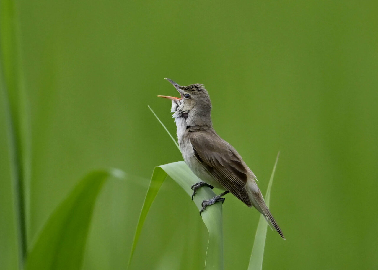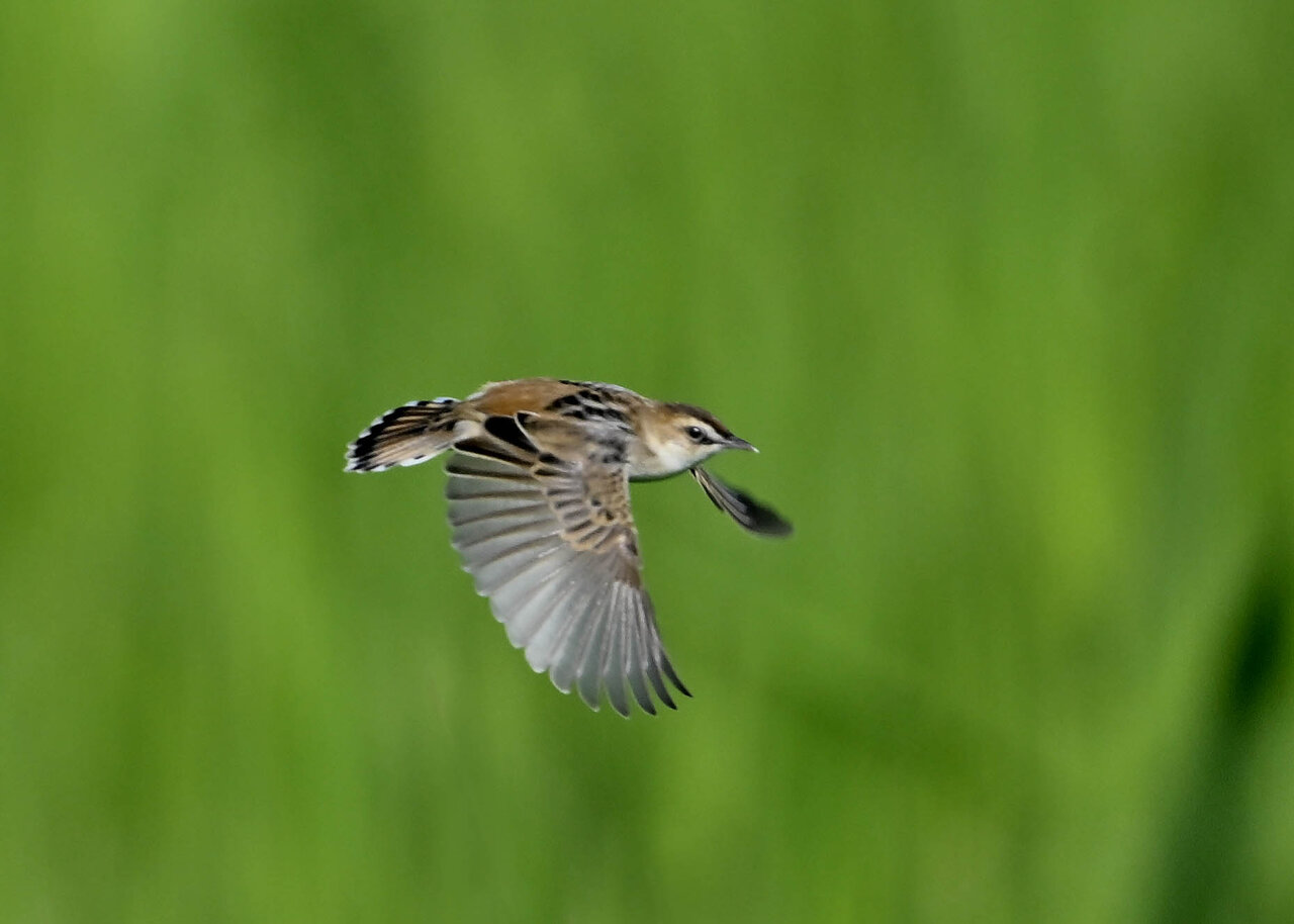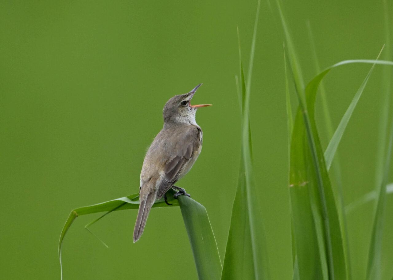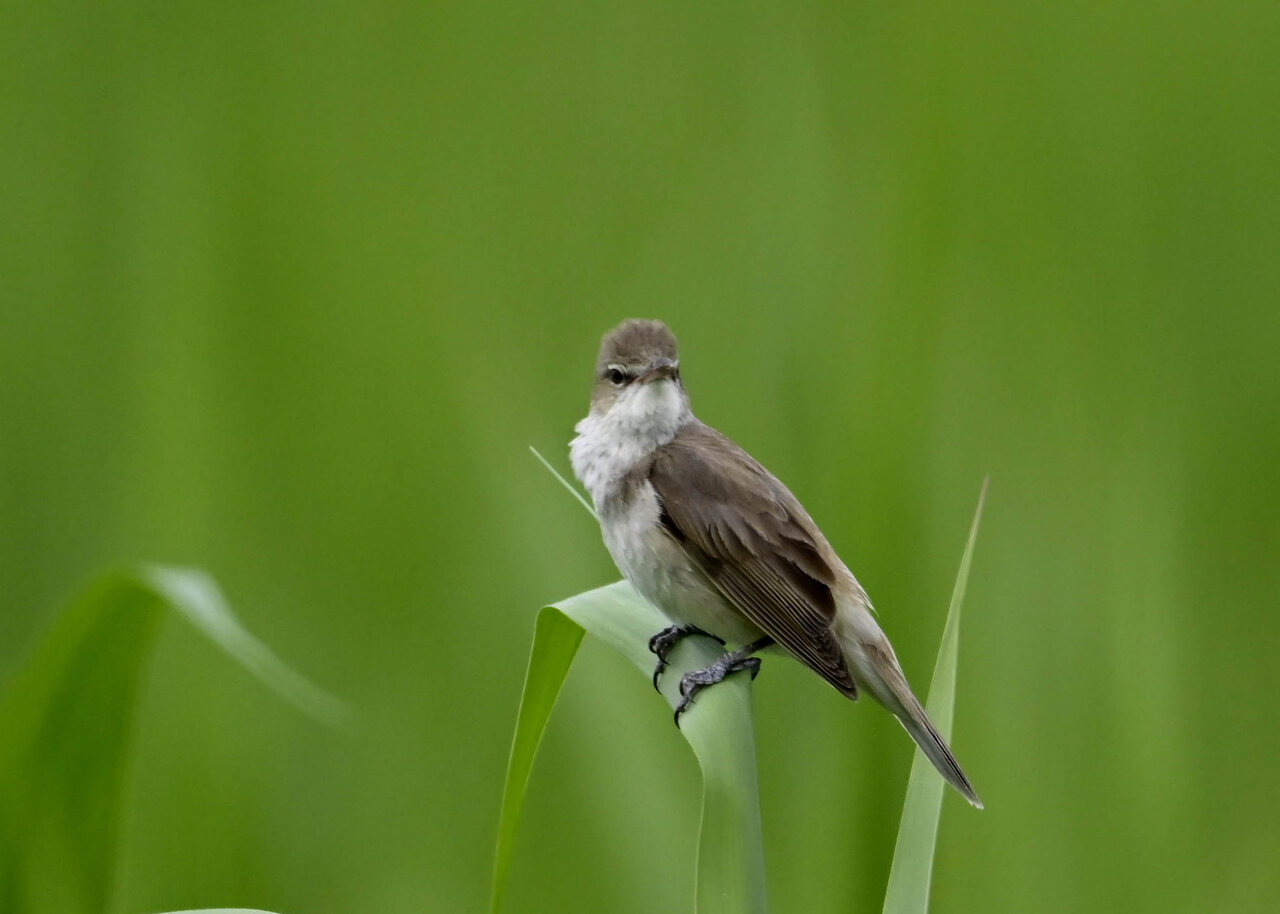 オオセッカの繁殖縄張りは狭く葦原の中にいますが、♂は独特の半円形の「囀り飛翔」するので見つけ易いですが、セッカやオオヨシキリの様に葦の穂先に止まらず、囀り飛翔の後葦の中腹に降り直ぐに草原に潜り込みますので撮影には中々手強いです。