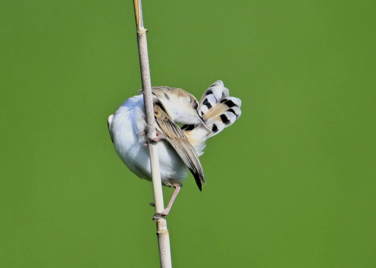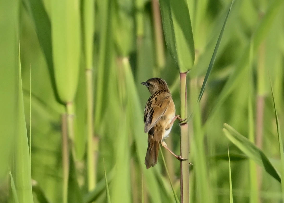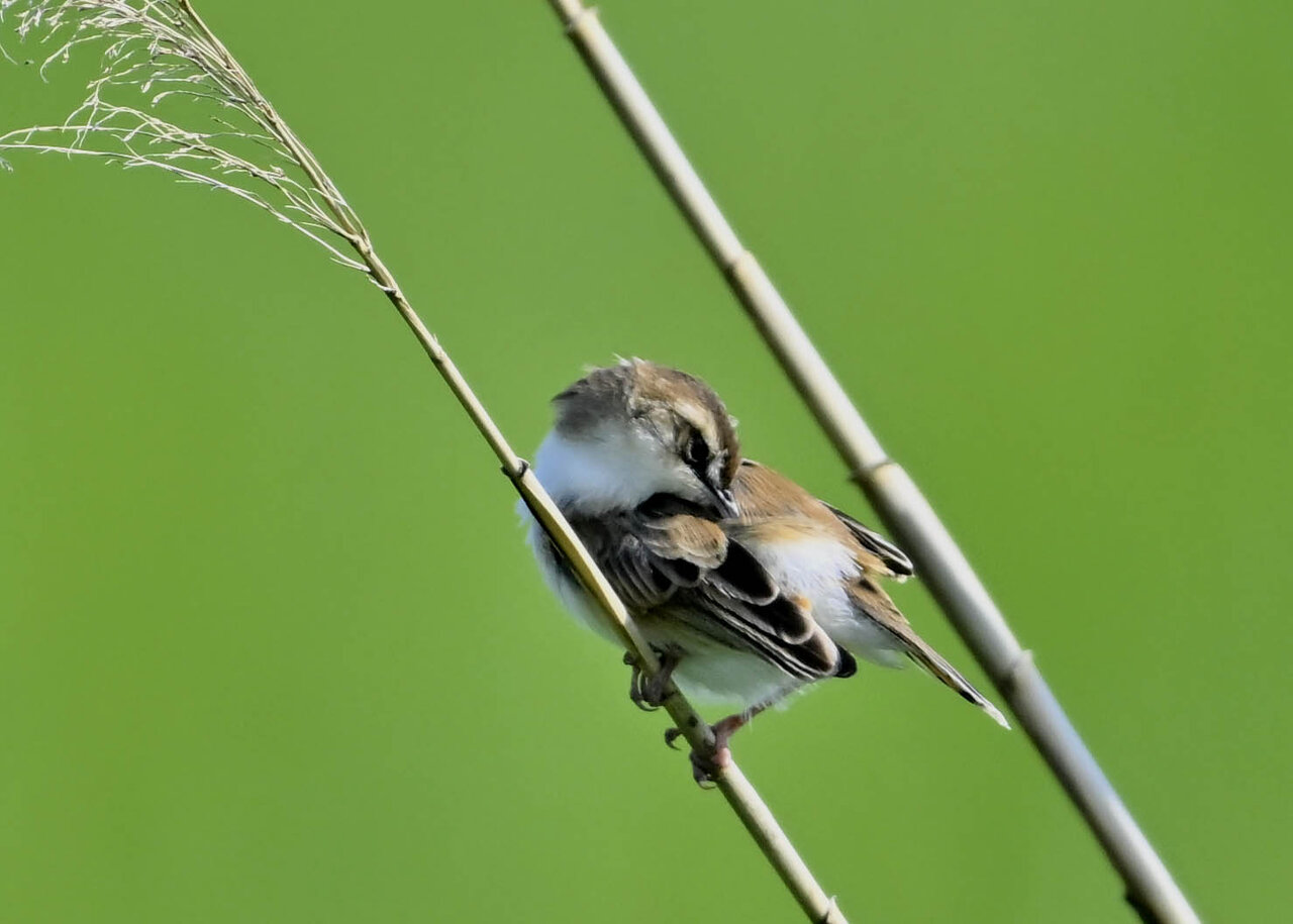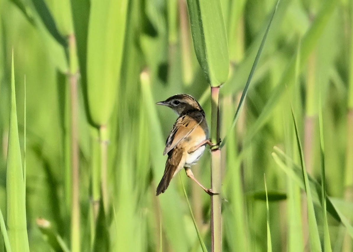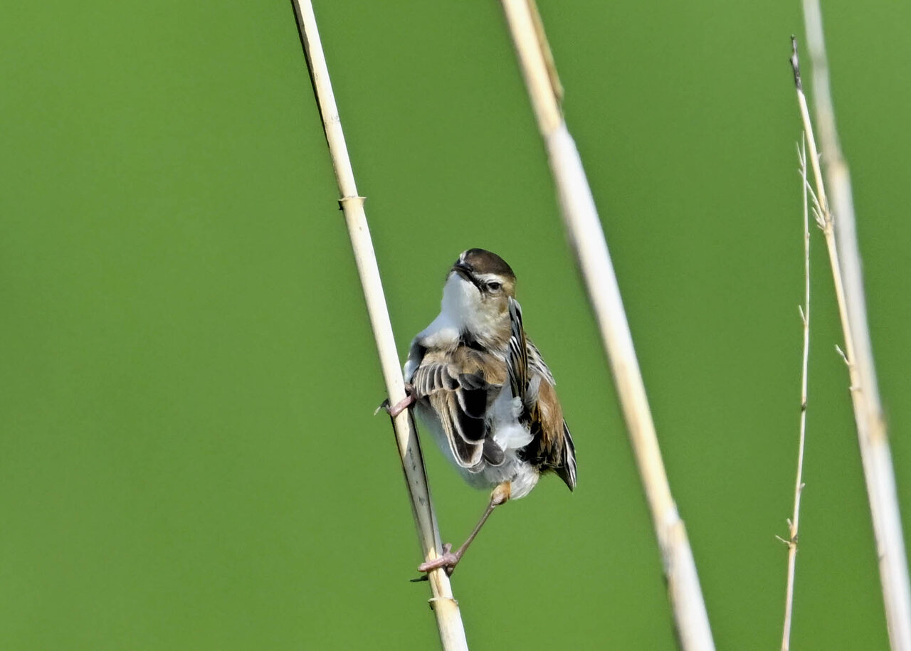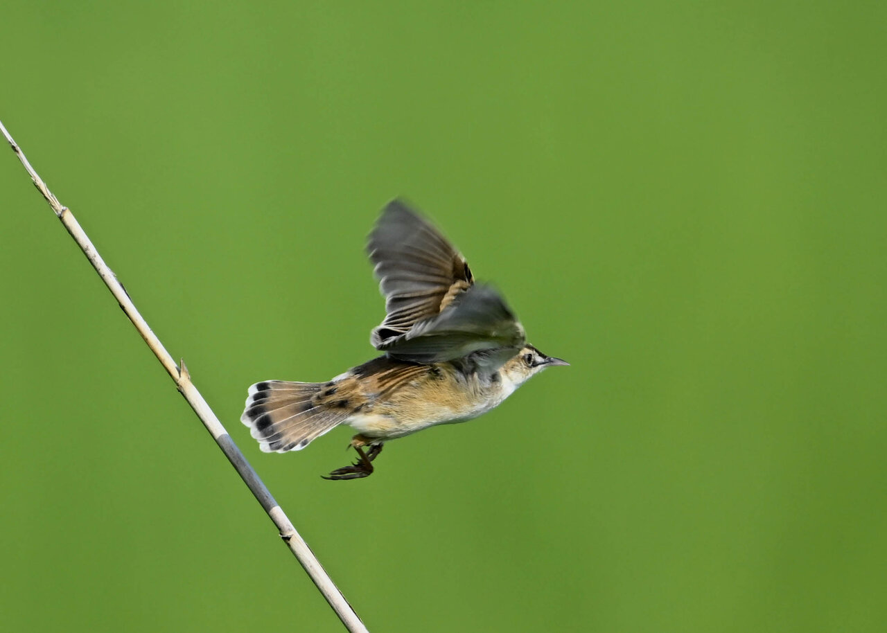 オオセッカの繁殖縄張りは狭く葦原の中にいますが、♂は独特の半円形の「囀り飛翔」するので見つけ易いですが、セッカやオオヨシキリの様に葦の穂先に止まらず、囀り飛翔の後葦の中腹に降り直ぐに草原に潜り込みますので撮影には中々手強いです。