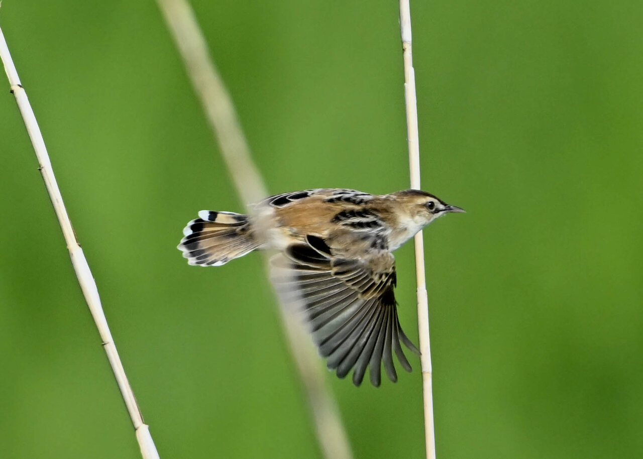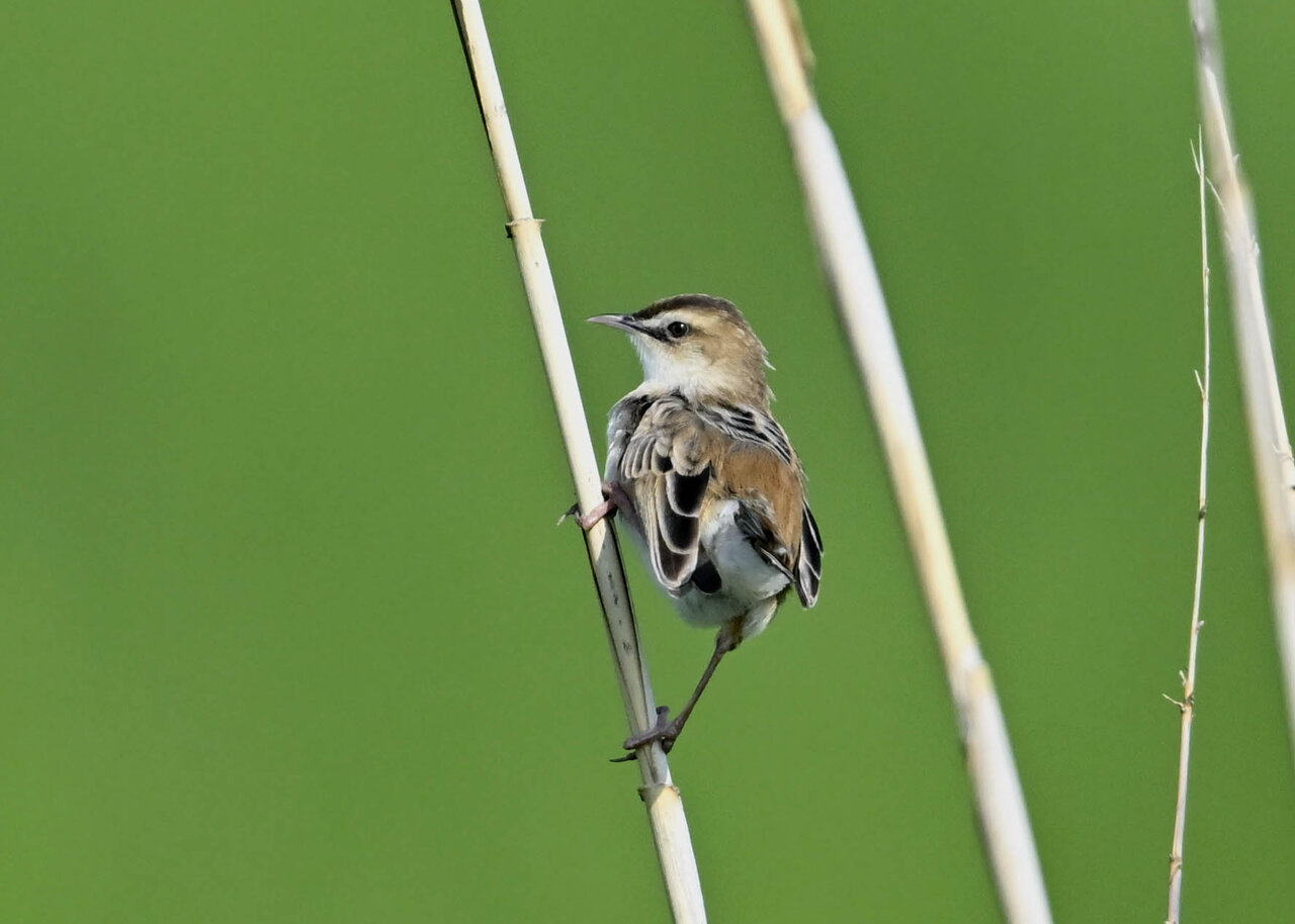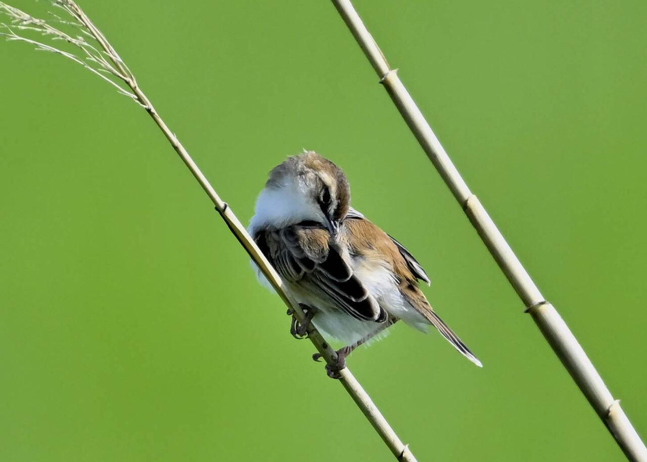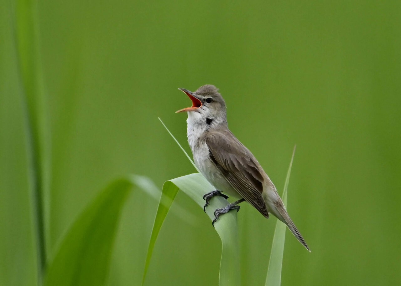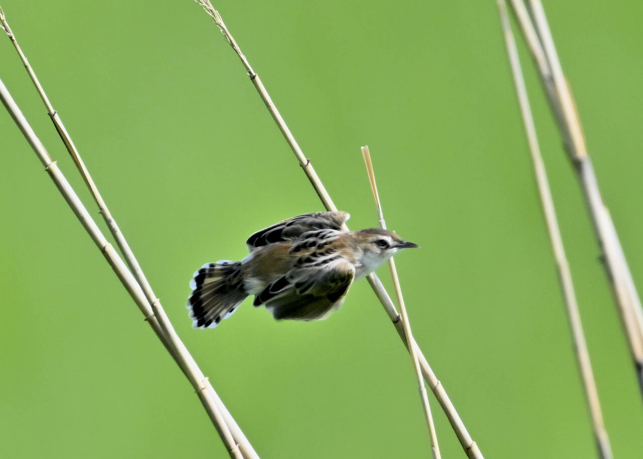 オオセッカの繁殖縄張りは狭く葦原の中にいますが、♂は独特の半円形の「囀り飛翔」するので見つけ易いですが、セッカやオオヨシキリの様に葦の穂先に止まらず、囀り飛翔の後葦の中腹に降り直ぐに草原に潜り込みますので撮影には中々手強いです。