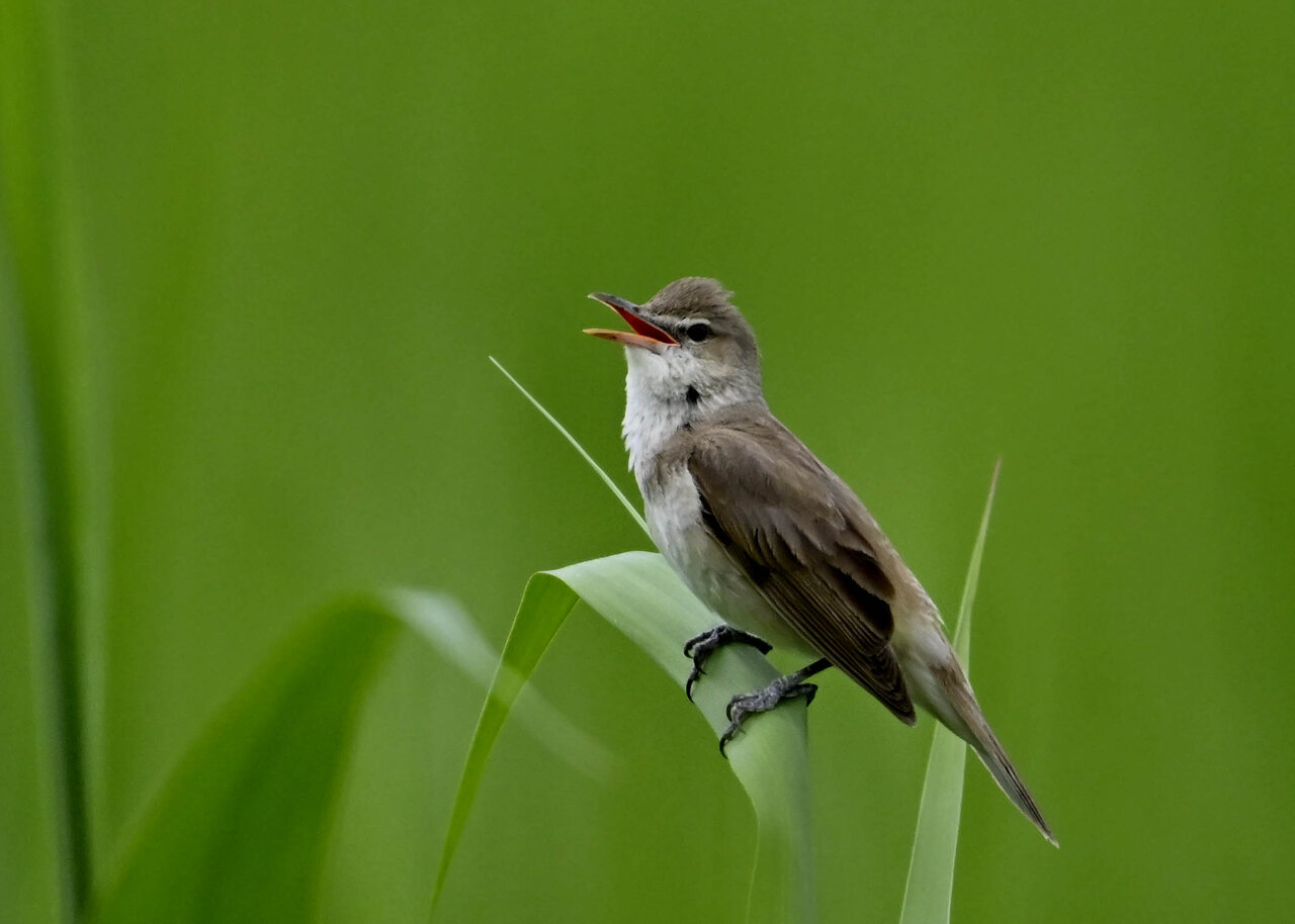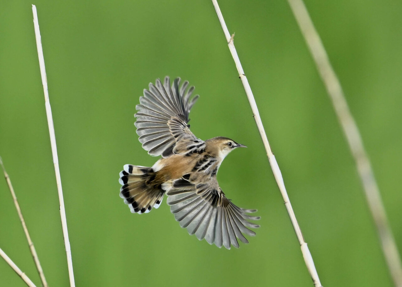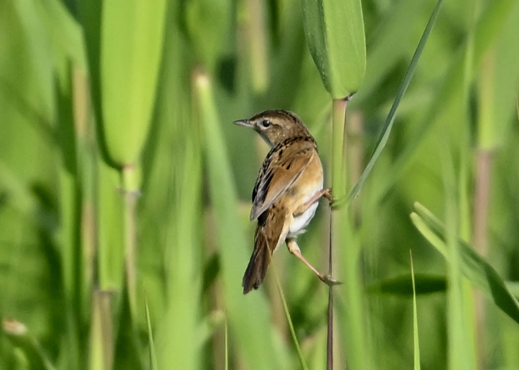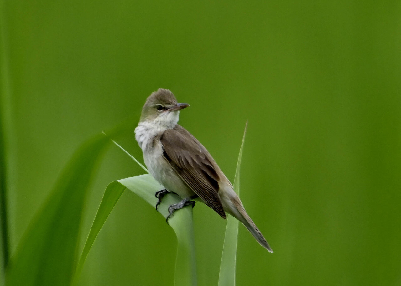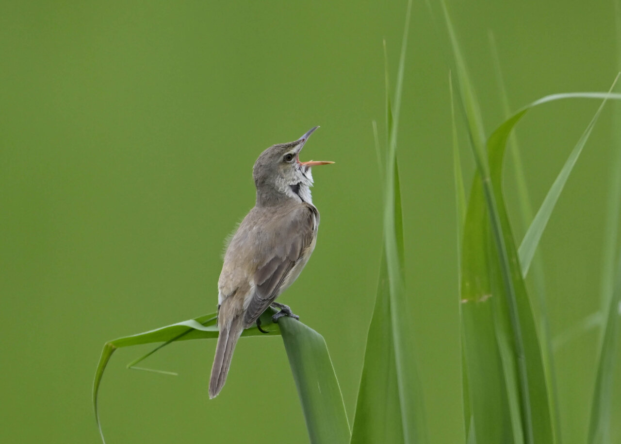 オオセッカの繁殖縄張りは狭く葦原の中にいますが、♂は独特の半円形の「囀り飛翔」するので見つけ易いですが、セッカやオオヨシキリの様に葦の穂先に止まらず、囀り飛翔の後葦の中腹に降り直ぐに草原に潜り込みますので撮影には中々手強いです。