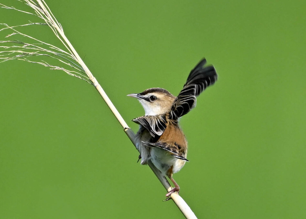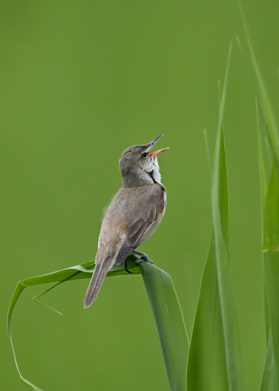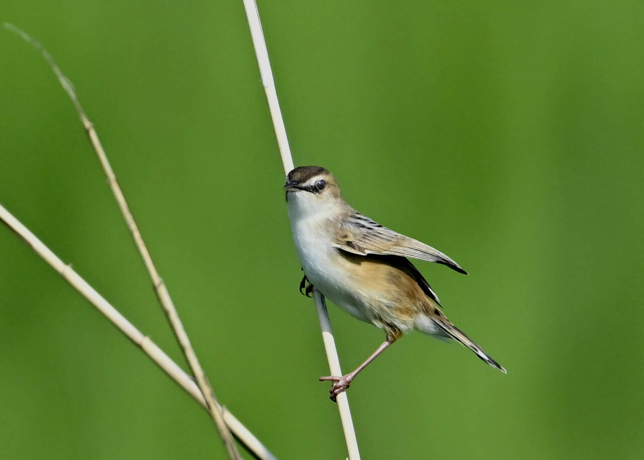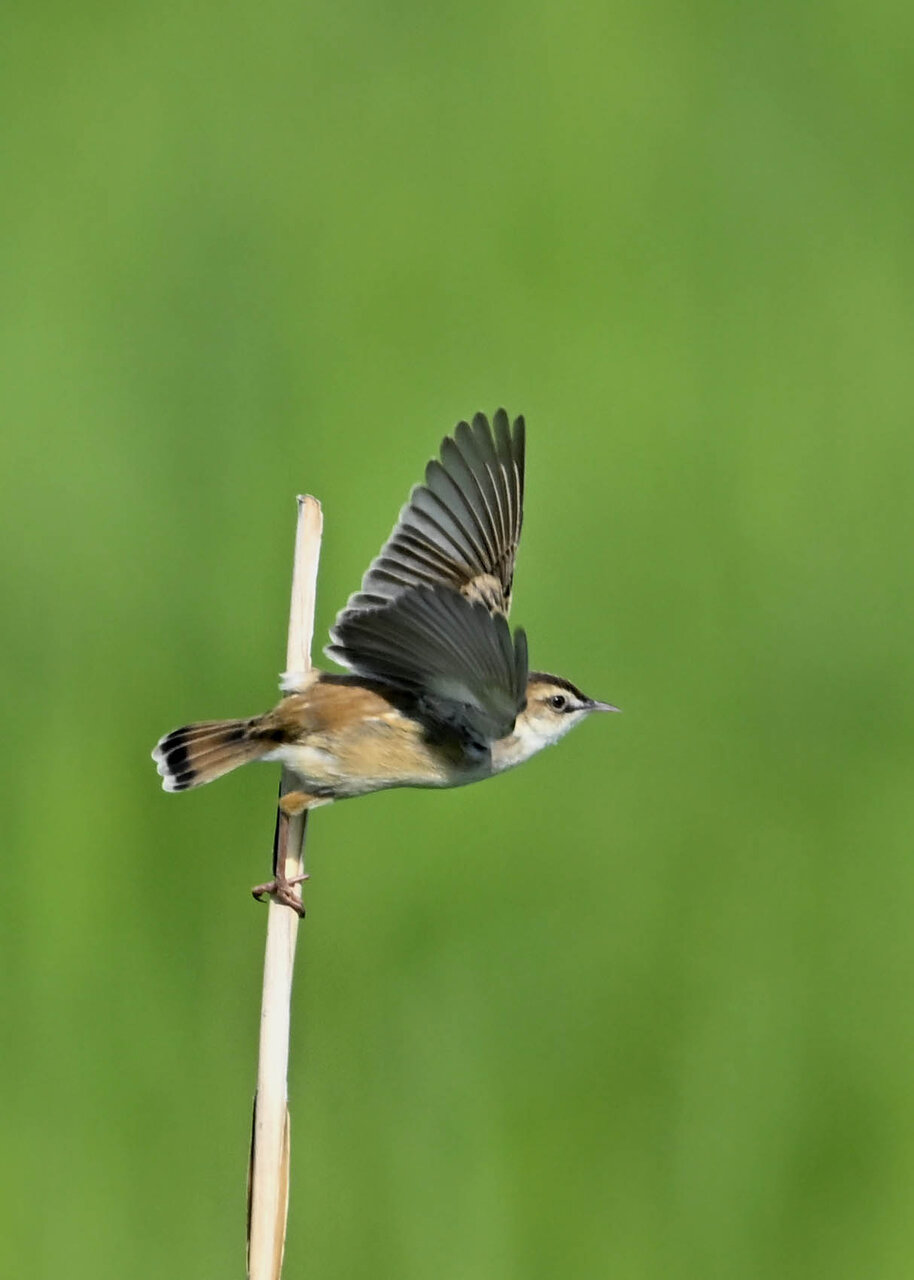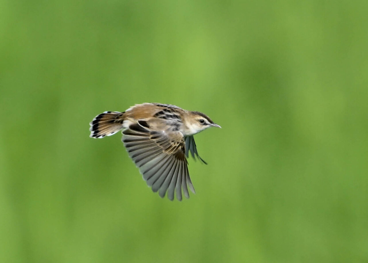 オオセッカの繁殖縄張りは狭く葦原の中にいますが、♂は独特の半円形の「囀り飛翔」するので見つけ易いですが、セッカやオオヨシキリの様に葦の穂先に止まらず、囀り飛翔の後葦の中腹に降り直ぐに草原に潜り込みますので撮影には中々手強いです。
