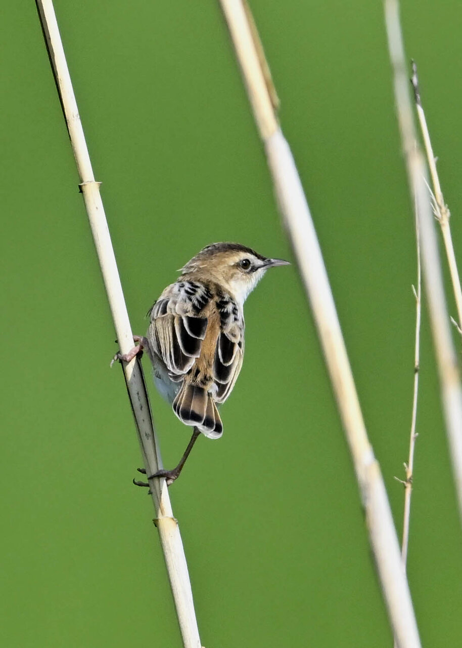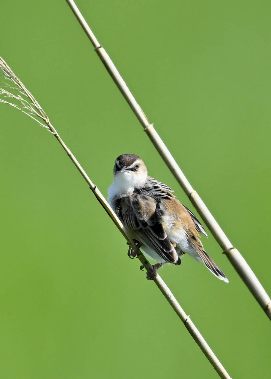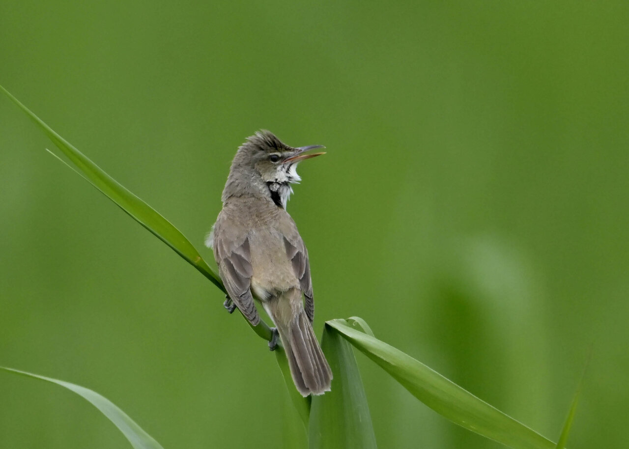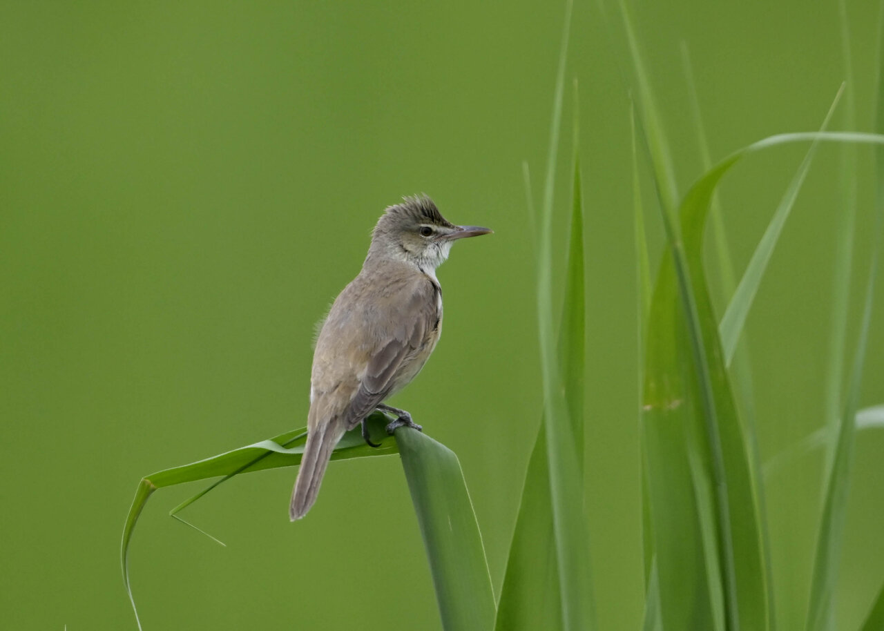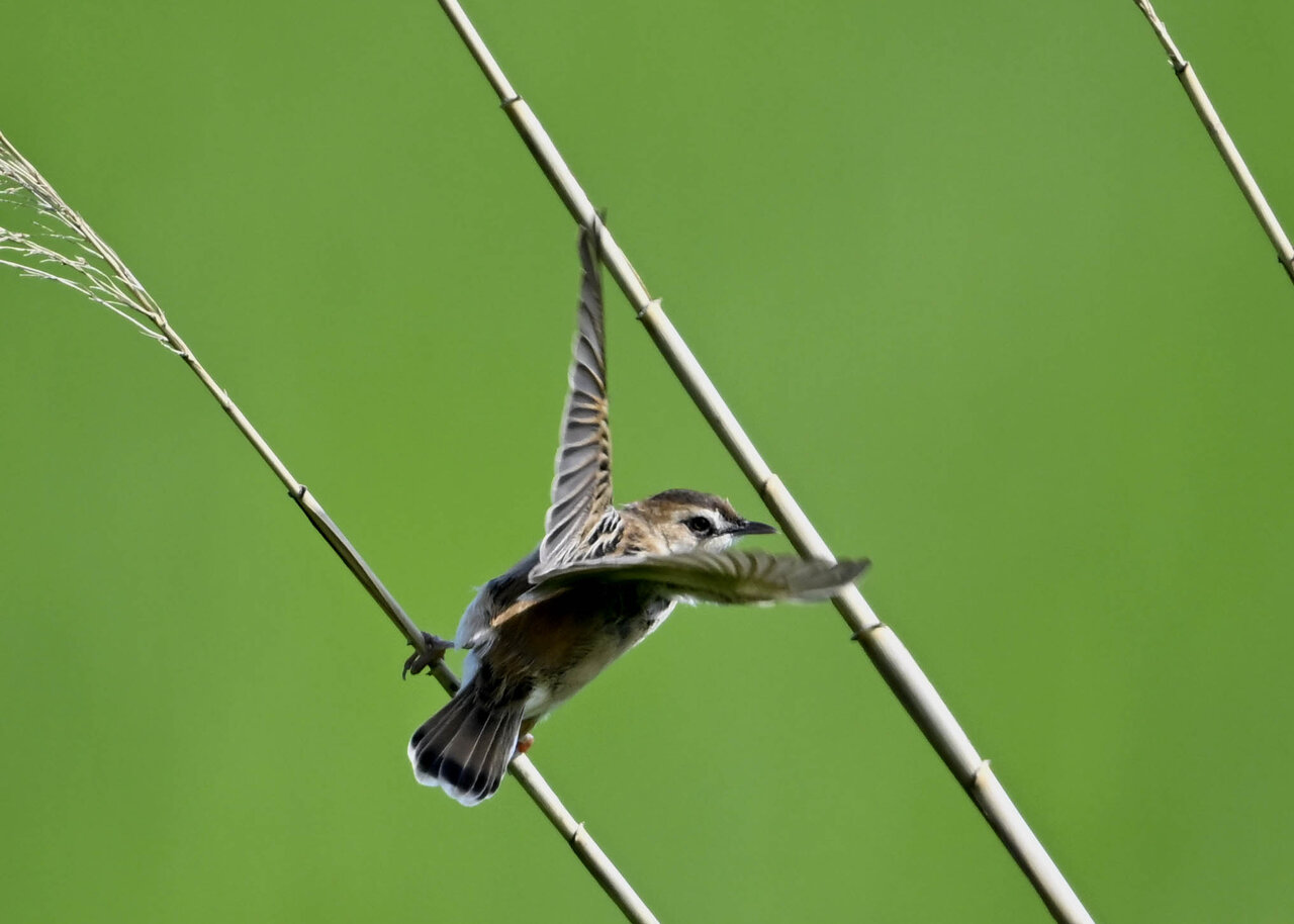 オオセッカの繁殖縄張りは狭く葦原の中にいますが、♂は独特の半円形の「囀り飛翔」するので見つけ易いですが、セッカやオオヨシキリの様に葦の穂先に止まらず、囀り飛翔の後葦の中腹に降り直ぐに草原に潜り込みますので撮影には中々手強いです。