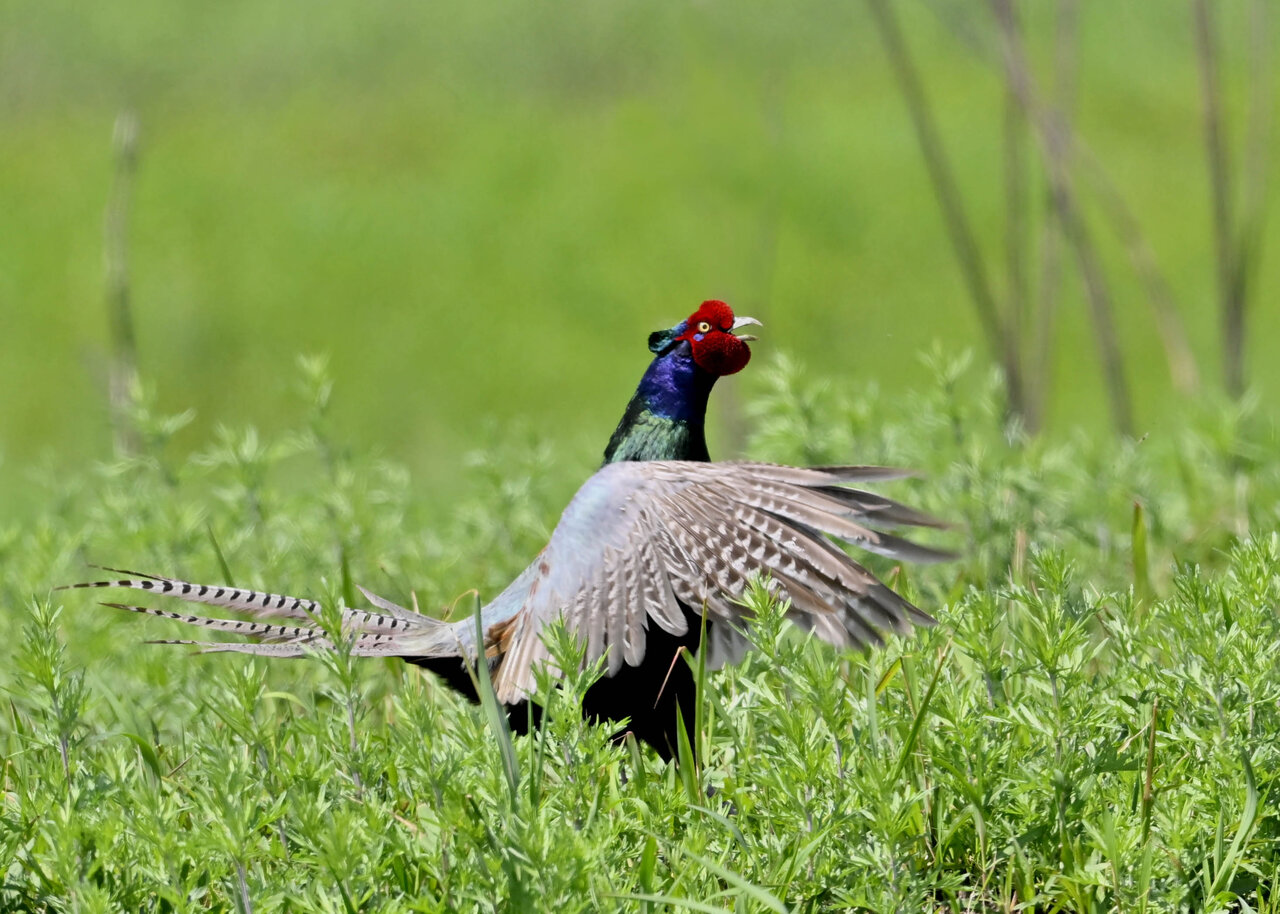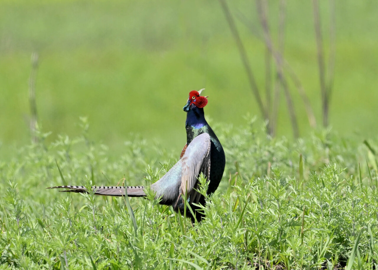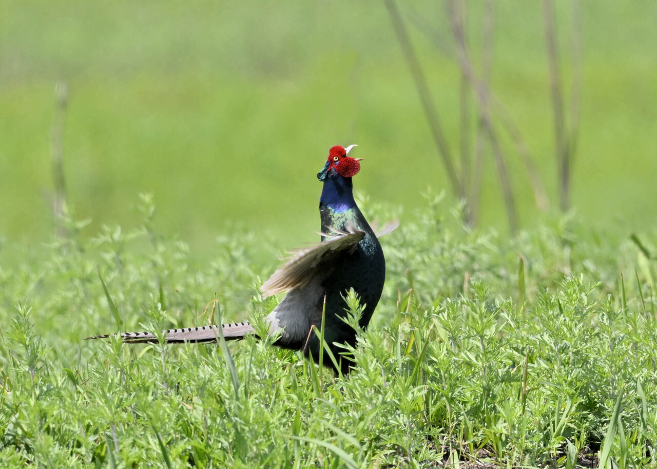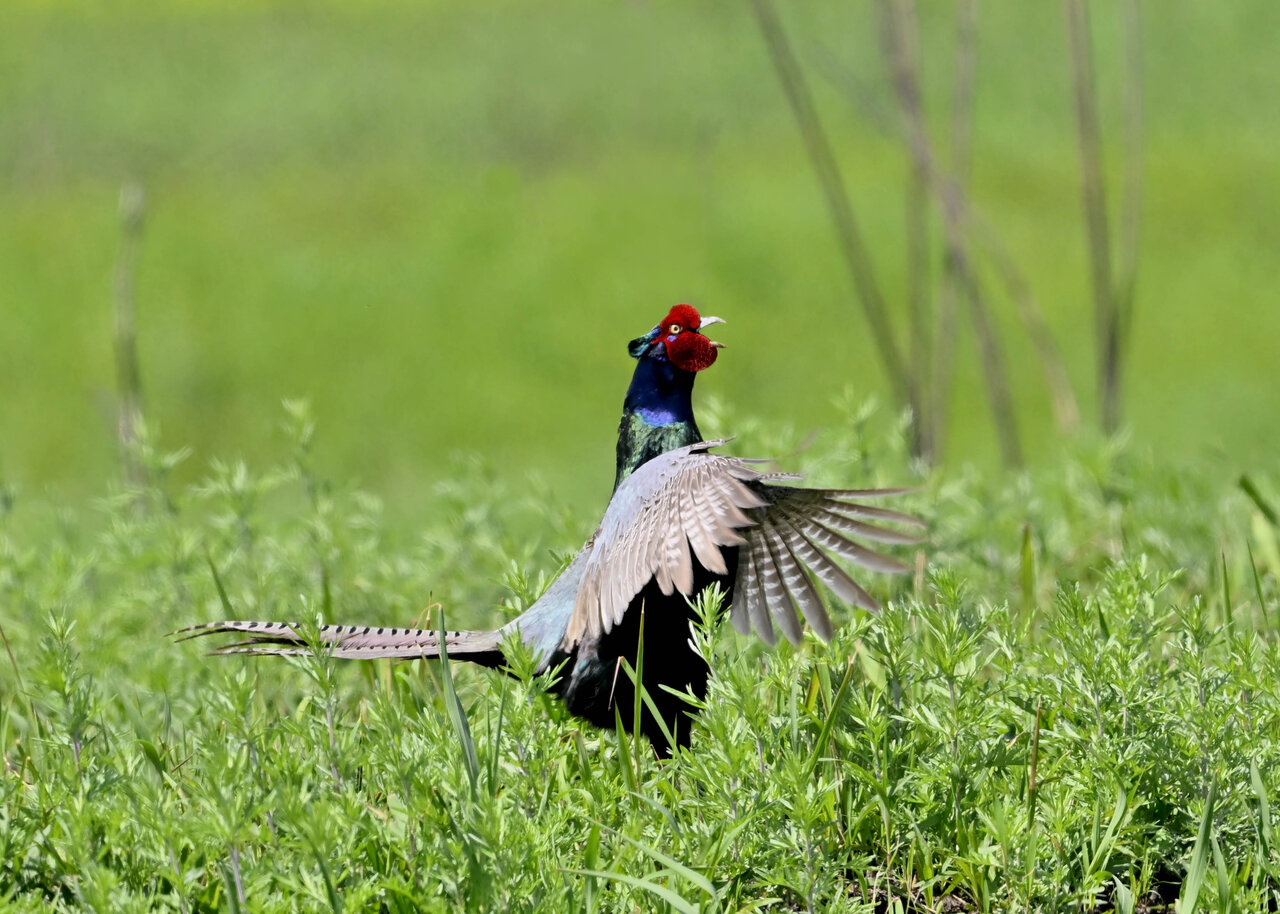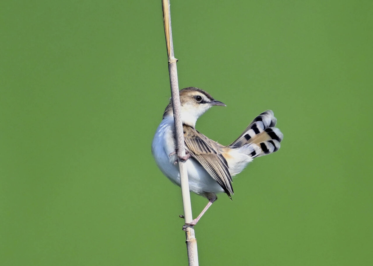 オオセッカの繁殖縄張りは狭く葦原の中にいますが、♂は独特の半円形の「囀り飛翔」するので見つけ易いですが、セッカやオオヨシキリの様に葦の穂先に止まらず、囀り飛翔の後葦の中腹に降り直ぐに草原に潜り込みますので撮影には中々手強いです。