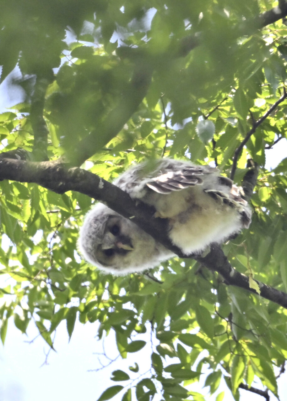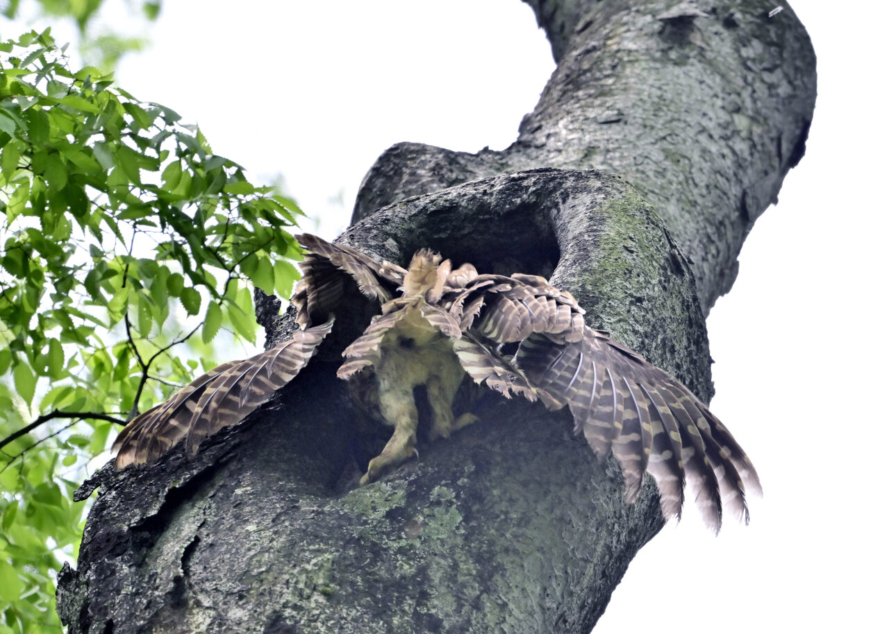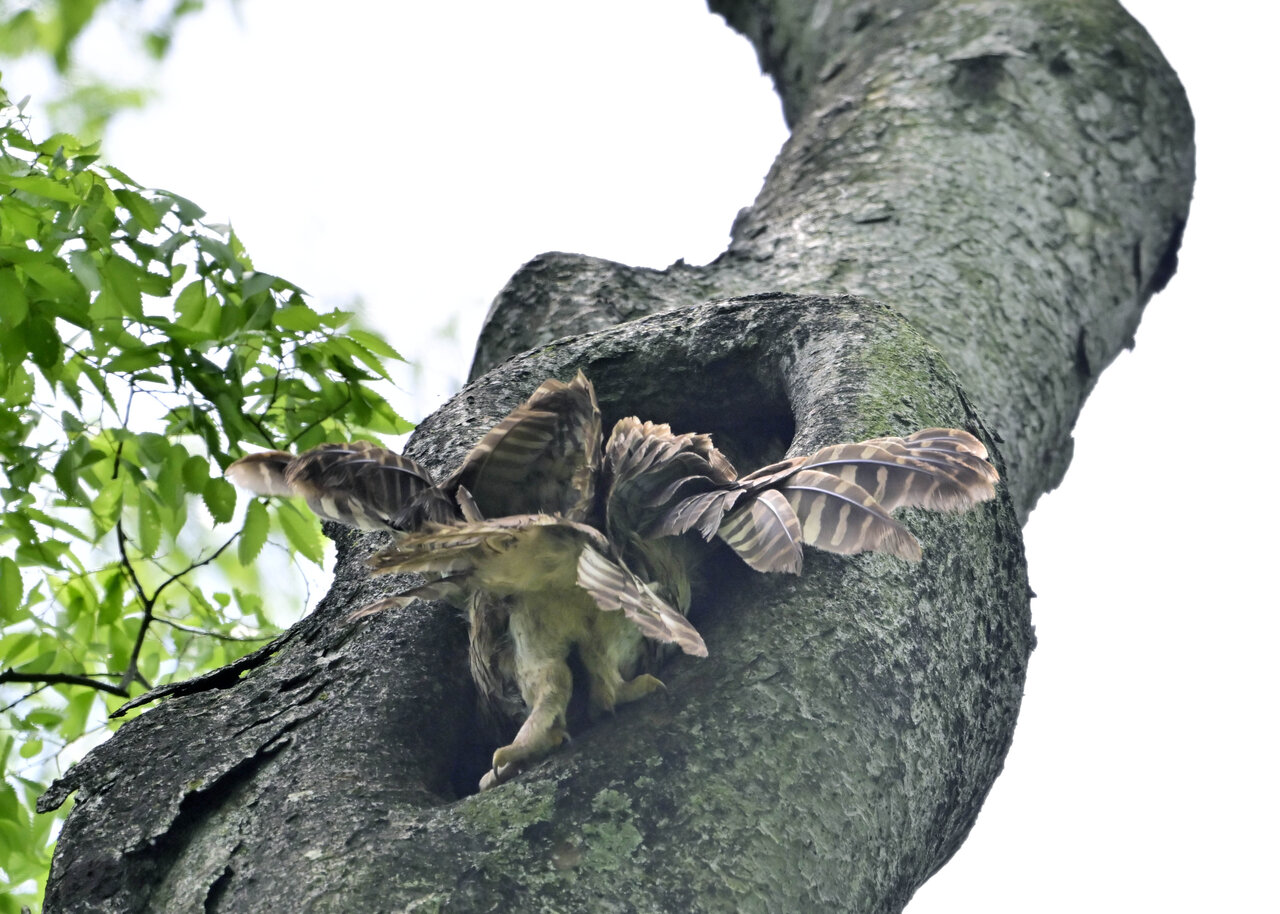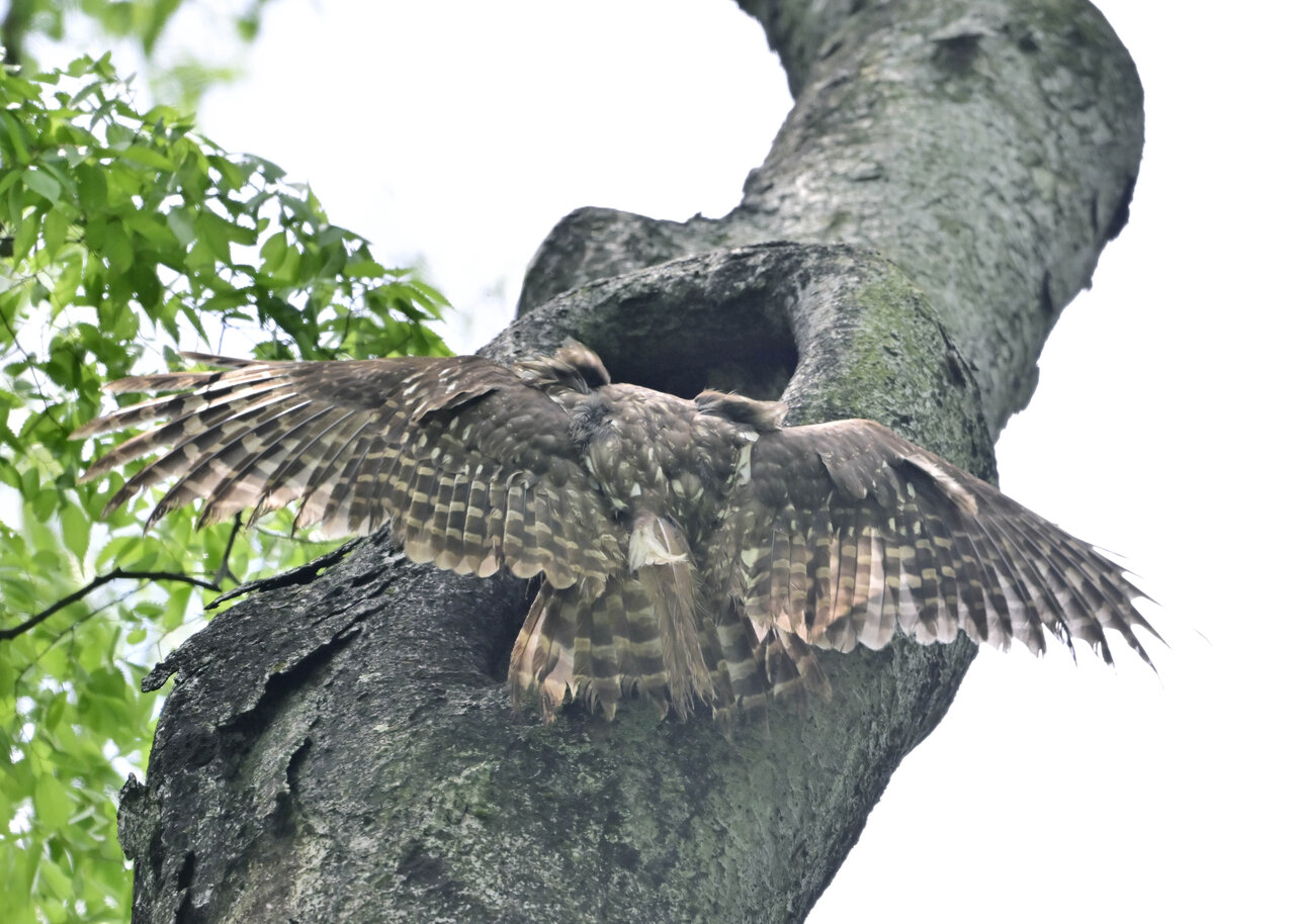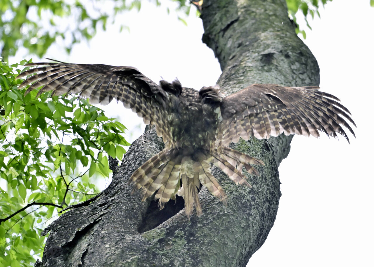 洞(巣)から飛び出すフクロウ ♀ です。ヒナは5/11頃から洞(巣)から顔を見せていましたが、5/16に巣立ちました。