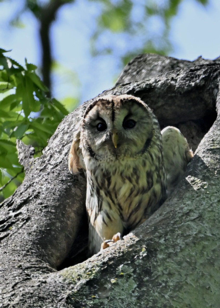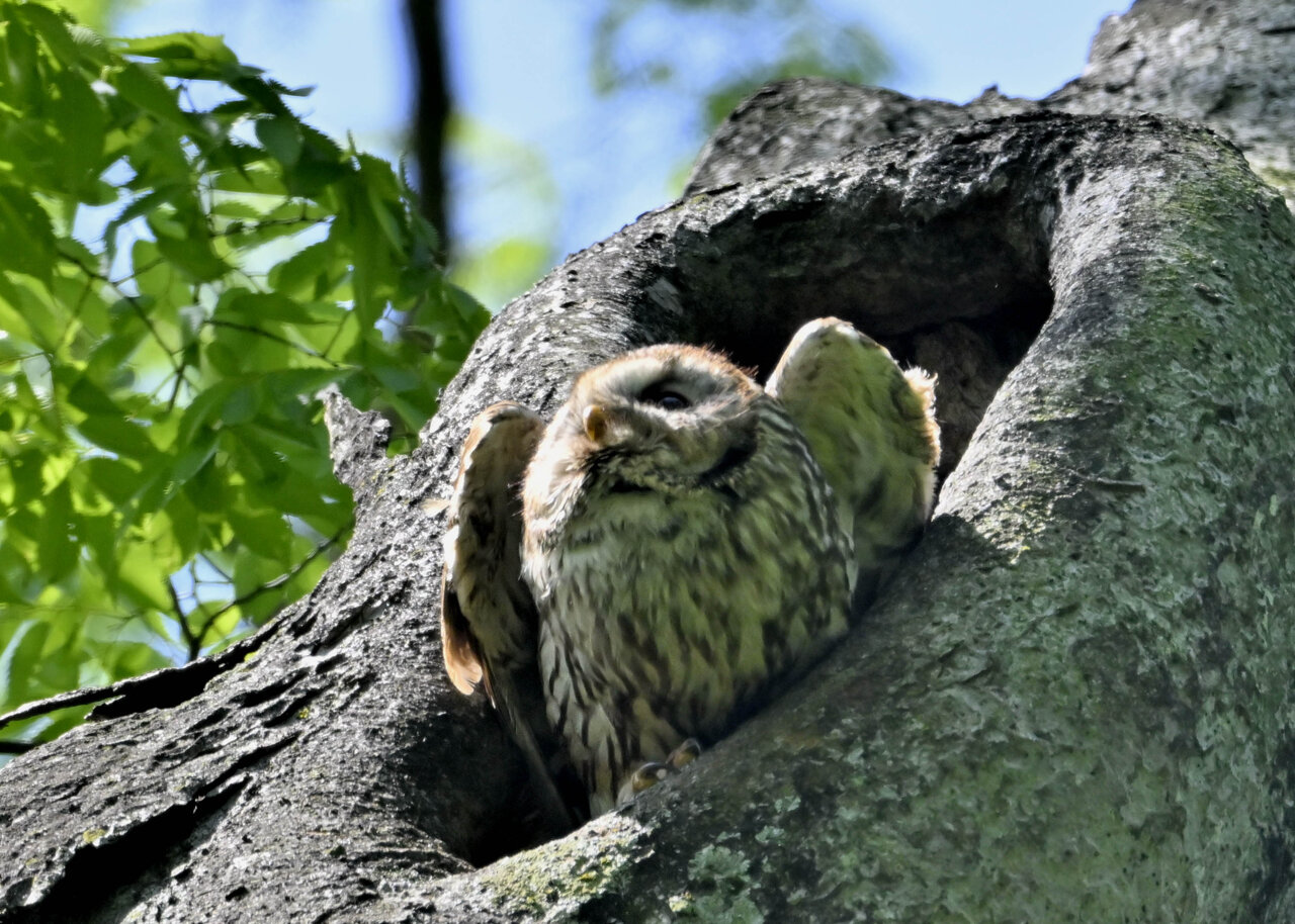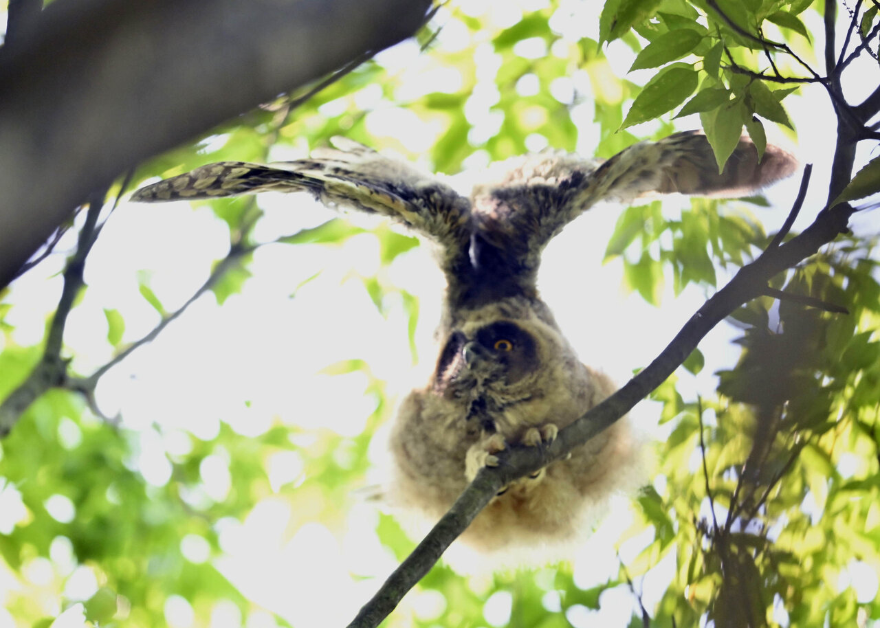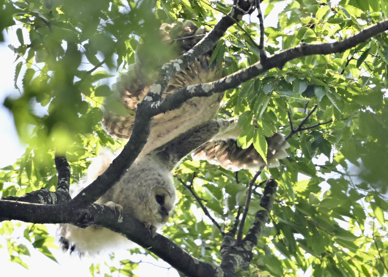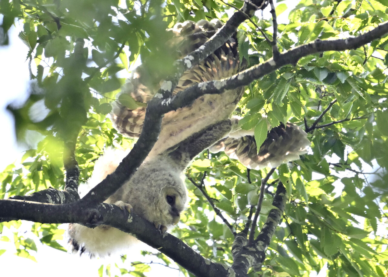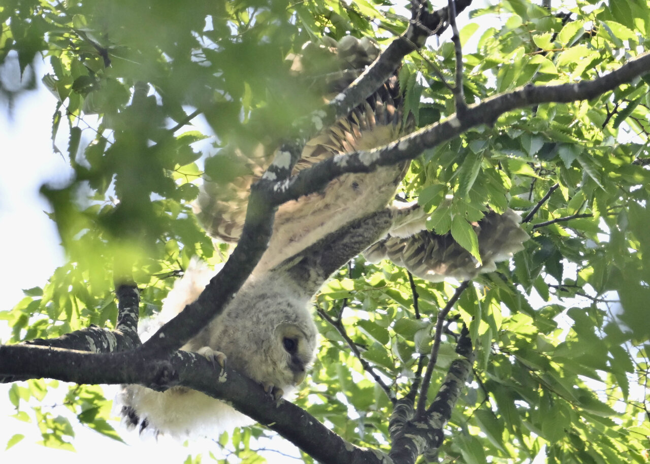 洞(巣)から飛び出すフクロウ ♀ です。ヒナは5/11頃から洞(巣)から顔を見せていましたが、5/16に巣立ちました。
