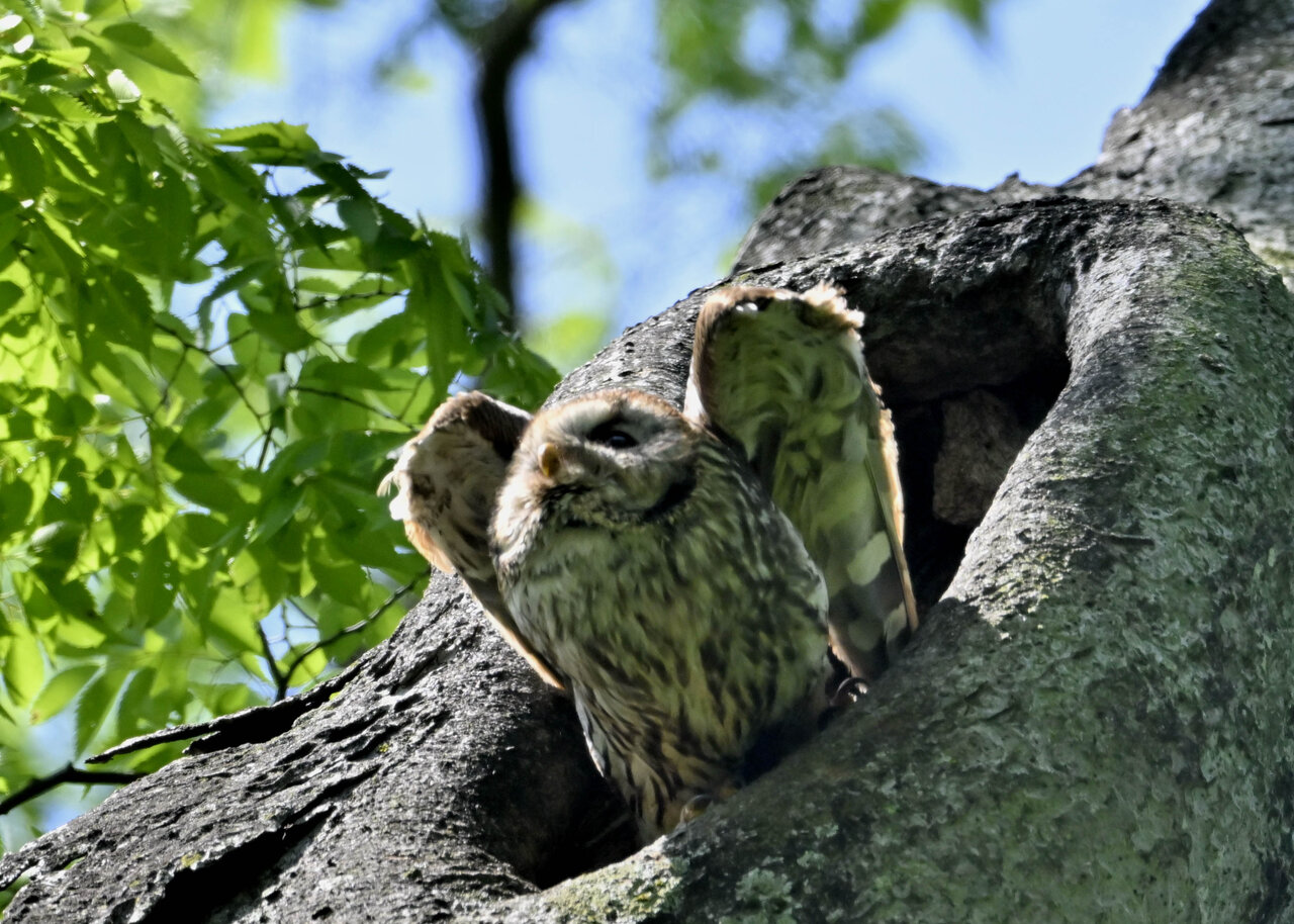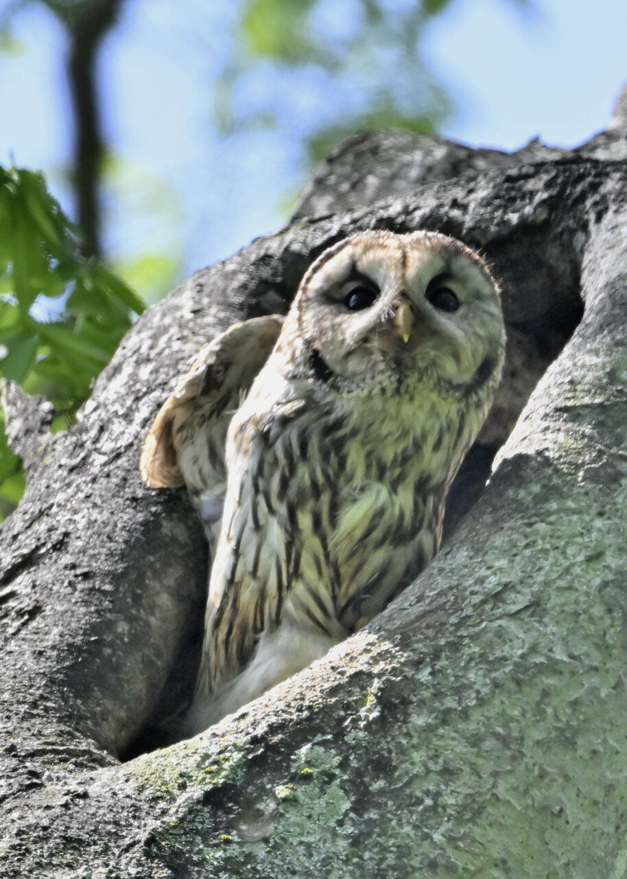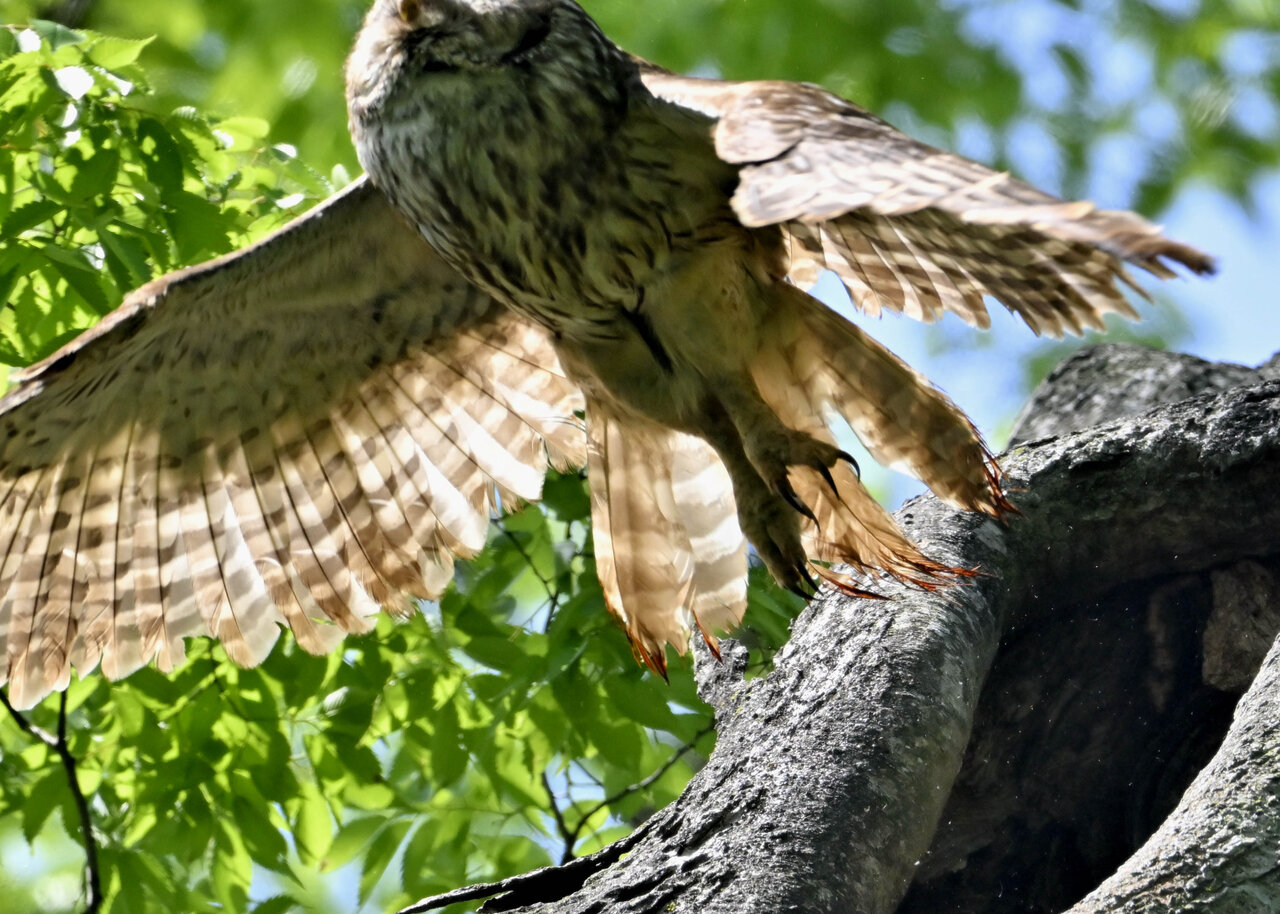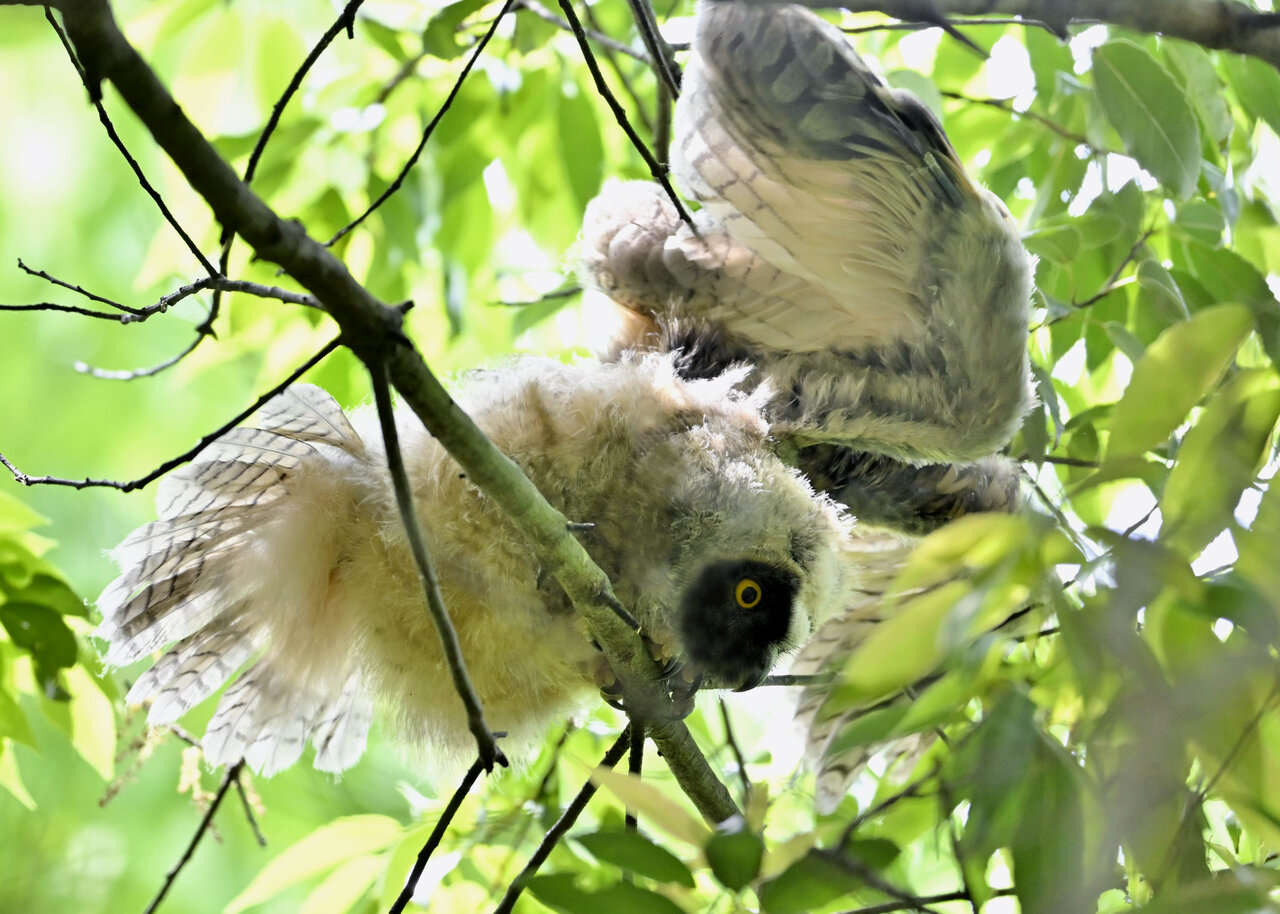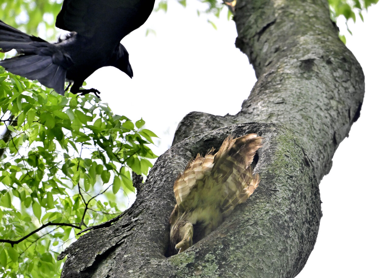 洞(巣)から飛び出すフクロウ ♀ です。ヒナは5/11頃から洞(巣)から顔を見せていましたが、5/16に巣立ちました。