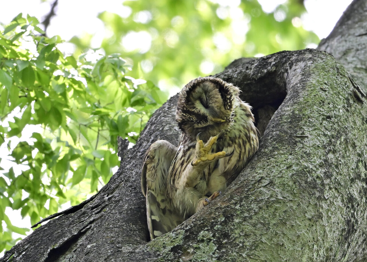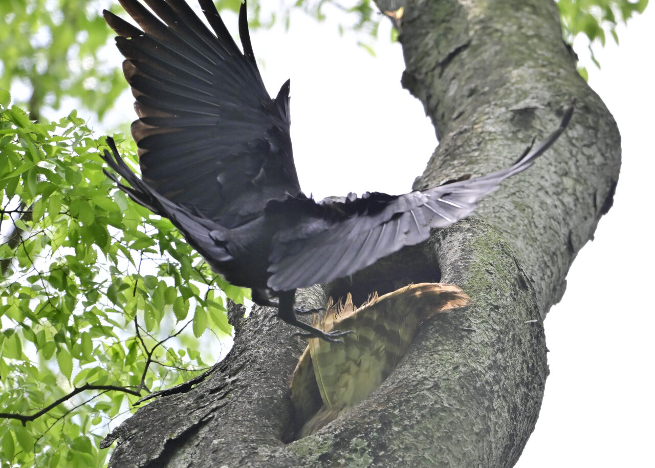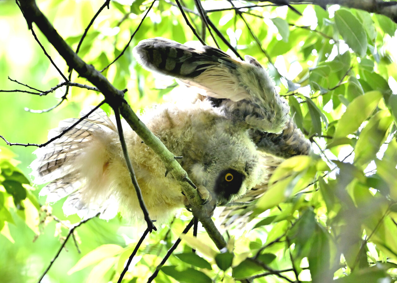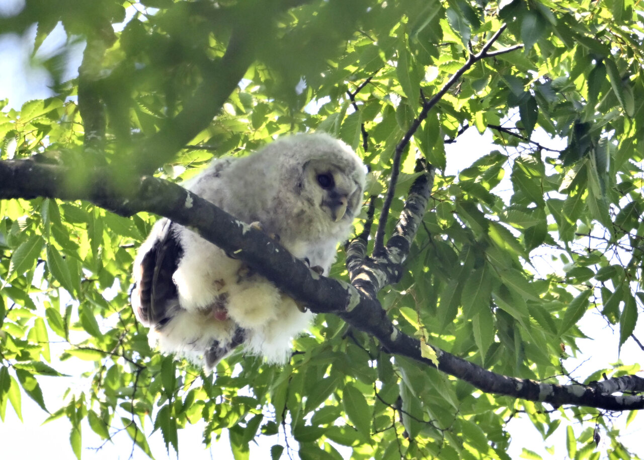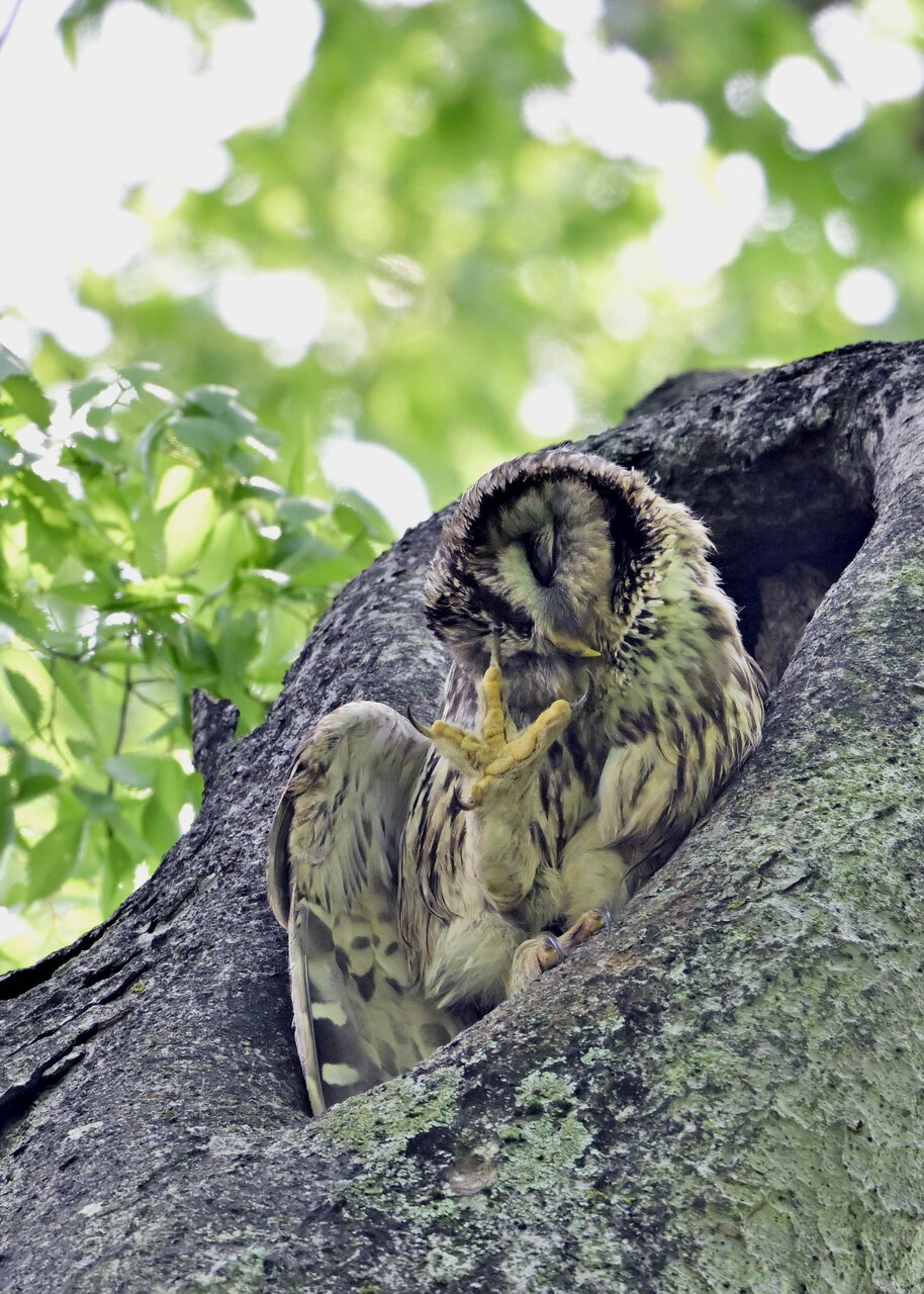 洞(巣)から飛び出すフクロウ ♀ です。ヒナは5/11頃から洞(巣)から顔を見せていましたが、5/16に巣立ちました。