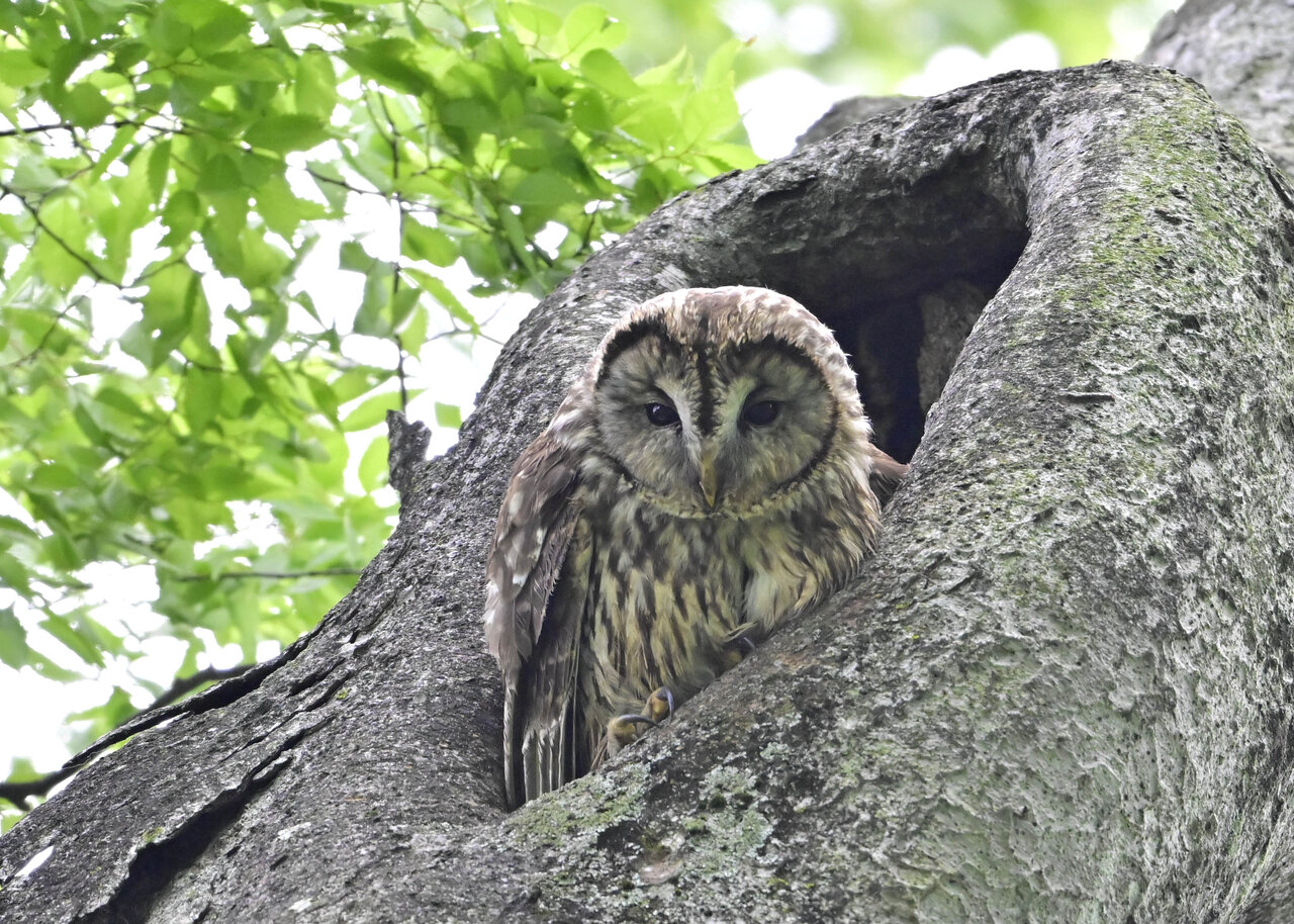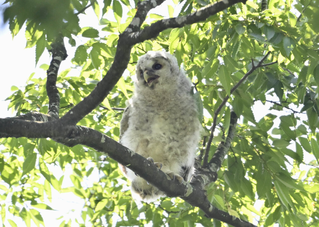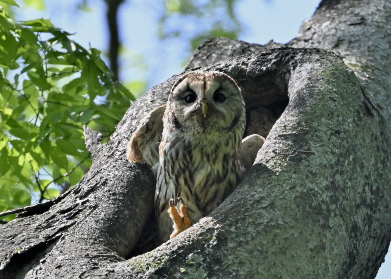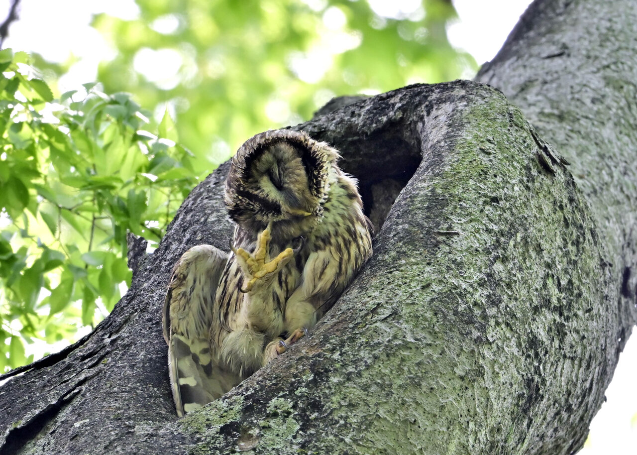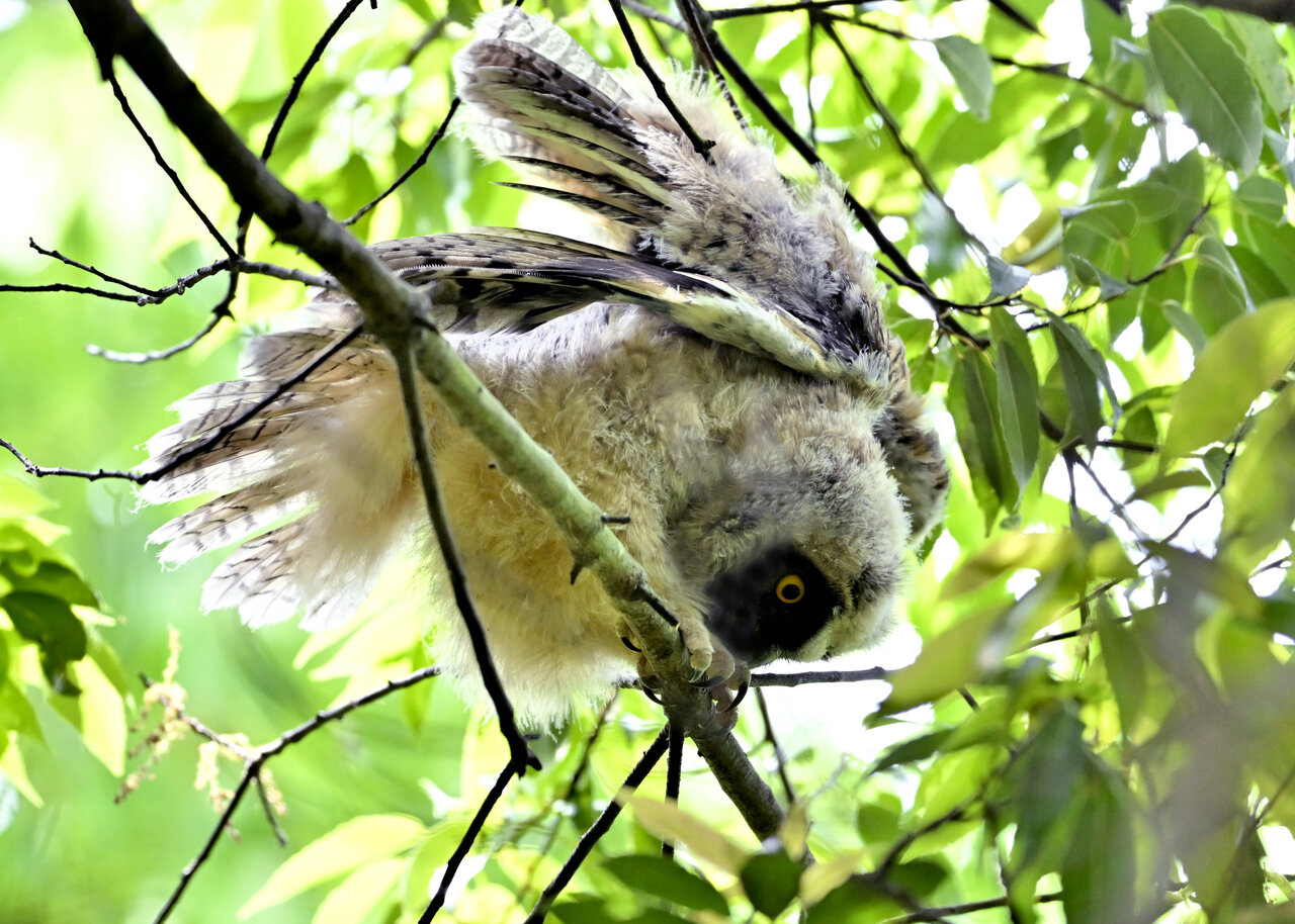 洞(巣)から飛び出すフクロウ ♀ です。ヒナは5/11頃から洞(巣)から顔を見せていましたが、5/16に巣立ちました。