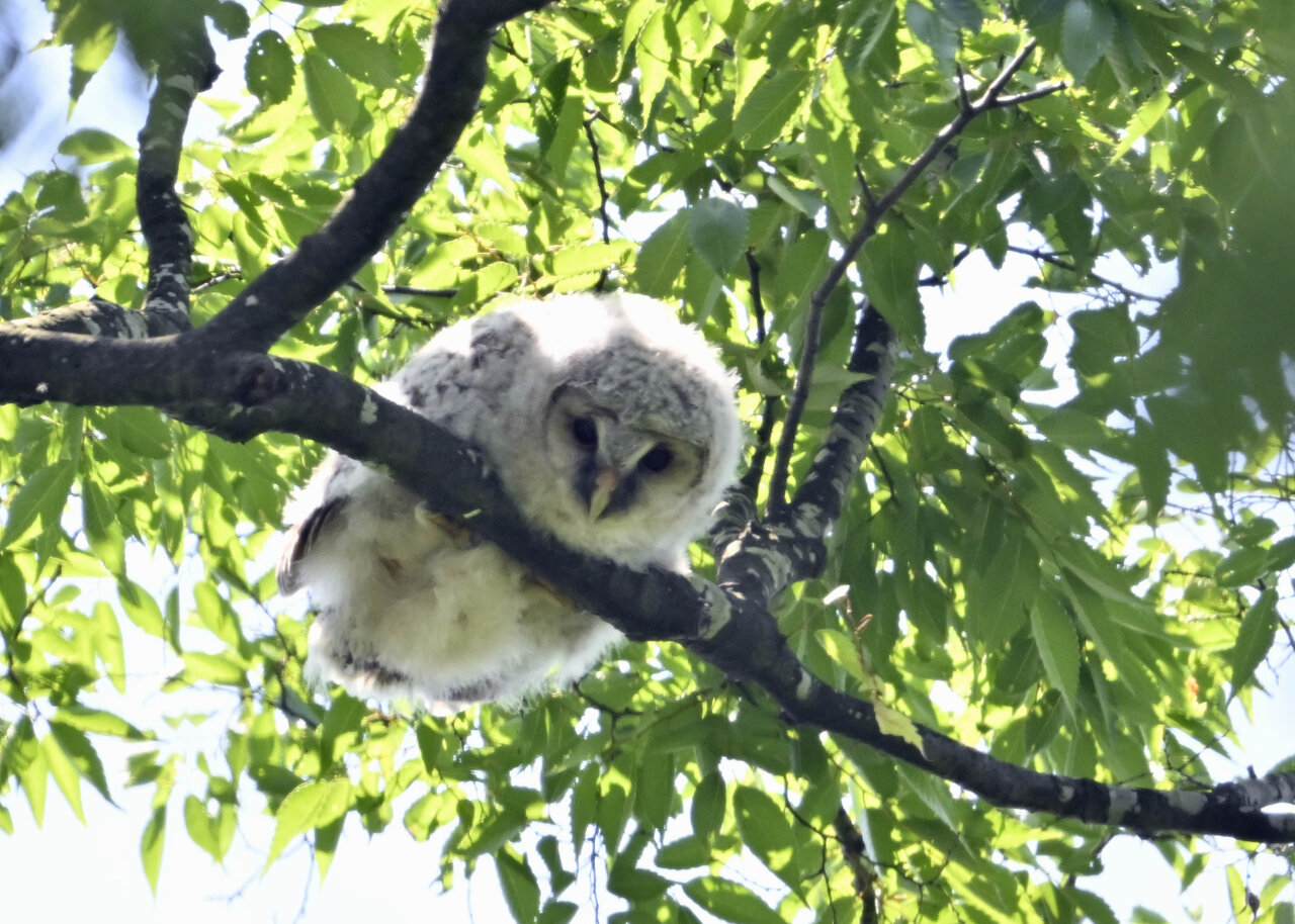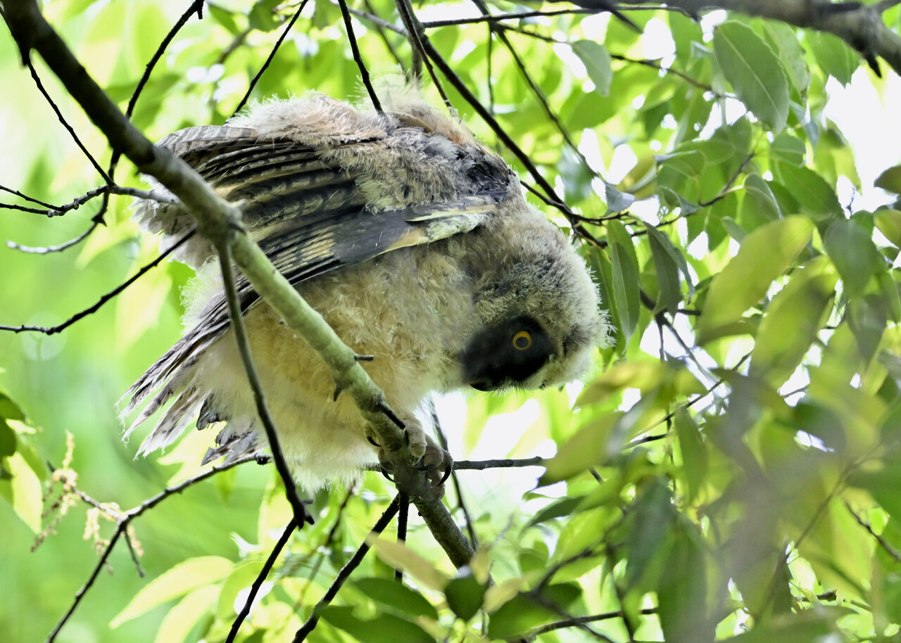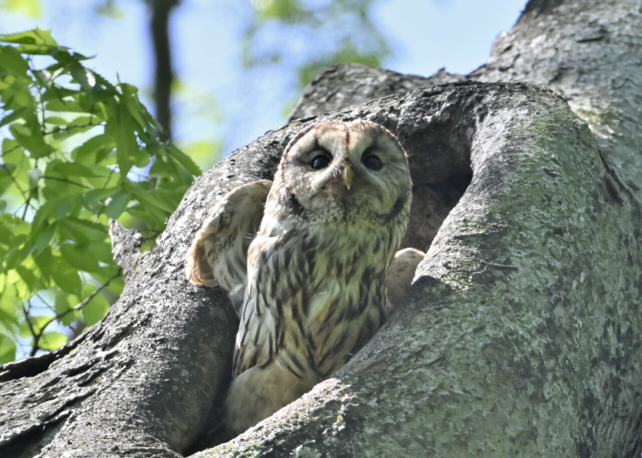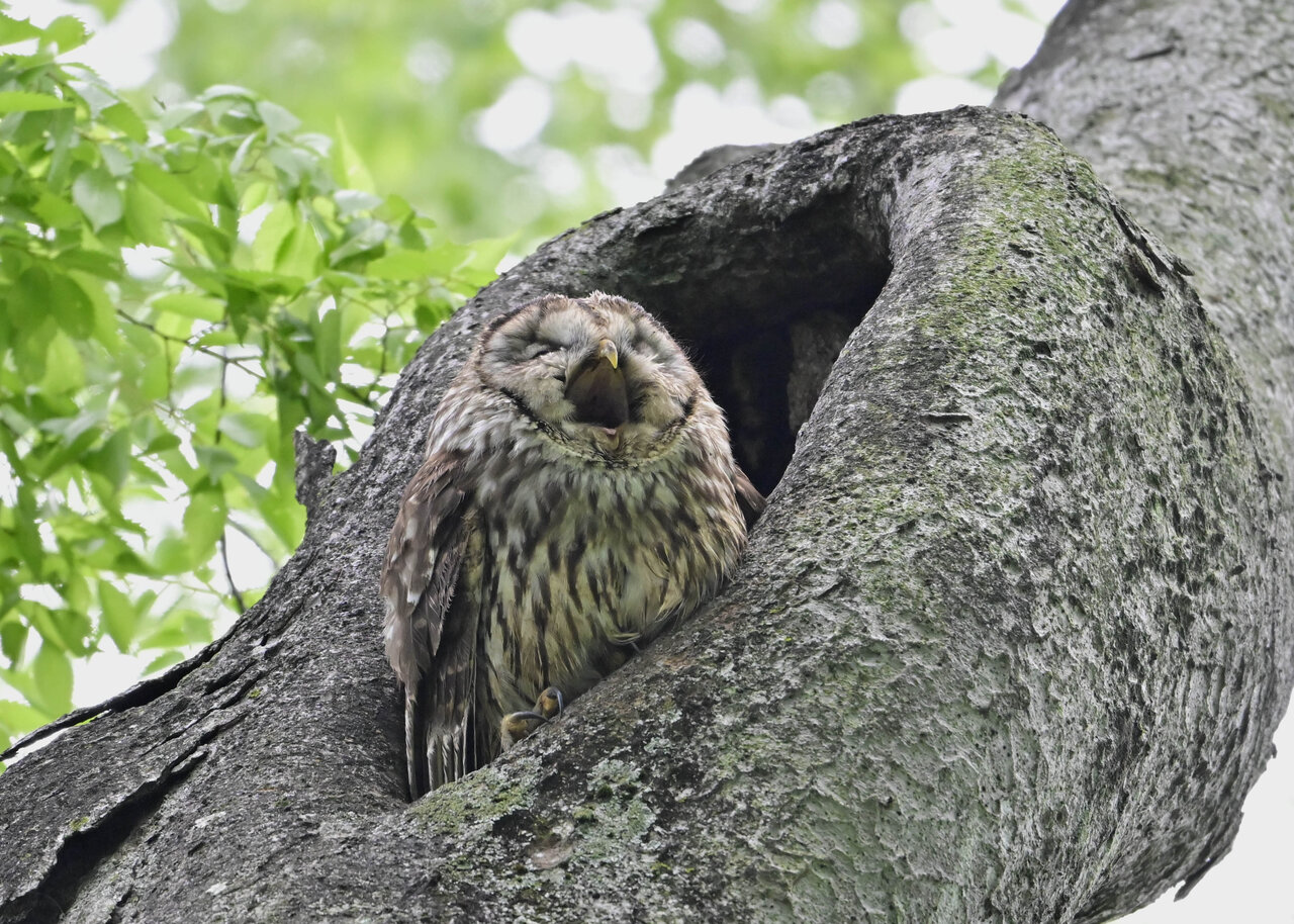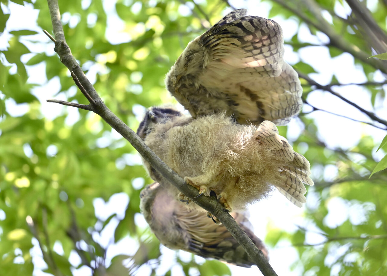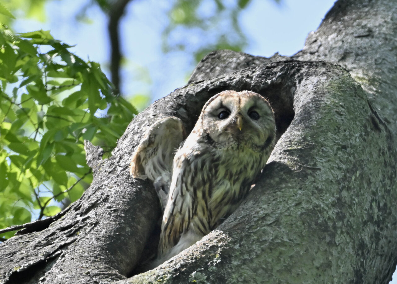 洞(巣)から飛び出すフクロウ ♀ です。ヒナは5/11頃から洞(巣)から顔を見せていましたが、5/16に巣立ちました。