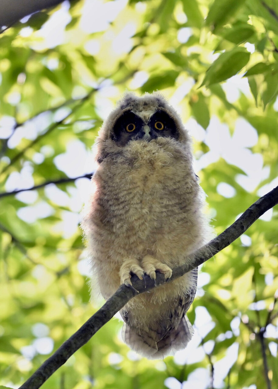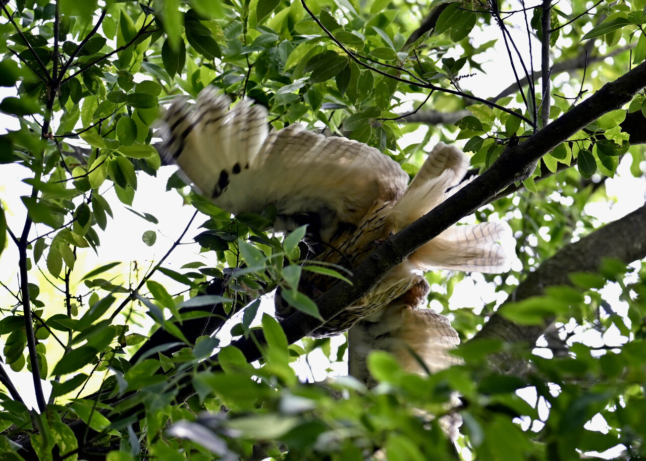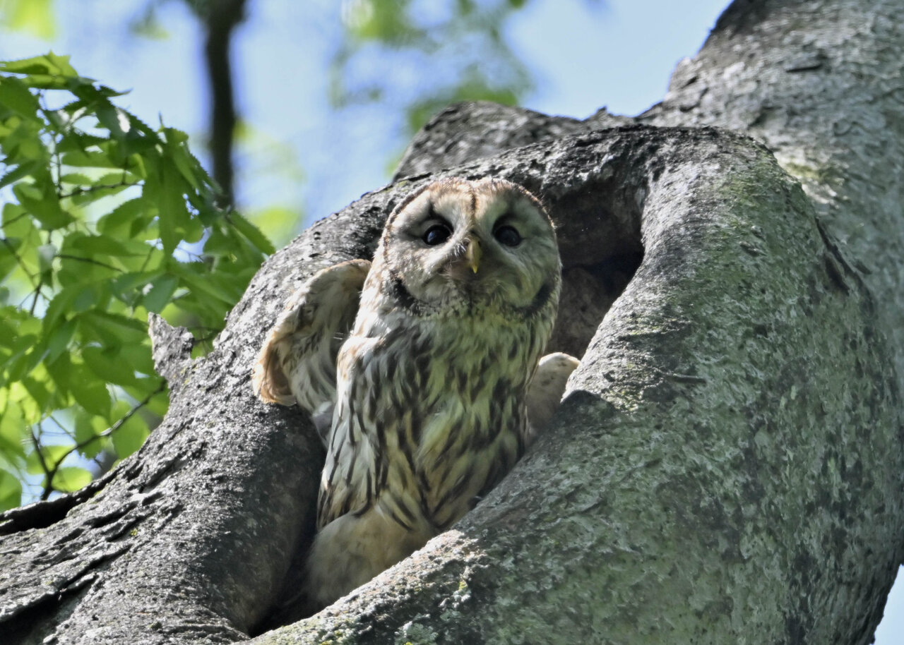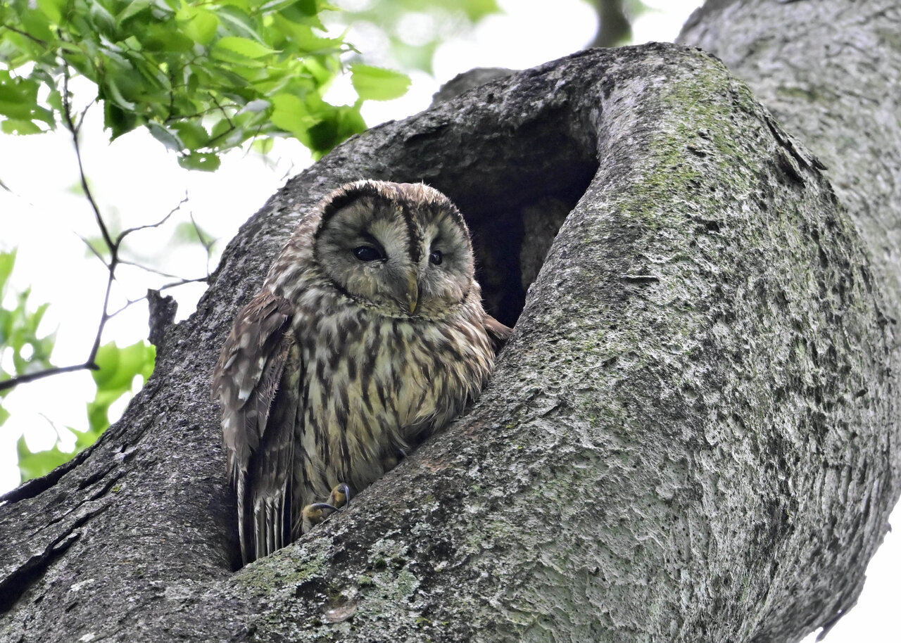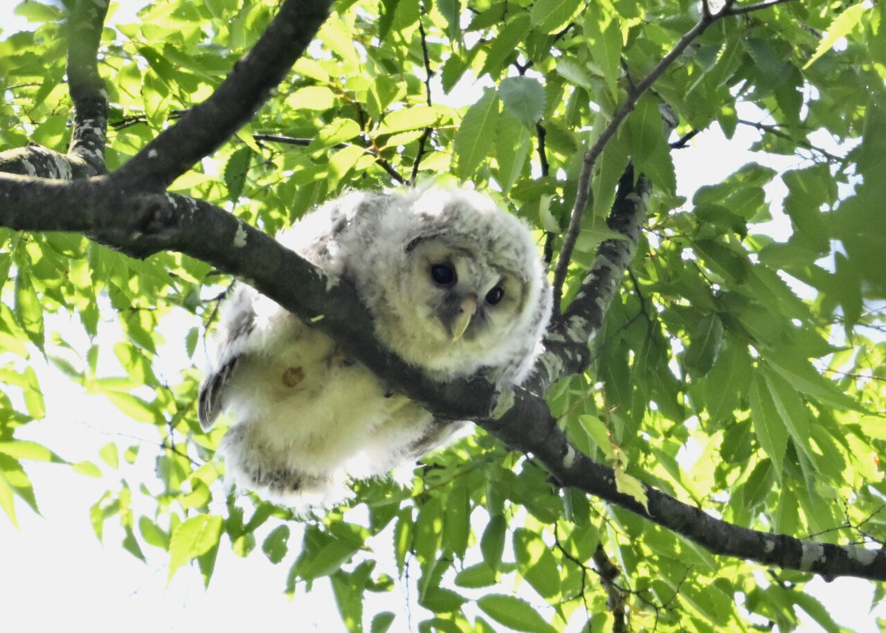 洞(巣)から飛び出すフクロウ ♀ です。ヒナは5/11頃から洞(巣)から顔を見せていましたが、5/16に巣立ちました。