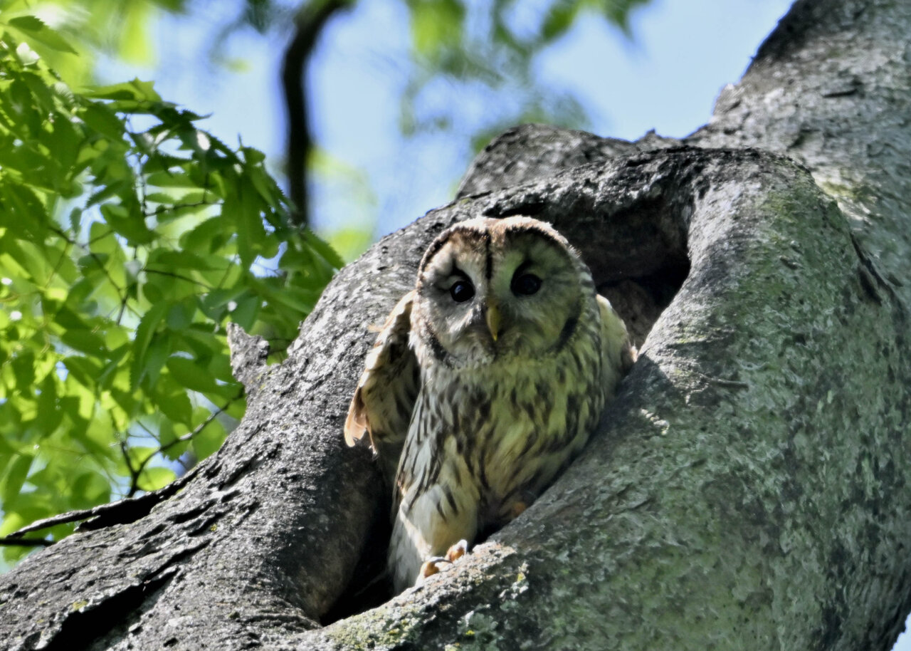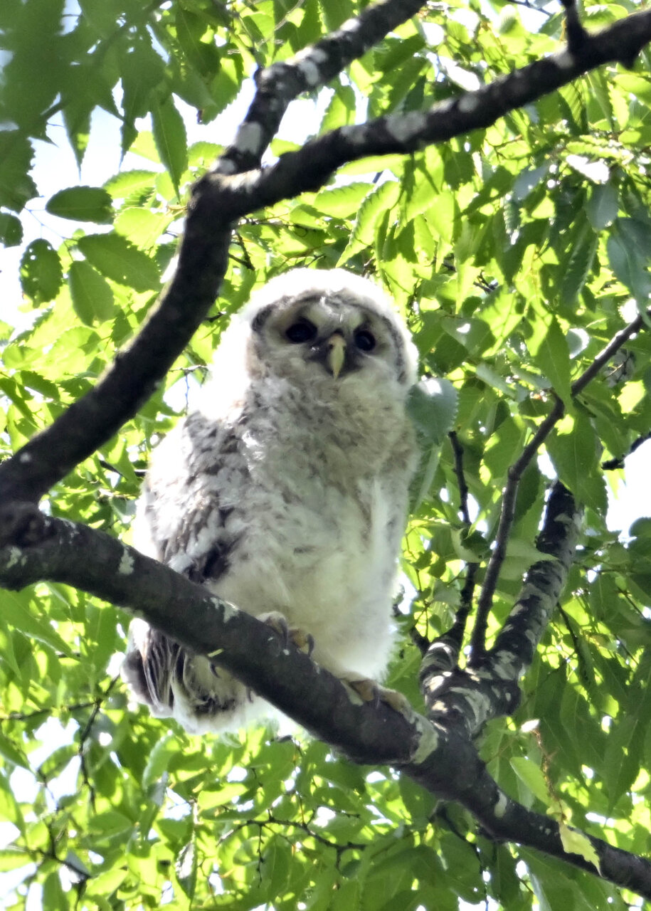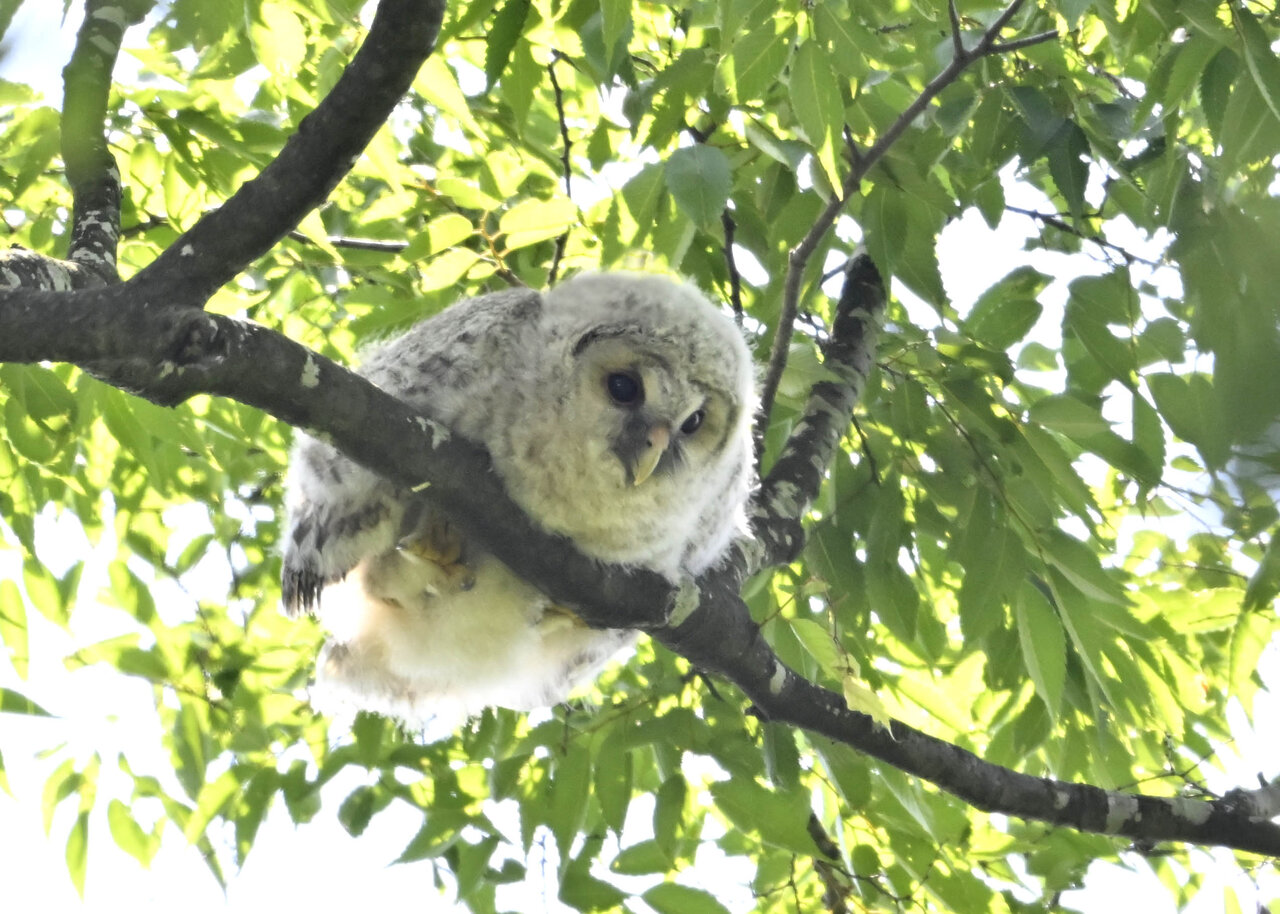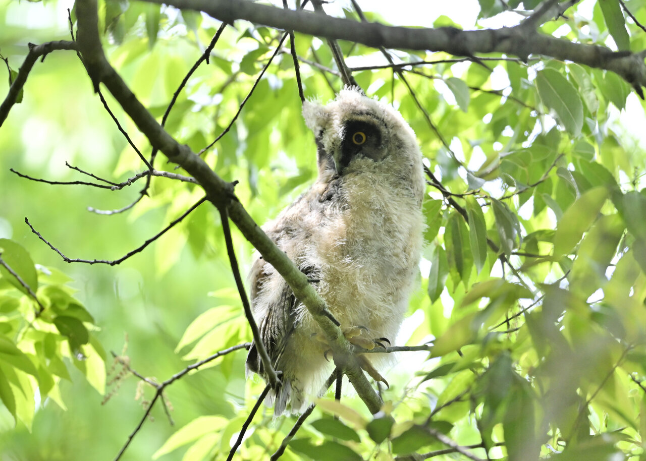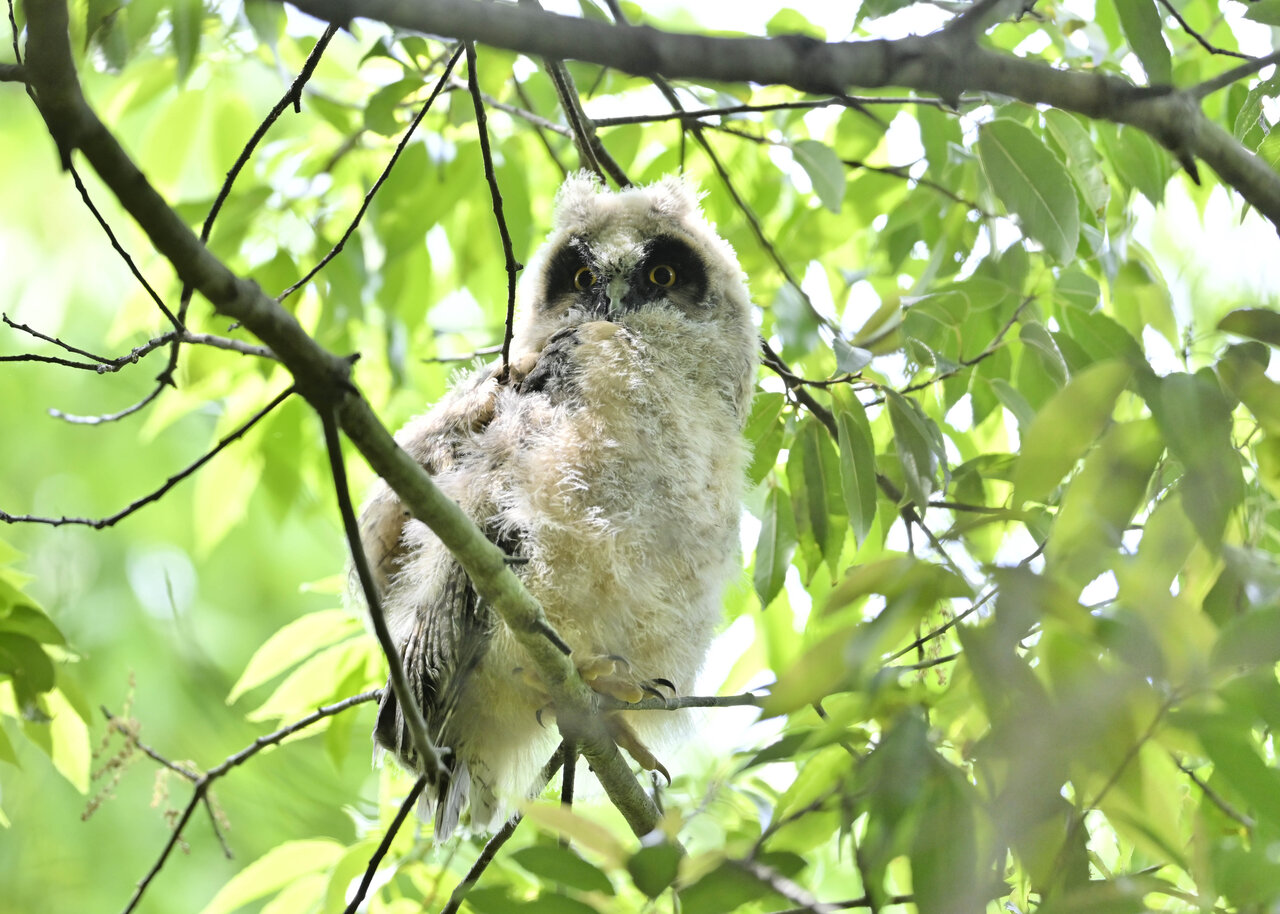 洞(巣)から飛び出すフクロウ ♀ です。ヒナは5/11頃から洞(巣)から顔を見せていましたが、5/16に巣立ちました。