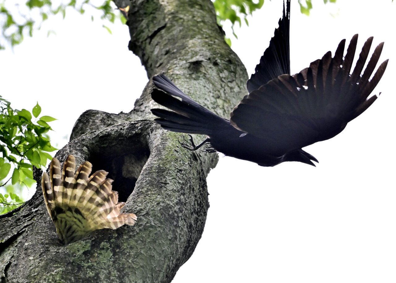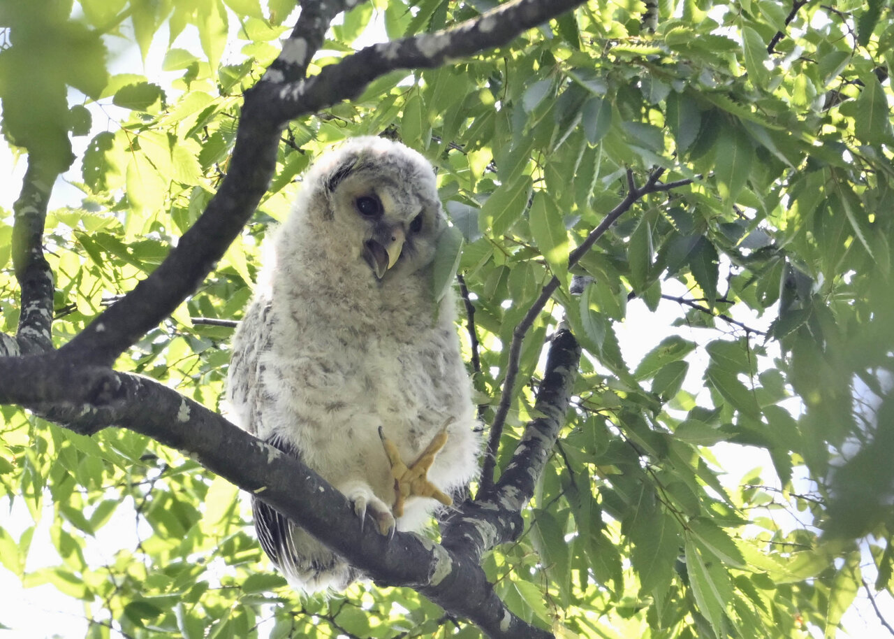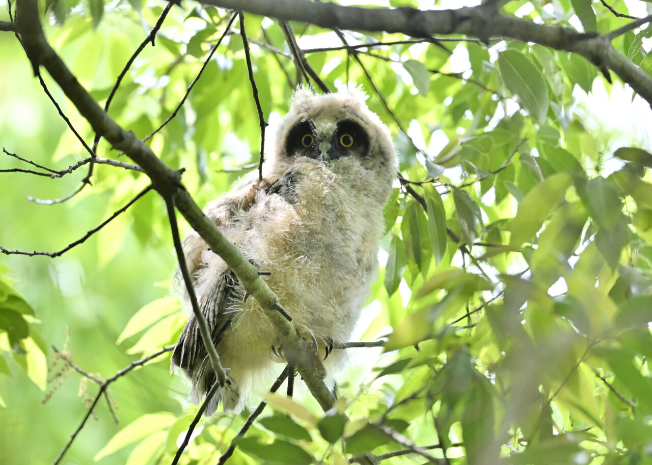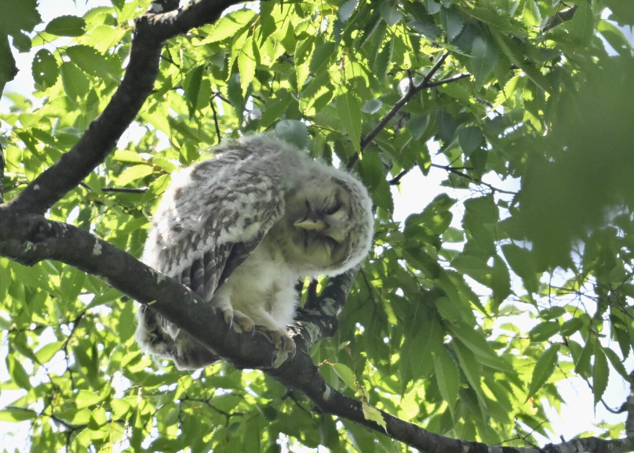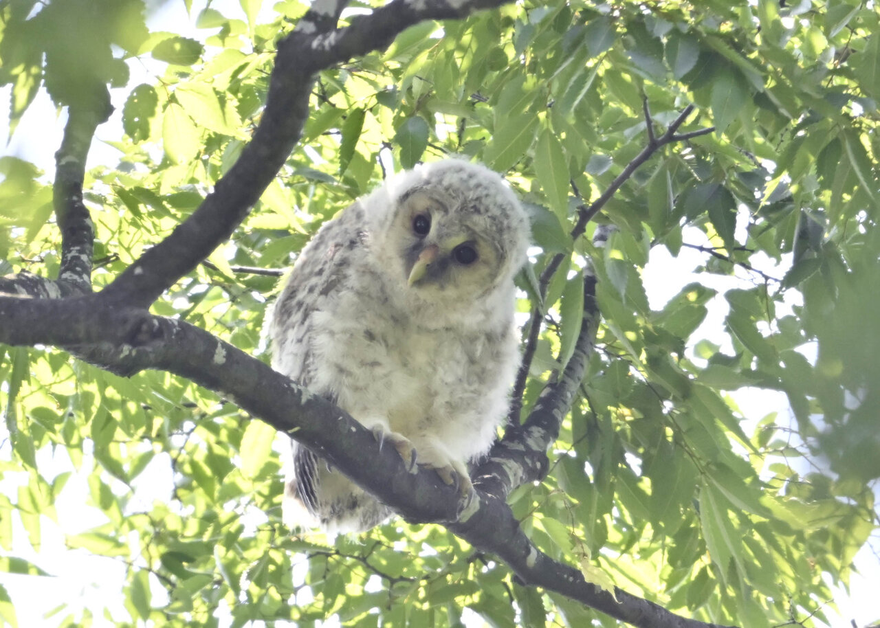 洞(巣)から飛び出すフクロウ ♀ です。ヒナは5/11頃から洞(巣)から顔を見せていましたが、5/16に巣立ちました。