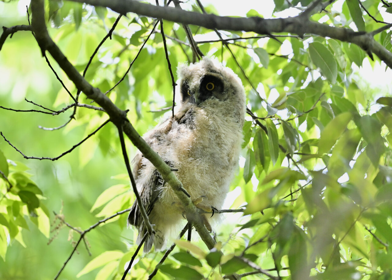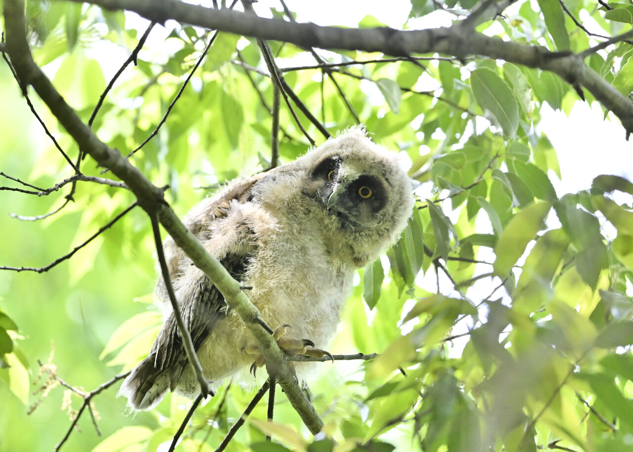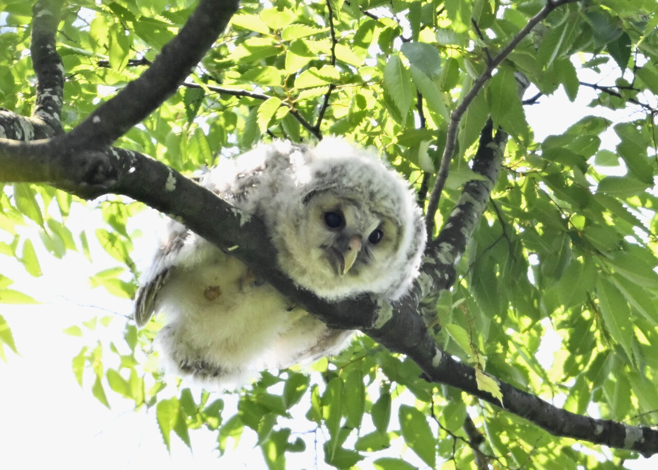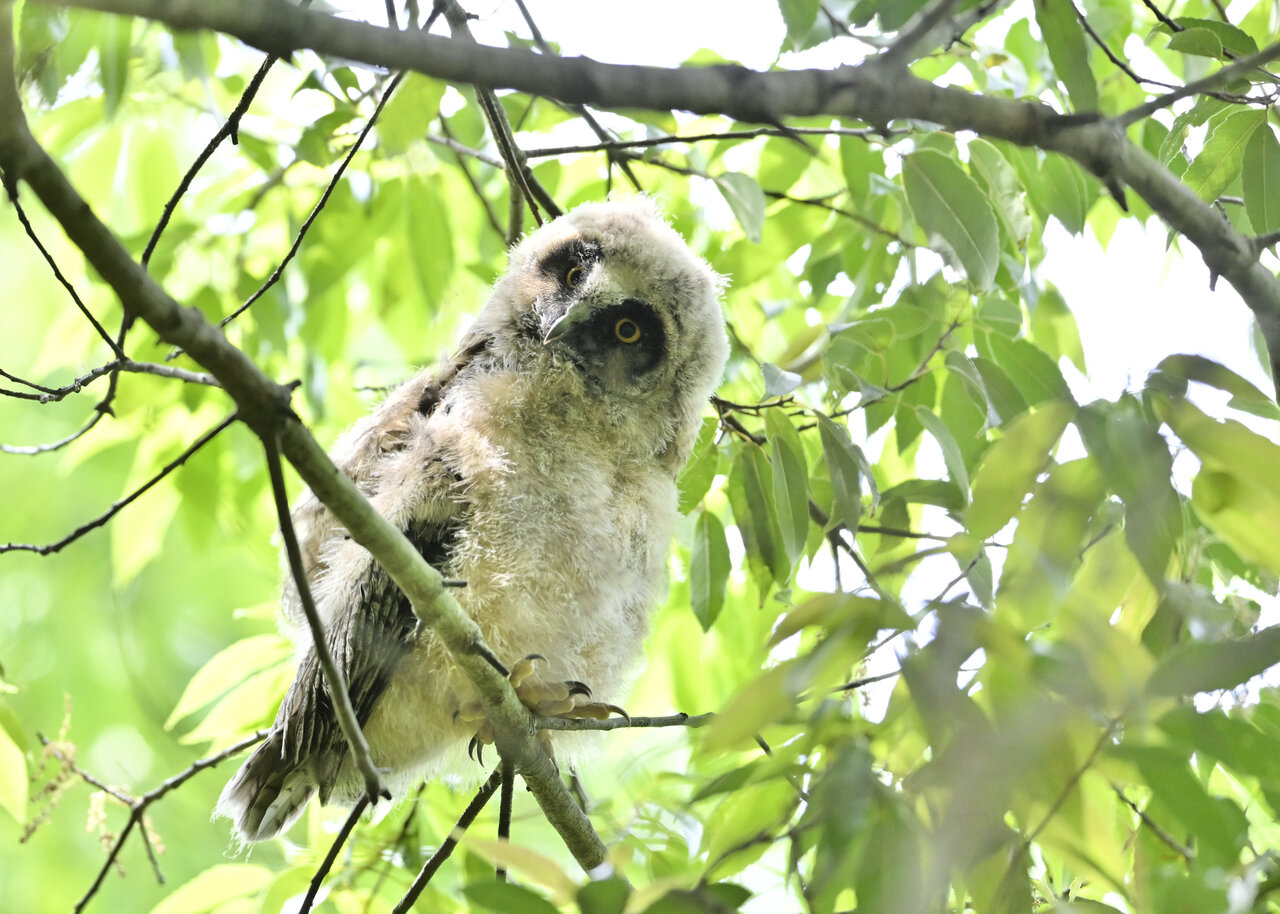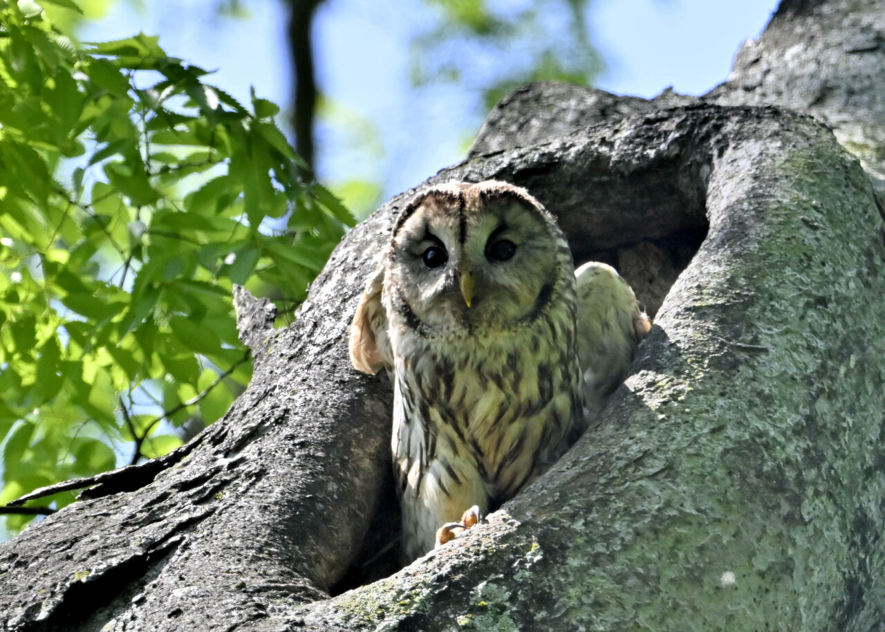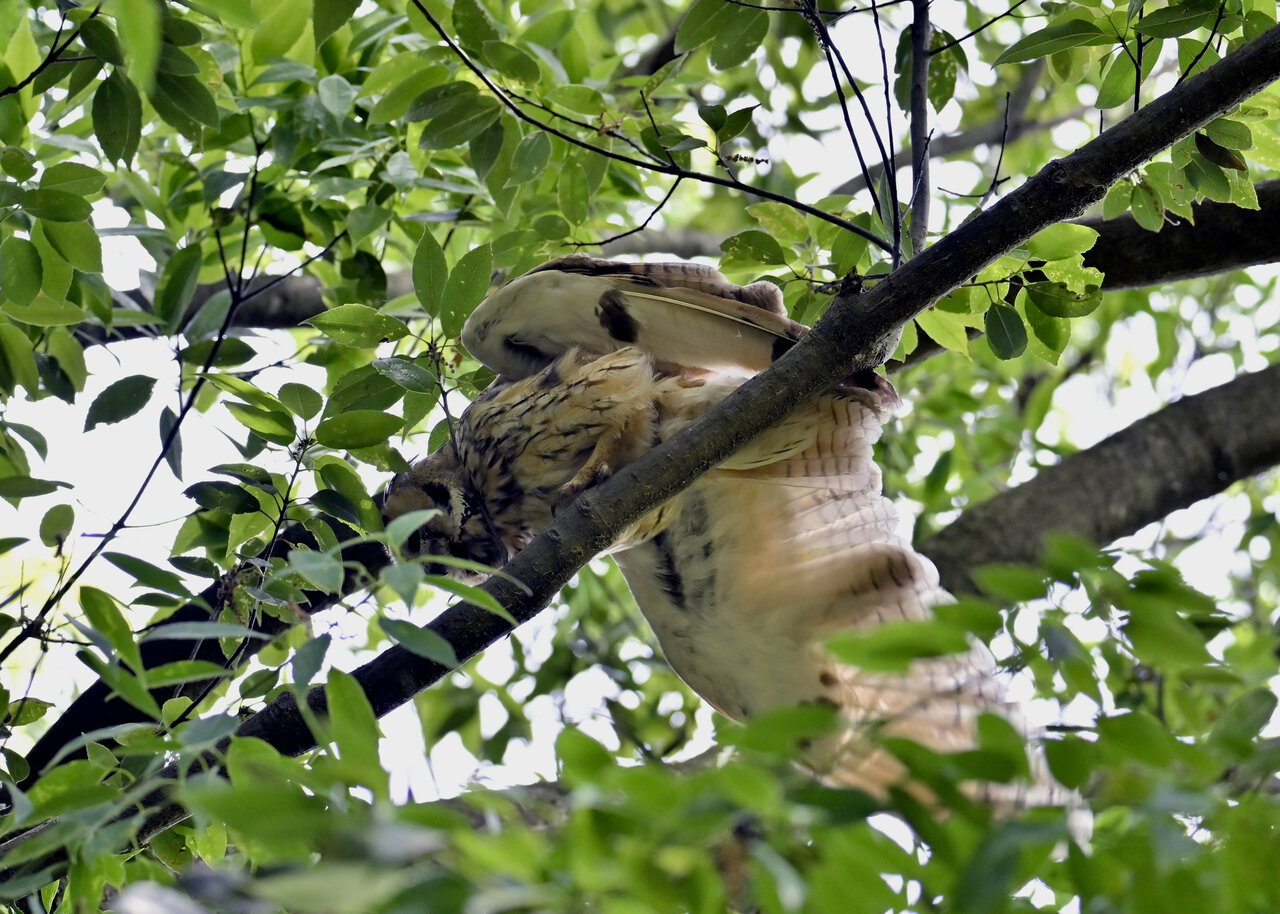 洞(巣)から飛び出すフクロウ ♀ です。ヒナは5/11頃から洞(巣)から顔を見せていましたが、5/16に巣立ちました。