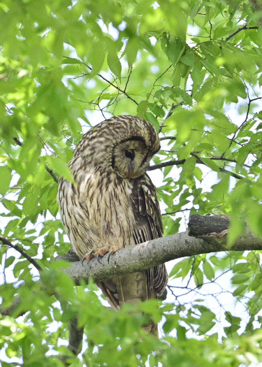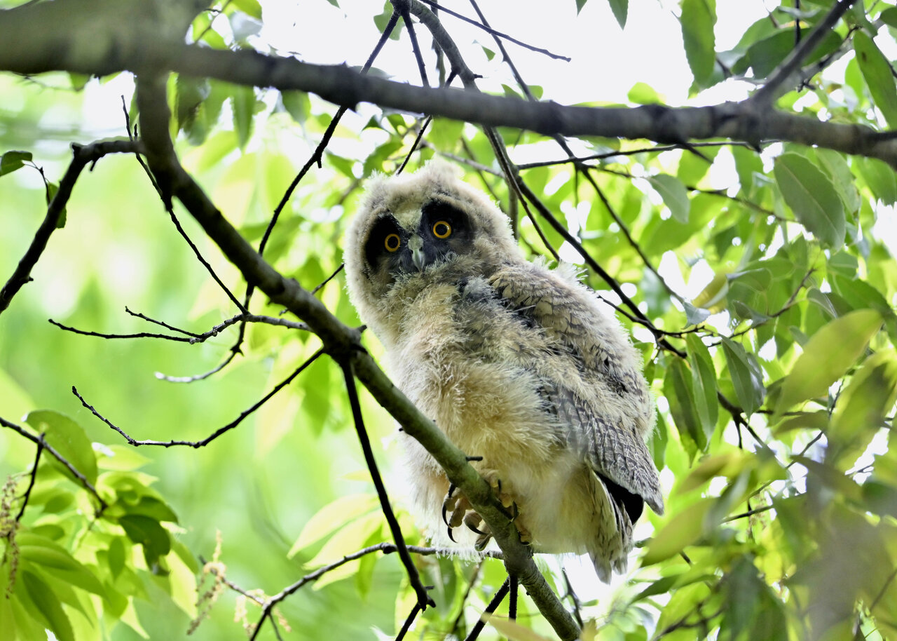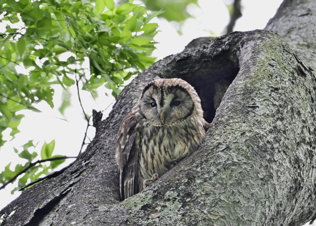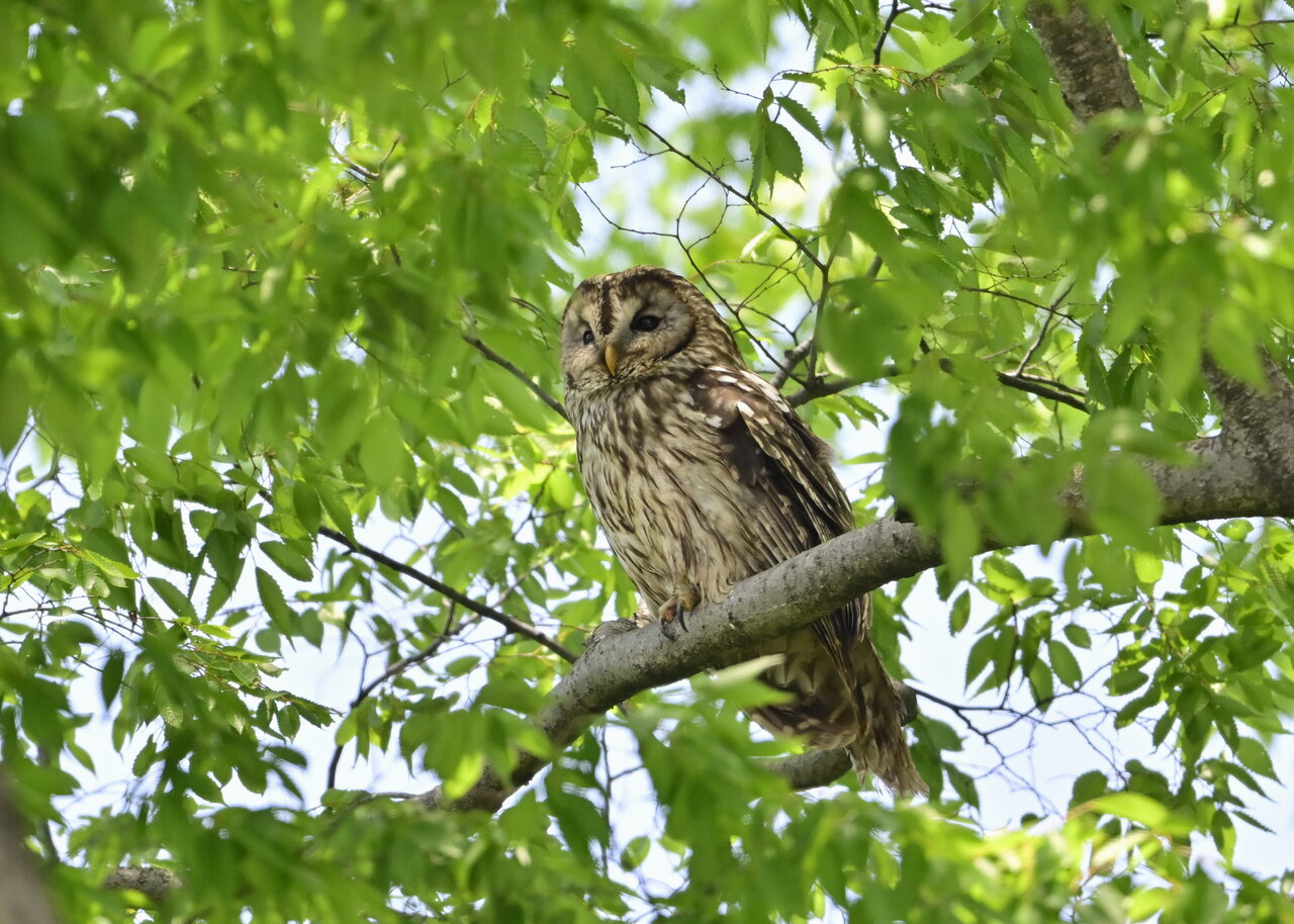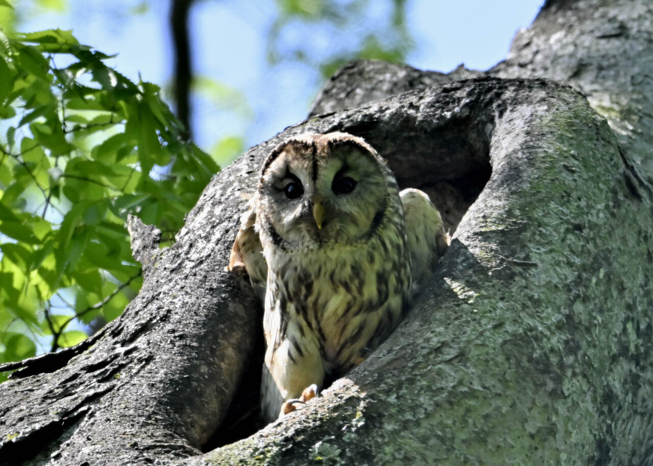 洞(巣)から飛び出すフクロウ ♀ です。ヒナは5/11頃から洞(巣)から顔を見せていましたが、5/16に巣立ちました。