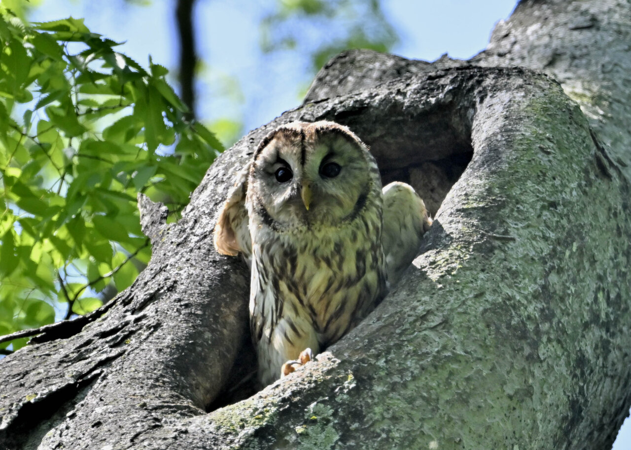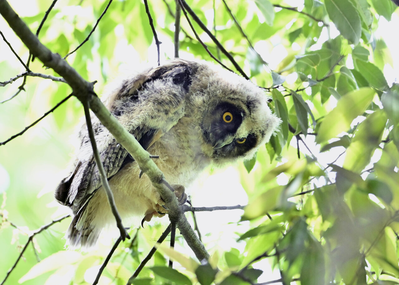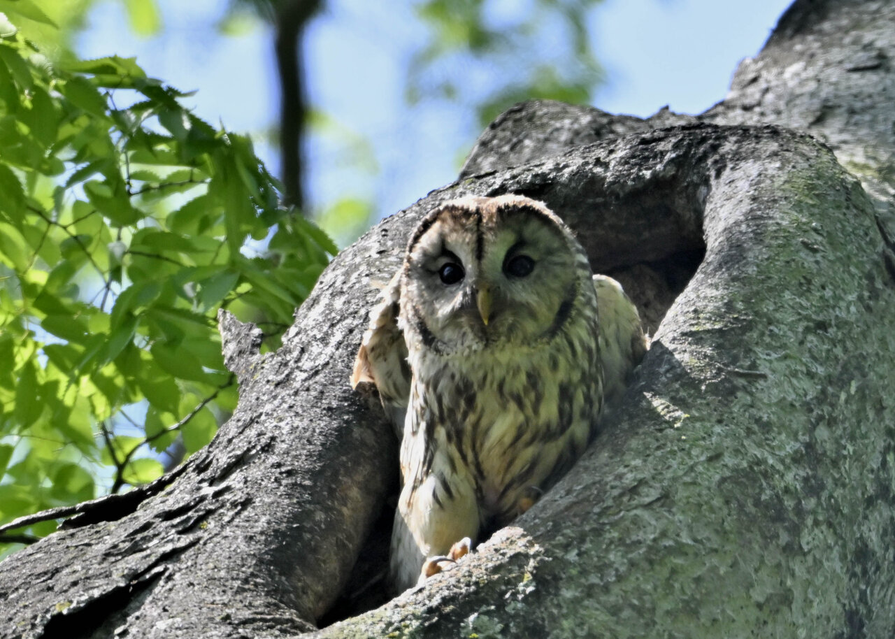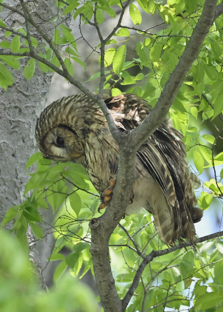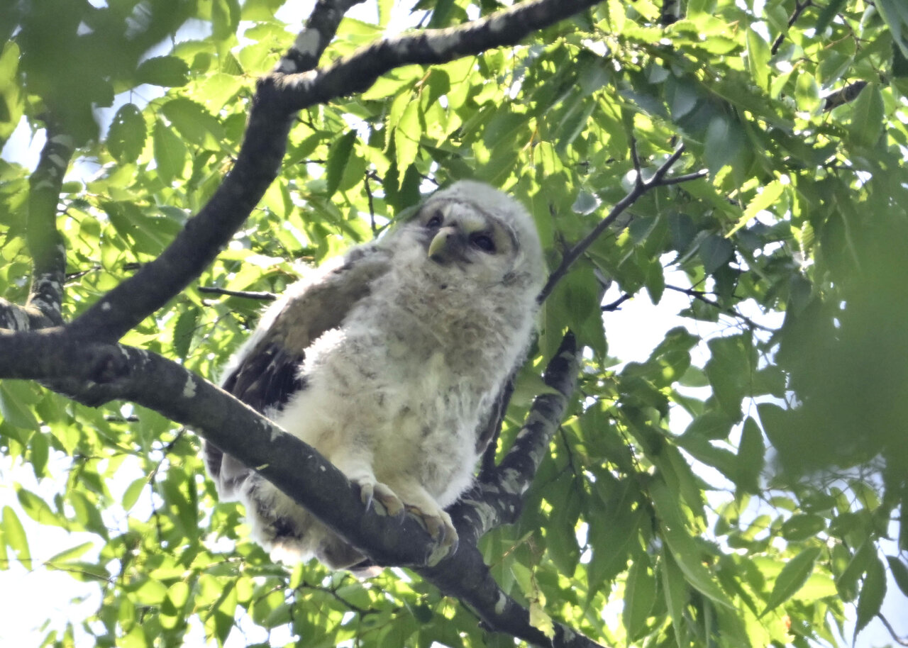 洞(巣)から飛び出すフクロウ ♀ です。ヒナは5/11頃から洞(巣)から顔を見せていましたが、5/16に巣立ちました。