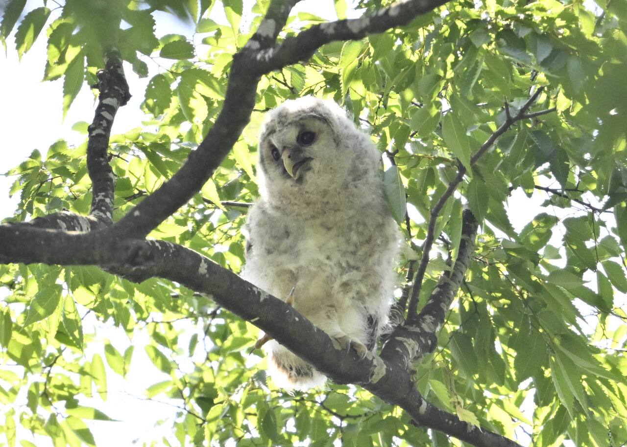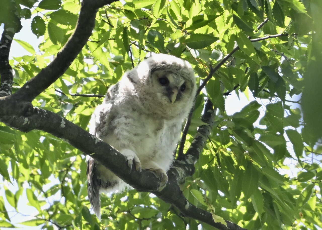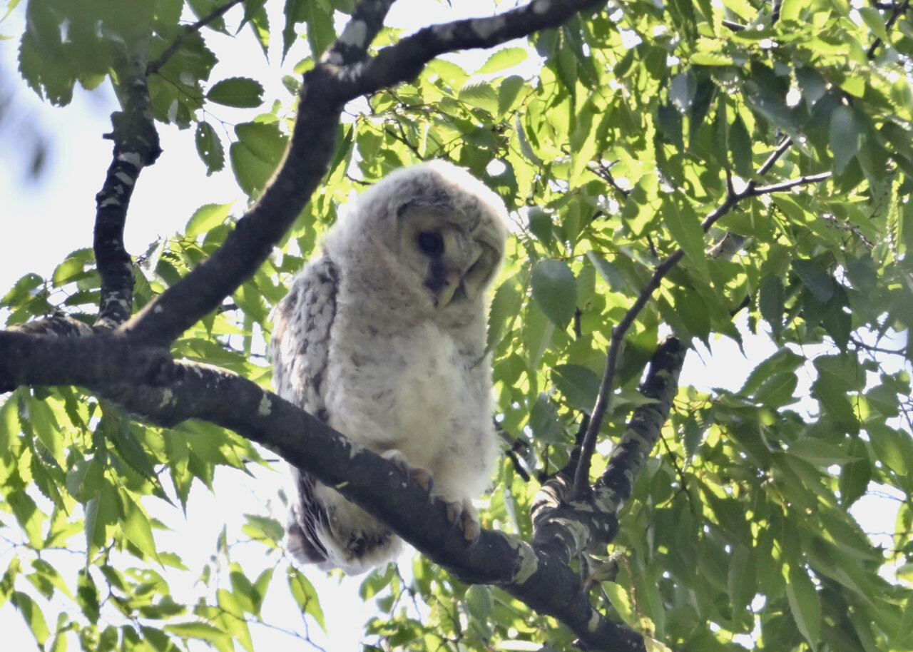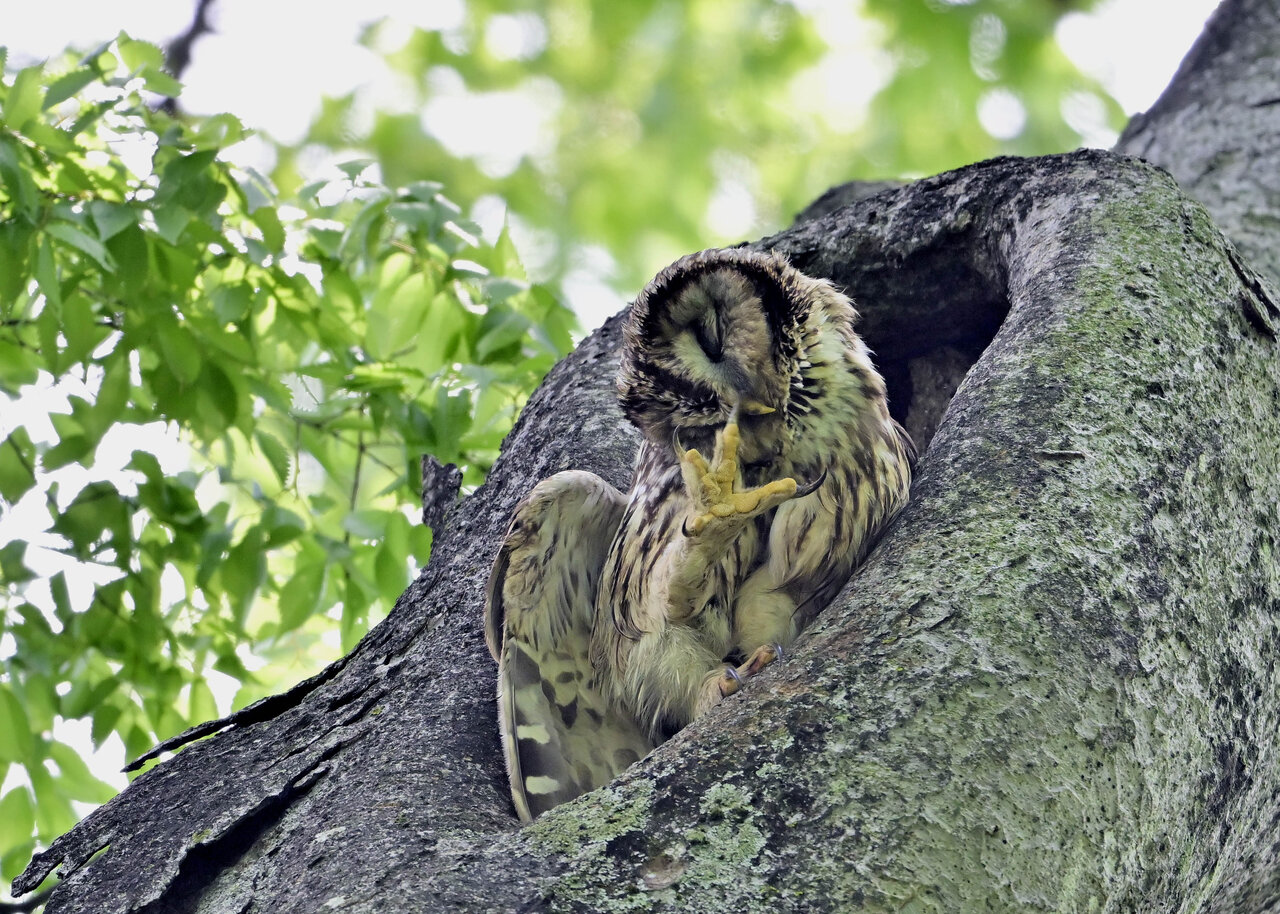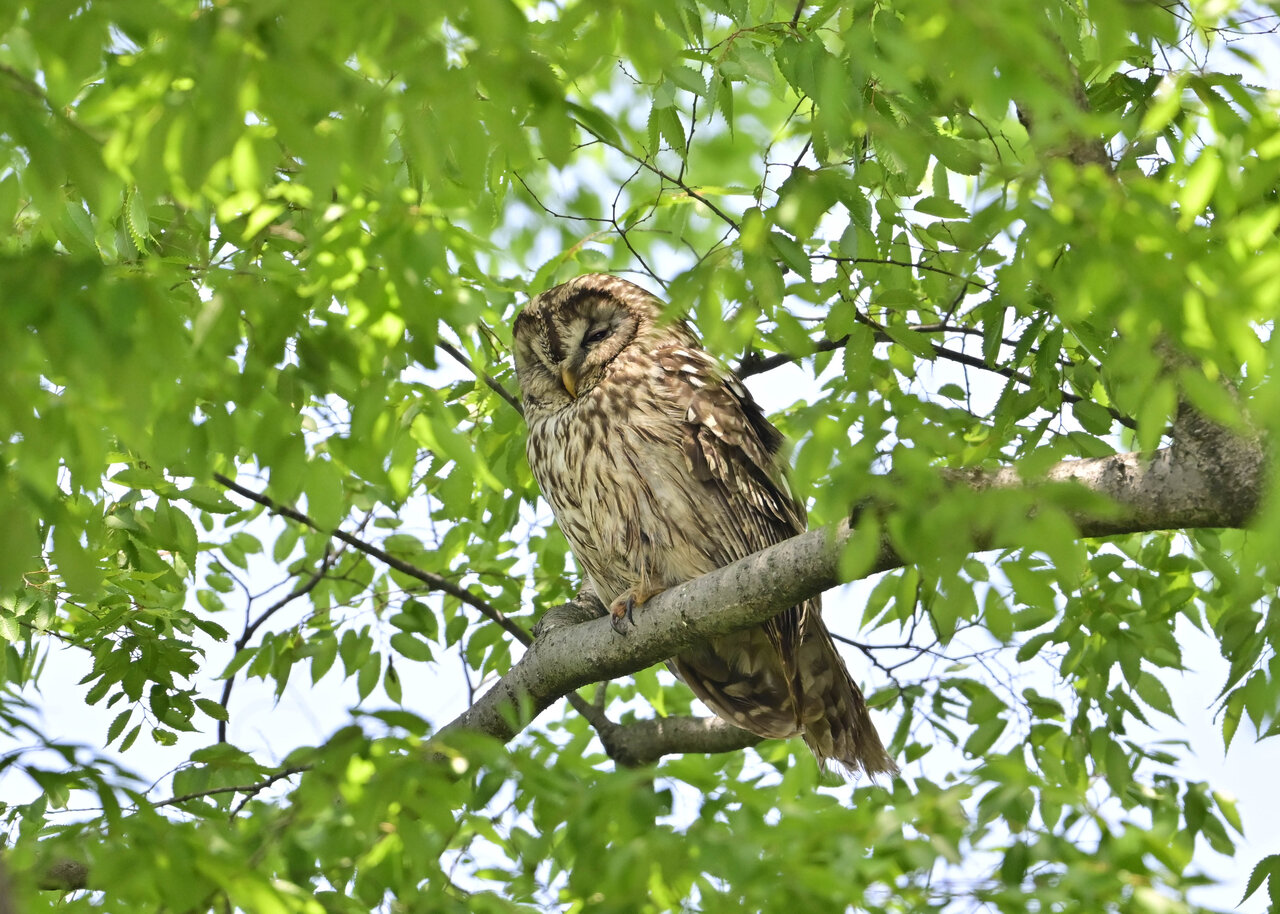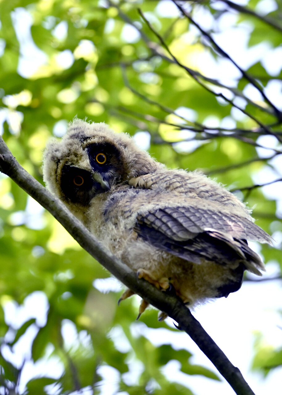 洞(巣)から飛び出すフクロウ ♀ です。ヒナは5/11頃から洞(巣)から顔を見せていましたが、5/16に巣立ちました。