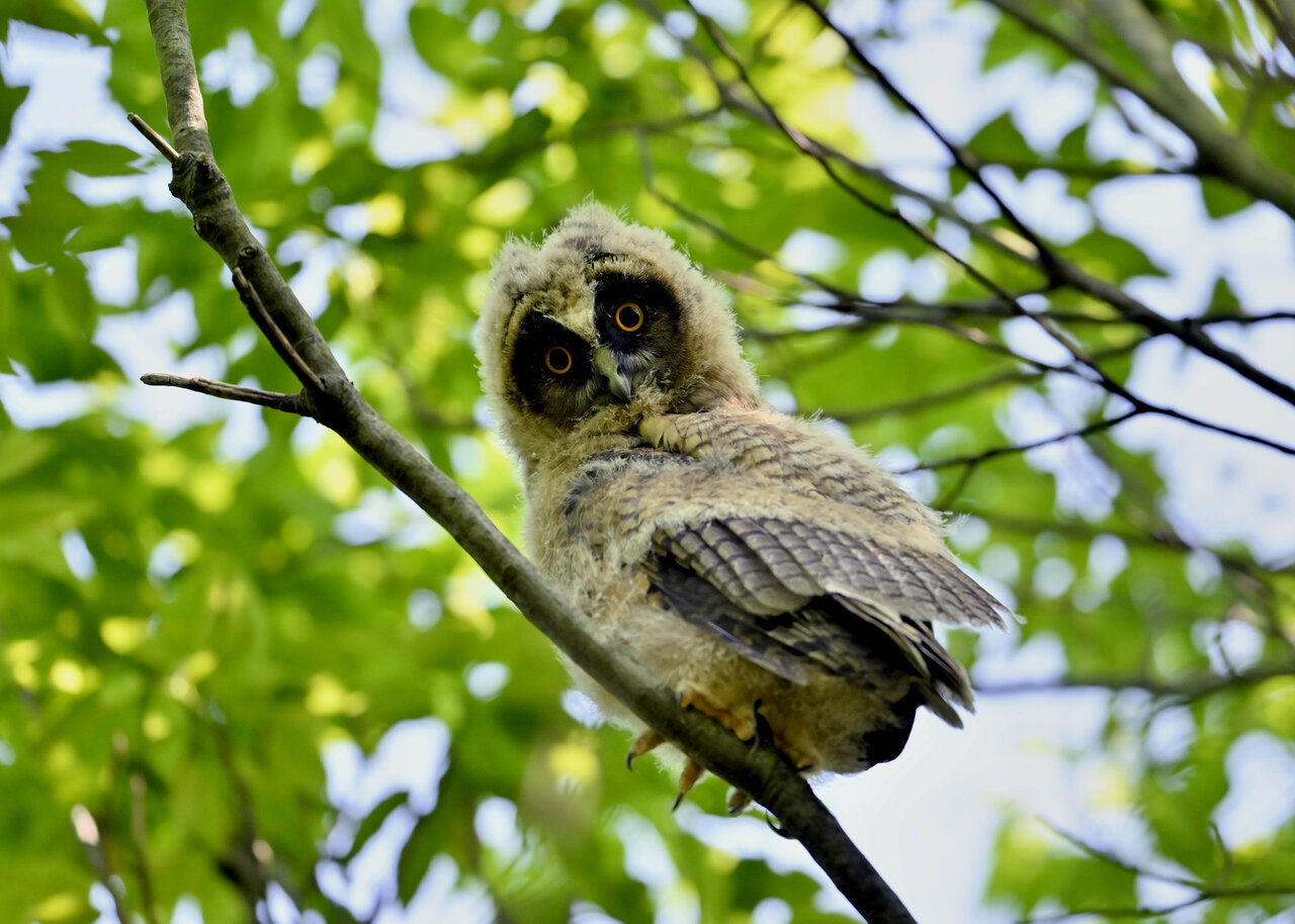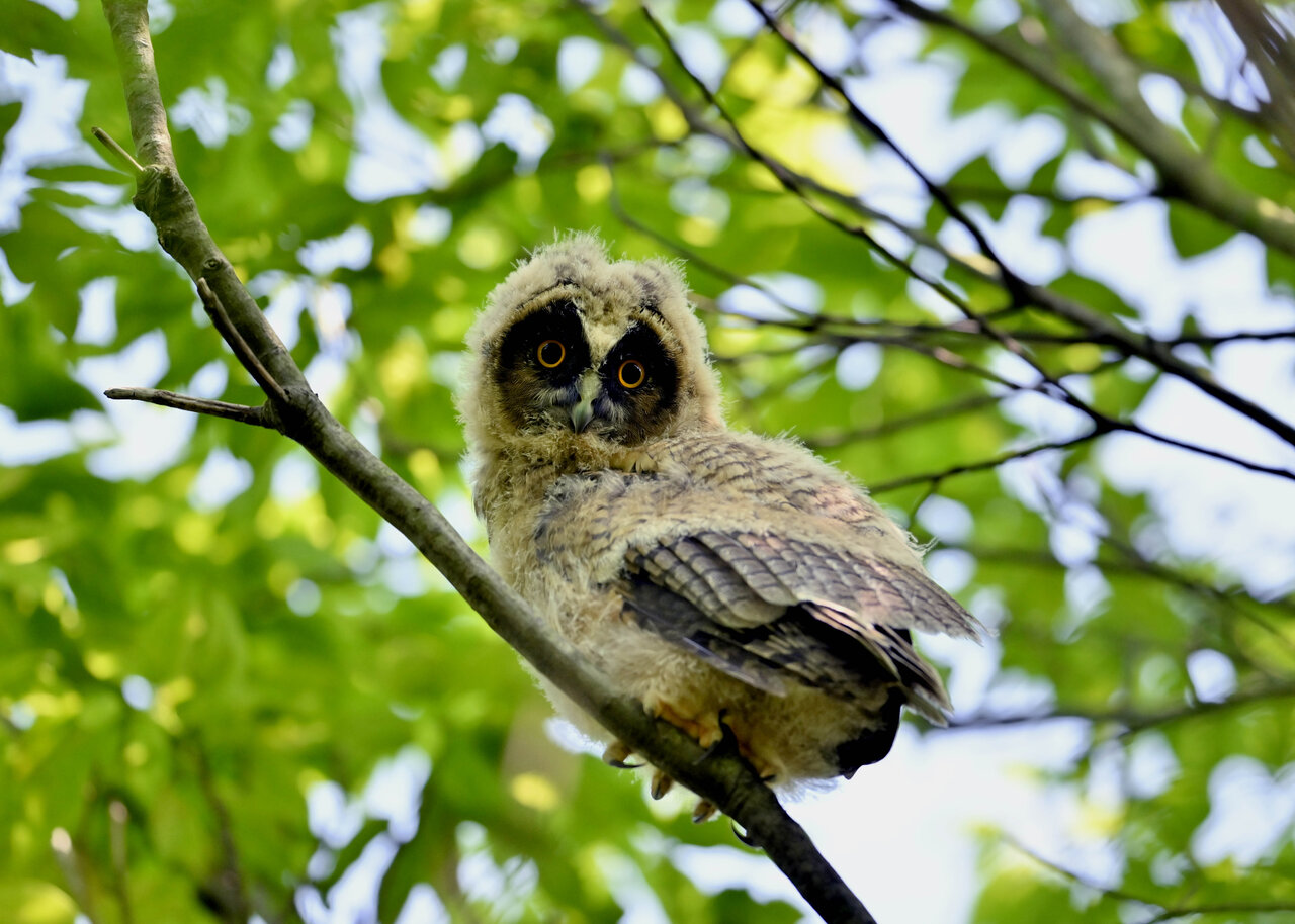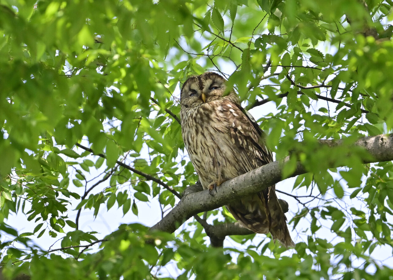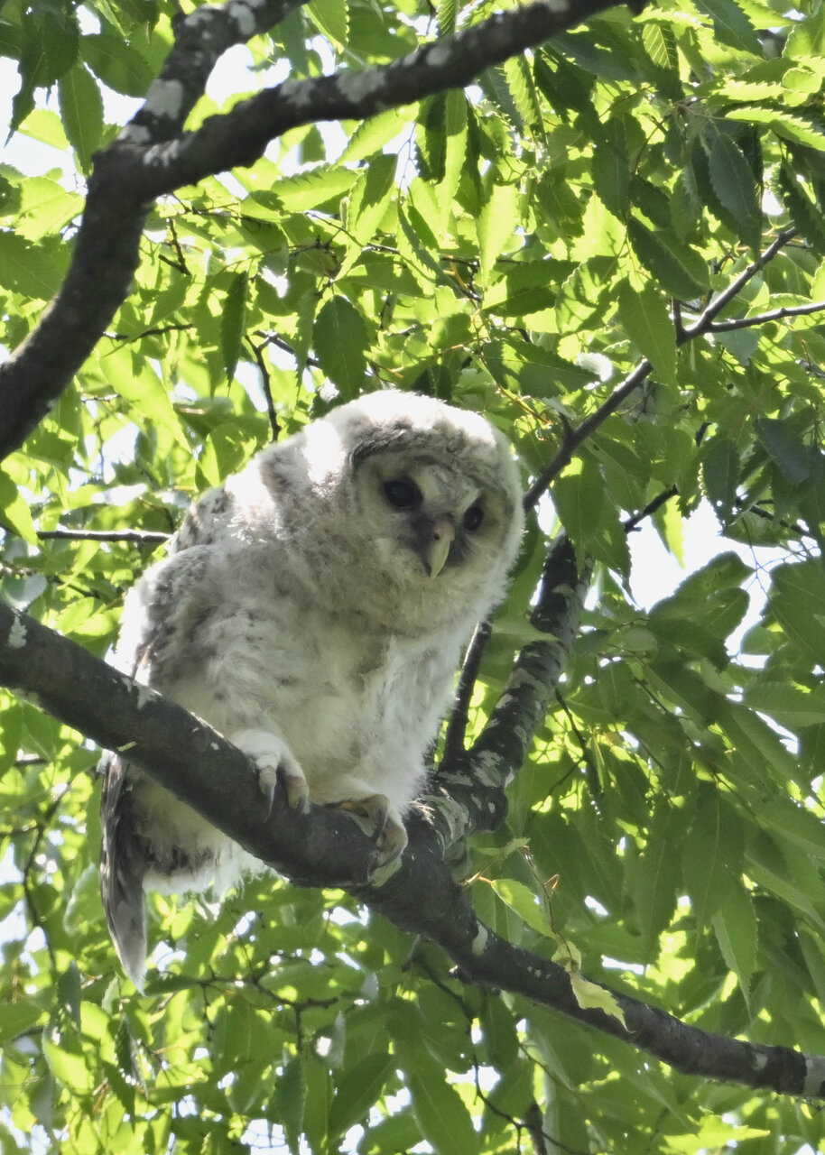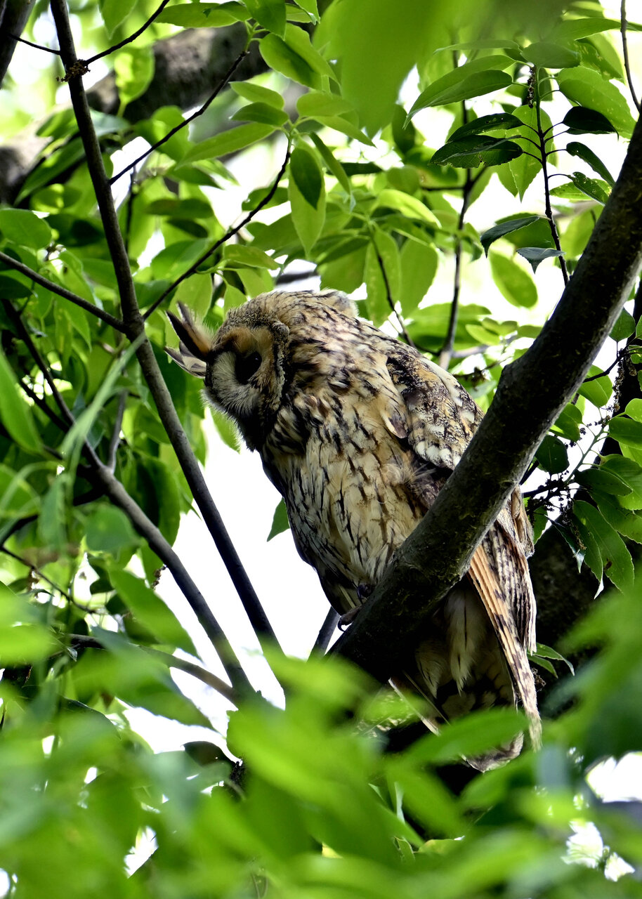 洞(巣)から飛び出すフクロウ ♀ です。ヒナは5/11頃から洞(巣)から顔を見せていましたが、5/16に巣立ちました。