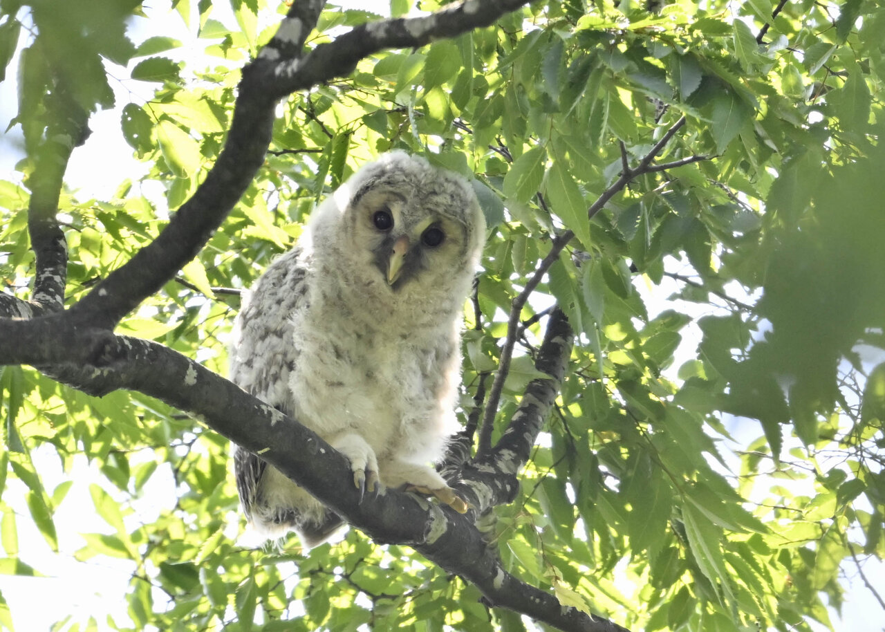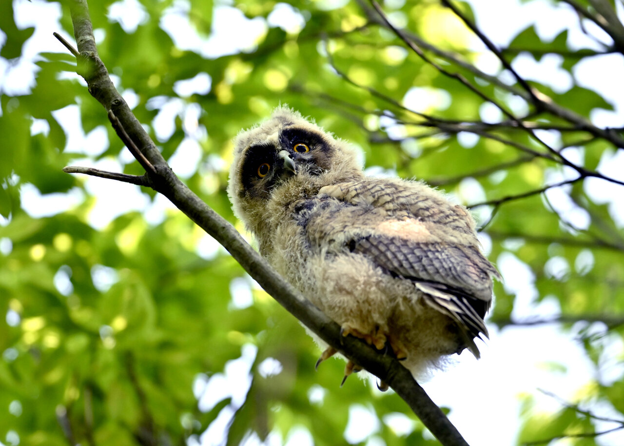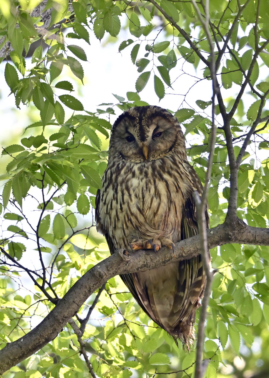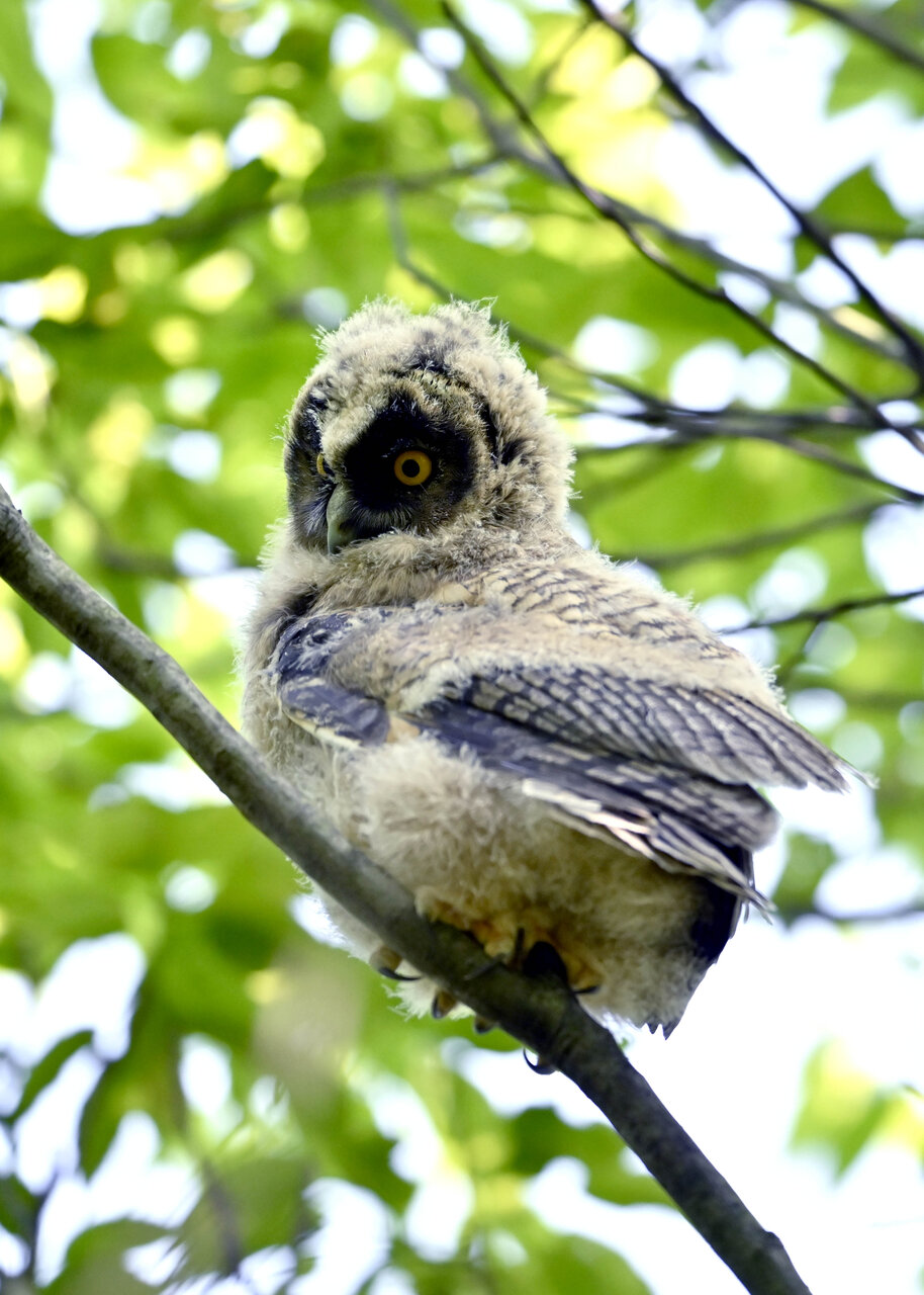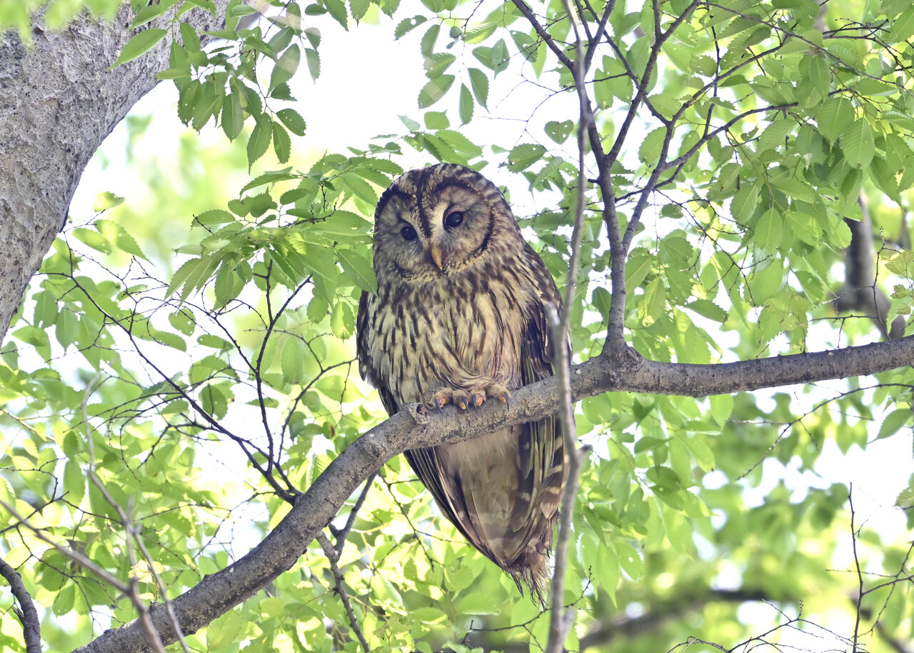 洞(巣)から飛び出すフクロウ ♀ です。ヒナは5/11頃から洞(巣)から顔を見せていましたが、5/16に巣立ちました。