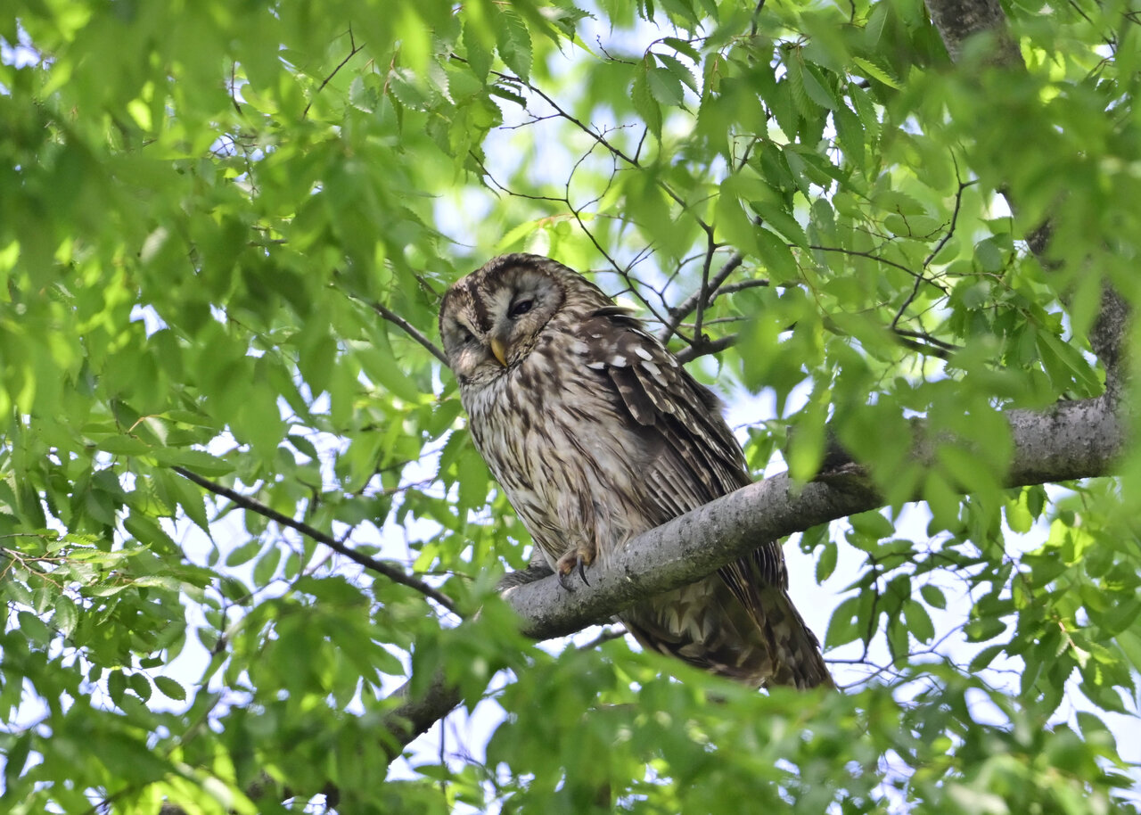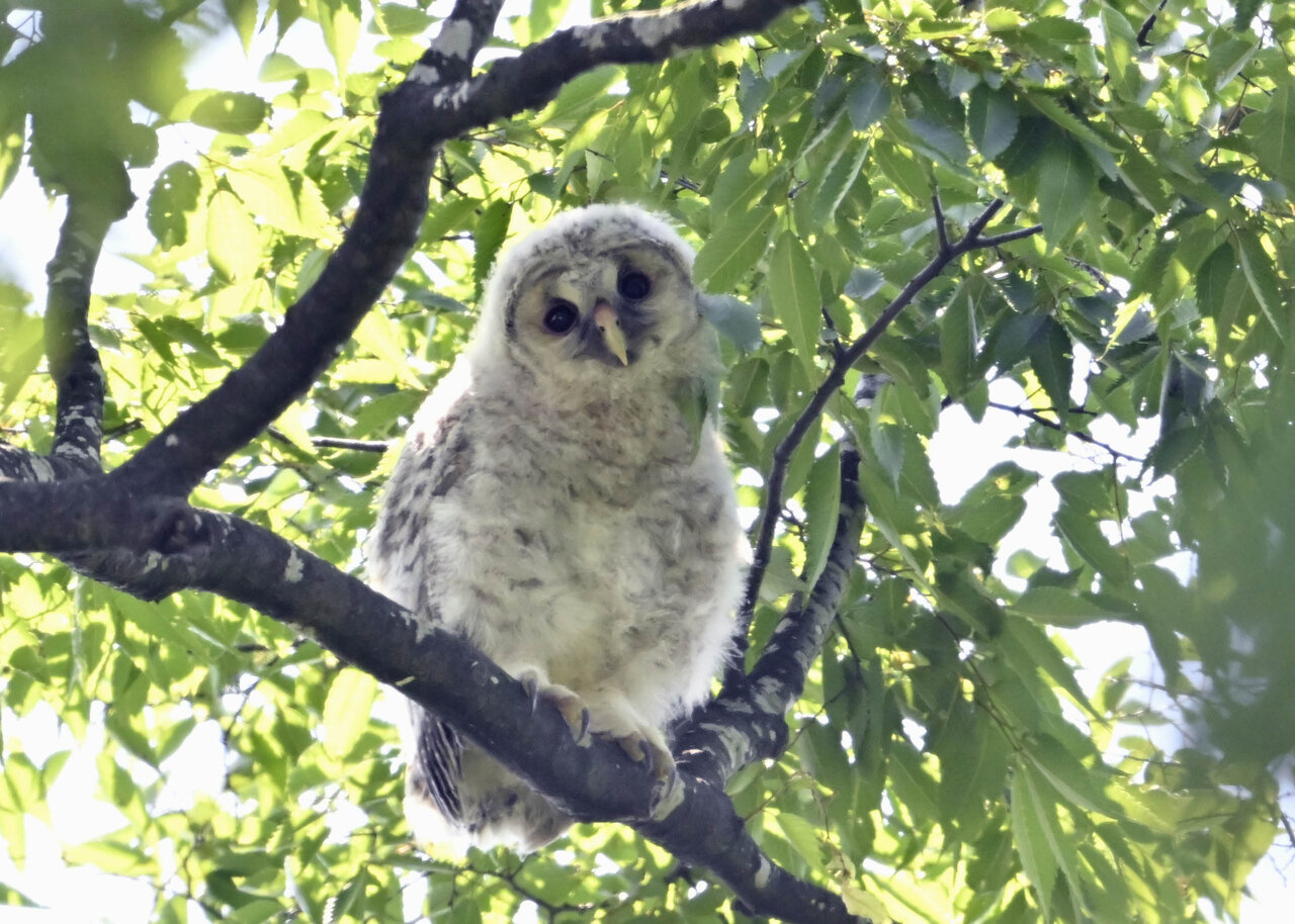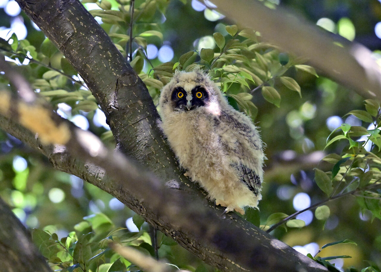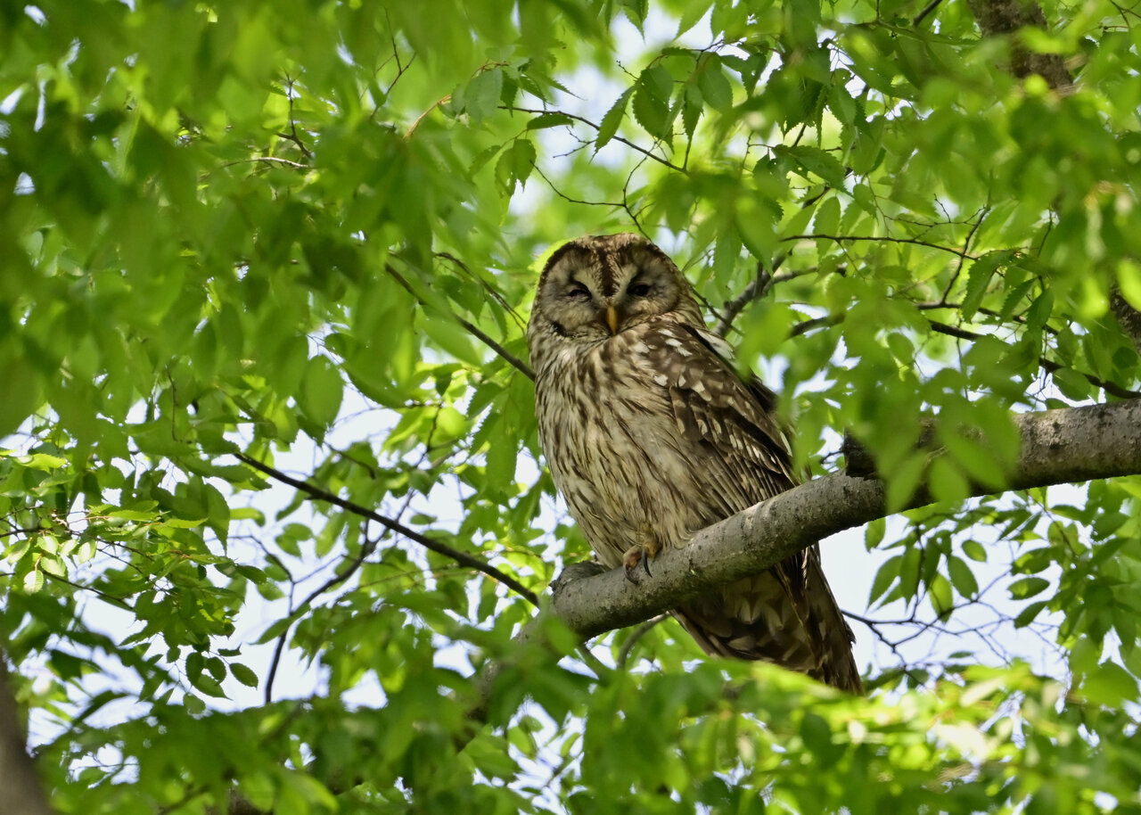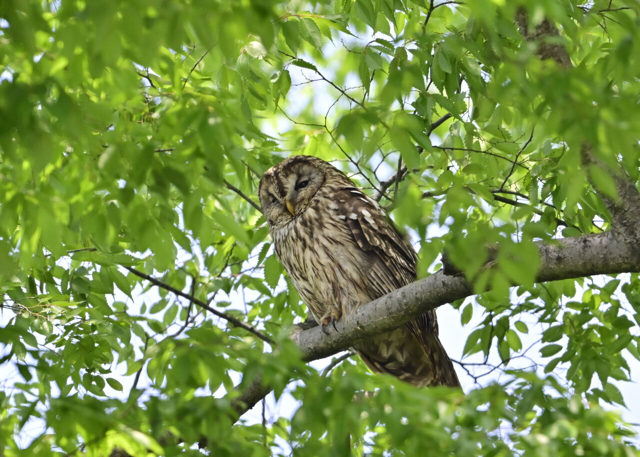 洞(巣)から飛び出すフクロウ ♀ です。ヒナは5/11頃から洞(巣)から顔を見せていましたが、5/16に巣立ちました。