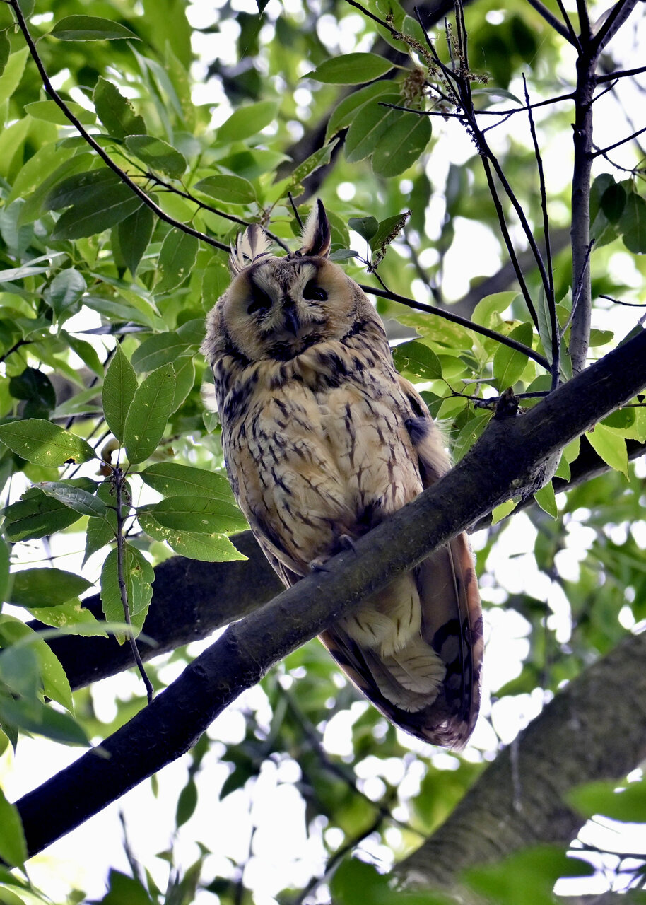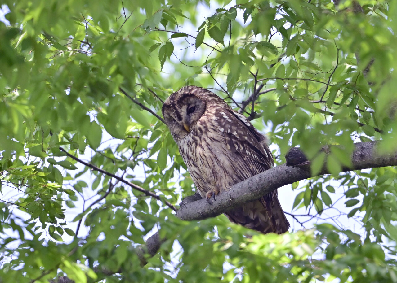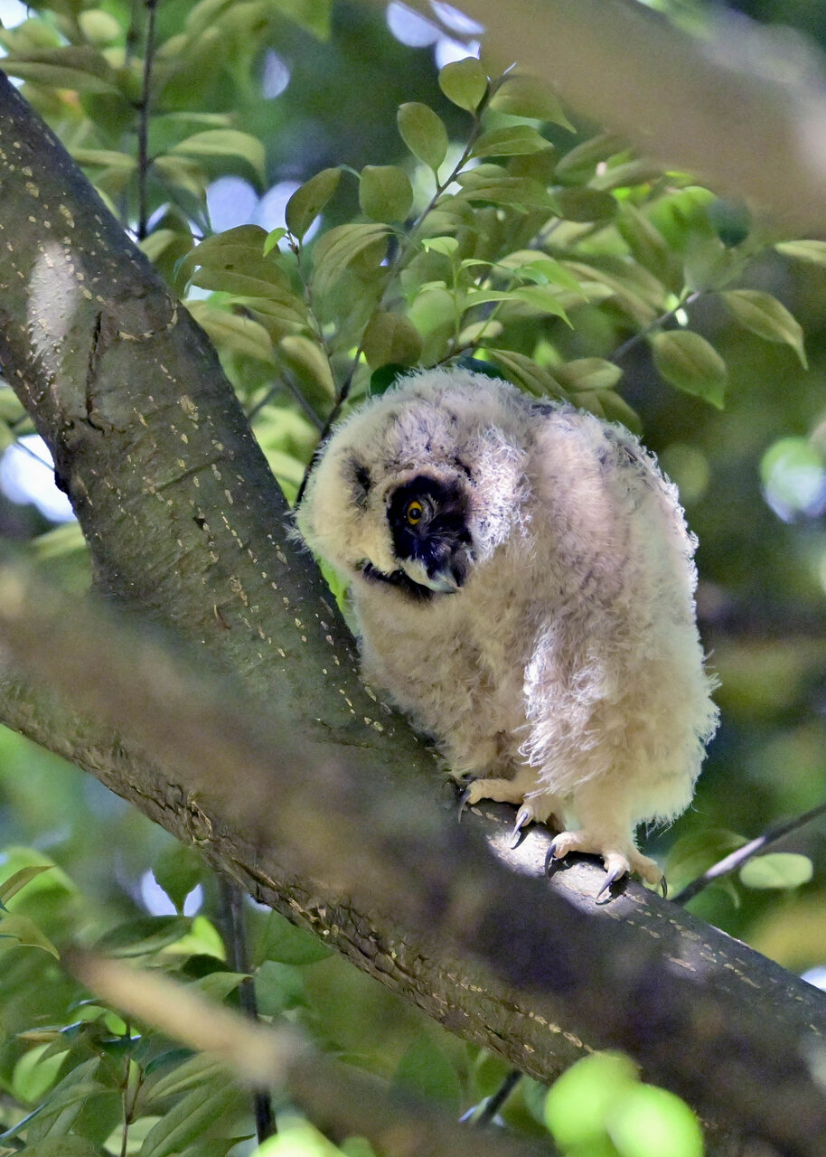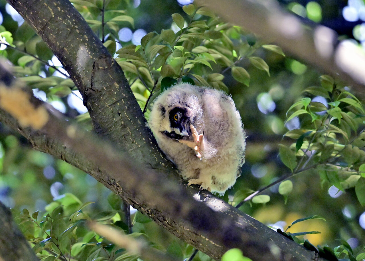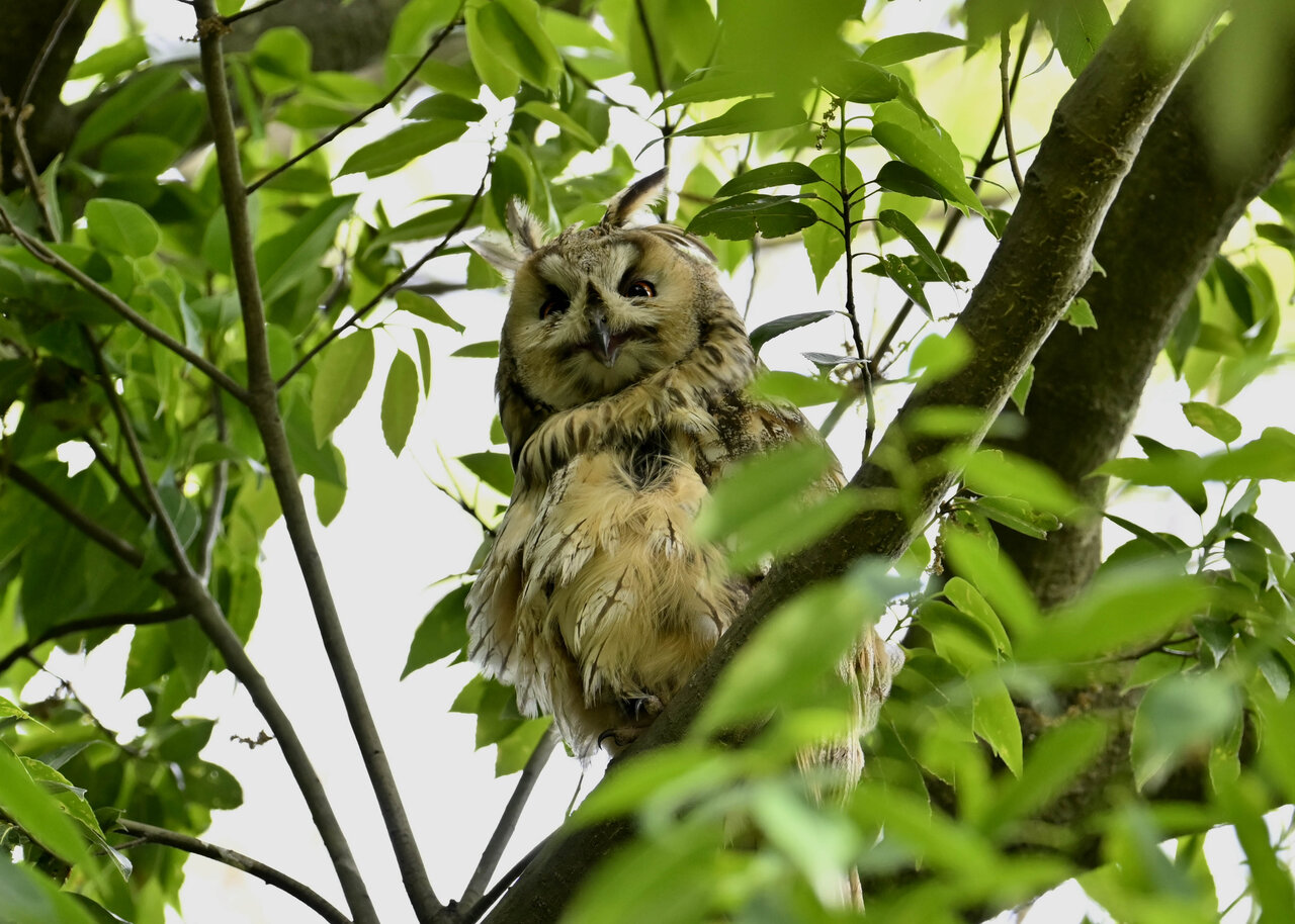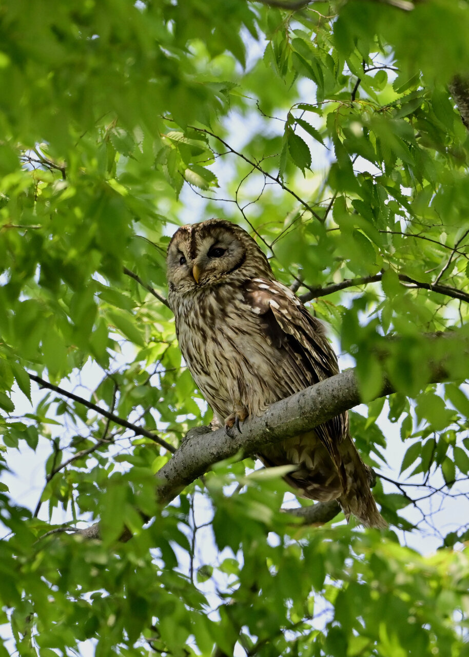 洞(巣)から飛び出すフクロウ ♀ です。ヒナは5/11頃から洞(巣)から顔を見せていましたが、5/16に巣立ちました。
