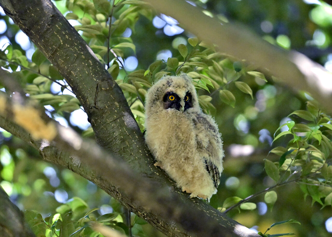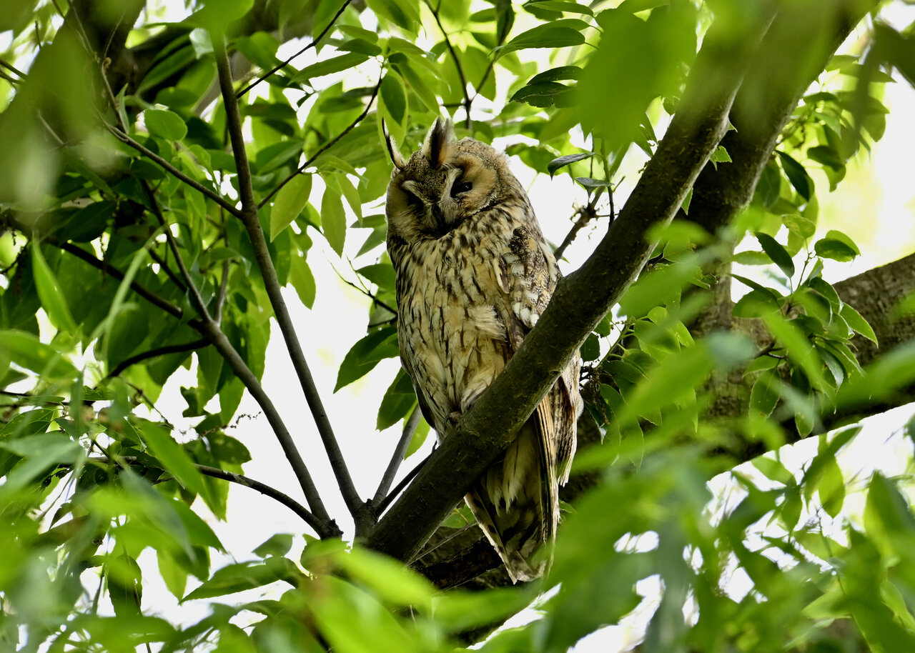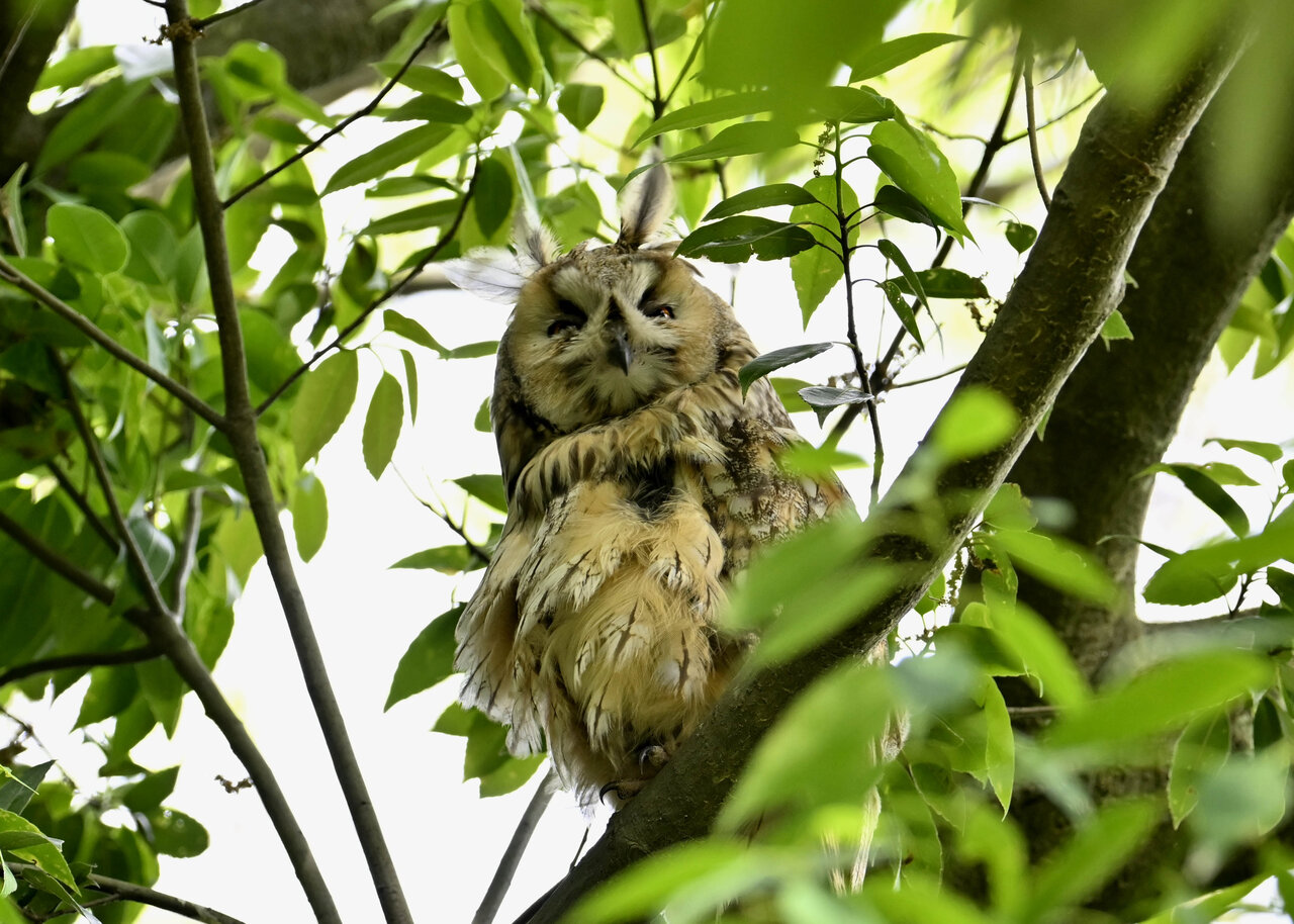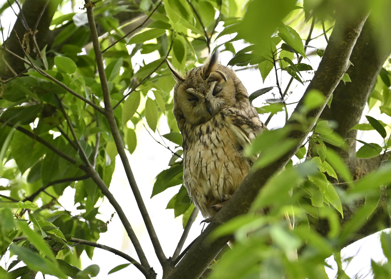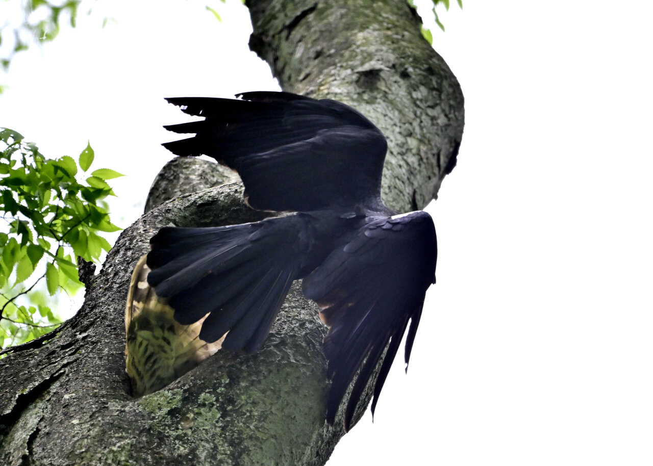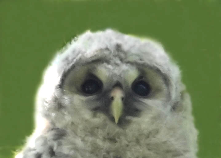 洞(巣)から飛び出すフクロウ ♀ です。ヒナは5/11頃から洞(巣)から顔を見せていましたが、5/16に巣立ちました。
