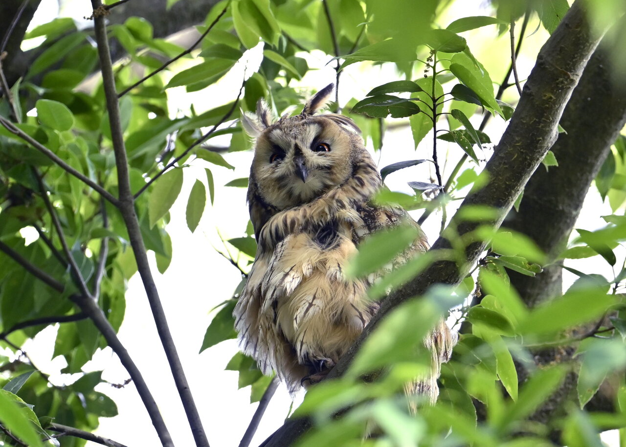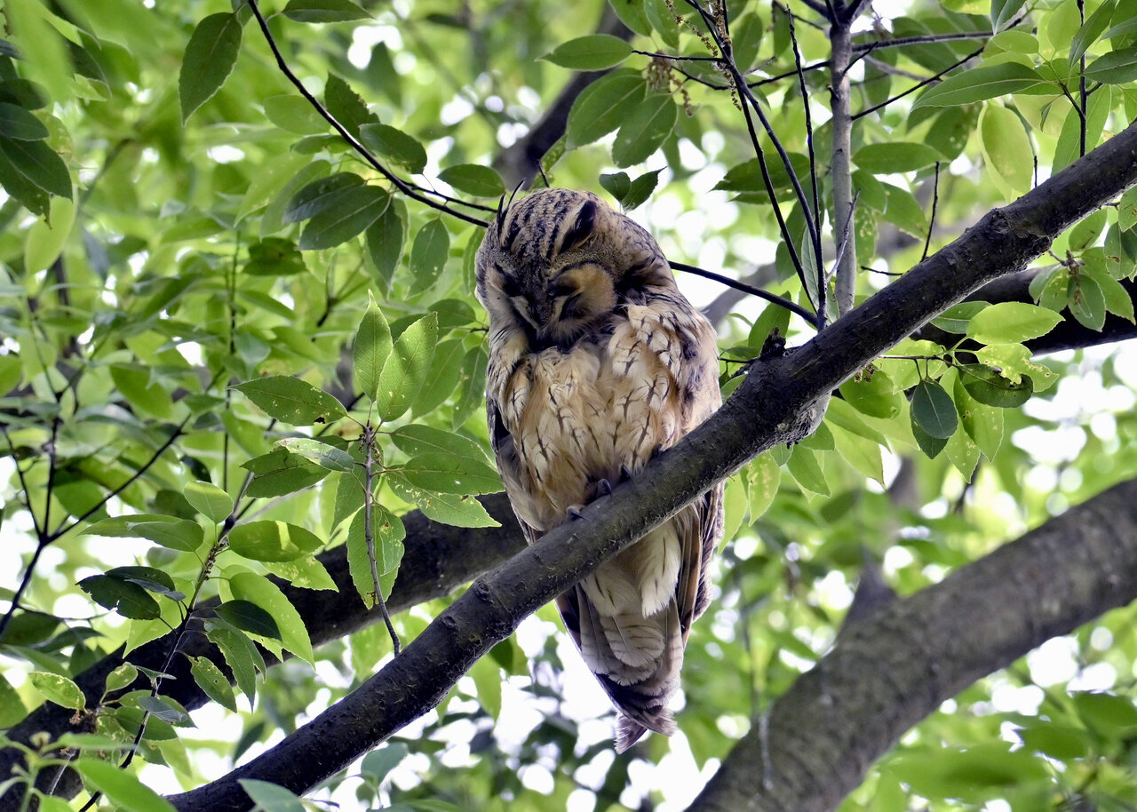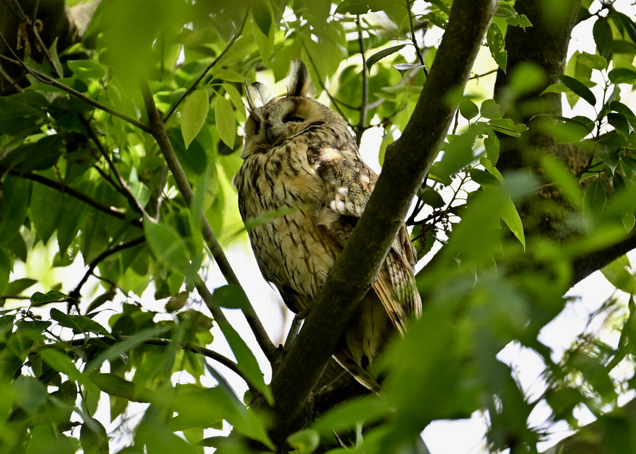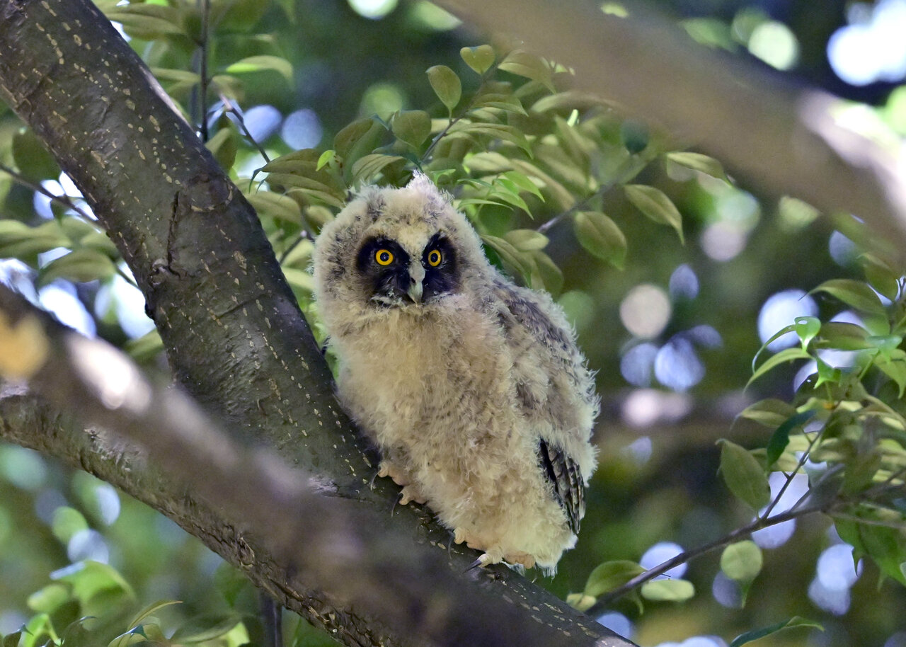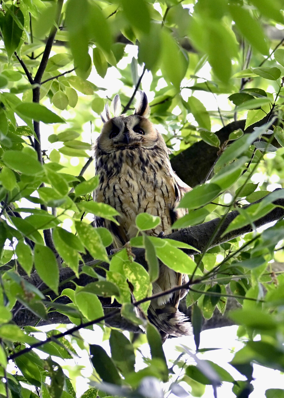 洞(巣)から飛び出すフクロウ ♀ です。ヒナは5/11頃から洞(巣)から顔を見せていましたが、5/16に巣立ちました。
