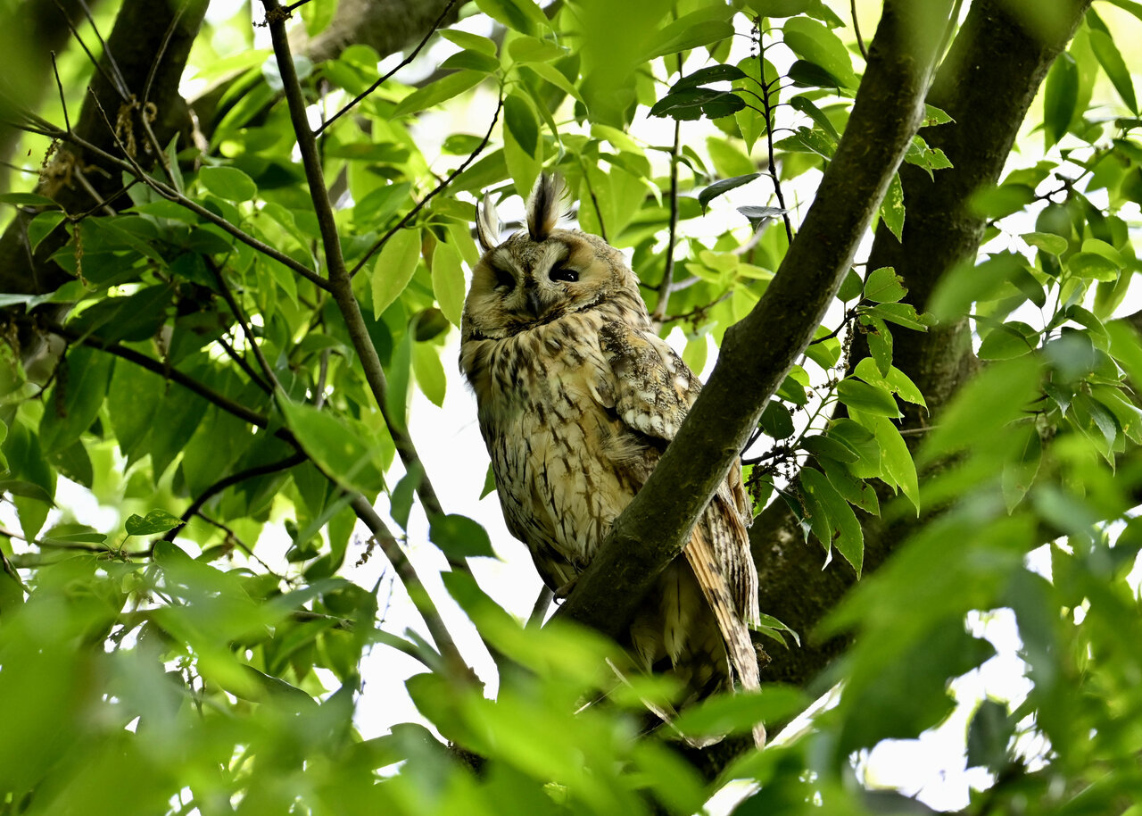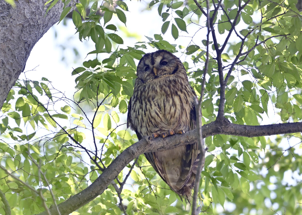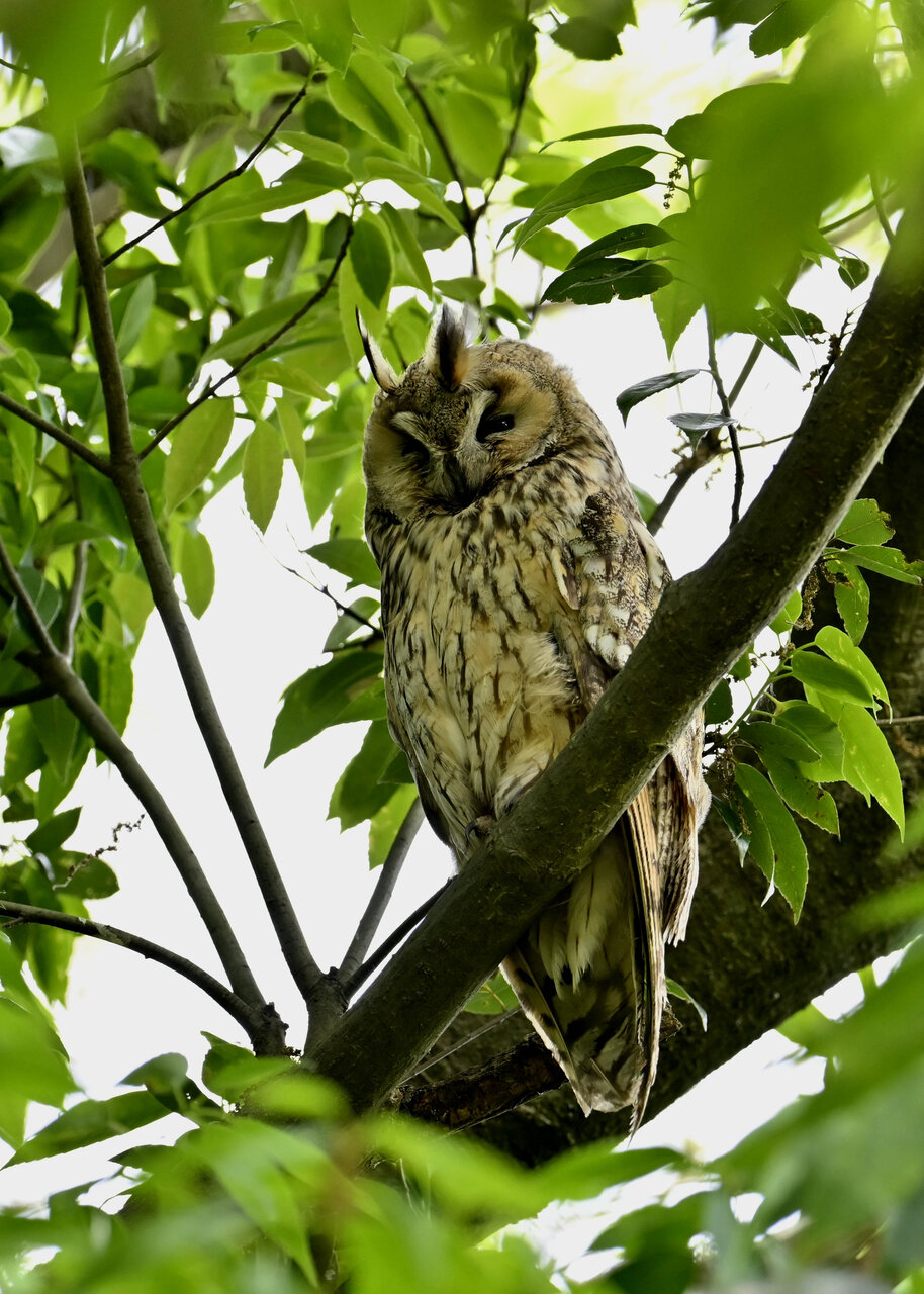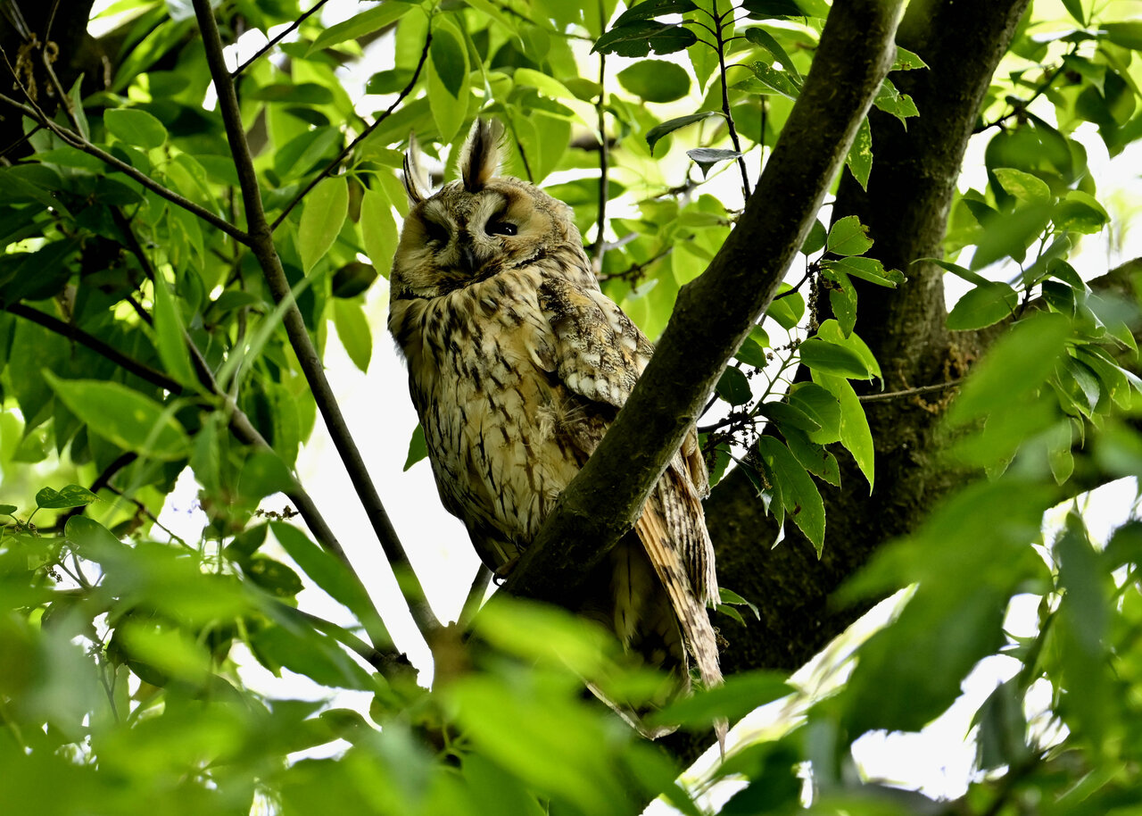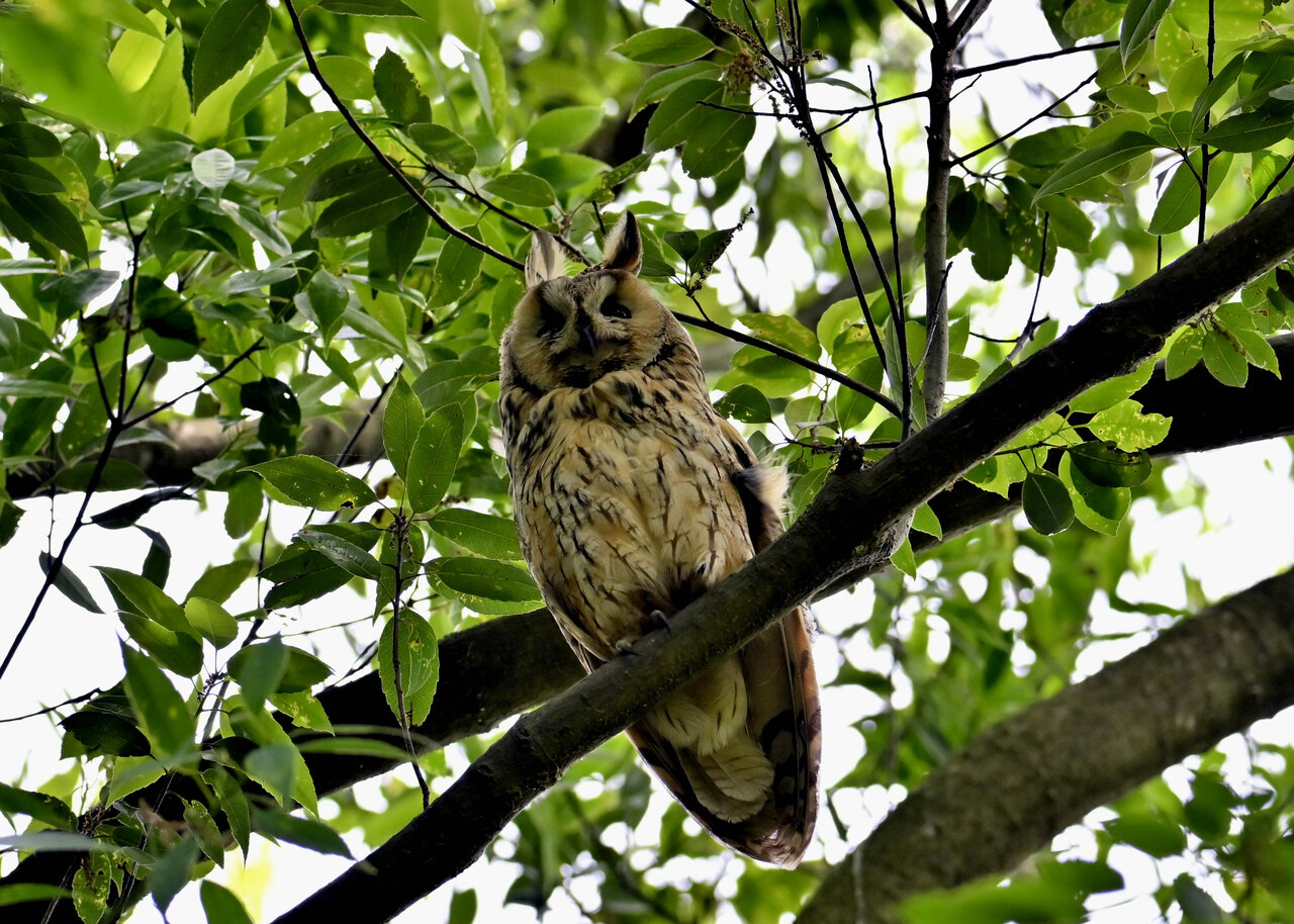 洞(巣)から飛び出すフクロウ ♀ です。ヒナは5/11頃から洞(巣)から顔を見せていましたが、5/16に巣立ちました。
