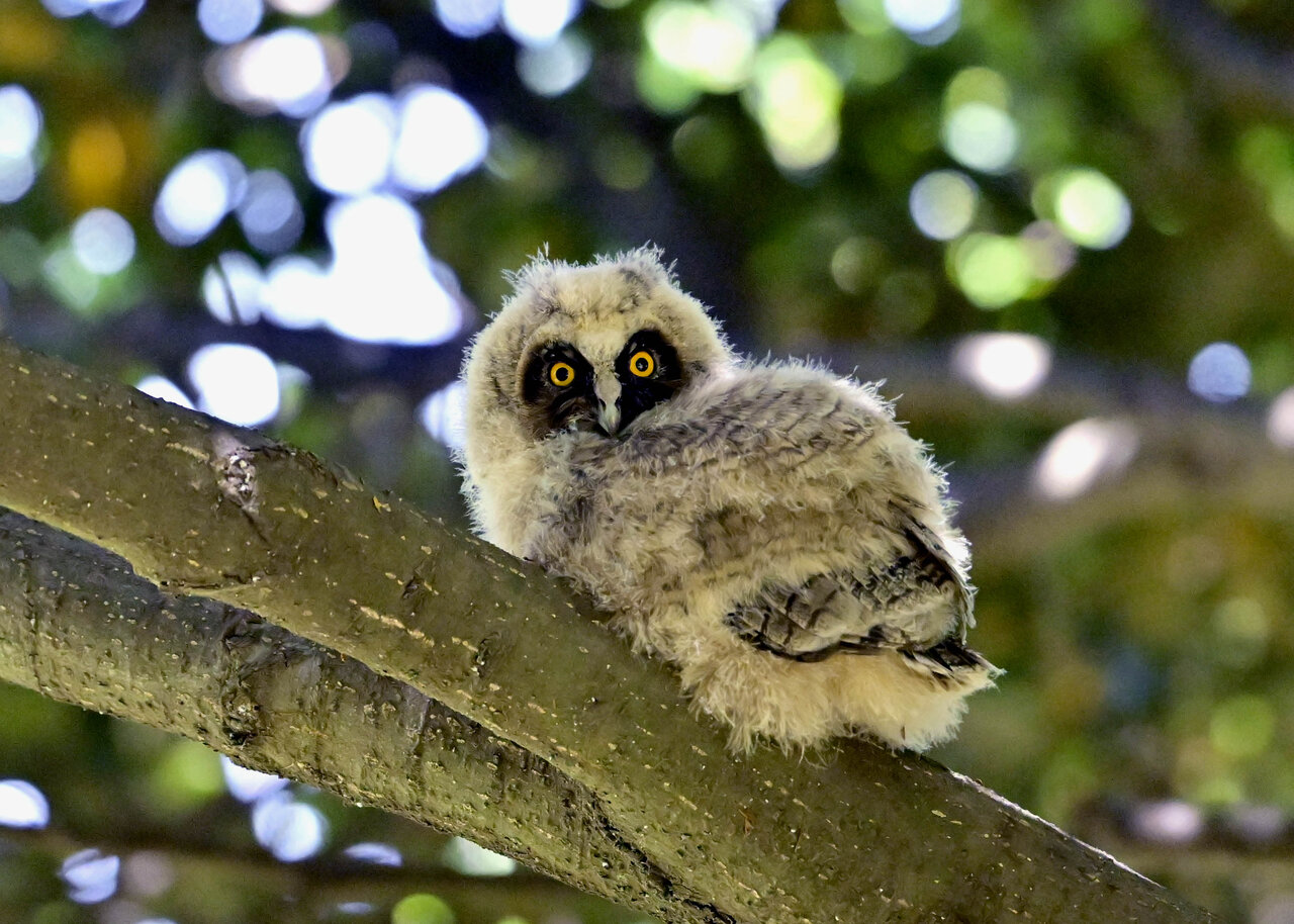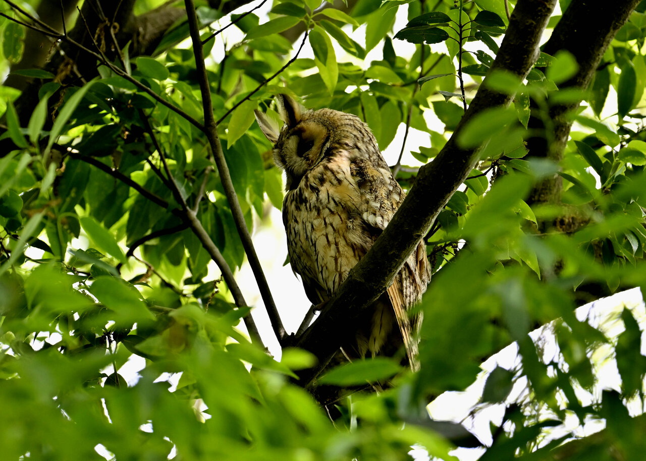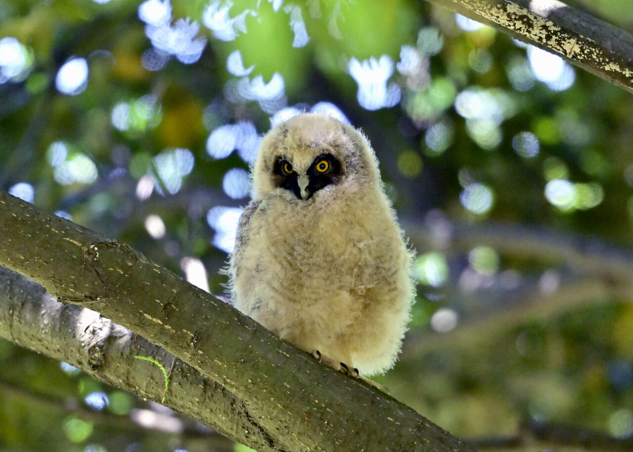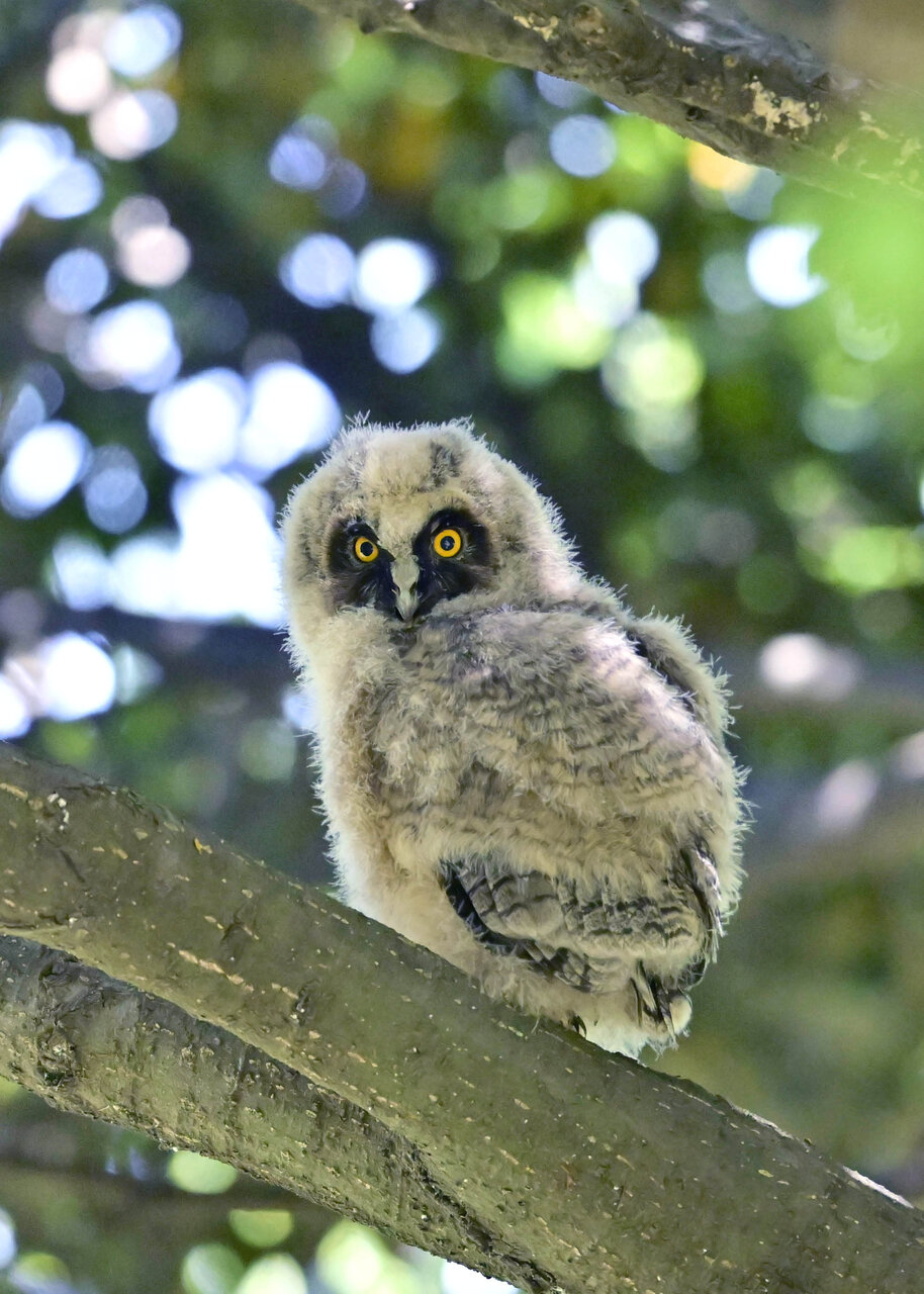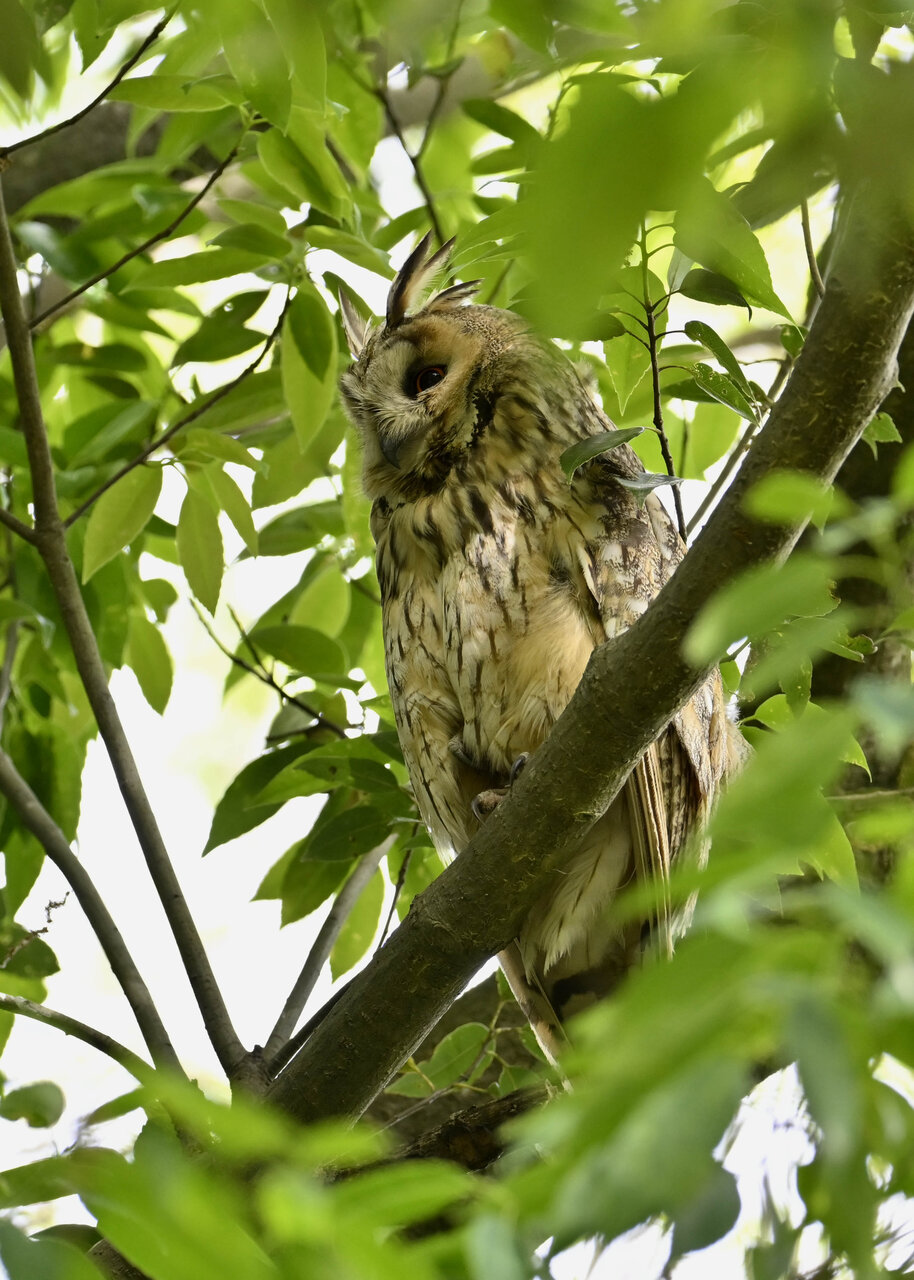 洞(巣)から飛び出すフクロウ ♀ です。ヒナは5/11頃から洞(巣)から顔を見せていましたが、5/16に巣立ちました。