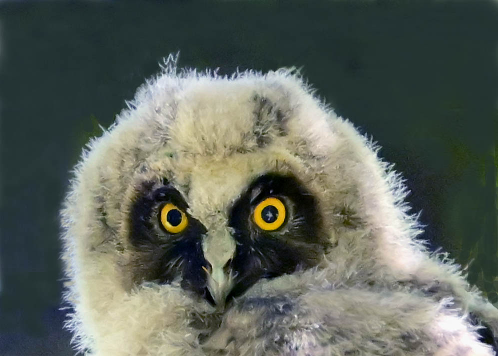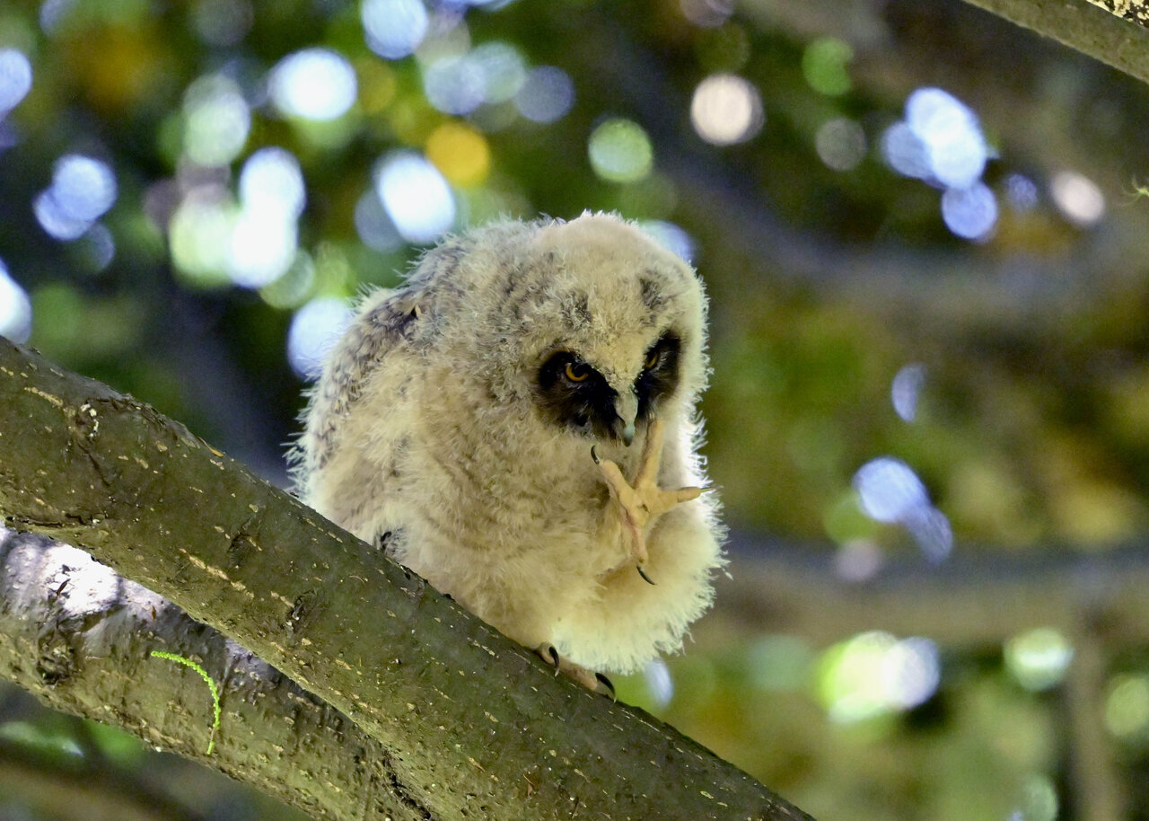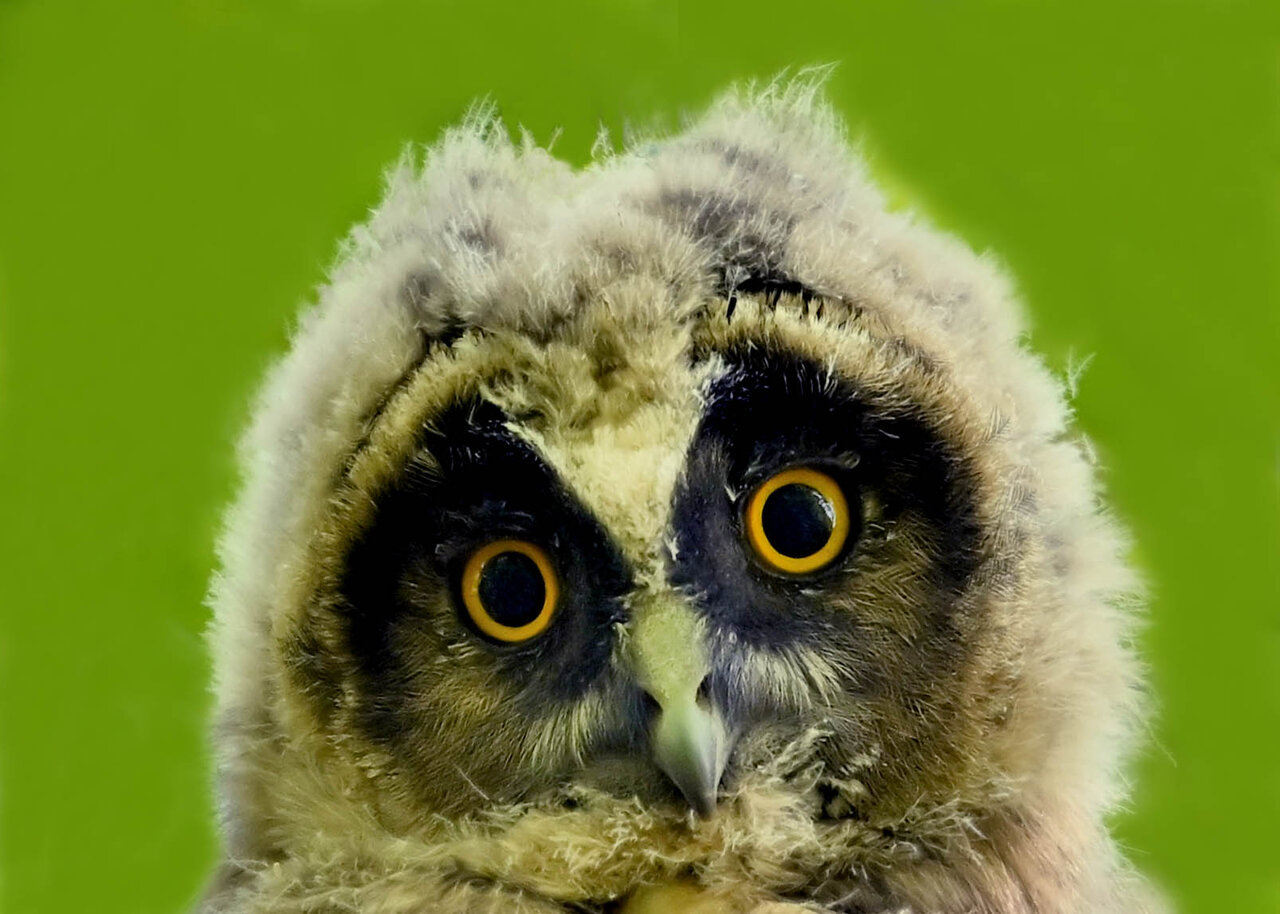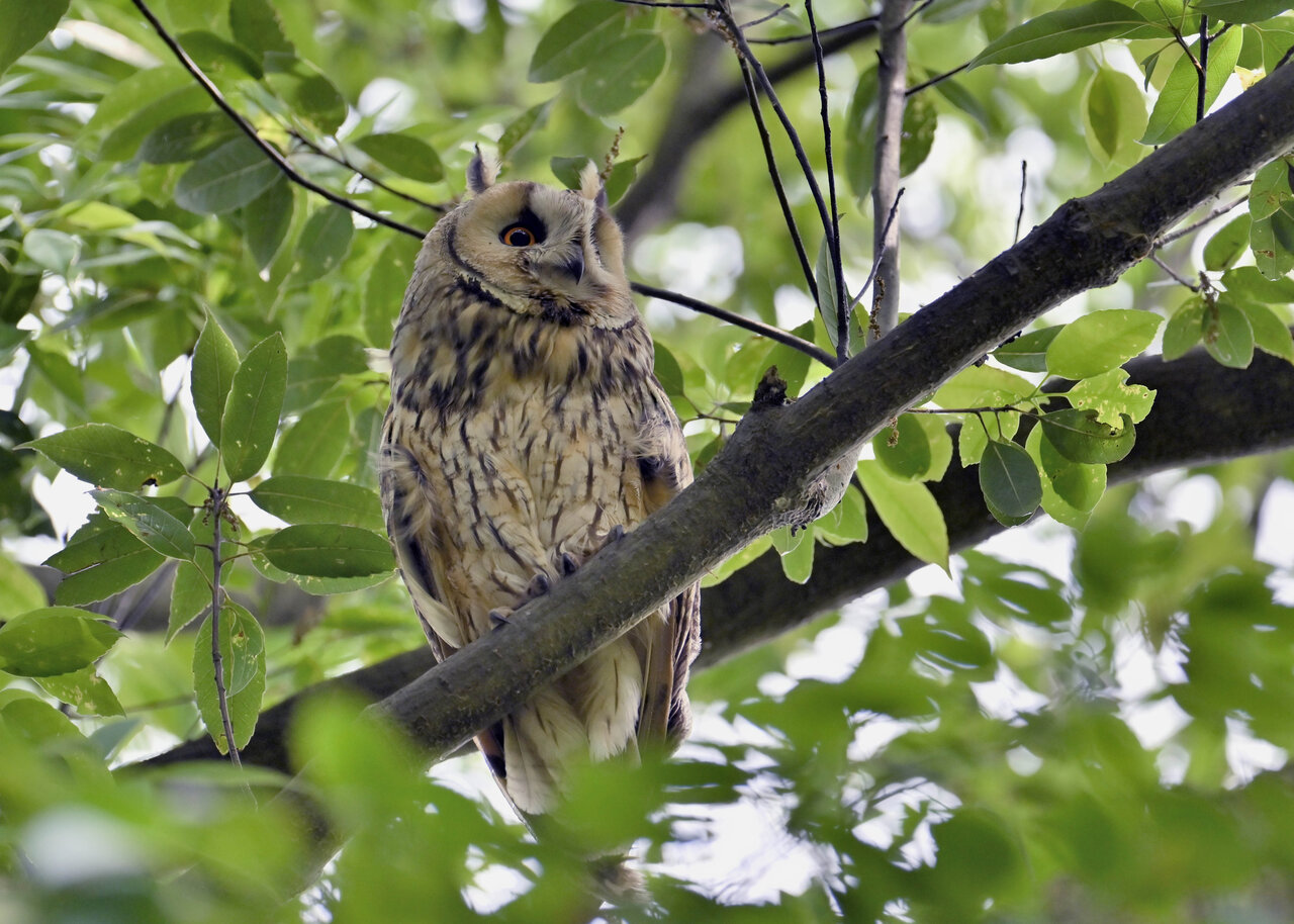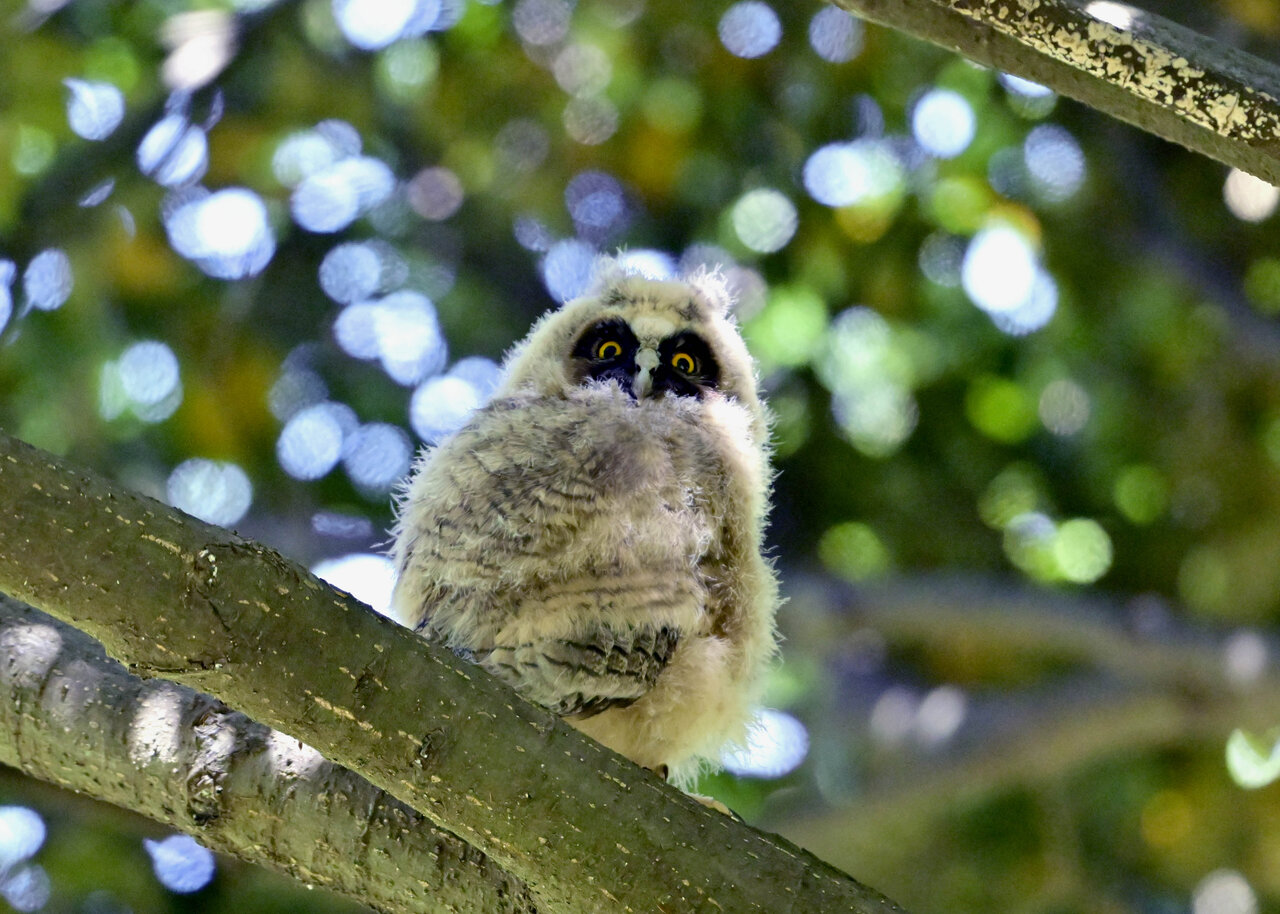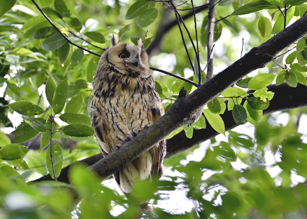 洞(巣)から飛び出すフクロウ ♀ です。ヒナは5/11頃から洞(巣)から顔を見せていましたが、5/16に巣立ちました。