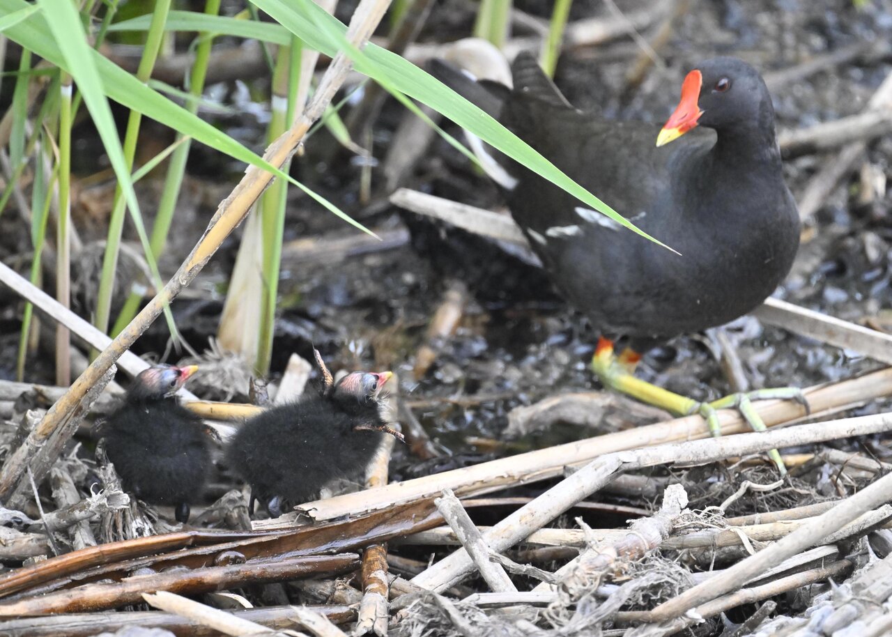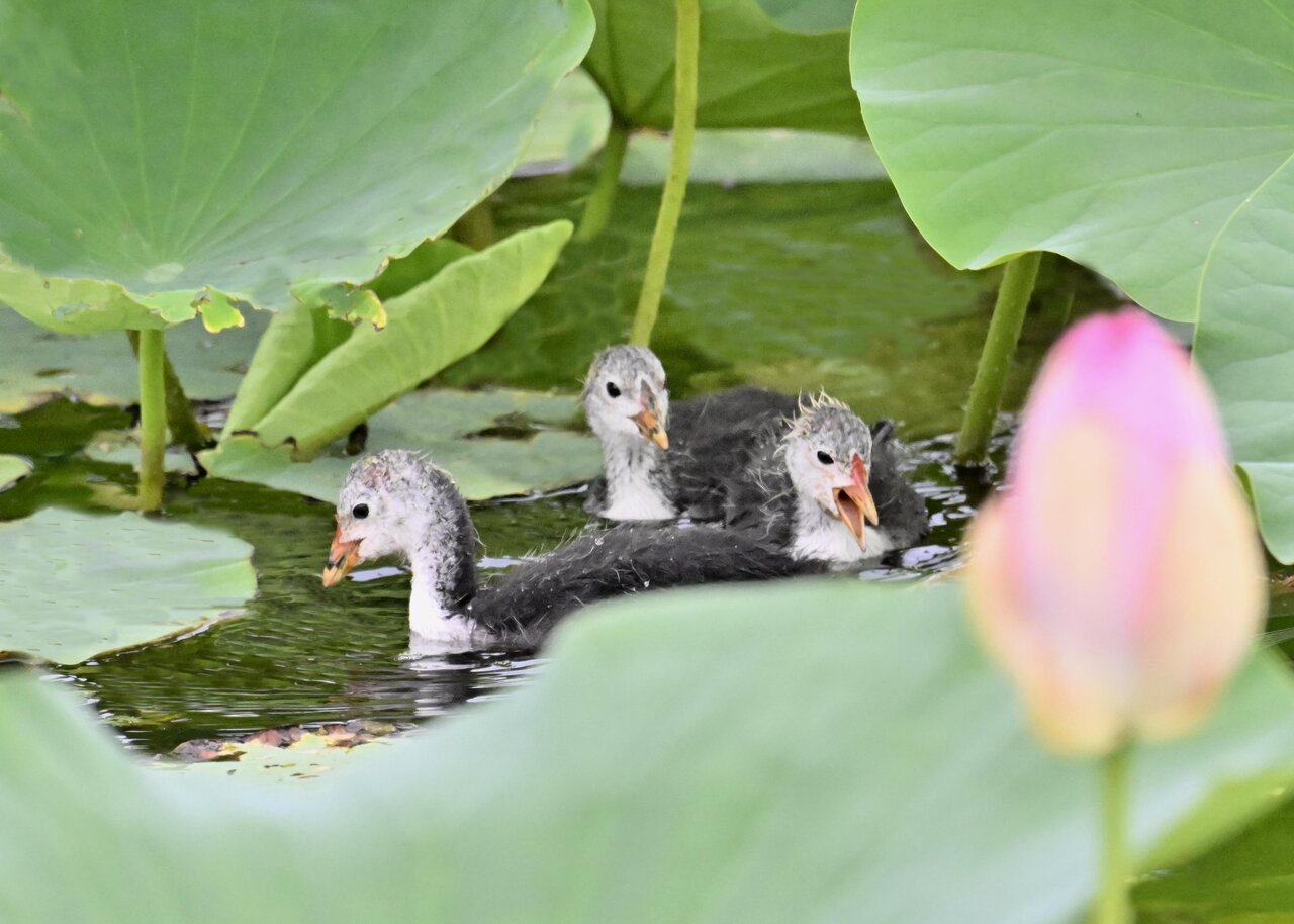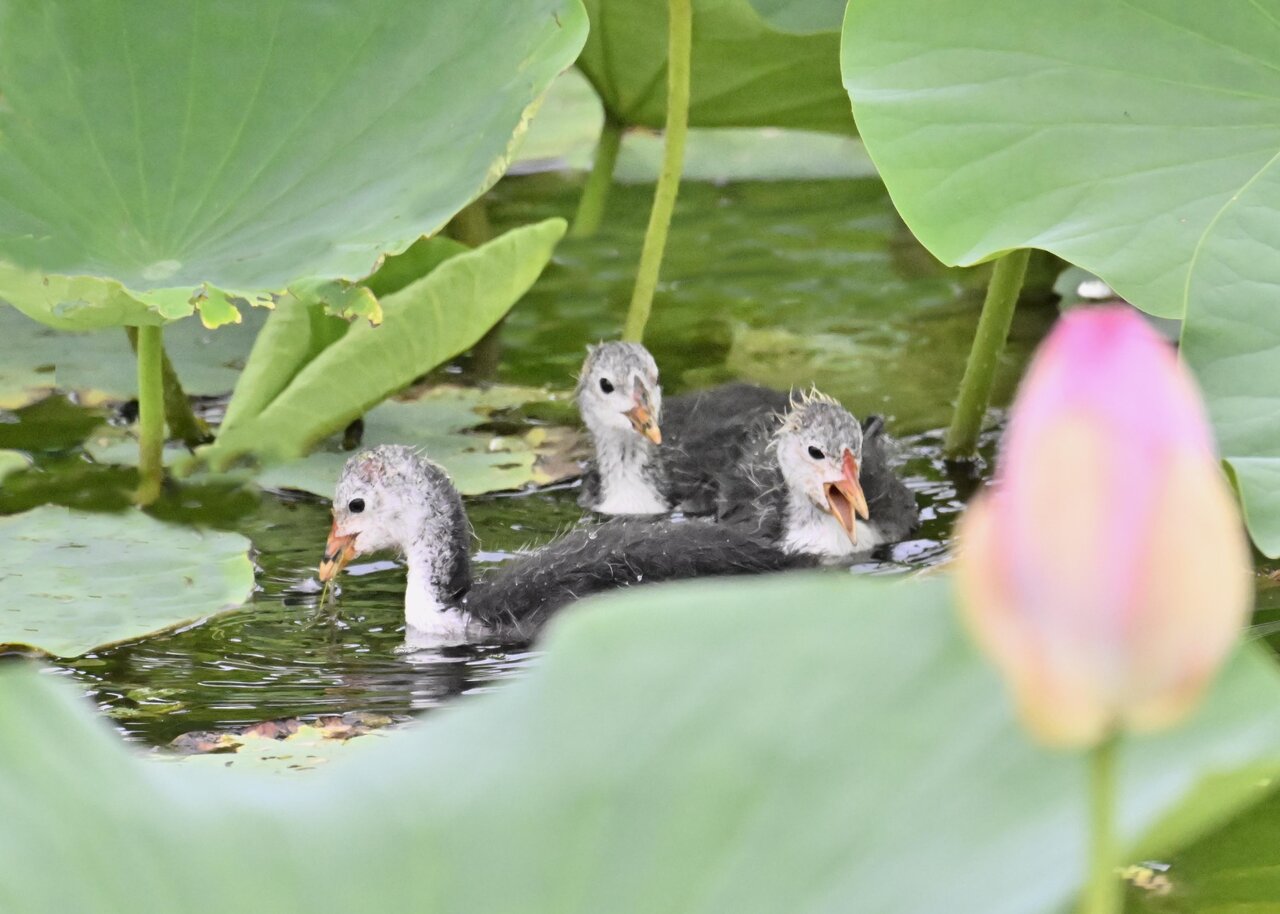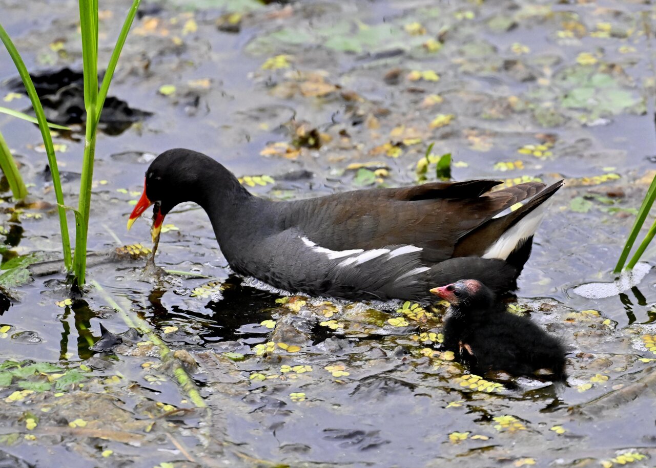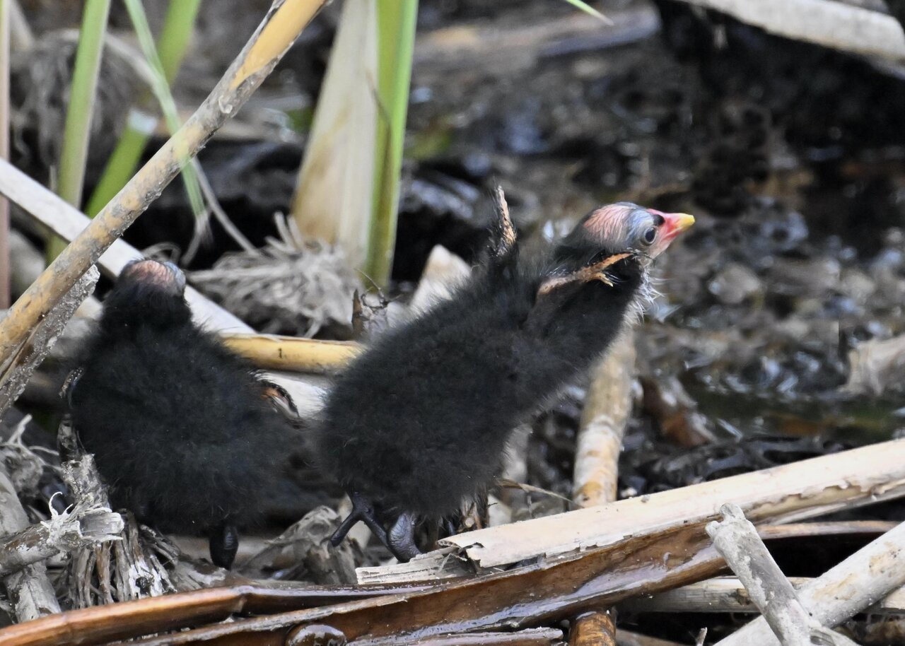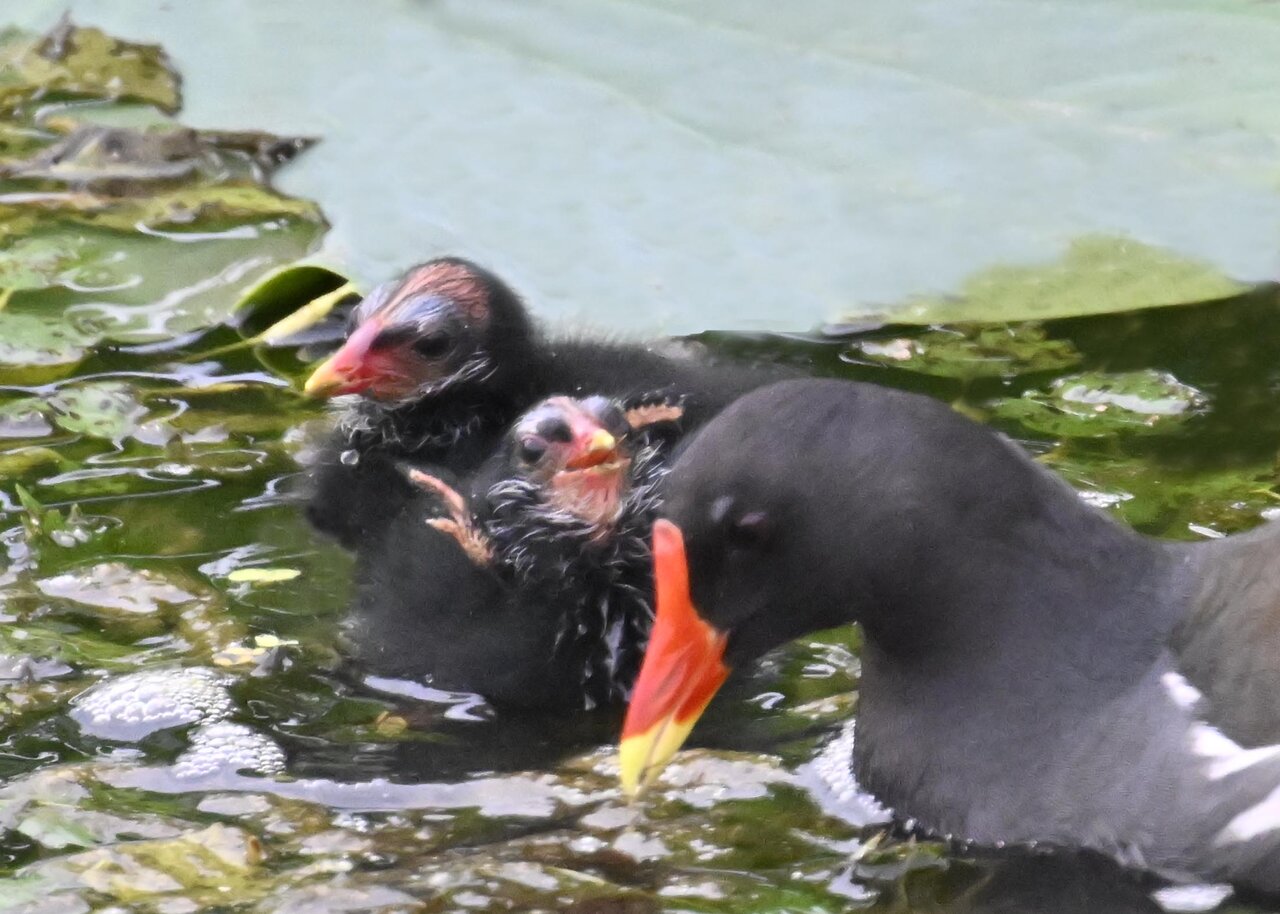 今日は昨日に続き、バンを掲載しています。巣立ちヒナはまだ自力で十分な餌が捕れないので親鳥に付き纏い餌をもらっています。