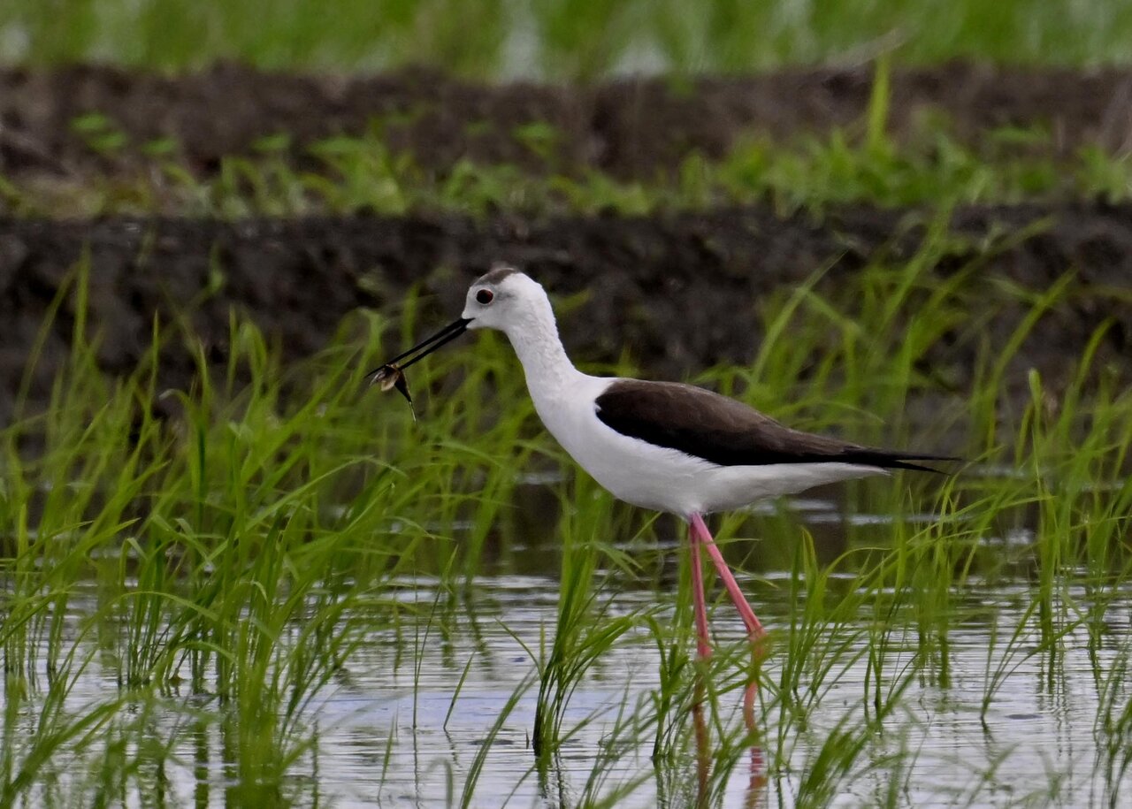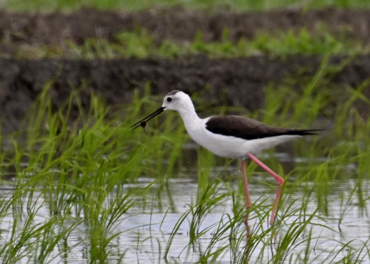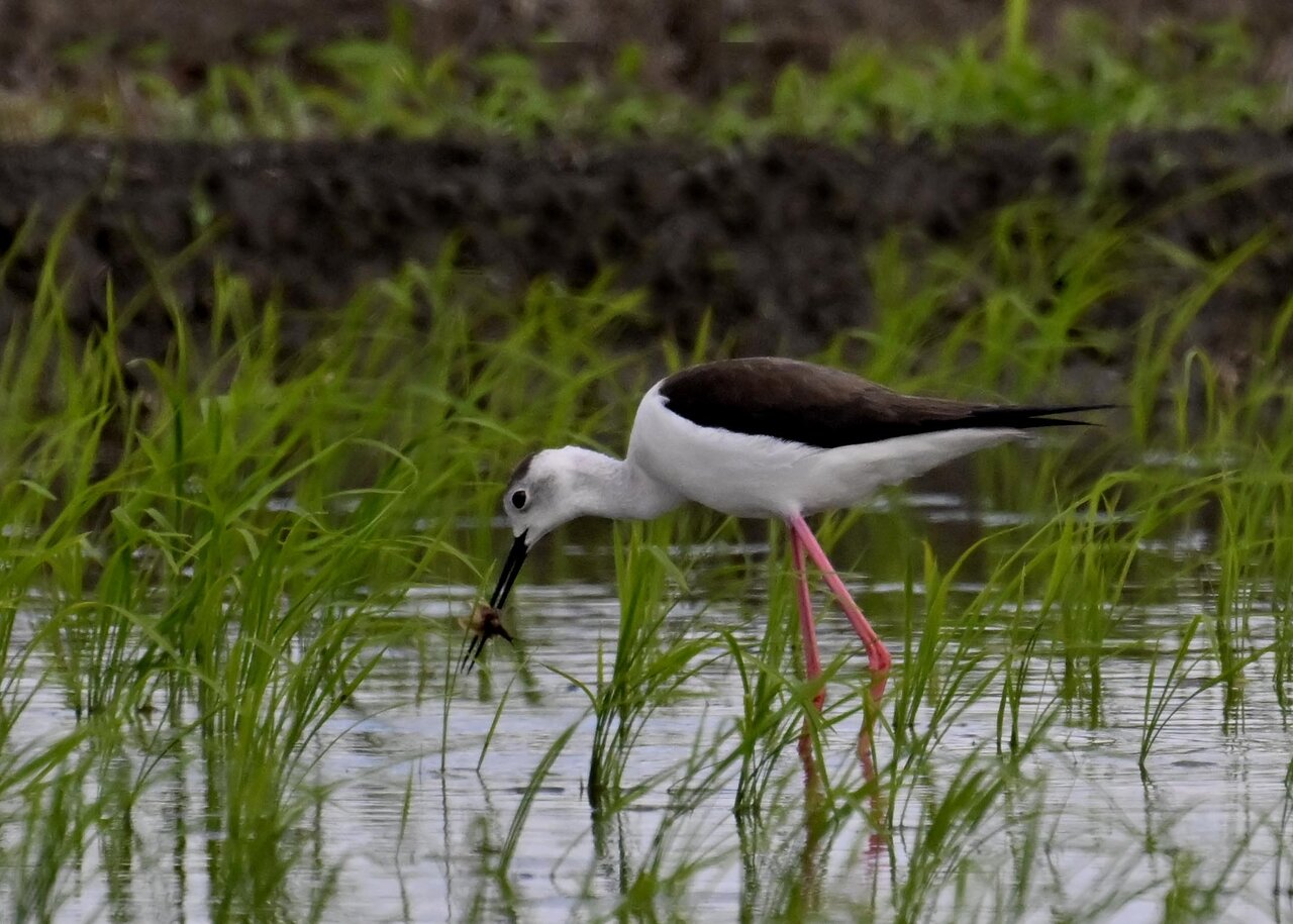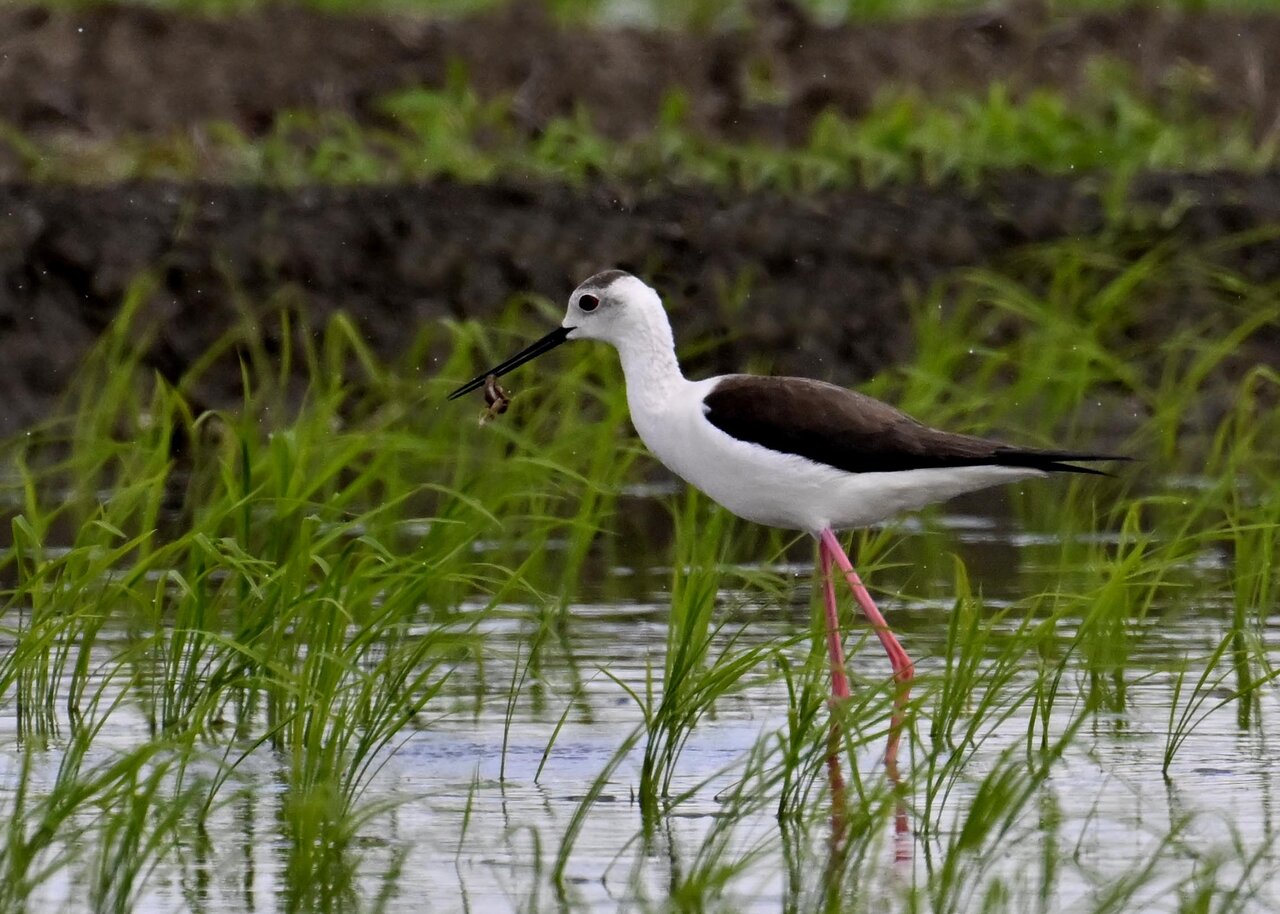田圃に降りてザリガニかエビのようなものを捕って食べていました。