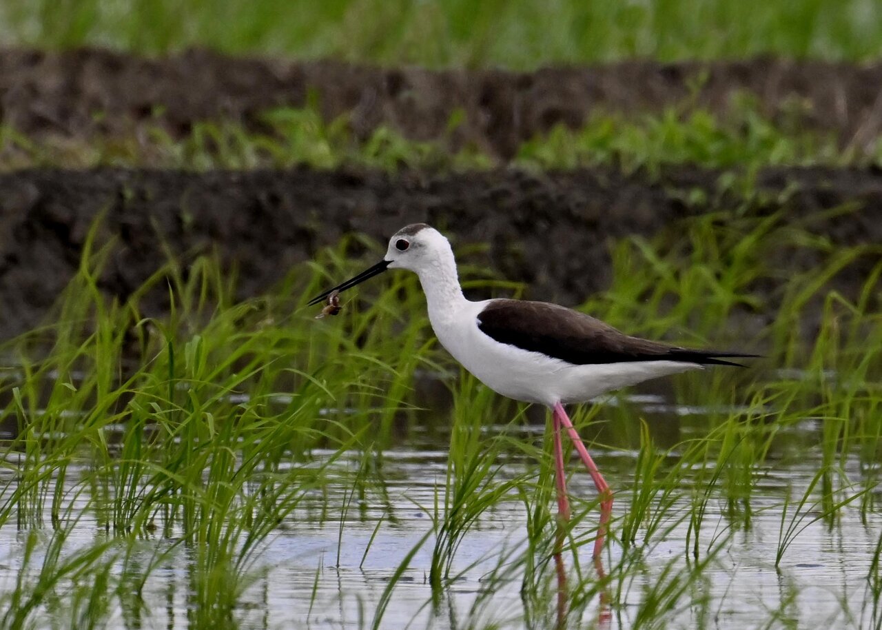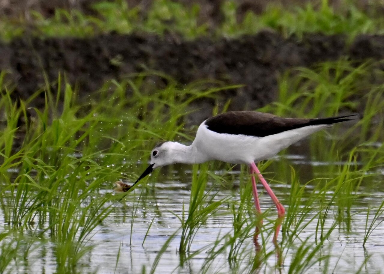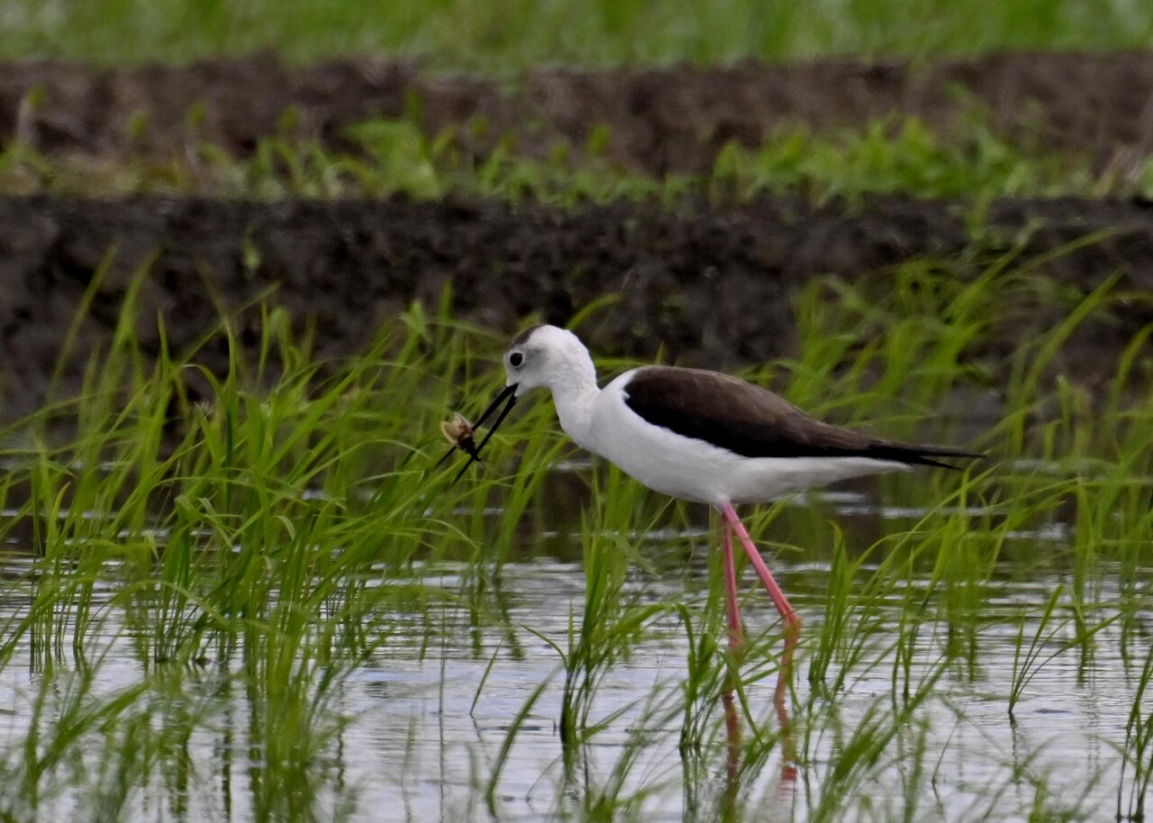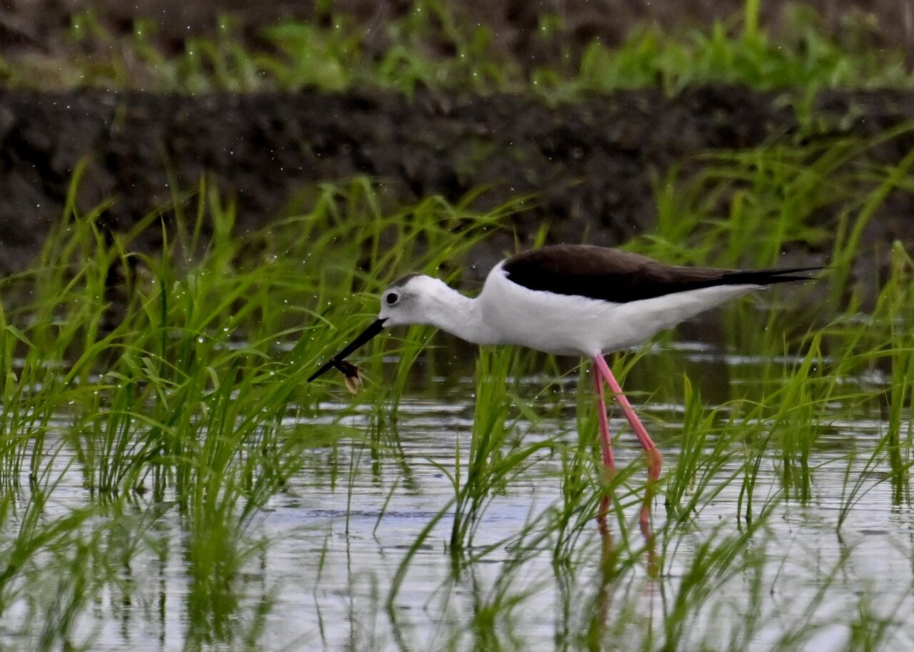 田圃に降りてザリガニかエビのようなものを捕って食べていました。