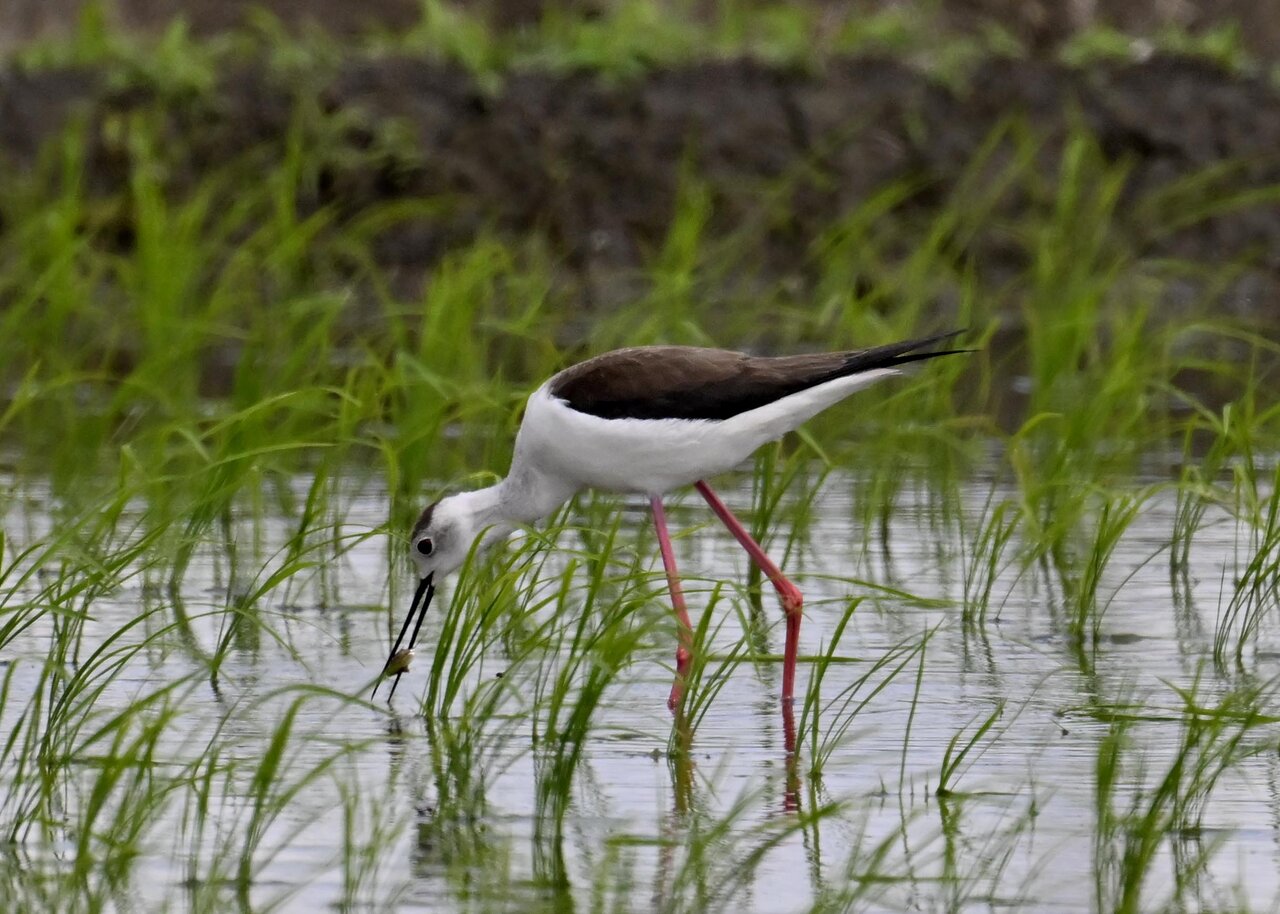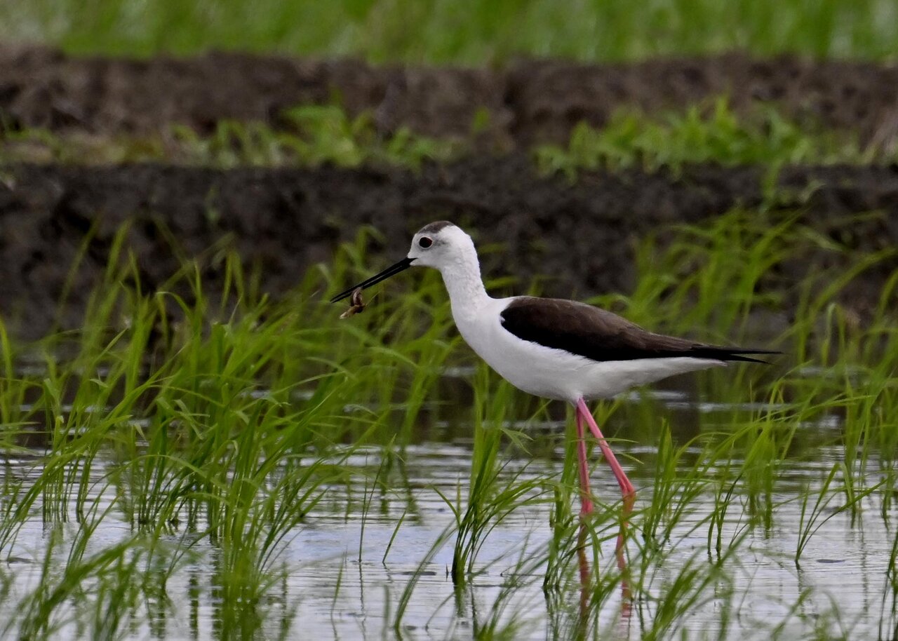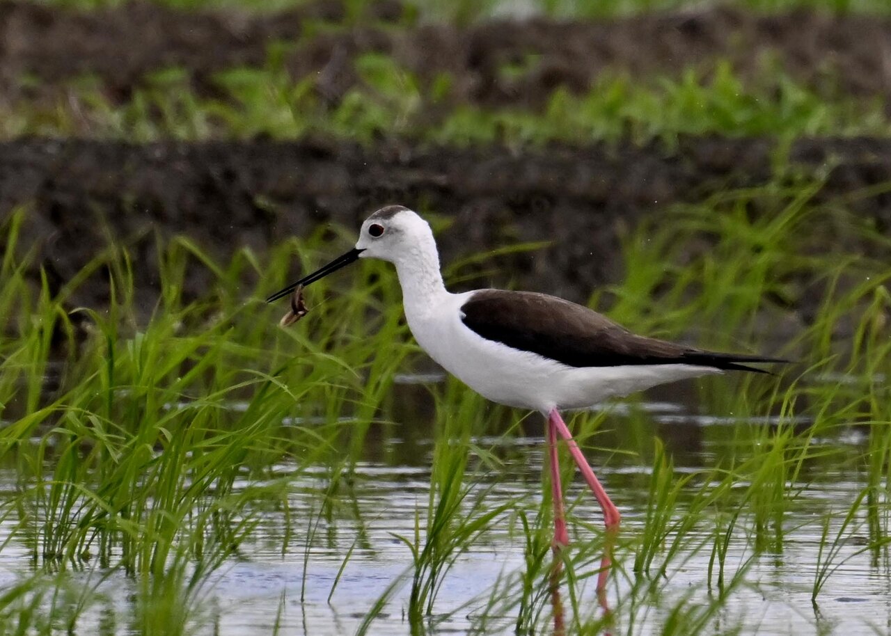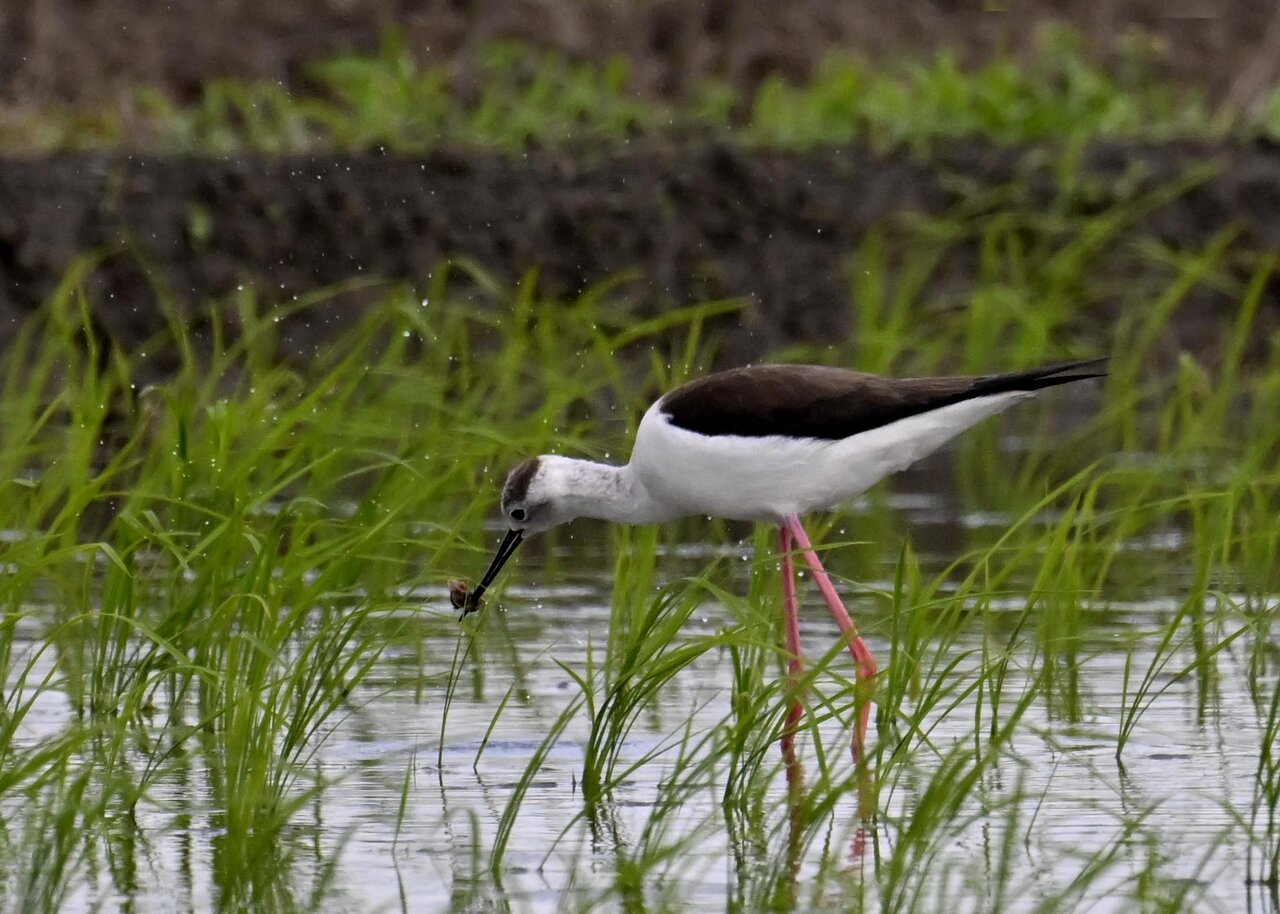 田圃に降りてザリガニかエビのようなものを捕って食べていました。