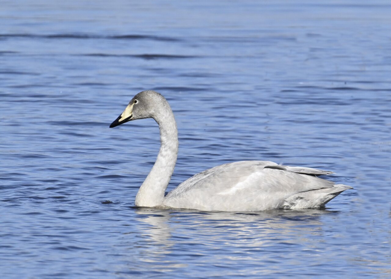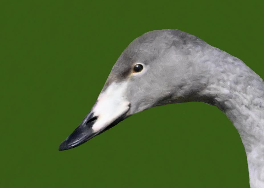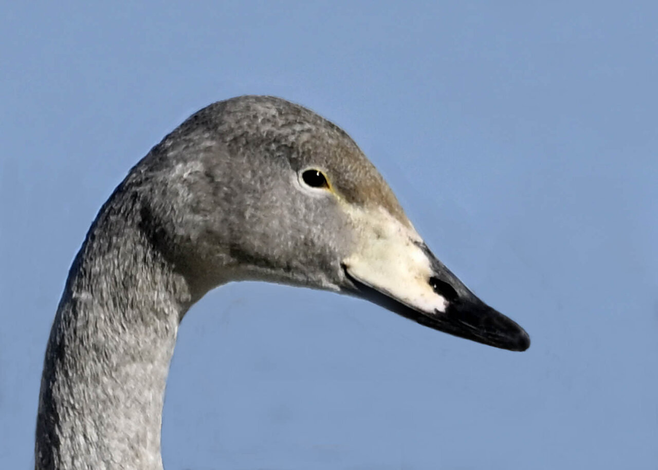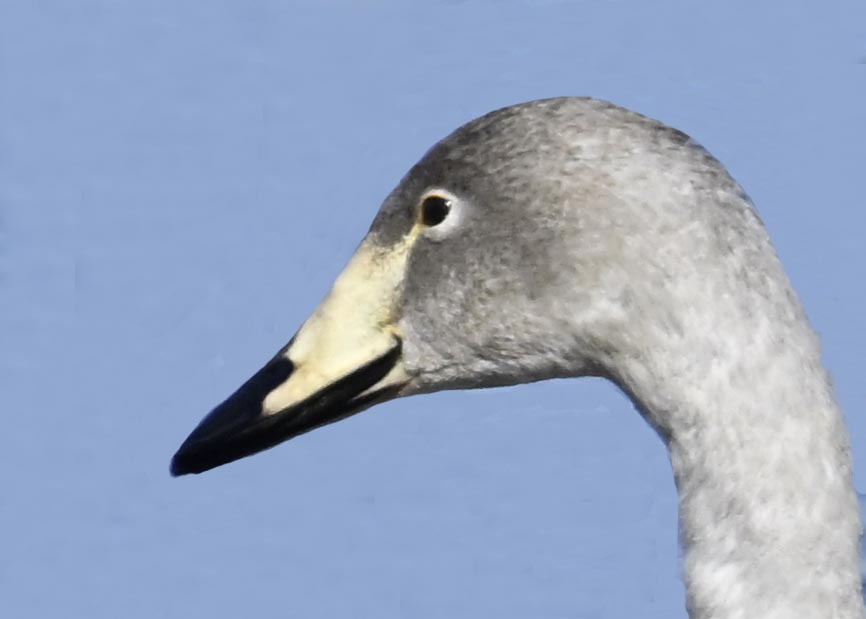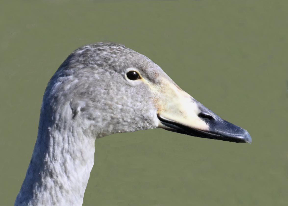オオハクチョウ幼鳥はコハクチョウ幼鳥とも似ますが、幼鳥でも成鳥になると黄色になる嘴の