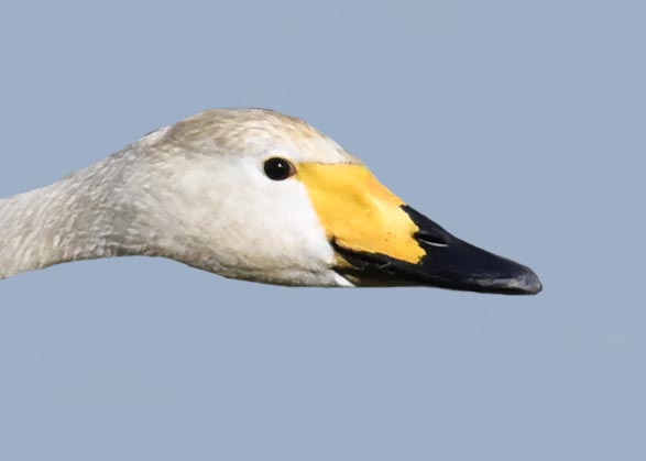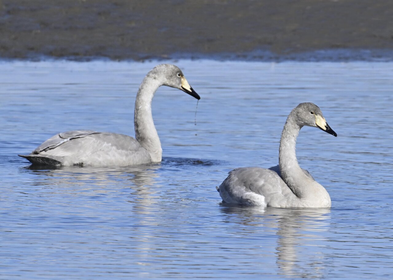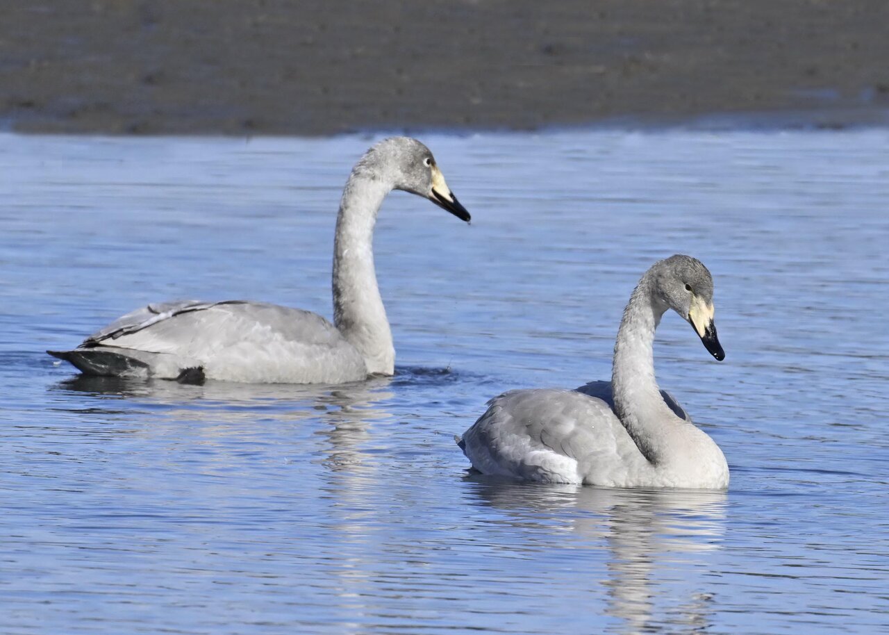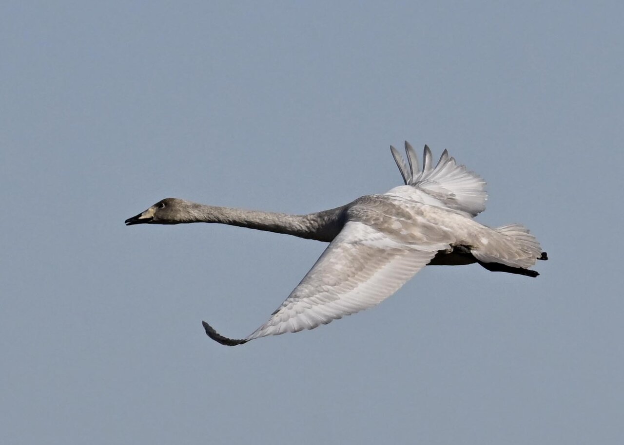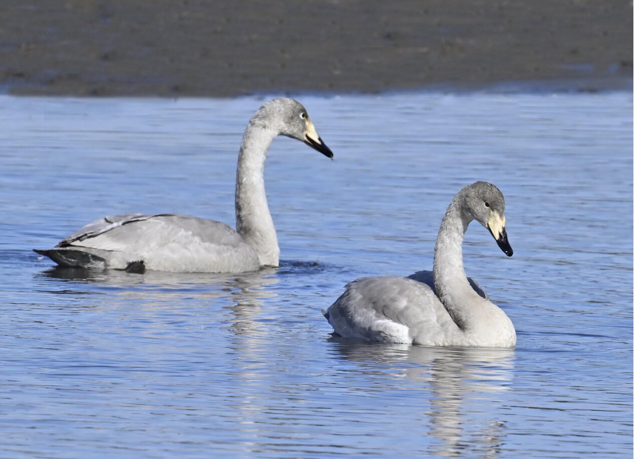 オオハクチョウ幼鳥はコハクチョウ幼鳥とも似ますが、幼鳥でも成鳥になると黄色になる嘴の