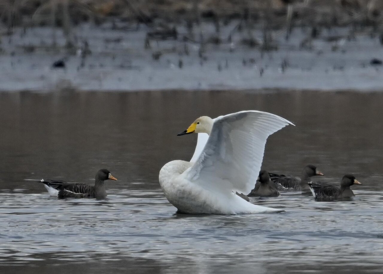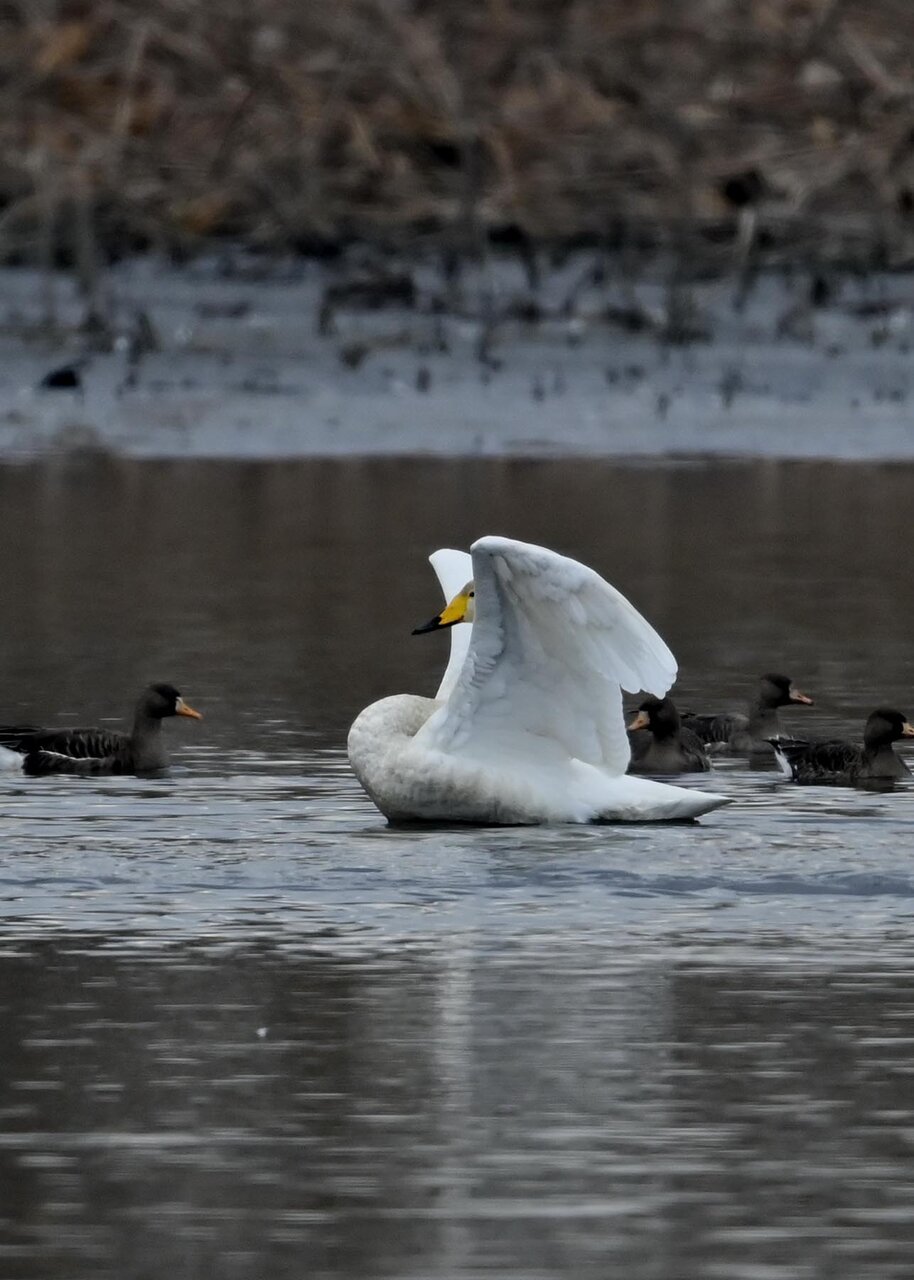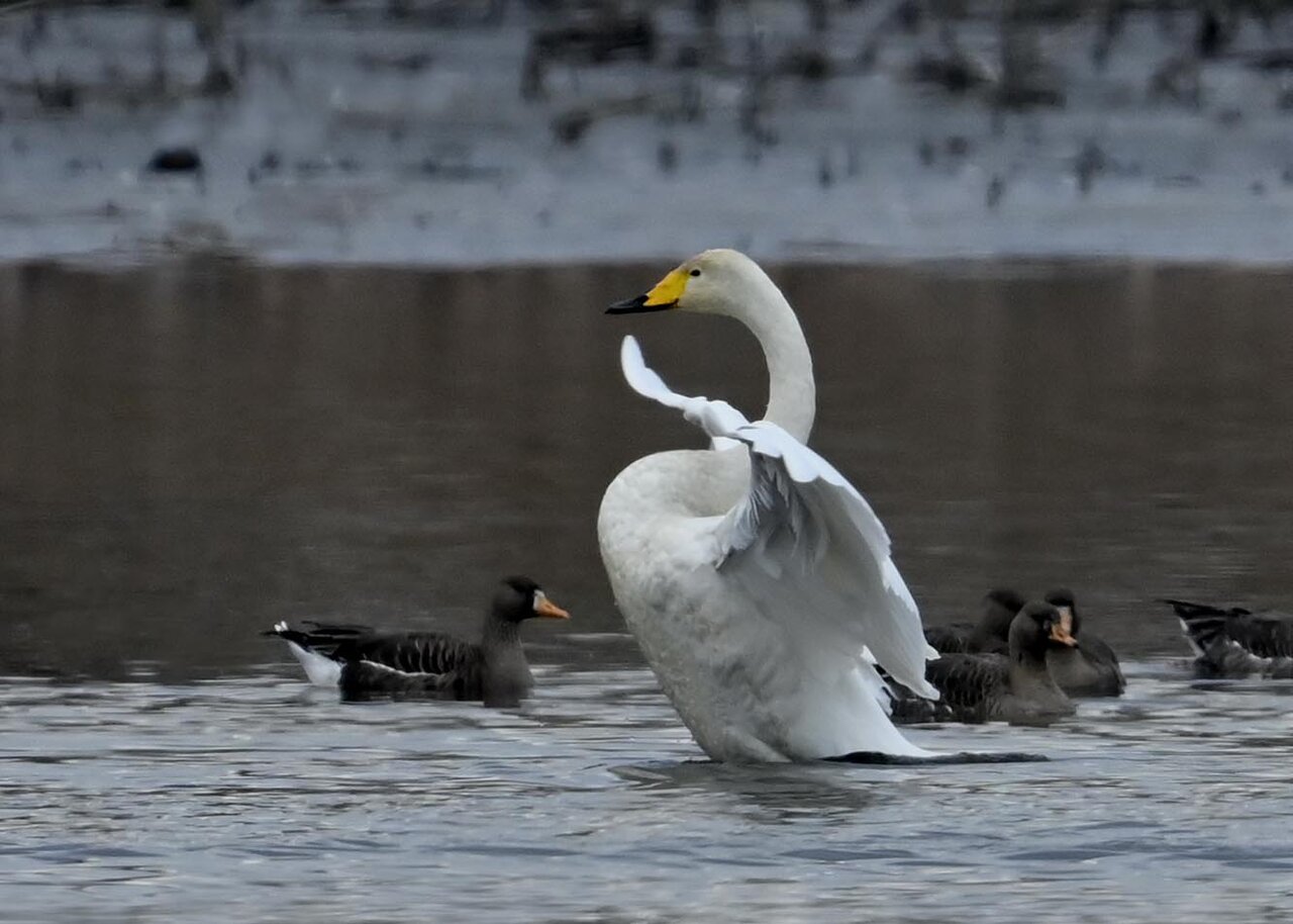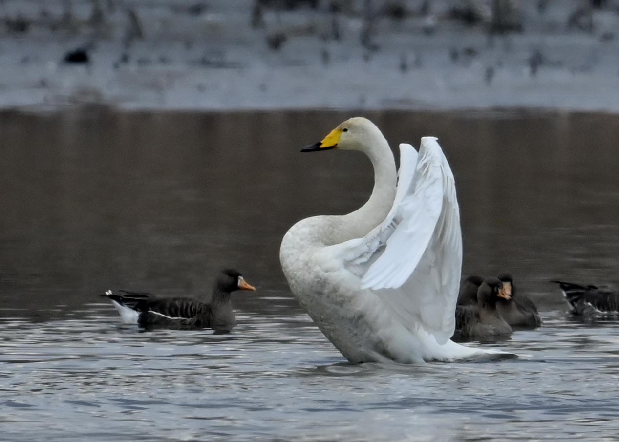 羽ばたくオオハクチョウの後ろに居るのはマガンです。マガンは東北方面で沢山撮って居ますが、近年この沼にも良くやって来るようになりました。