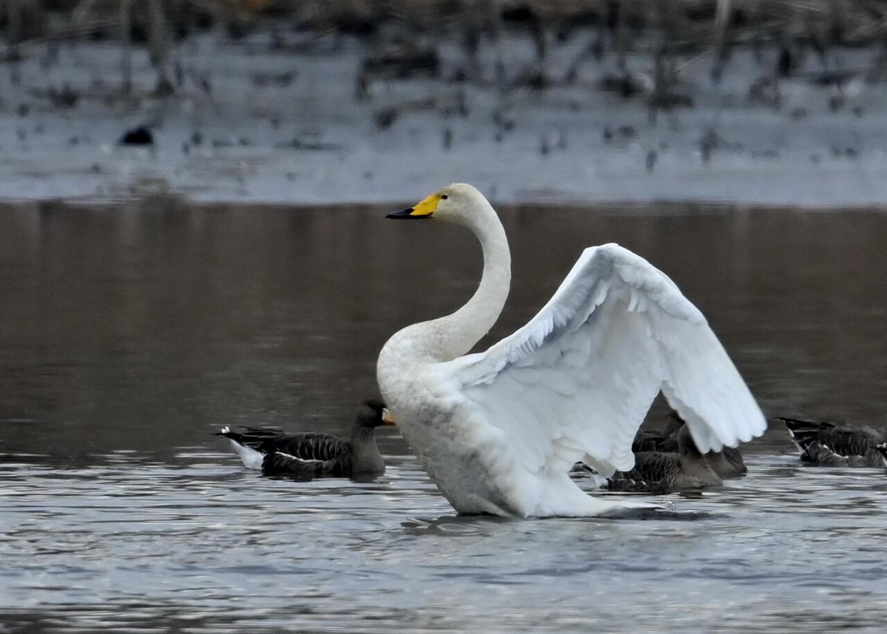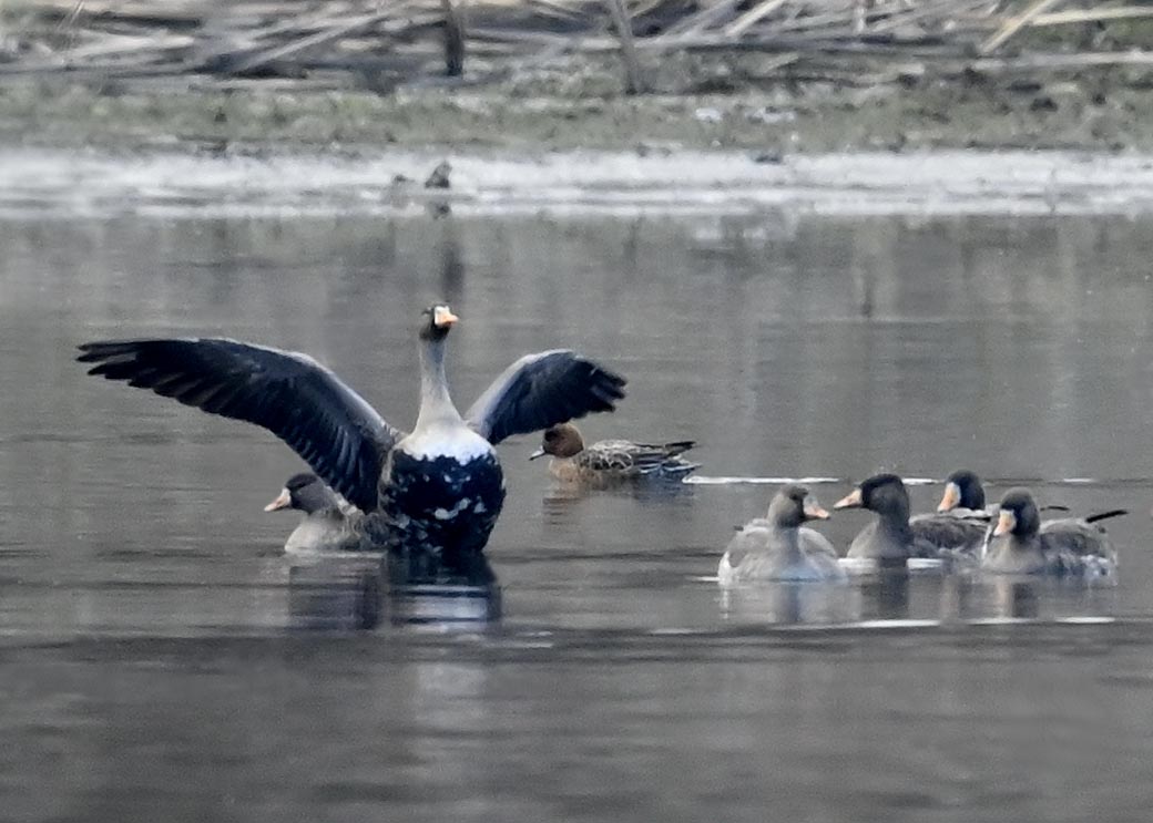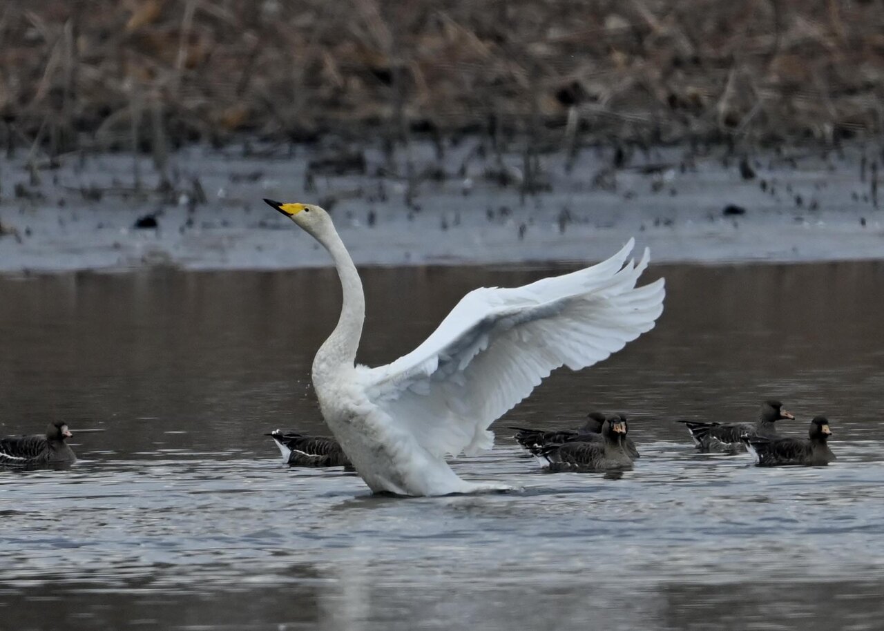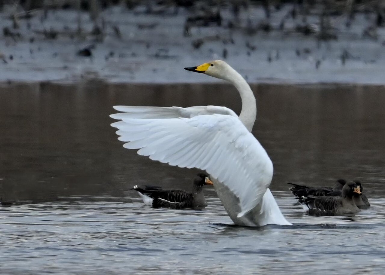 羽ばたくオオハクチョウの後ろに居るのはマガンです。マガンは東北方面で沢山撮って居ますが、近年この沼にも良くやって来るようになりました。