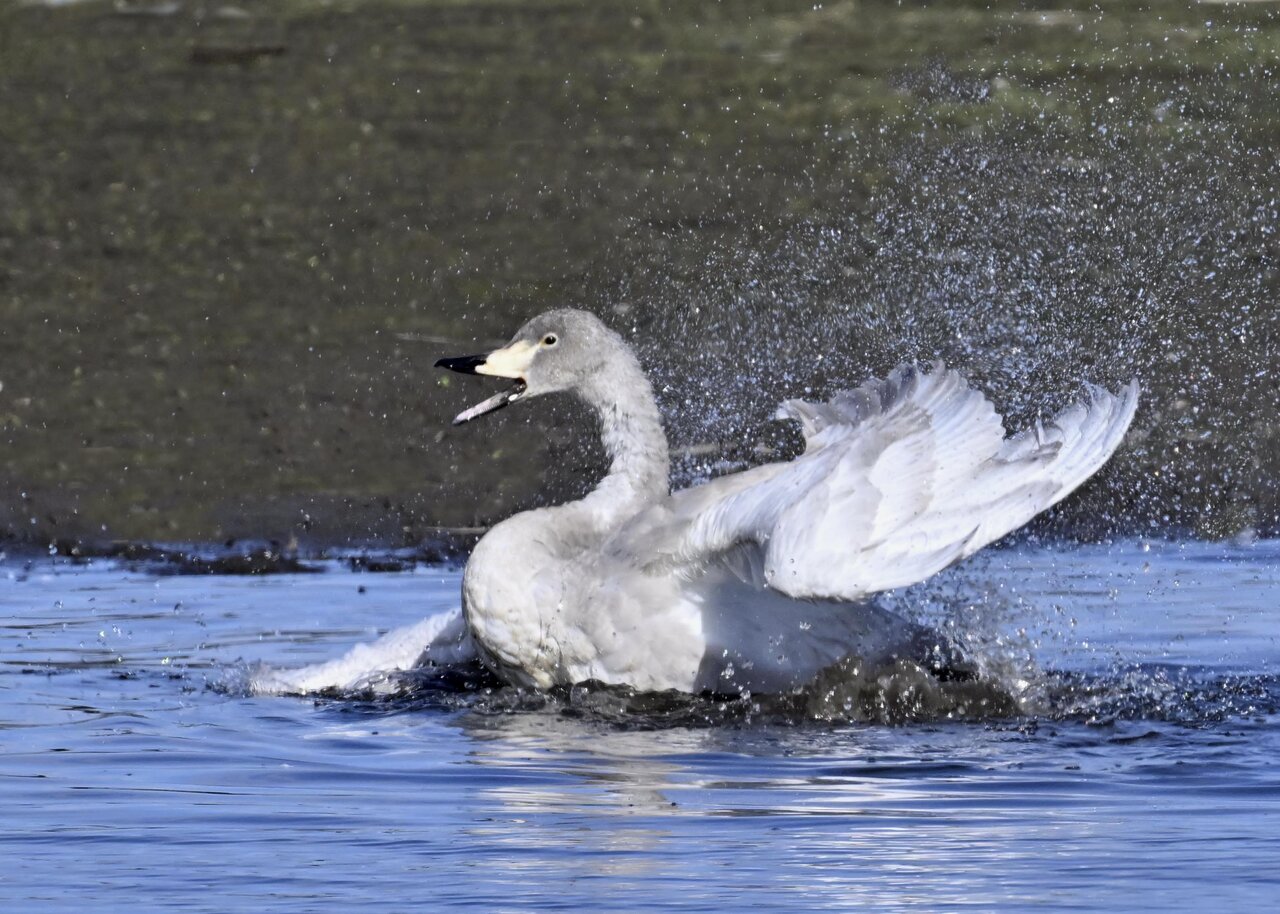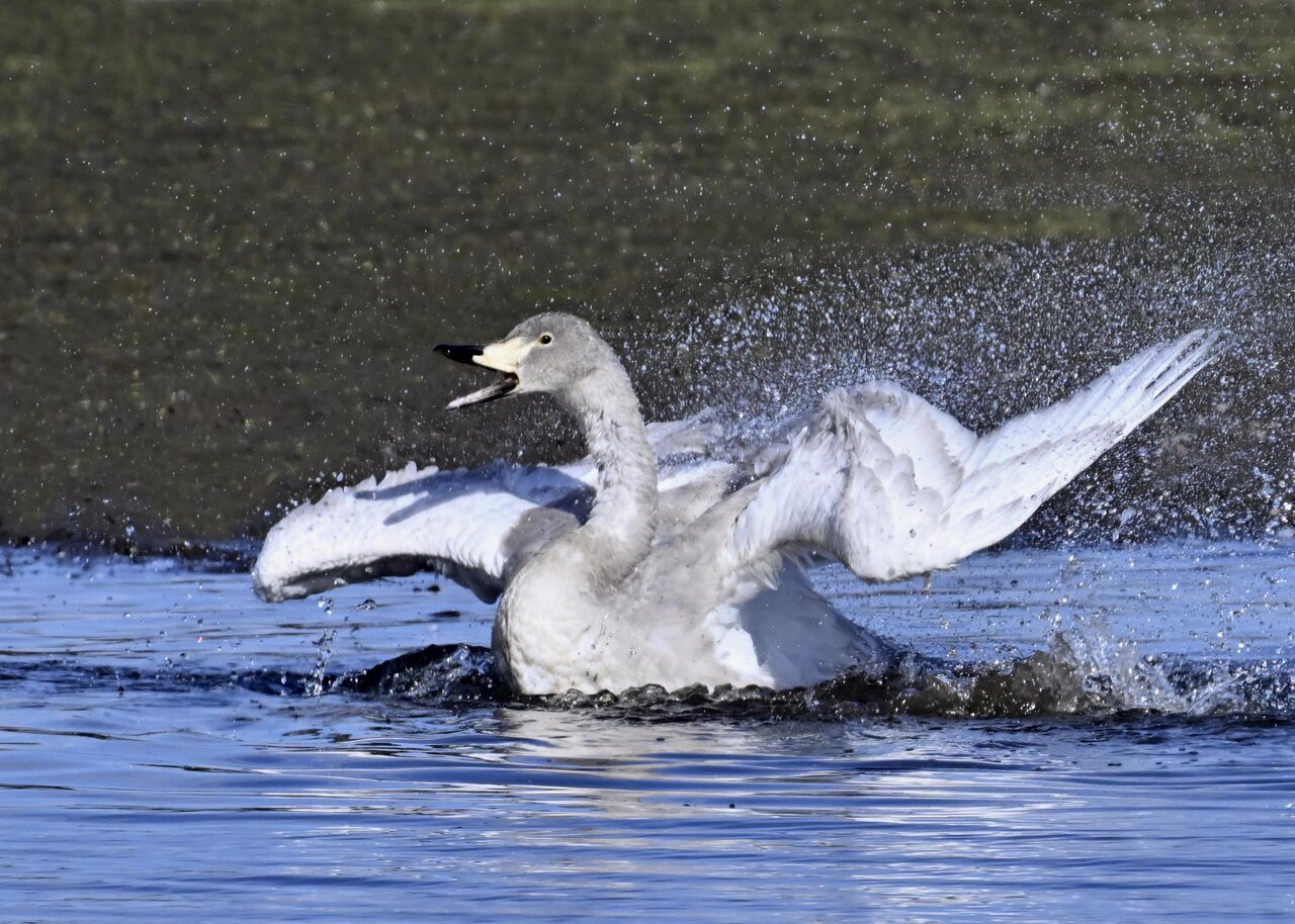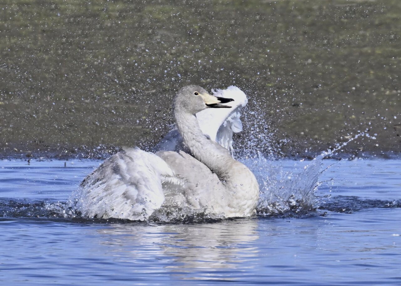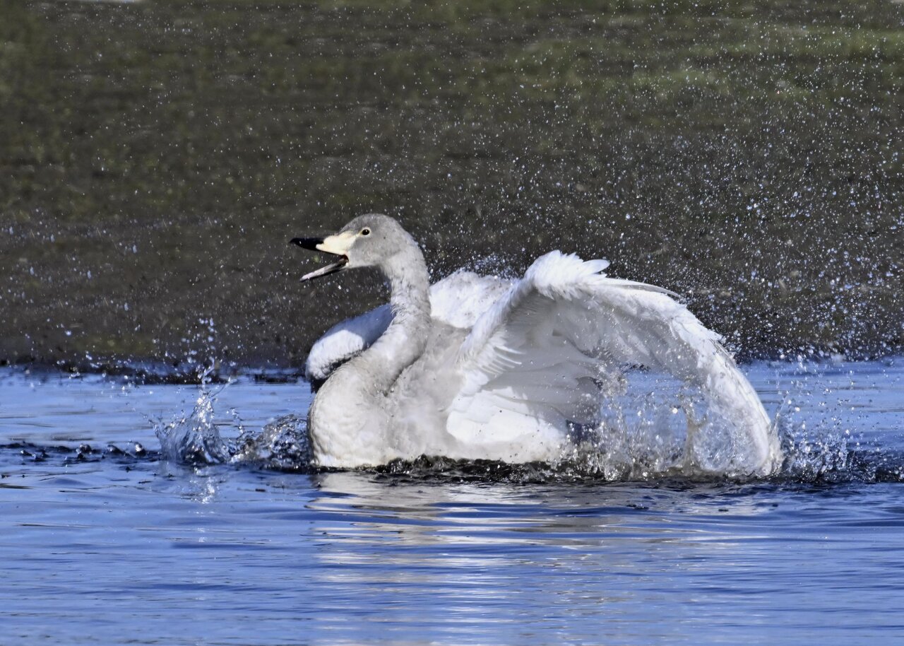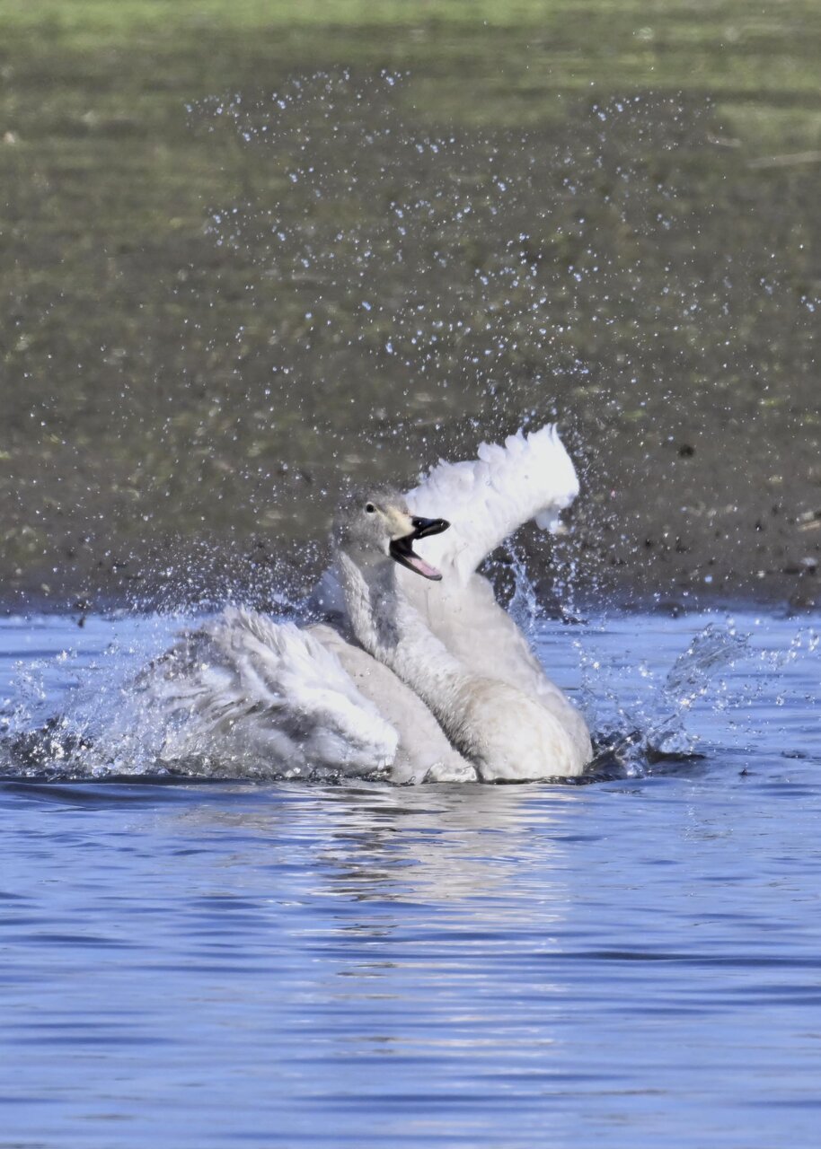 再三の登場ですが、きょうもオオハクチョウです。水浴びをしていました。