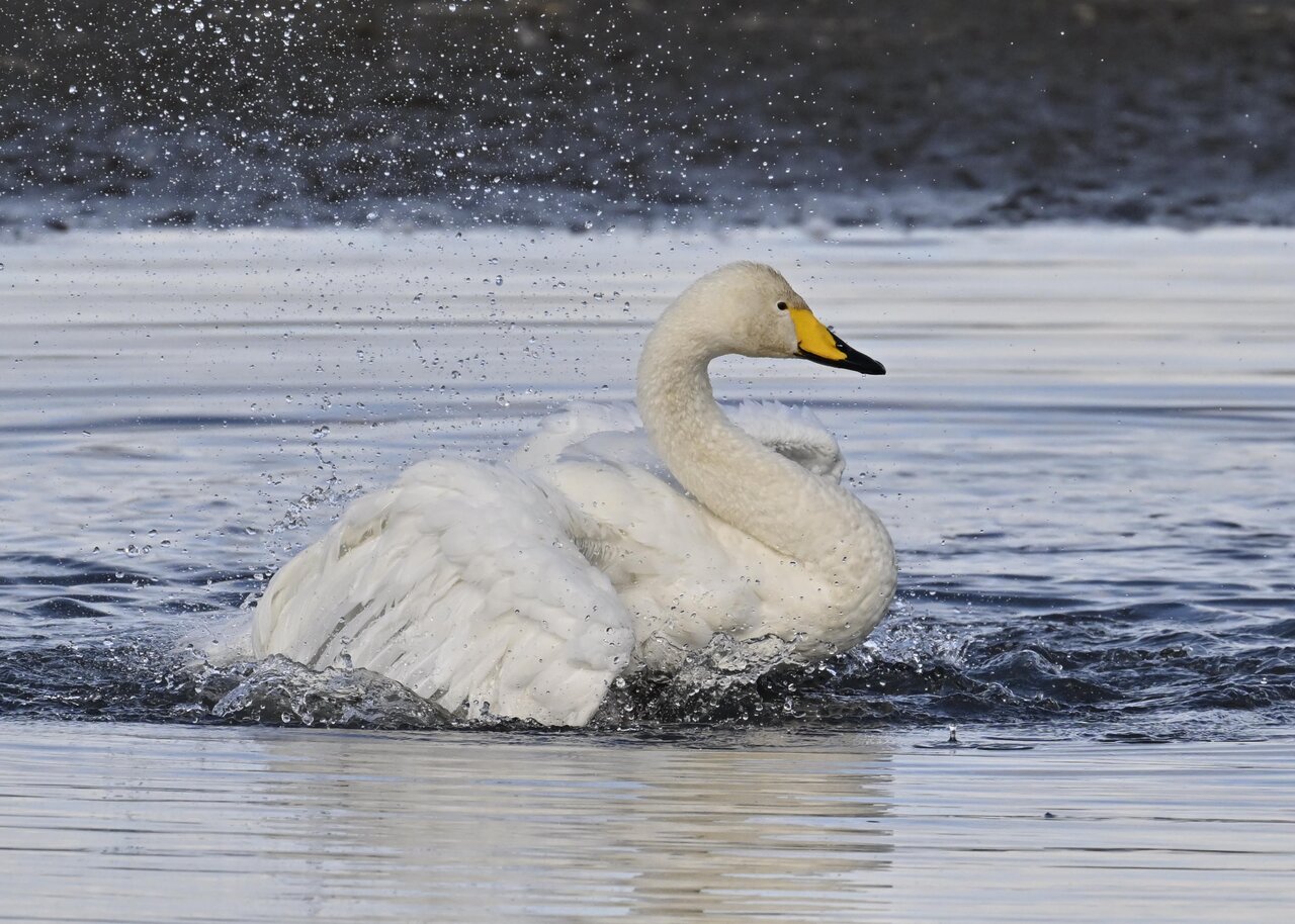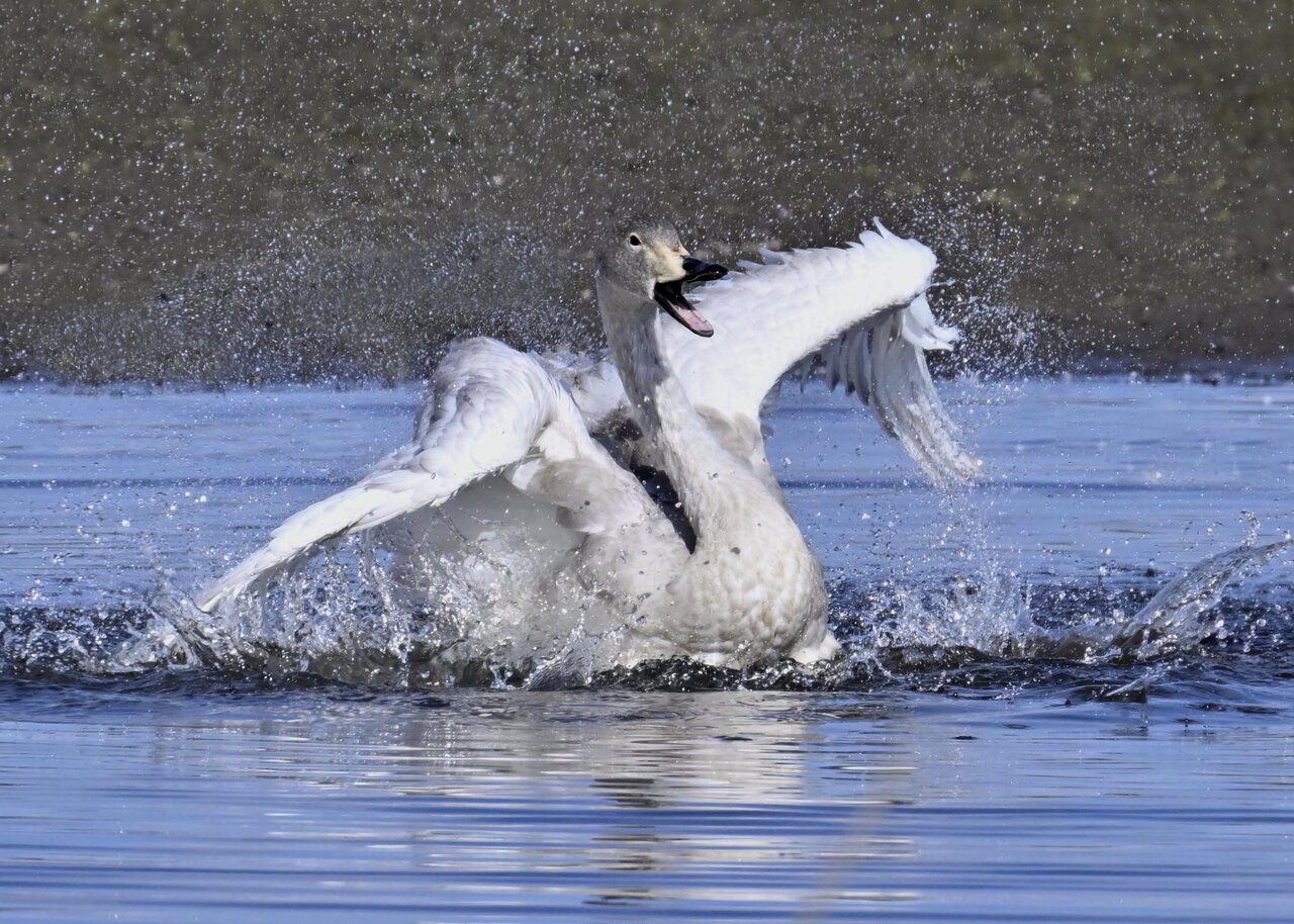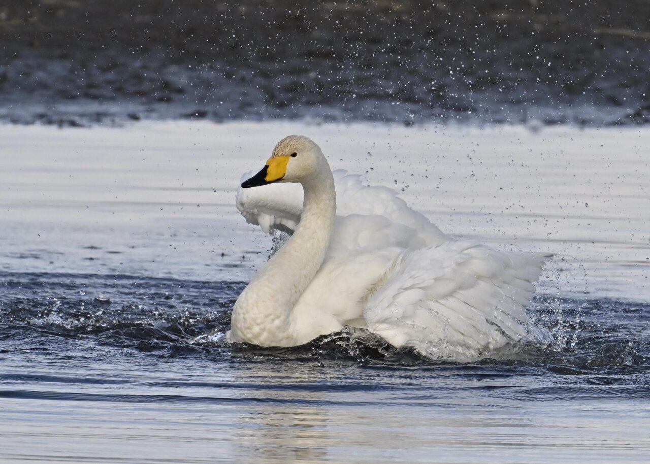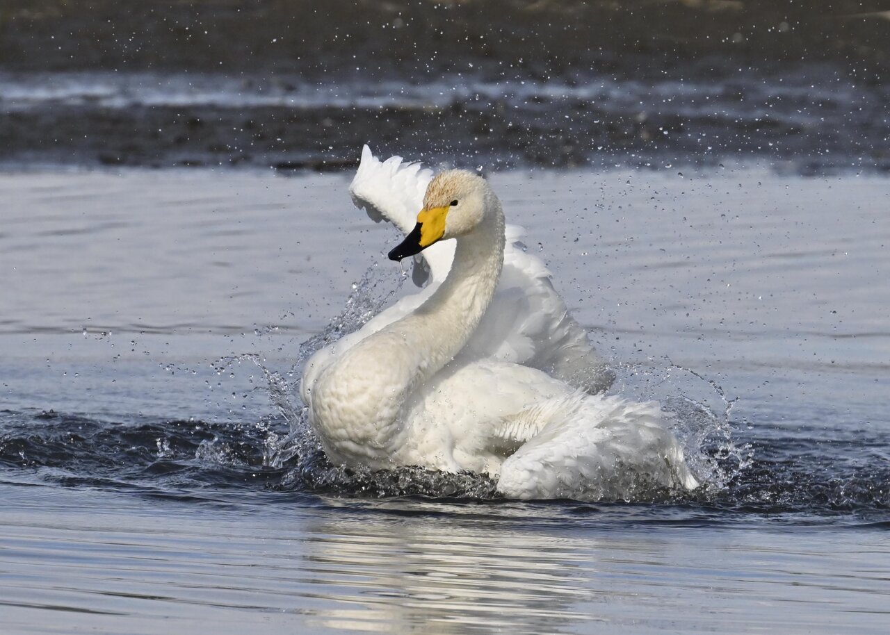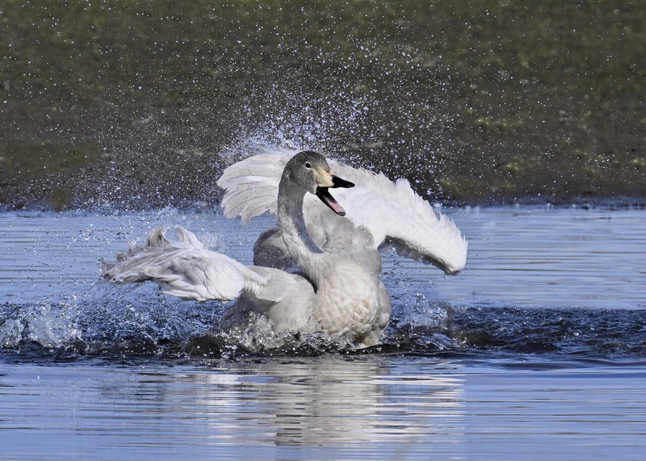 再三の登場ですが、きょうもオオハクチョウです。水浴びをしていました。
